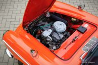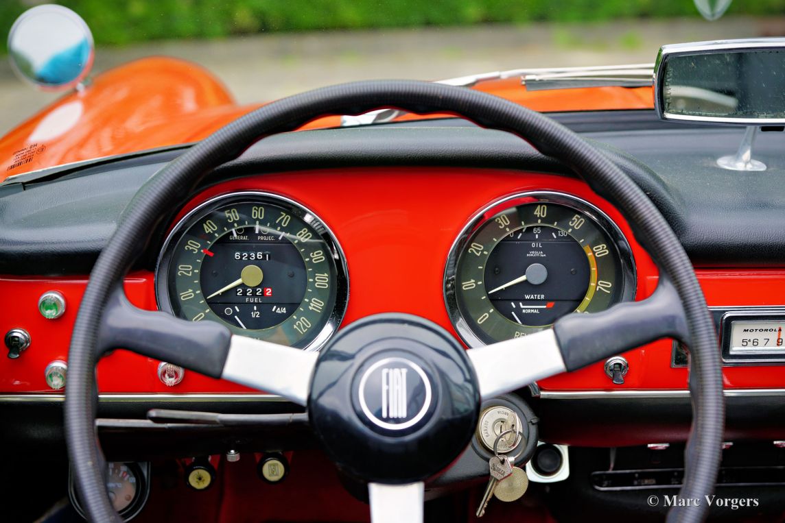 Fiat 1500 cabriolet, jaar 1966. Kleur oranjerood gecombineerd met een zwart interieur met zwartlederen stoelen en zwart tapijt. Zwarte soft-top, kapafdekking en een originele zwarte hard-top. De Fiat 1500 cabriolet is een prachtig ontwerp van Pininfarina, geïnspireerd op de lijnen van de Fiat OSCA 1500 GT uit 1958. De 1500 cabriolet is een zeer stijlvolle Italiaanse cabriolet die door alle voorbijgangers op straat wordt bewonderd. Dit zeer goede exemplaar toont alle originele details, de kilometerteller geeft 63.500 kilometer aan. Deze Fiat cabriolet is nieuw verkocht in de VS en in 2007 geïmporteerd in Nederland. Een originele Amerikaanse verkoopflyer is nog bij de auto, evenals een gebruikershandleiding en technische/onderhoudsboeken. Deze Fiat verkeert in een zeer goede en zeer originele staat. De auto is nooit gerestaureerd en in het verleden alleen opnieuw gespoten. Tijdens de taxatie werd de lakdikte rondom gemeten tussen de 150-200 mu. De Fiat 1500 is een heerlijke toercabriolet die voldoende comfort, snelheid en ruimte biedt voor twee personen tijdens een Europese vakantiereis over mooie wegen! De Fiat is voorzien van een vijfversnellingsbak, een Amerikaanse Motorola AM-radio en de auto wordt geleverd met de originele hard-top. Deze Fiat 1500 cabriolet is een begeerlijke rijdersauto om volop van te genieten!