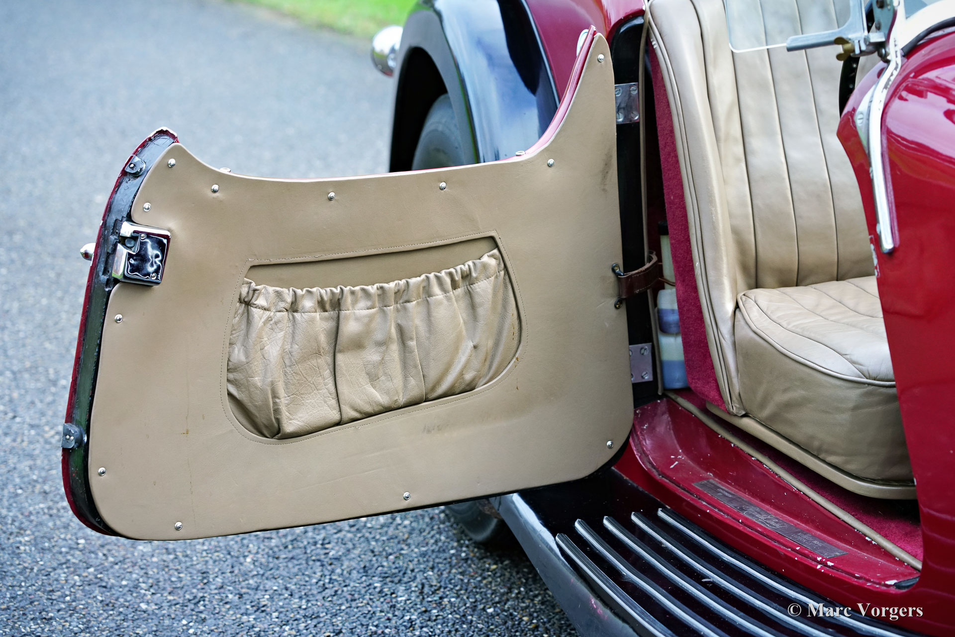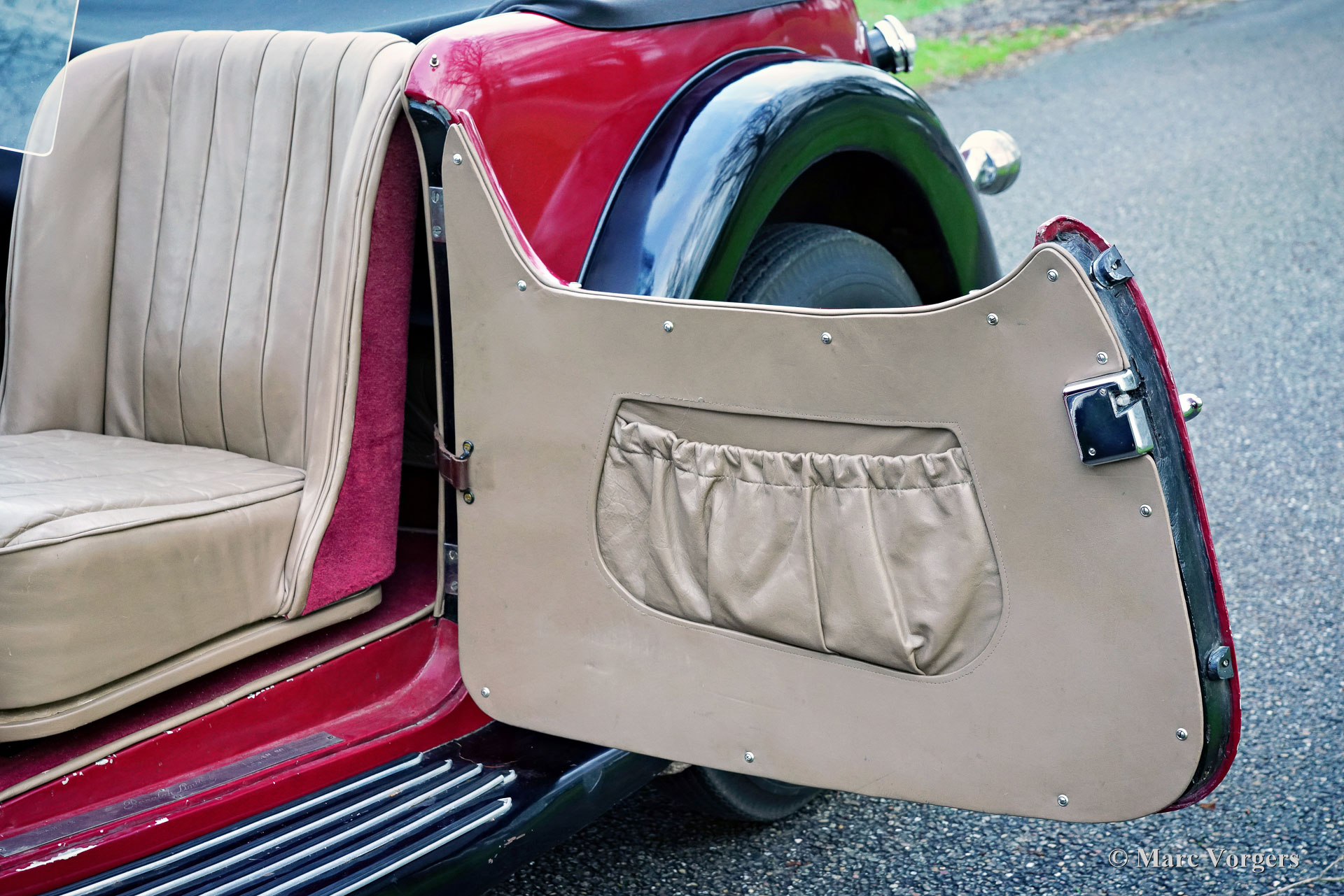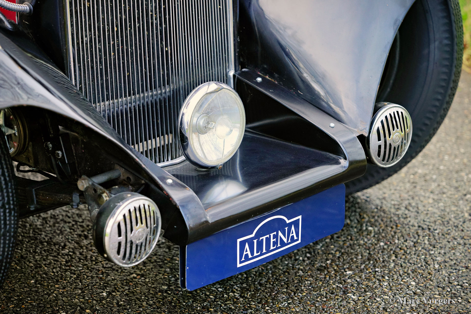 HE (Herbert Engineering) ‘Nelson’ V8 special, bouwjaar 1931. Kleur donkerrood boven zwart gecombineerd met een beige lederen interieur en een zwarte kap. Herbert Engineering is een van de vele kleine Britse autofabrikanten van voor de Tweede Wereldoorlog die al tientallen jaren vergeten zijn. De firma HE sloot kort na de introductie van dit model. HE-auto's zijn erg, erg zeldzaam, dus we zijn er trots op om u deze zeer interessante special te presenteren. De auto heeft een gedocumenteerde geschiedenis van 90 jaar! Het meest interessante is het feit dat de tweede eigenaar, een heer Nelson, de originele zescilinder-lijnmotor in 1934 verruilde voor een Amerikaanse V8-krachtbron! Niet de eerste Britse auto met een Amerikaanse 8-cilindermotor, die eer gaat naar de Railton Terraplane uit 1933. Maar wel een van de eerste Britse auto's (en specials) met een Amerikaanse V8-motor! De motor is een 3,6 liter Ford ‘flat head’ V8 die heel laag in het chassis is gemonteerd. Dit chassis is aan de achterzijde al ‘underslung’ (as boven het chassis gemonteerd). Ook de eindoverbrenging is opgewaardeerd met een hogere ratio en de mechanische kabelbediende remmen zijn vervangen door een hydraulisch systeem. Zes jaar geleden is de motor voorzien van nieuwe hoge compressie cilinderkoppen en elektronische ontsteking. De afgelopen vijf jaar is de auto onderhouden bij Altena Classic Service en is er veel geld geïnvesteerd om de auto mechanisch en technisch up-to-date te brengen en te houden. De eigenaar heeft zonder problemen deelgenomen aan geweldige historische rij-evenementen zoals de Via Iberica 2022 en de Herzberger Trophy 2023. Deze HE Nelson V8 special ziet er doelbewust uit, de motorkap beslaat bijna de helft van de lengte van de auto! Dit is een zeer opmerkelijke en unieke special met een prachtig vintage patina. De auto is momenteel geregistreerd in Nederland en kan naar elk land worden geëxporteerd en geregistreerd.