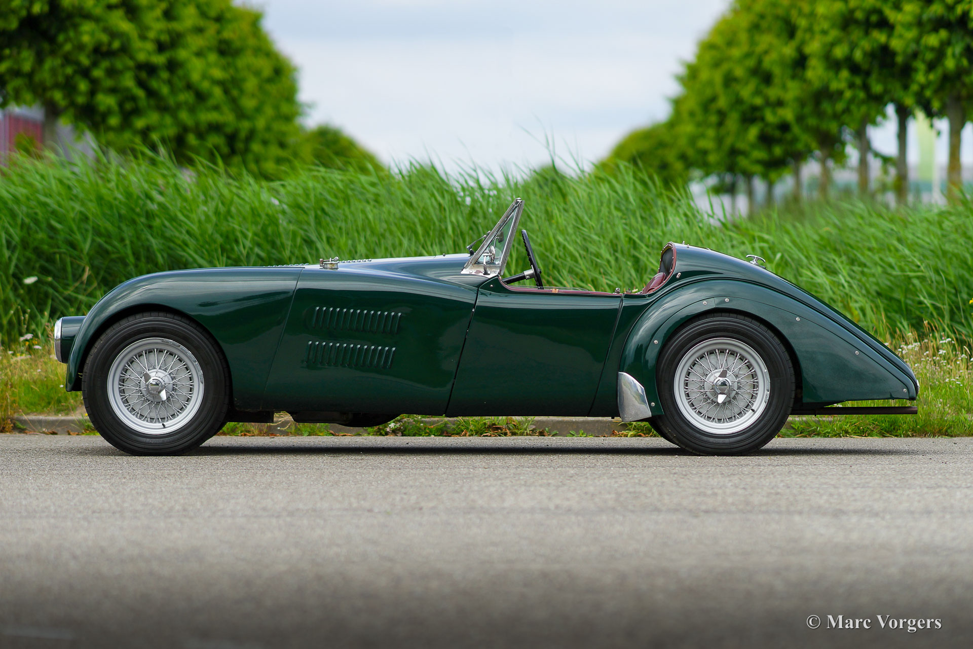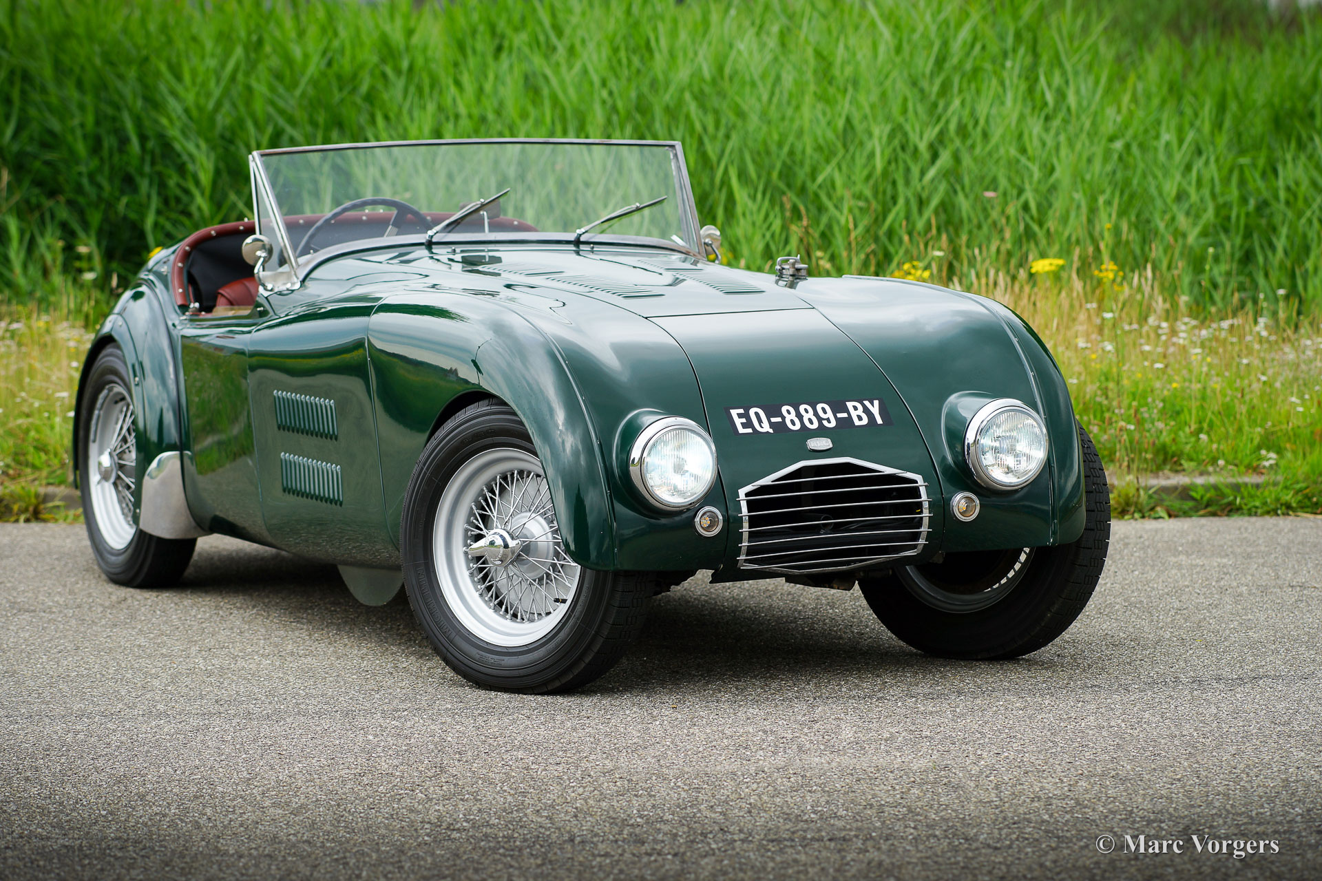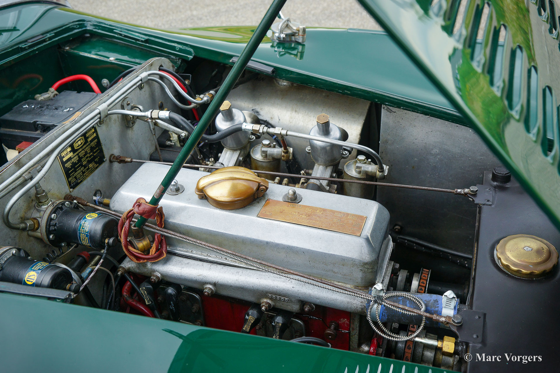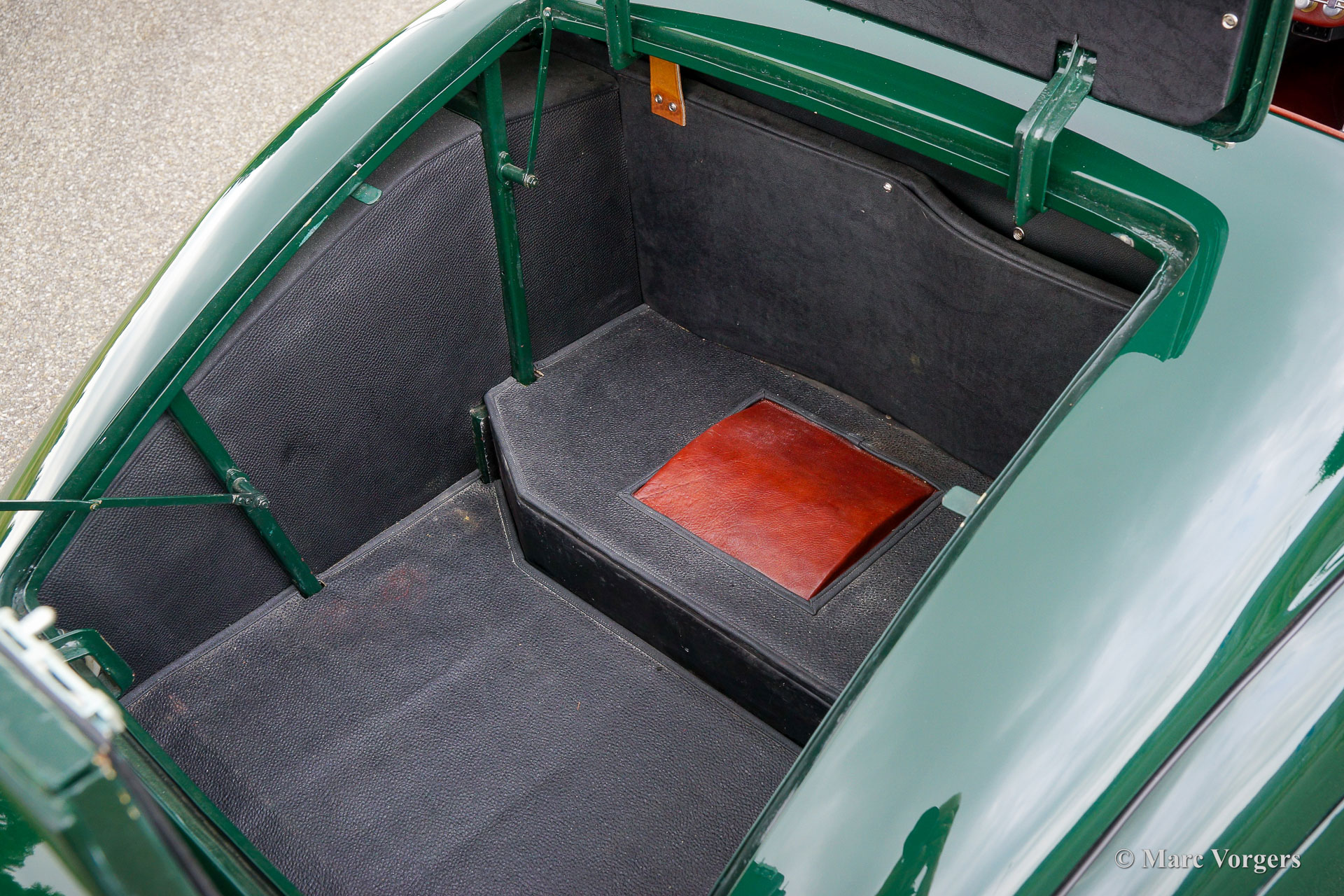 HRG 1500 Aerodynamic, jaar 1947. Kleur donker British Racing Green. Interieur met bruin lederen stoelen. Deze zeldzame en prachtige HRG 1500 Aerodynamic werd nieuw verkocht in het Verenigd Koninkrijk aan de heer Hartford in Fawley. De volledige geschiedenis van de auto is bekend en gedocumenteerd (geschiedenis gedocumenteerd door Ian Dussek historicus van de HRG Association). In het begin van de jaren 1960 werd de auto gerestaureerd naar originele specificaties. Na de restauratie nam de W106 deel aan evenementen en bijeenkomsten zoals de ‘Griffith Formula for Historic Cars’. In de jaren 1990 werd een tweede restauratie gestart door de 5e eigenaar dhr. Halfpenny. De mechanische componenten (motor, versnellingsbak, achteras, chassis) zijn gereviseerd door Roundwood Ltd in Harpenden UK. De heer Halfpenny verkocht de auto als een onvoltooid project in 2017, de nieuwe eigenaar heeft de restauratie in 2019 voltooid. Deze zeldzame automobiel verkeert in een uitstekende conditie met een fraai vintage patina. Deze HRG toont alle originele details en de auto rijdt en schakelt voortreffelijk! De HRG 1500 Aerodynamic is een bijzondere en zeldzame automobiel, er zijn slechts 45 exemplaren van gebouwd van 1945 tot 1949, er zijn nog 20 auto’s van dit type bekend. Deze automobiel vertoont veel interessante technische en stylingdetails. De benzinetank bevindt zich onder het linker voorspatbord en het reservewiel heeft een prominente plaats onder het openklappende rechter voorspatbord. Het met leer beklede dashboard ziet er zeer indrukwekkend uit met een vierspaaks stuur in Brooklands-stijl, zeven meters met chromen ringen en een reeks schakelaars. De auto is uitgerust met bredere 19-inch spaakwielen met klassieke Michelin-banden.
