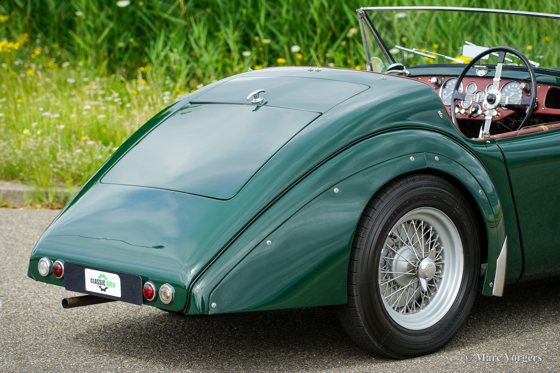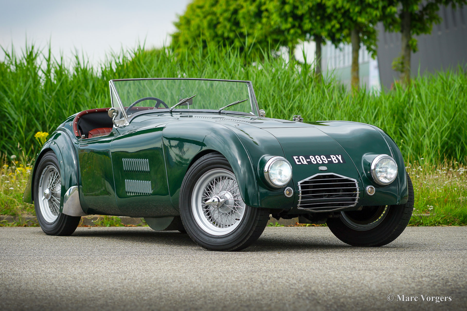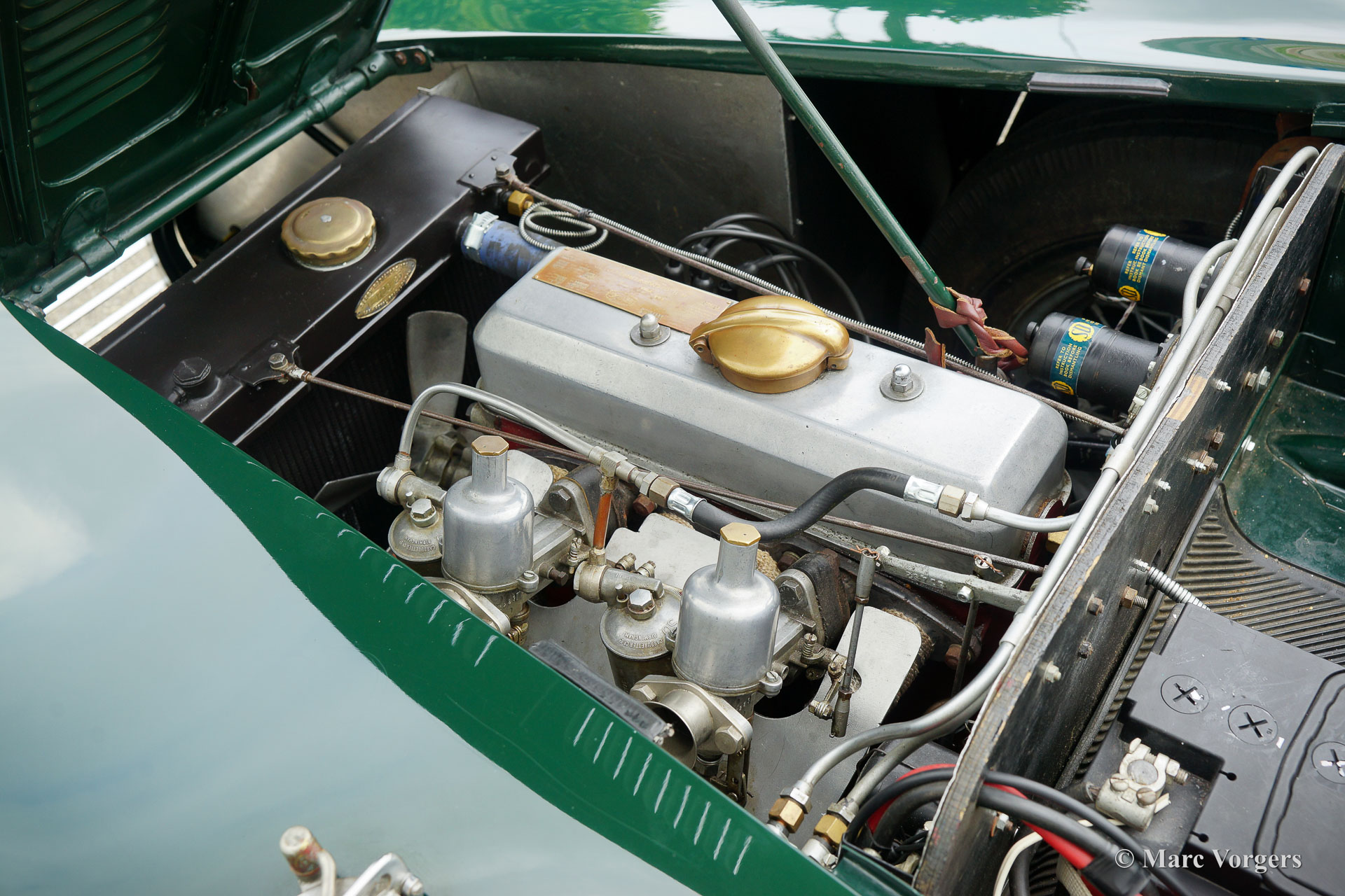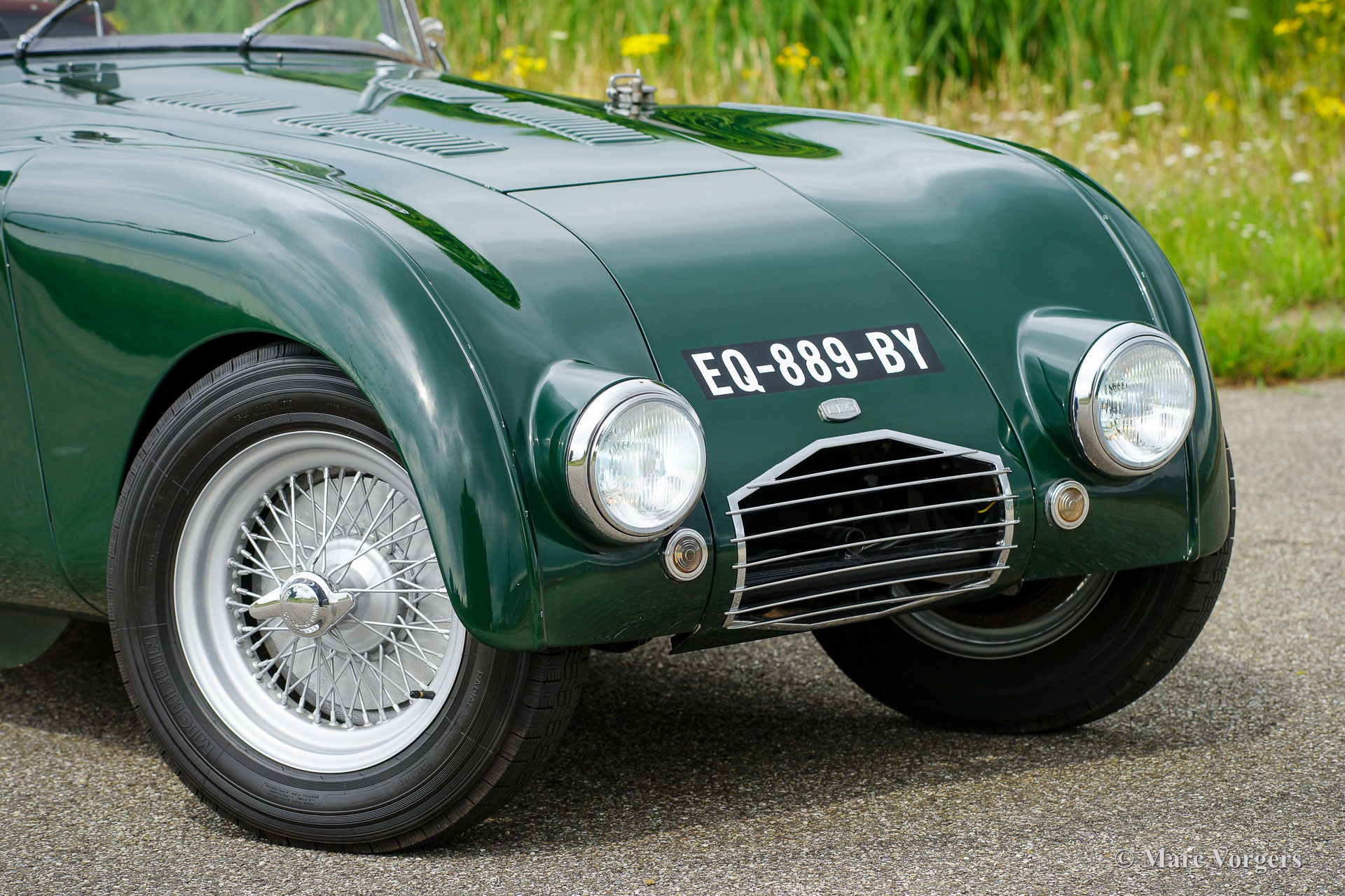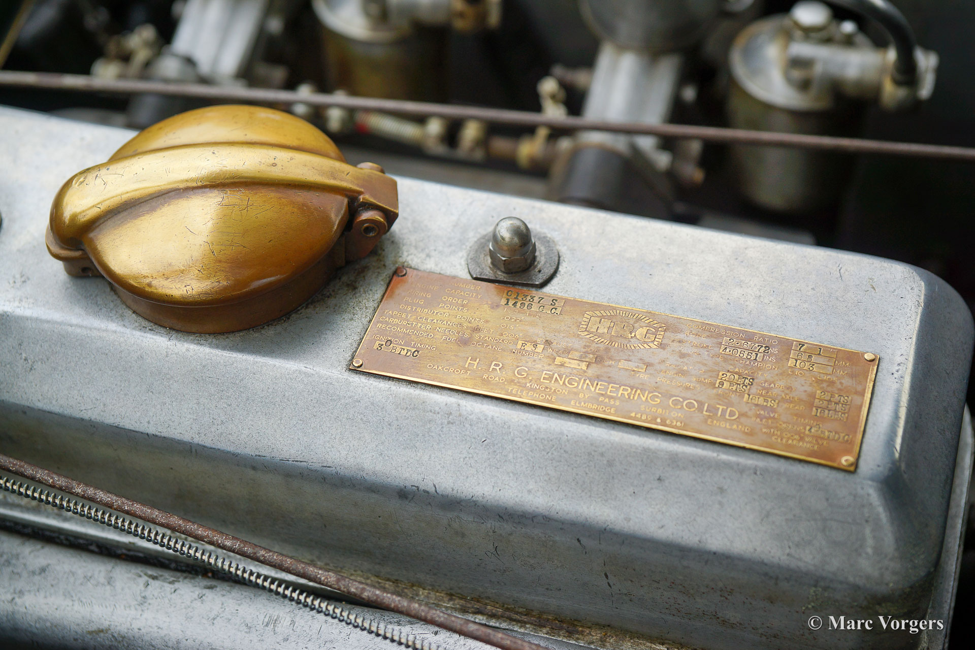 HRG 1500 Aerodynamic, jaar 1947. Kleur donker British Racing Green. Interieur met bruin lederen stoelen. Deze zeldzame en prachtige HRG 1500 Aerodynamic werd nieuw verkocht in het Verenigd Koninkrijk aan de heer Hartford in Fawley. De volledige geschiedenis van de auto is bekend en gedocumenteerd (geschiedenis gedocumenteerd door Ian Dussek historicus van de HRG Association). In het begin van de jaren 1960 werd de auto gerestaureerd naar originele specificaties. Na de restauratie nam de W106 deel aan evenementen en bijeenkomsten zoals de ‘Griffith Formula for Historic Cars’. In de jaren 1990 werd een tweede restauratie gestart door de 5e eigenaar dhr. Halfpenny. De mechanische componenten (motor, versnellingsbak, achteras, chassis) zijn gereviseerd door Roundwood Ltd in Harpenden UK. De heer Halfpenny verkocht de auto als een onvoltooid project in 2017, de nieuwe eigenaar heeft de restauratie in 2019 voltooid. Deze zeldzame automobiel verkeert in een uitstekende conditie met een fraai vintage patina. Deze HRG toont alle originele details en de auto rijdt en schakelt voortreffelijk! De HRG 1500 Aerodynamic is een bijzondere en zeldzame automobiel, er zijn slechts 45 exemplaren van gebouwd van 1945 tot 1949, er zijn nog 20 auto’s van dit type bekend. Deze automobiel vertoont veel interessante technische en stylingdetails. De benzinetank bevindt zich onder het linker voorspatbord en het reservewiel heeft een prominente plaats onder het openklappende rechter voorspatbord. Het met leer beklede dashboard ziet er zeer indrukwekkend uit met een vierspaaks stuur in Brooklands-stijl, zeven meters met chromen ringen en een reeks schakelaars. De auto is uitgerust met bredere 19-inch spaakwielen met klassieke Michelin-banden.