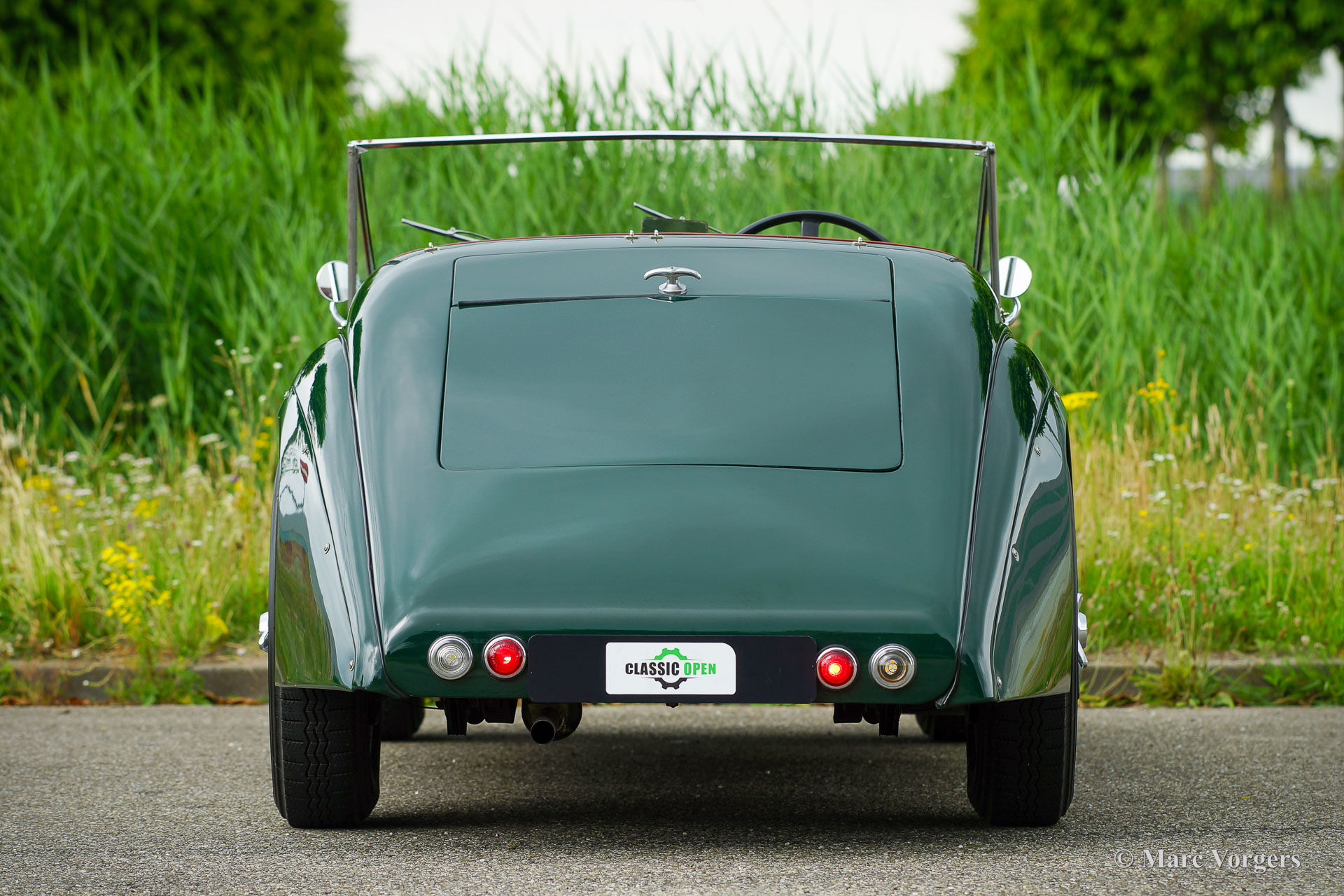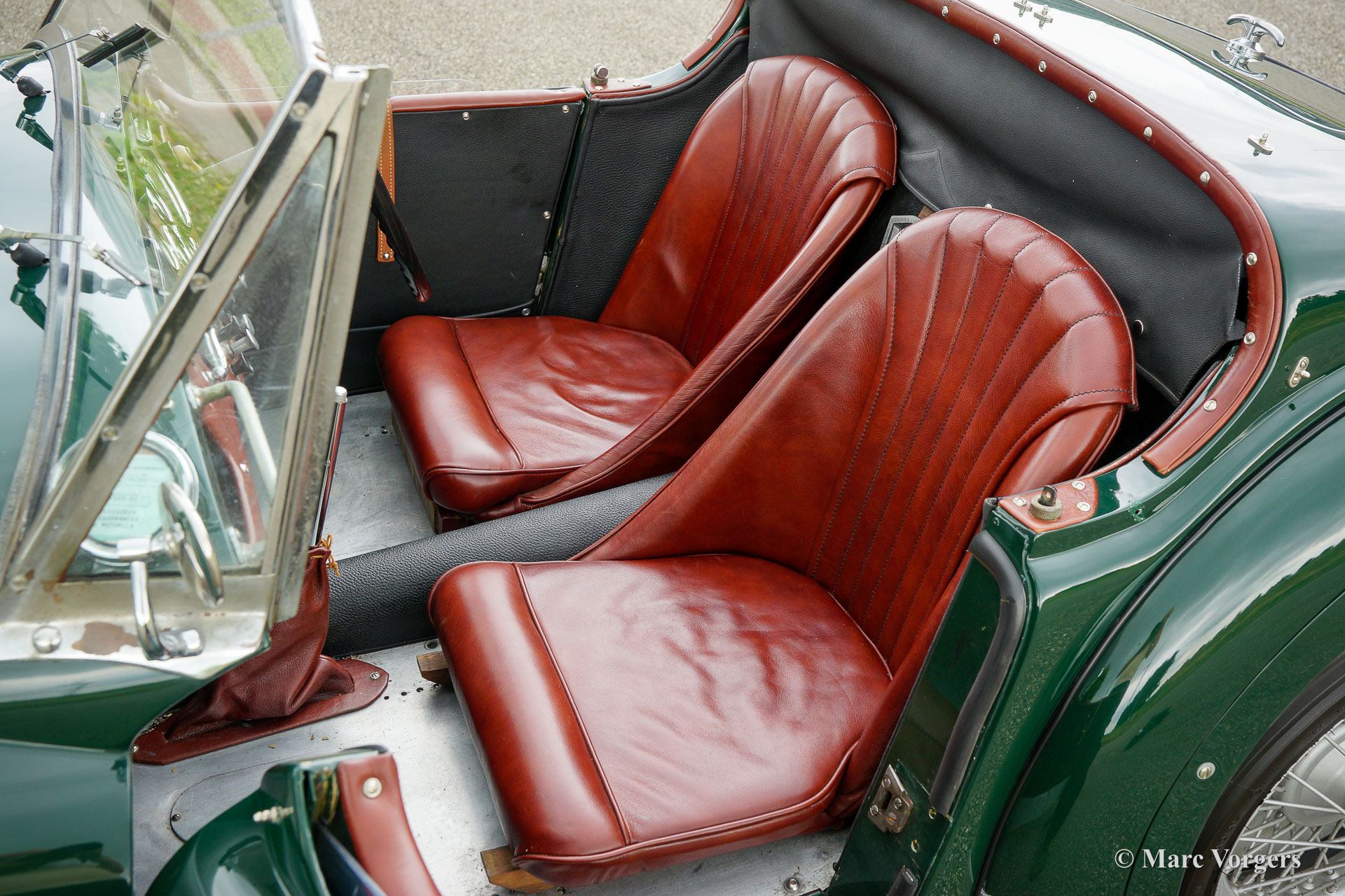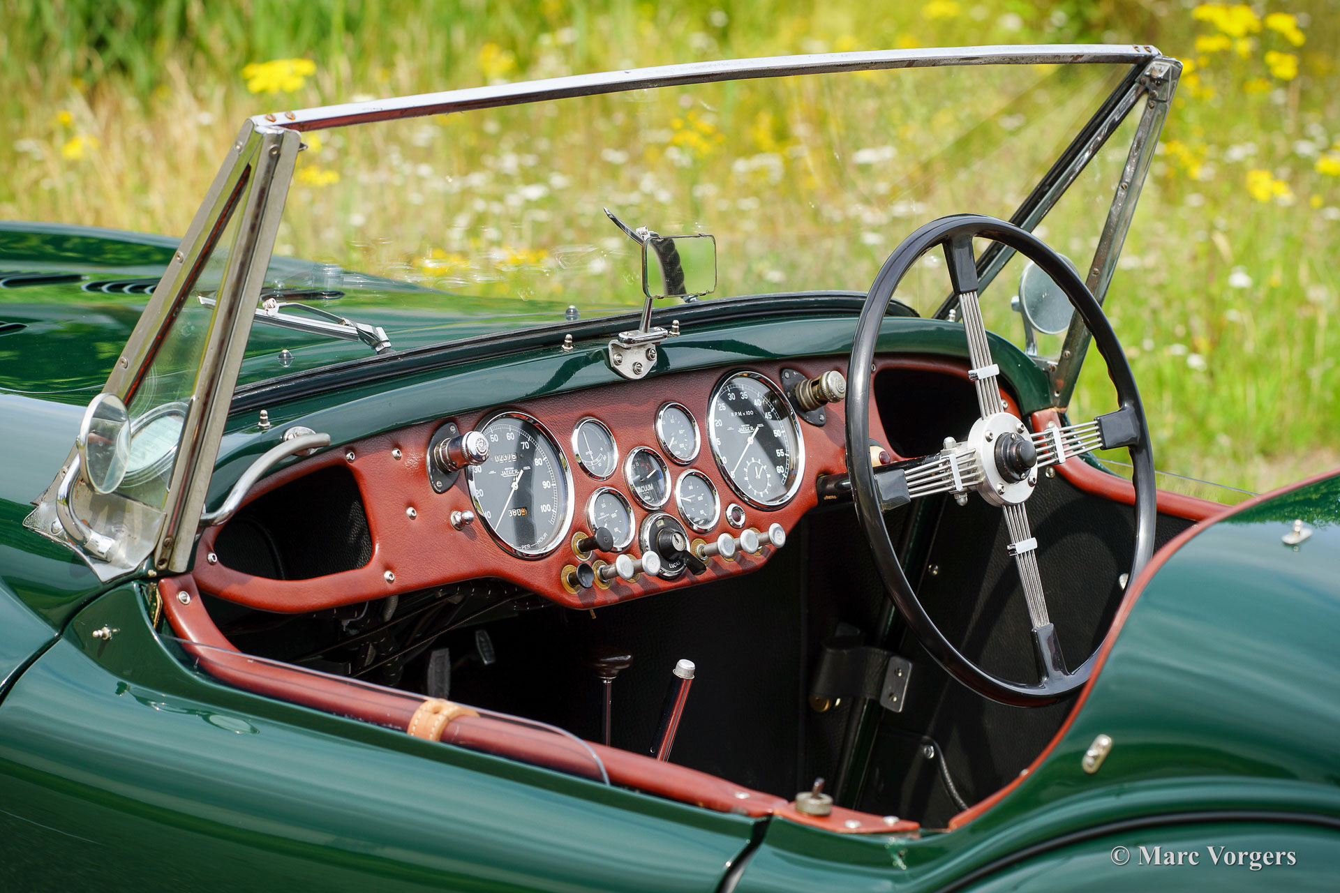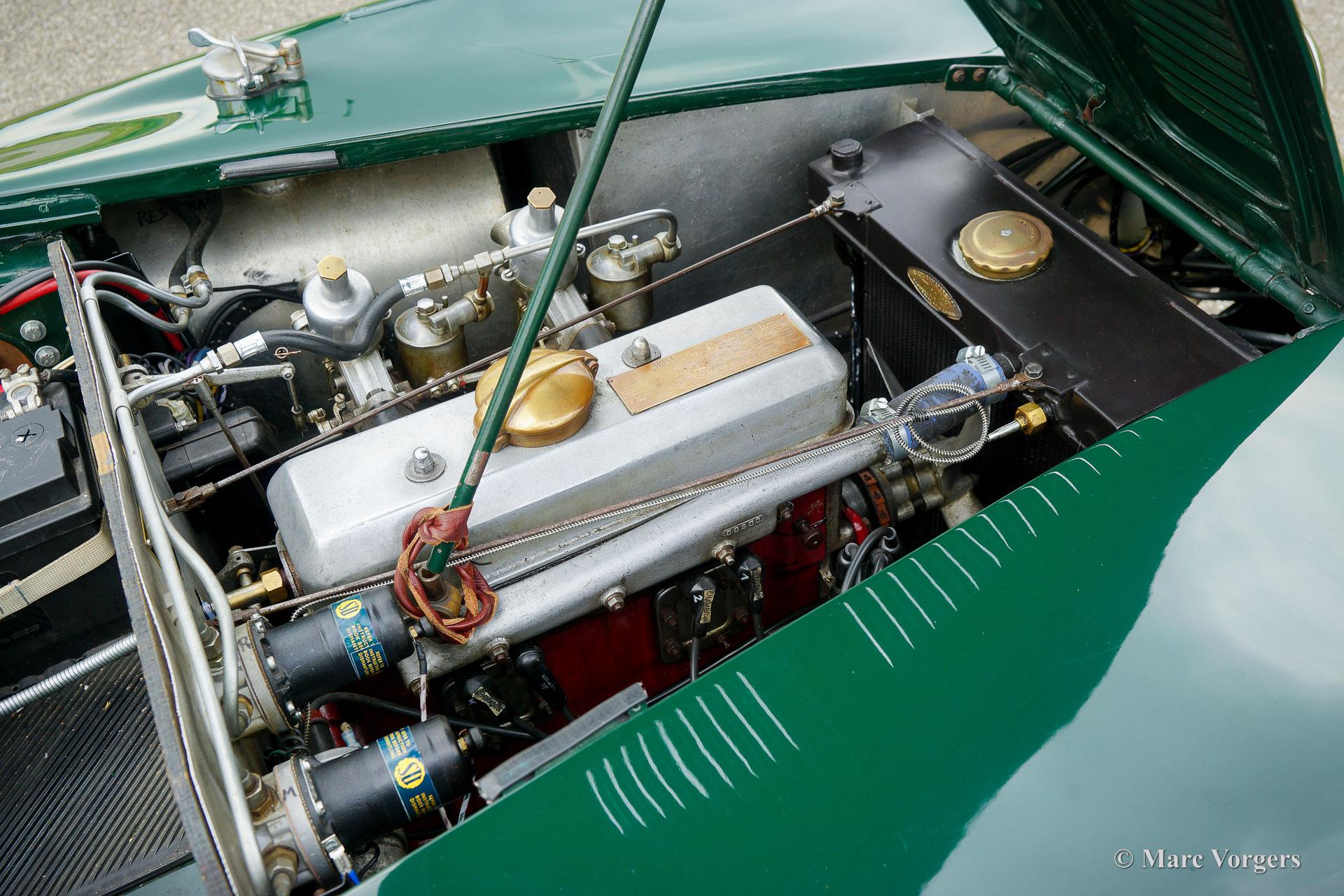 HRG 1500 Aerodynamic, jaar 1947. Kleur donker British Racing Green. Interieur met bruin lederen stoelen. Deze zeldzame en prachtige HRG 1500 Aerodynamic werd nieuw verkocht in het Verenigd Koninkrijk aan de heer Hartford in Fawley. De volledige geschiedenis van de auto is bekend en gedocumenteerd (geschiedenis gedocumenteerd door Ian Dussek historicus van de HRG Association). In het begin van de jaren 1960 werd de auto gerestaureerd naar originele specificaties. Na de restauratie nam de W106 deel aan evenementen en bijeenkomsten zoals de ‘Griffith Formula for Historic Cars’. In de jaren 1990 werd een tweede restauratie gestart door de 5e eigenaar dhr. Halfpenny. De mechanische componenten (motor, versnellingsbak, achteras, chassis) zijn gereviseerd door Roundwood Ltd in Harpenden UK. De heer Halfpenny verkocht de auto als een onvoltooid project in 2017, de nieuwe eigenaar heeft de restauratie in 2019 voltooid. Deze zeldzame automobiel verkeert in een uitstekende conditie met een fraai vintage patina. Deze HRG toont alle originele details en de auto rijdt en schakelt voortreffelijk! De HRG 1500 Aerodynamic is een bijzondere en zeldzame automobiel, er zijn slechts 45 exemplaren van gebouwd van 1945 tot 1949, er zijn nog 20 auto’s van dit type bekend. Deze automobiel vertoont veel interessante technische en stylingdetails. De benzinetank bevindt zich onder het linker voorspatbord en het reservewiel heeft een prominente plaats onder het openklappende rechter voorspatbord. Het met leer beklede dashboard ziet er zeer indrukwekkend uit met een vierspaaks stuur in Brooklands-stijl, zeven meters met chromen ringen en een reeks schakelaars. De auto is uitgerust met bredere 19-inch spaakwielen met klassieke Michelin-banden.