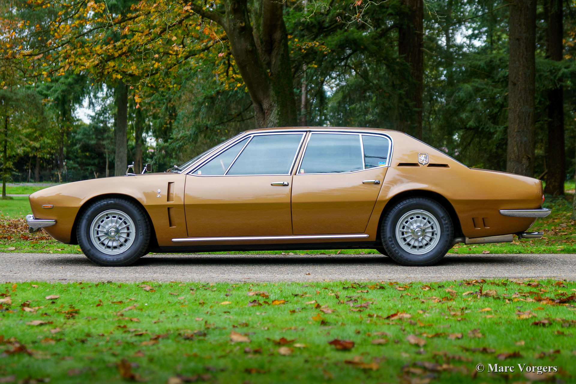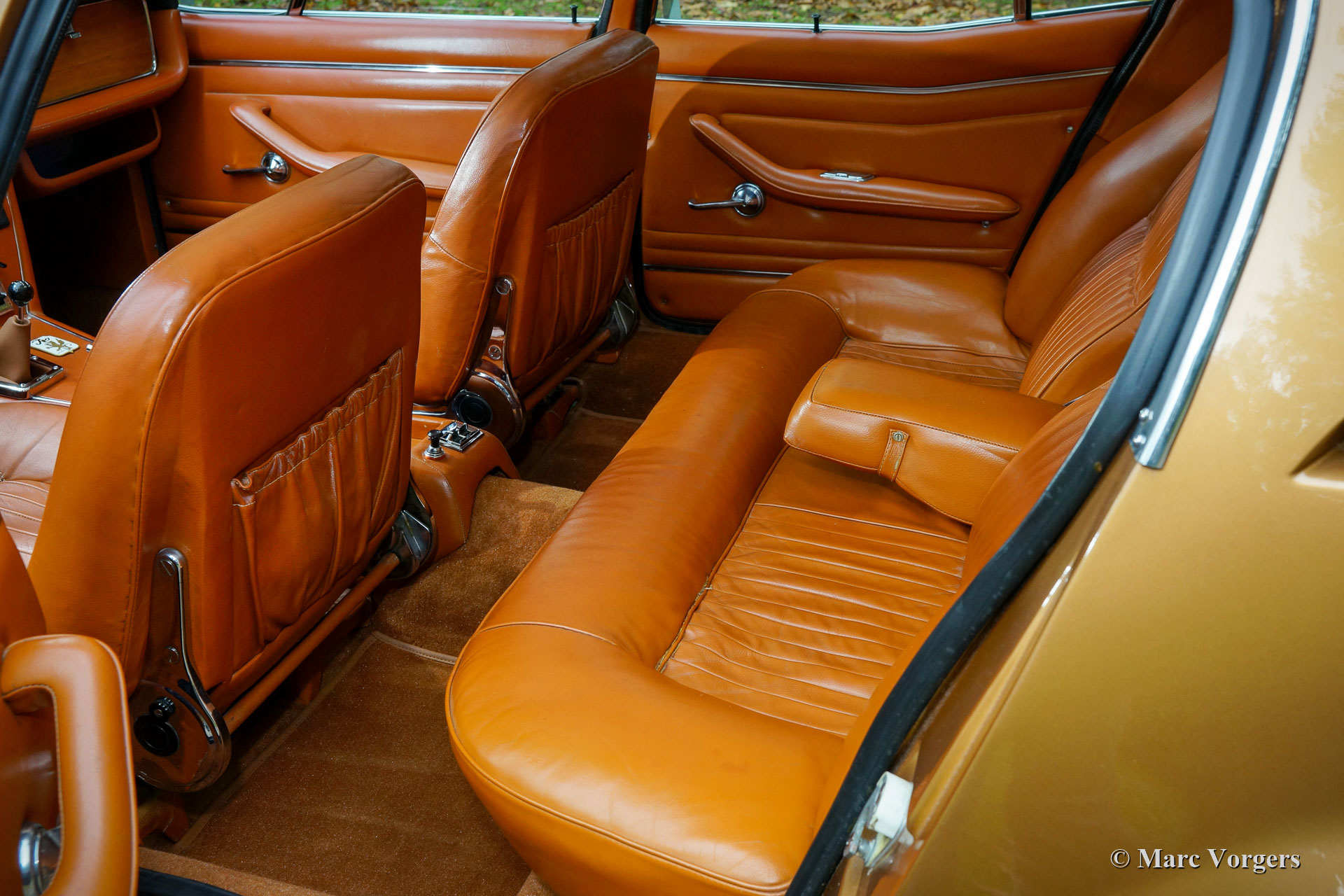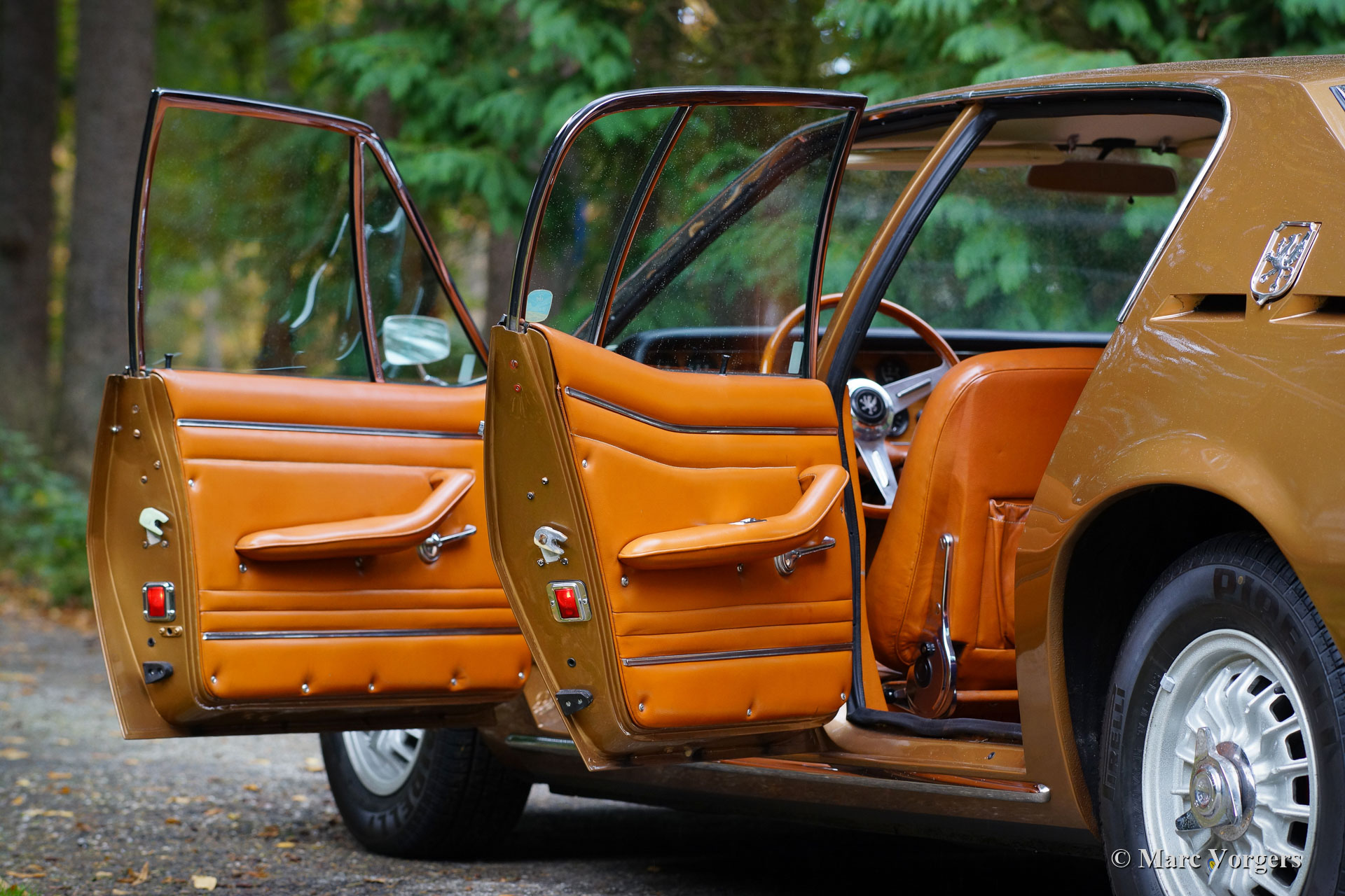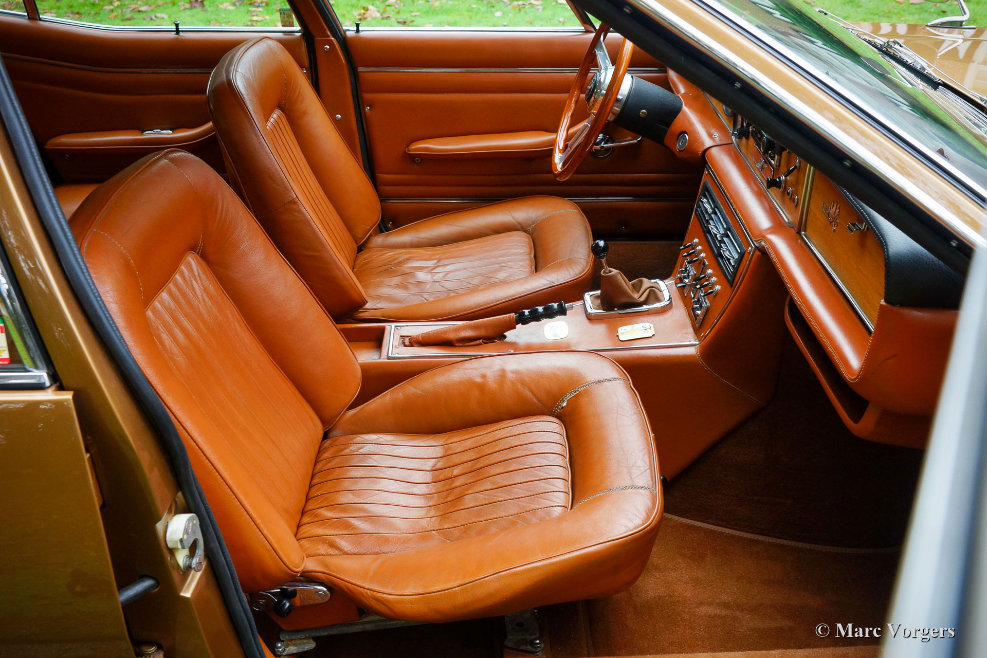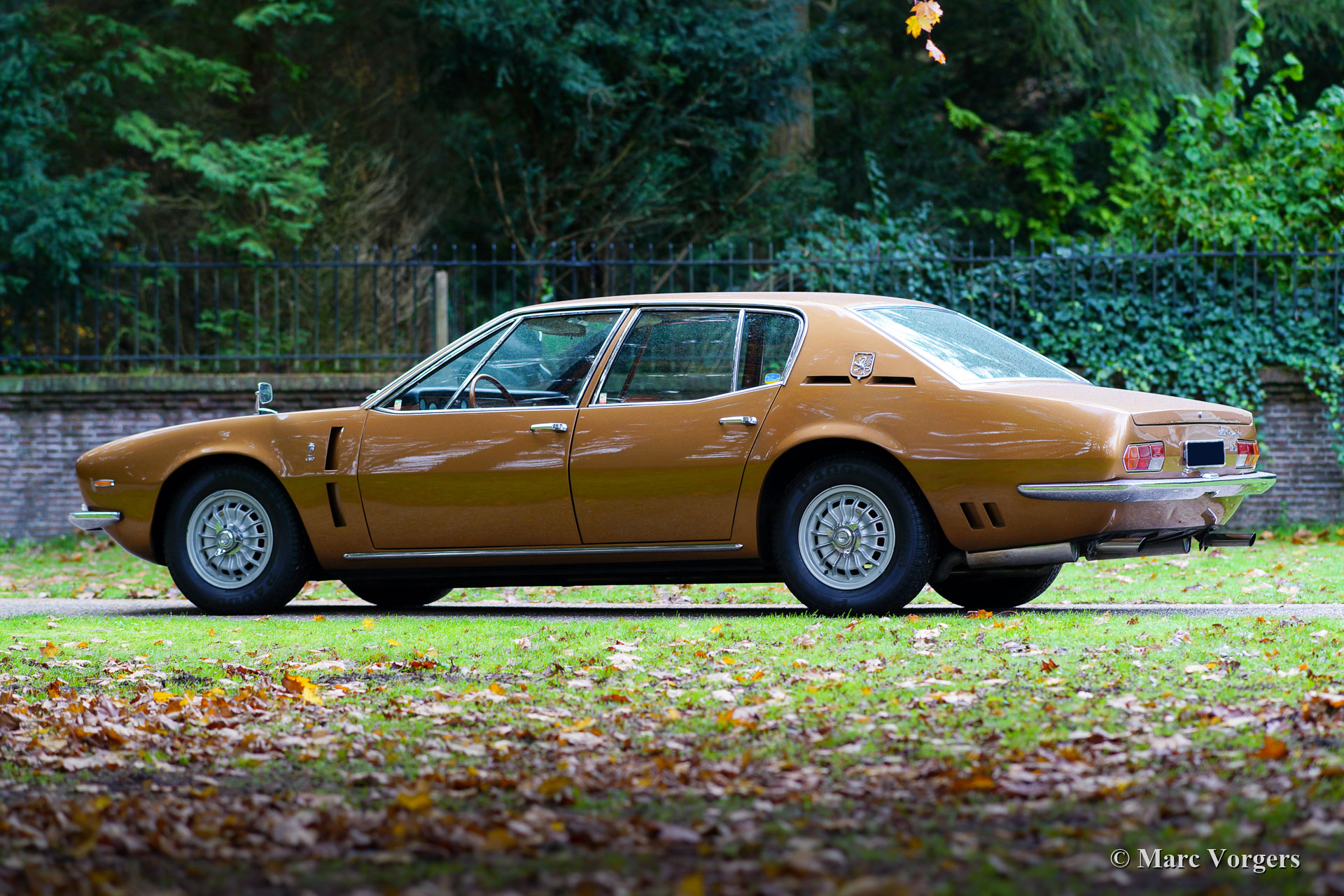 Iso Rivolta Fidia, jaar 1969. Kleur goudbruin metallic gecombineerd met een cognac lederen interieur en lichtbruin tapijt. Deze indrukwekkende en zeer zeldzame Iso Fidia werd nieuw verkocht in Zwitserland. In februari 2015 werd de auto naar Nederland geïmporteerd. De Iso Fidia is zeer zeldzaam, slechts 192 exemplaren werden gebouwd van 1967 tot 1974. De Iso Fidia, ontworpen door Giugiaro bij Ghia, was een van de snelste vierdeurs sedanauto's van de periode. Net als de Iso Rivolta sportwagens werd de Fidia ook aangedreven door robuuste, betrouwbare en zeer krachtige Chevrolet (Corvette) V8-motoren (Ford V8-motoren vanaf 1973). Dit prachtige exemplaar is uitgerust met een Chevrolet 5.4 Liter V8-motor gekoppeld aan een handgeschakelde vierversnellingsbak (volledig gesynchroniseerd). De achteras is voorzien van een sperdifferentieel om de 350 paardenkrachten op de juiste manier op straat te brengen. Deze Iso Fidia verkeert van binnen en van buiten in uitstekende conditie en de auto rijdt geweldig! Het is een heel speciaal gevoel om in een grote Italiaanse luxe sedan met V8 te rijden. Het leren interieur met het houten dashboard ademt pure luxe uit de jaren 1960, de stuurbekrachtiging is een genot en de donder van de prachtige V8-motor op de achtergrond maakt de ervaring compleet. De auto is uitgerust met prachtige originele lichtmetalen velgen, Pirelli P4000-banden en een Becker Mexico stereo cassette radio uit de jaren 1970. Dit is een topexemplaar van de zeer zeldzame Iso Rivolta Fidia.