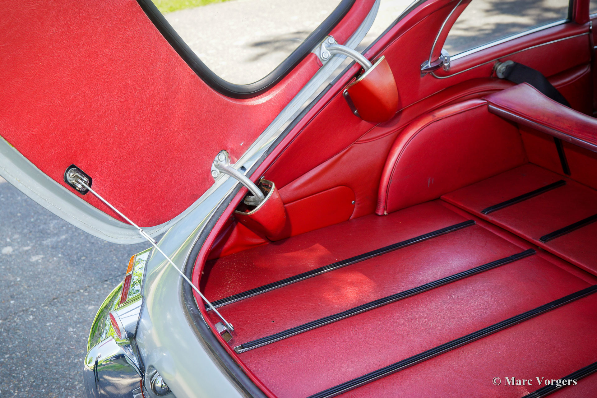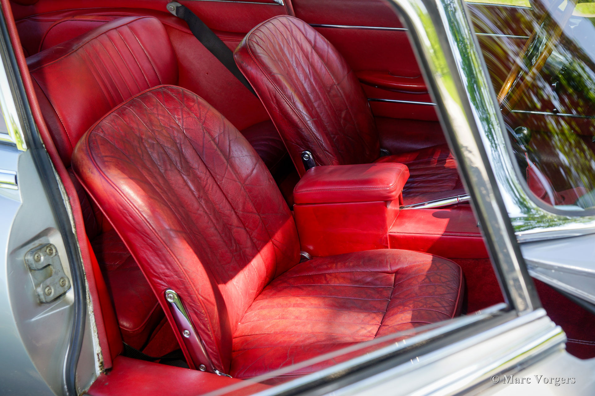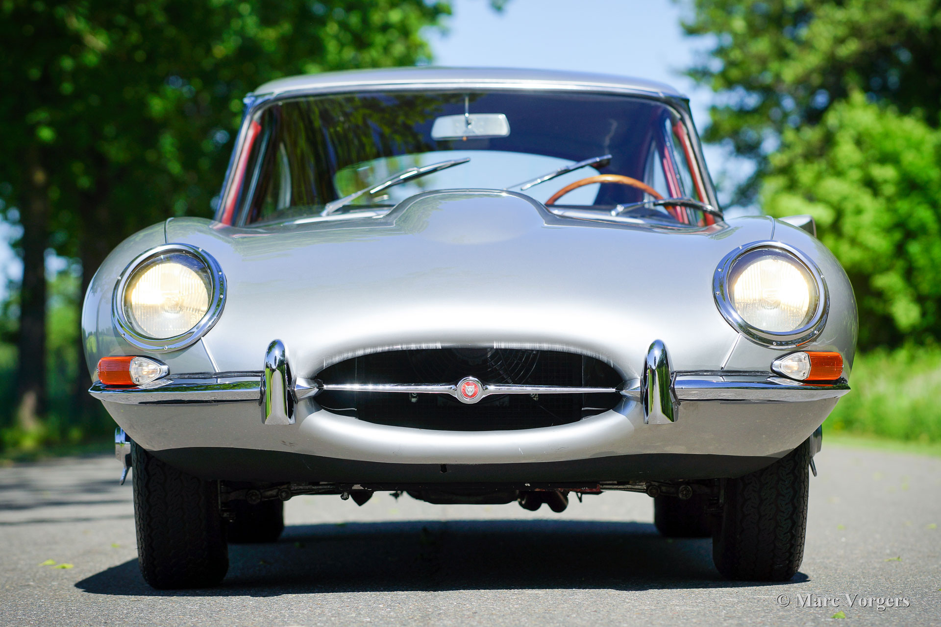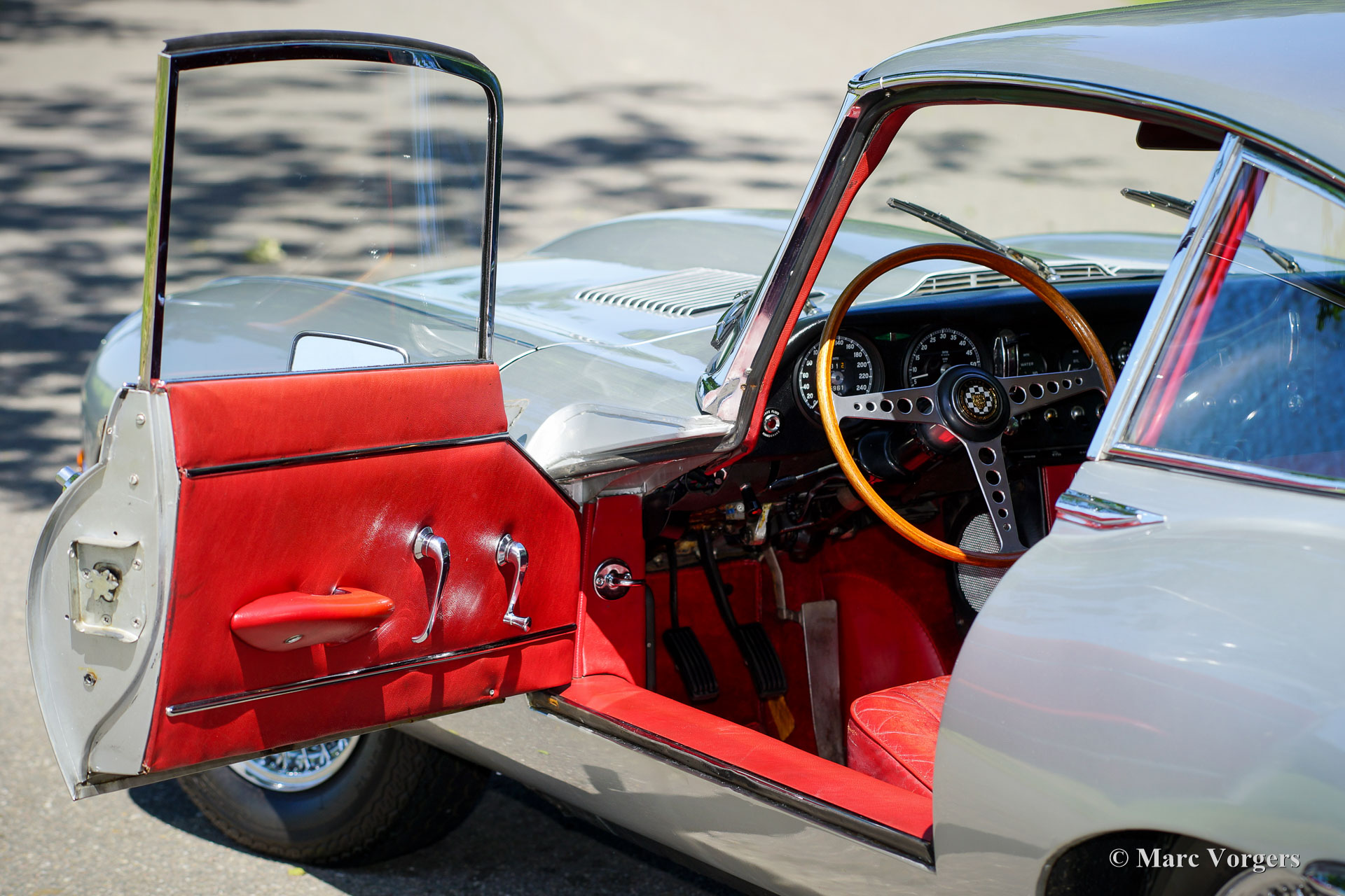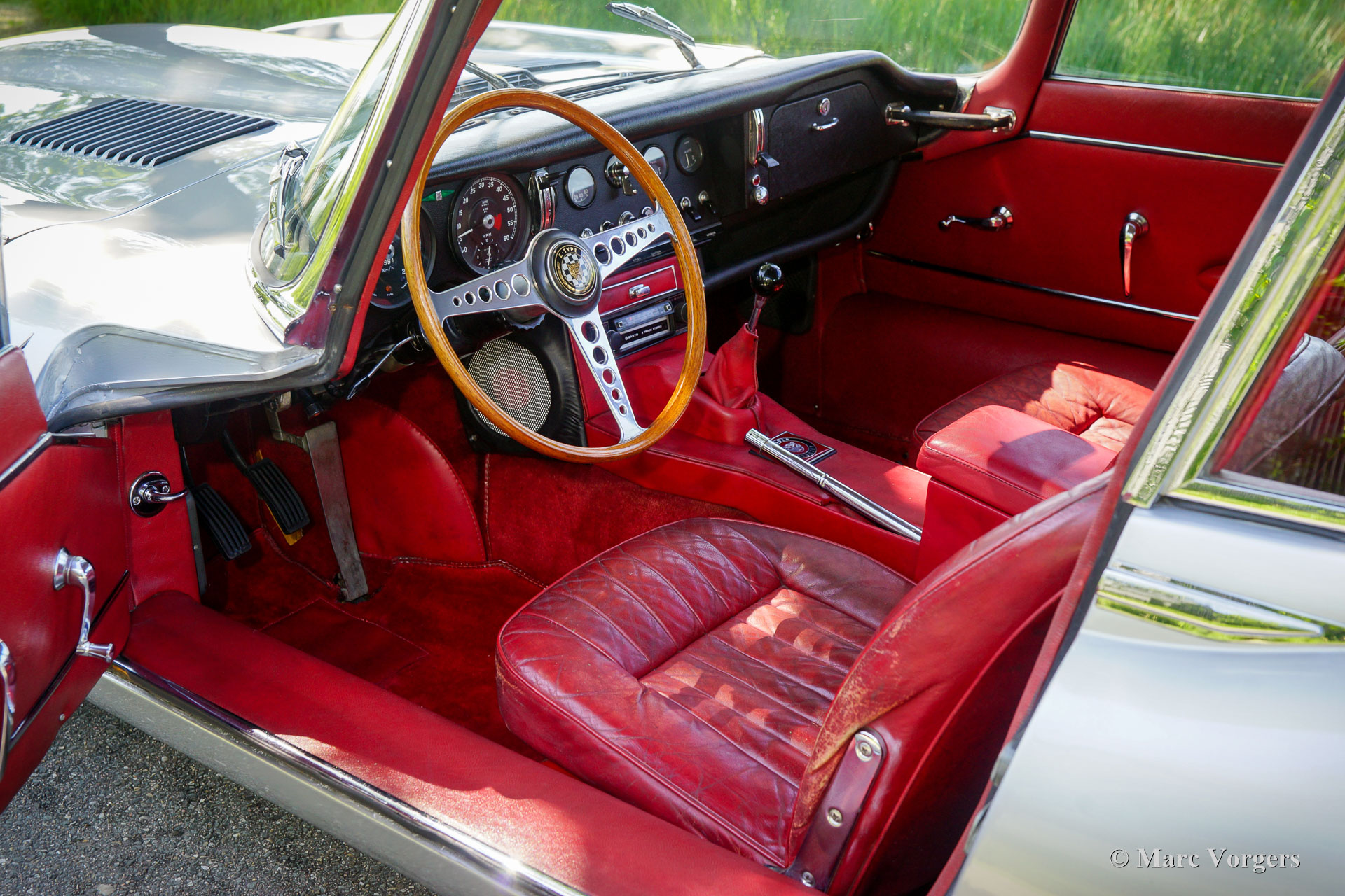Jaguar E-type 4.2 Litre FHC 2+2, bouwjaar 1966. Kleur zilver metallic gecombineerd met een roodlederen interieur en rood tapijt. Deze prachtige en ‘matching numbers’ Jaguar E-type serie 1 FHC 2+2 (Fixed Head Coupé) is nieuw verkocht in Frankrijk. Deze Jaguar E-type is nooit gerestaureerd en verkeert in een zeer goede conditie! De auto toont alle originele serie 1 details zoals de fantastische koplampen met glazen afdekking en chromen randen, de prachtig gevormde bumpers en het bijzonder fraaie interieur. Het 2+2-model werd geïntroduceerd in 1966. Gebouwd op een verlengde wielbasis, bood het 2+2-model extra ruimte voor twee kleine zitplaatsen achterin en meer hoofdruimte voor lange passagiers. De auto heeft een prachtig vintage patina en het lederen interieur is nog mooi origineel. Het serie 1 dashboard is een genot om naar te kijken met de vele meters en schakelaars. Bijzonder is dat deze E-type 2+2 is voorzien van een handgeschakelde versnellingsbak met 4 versnellingen; de meeste 2+2-modellen werden verkocht met automatische 3-versnellingsbakken. Deze Europese auto heeft een ‘langere’ eindoverbrenging dan de Amerikaanse modellen, waardoor deze een hogere topsnelheid heeft en de motor veel minder toeren draait bij het rijden met hoge kruissnelheden. De handgeschakelde versnellingsbak geeft de auto een sportief karakter! Recent zijn de 4.2 Liter zescilinder-lijnmotor, de carburateurs, de remmen en de wielophanging gereviseerd. De koppeling is vernieuwd, evenals de benzinetank. Deze Jaguar E-type 4.2 liter 2+2 FHC is gebouwd in het eerste productiejaar. Deze super originele E-type ziet er prachtig uit en de auto rijdt uitstekend!