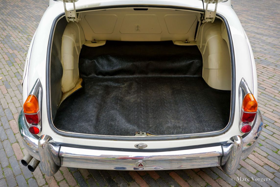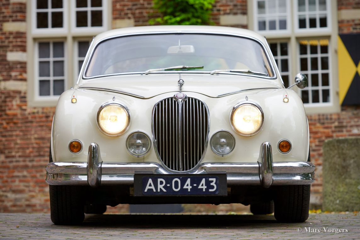 Jaguar MK II 3.8 liter automatic, jaar 1962. Carrosserie uitgevoerd in Old English White gecombineerd met een tweekleurig grijs stoffen/aquamarijnblauw vinyl interieur, afgewerkt met zwart tapijt. Deze prachtige Jaguar MK II 3.8 liter werd op 14 juli 2010 naar Nederland geïmporteerd. De auto werd op 6 april 2017 door de huidige eigenaar gekocht. In 2017 werd de automatische versnellingsbak gerepareerd en de stuurpomp geïnspecteerd met een kilometerstand van 522 mijl. In juni 2019 heeft de auto een uitgebreide onderhoudsbeurt gehad bij een Jaguar specialist in Nederland. Diverse olielekkages werden gerepareerd, de dynamo gereviseerd, de spanningsregelaar vernieuwd en afgesteld, de rubberen motorsteunen vernieuwd, de carburateurs gereinigd en voorzien van nieuwe vlotternaalden/zittingen en de brandstoftank werd vernieuwd. De automatische versnellingsbak werd vervolgens volledig gereviseerd. Ook werden er nieuwe Lucas Fog Rangers gemonteerd. Sinds 2017 is er € 15.000 geïnvesteerd in reparaties, onderhoud en verbeteringen. Deze Jaguar MK II 3.8 liter verkeert in een zeer goede en prachtige staat, zowel van binnen als van buiten. Alleen de achterste onderkanten van de 'spats' over de achterwielen vertonen kleine corrosieplekjes (kleine bubbels in de lak op de foto’s zichtbaar). Omdat de Jaguar deel uitmaakte van een klassieke autocollectie, werd er weinig mee gereden; de kilometerteller staat nu op 2023 mijl. De Jaguar Mk II 3.8 liter werd geïntroduceerd in 1959. De MK II was een verfijnde Britse sedan die comfort combineerde met opmerkelijke prestaties voor zijn tijd. Aangedreven door de topklasse 3.8 liter Jaguar XK 220 pk zes-in-lijn sportwagenmotor, bood de MK II een sterke acceleratie (iets minder dan 10 seconden van 0 naar 100 km/u met de automatische drieversnellingsbak van Borg Warner) en een soepele rijervaring, waardoor de auto populair was bij zowel welgestelde particulieren als bij de politie. Ook het dievengilde waardeerde de MK II; “Pure wheels for outrunnin' the Dibble.” Dit exemplaar beschikt over een prachtig origineel interieur in een schitterende jaren 60-kleurstelling. Het houten dashboard en de overige houtafwerking, die rijkelijk in het interieur tot hun recht komen, geven het interieur een exclusieve en elegante uitstraling. De auto is voorzien van een originele Radiomobile AM-radio. Deze auto is uitsluitend op afspraak te bezichtigen en te berijden.