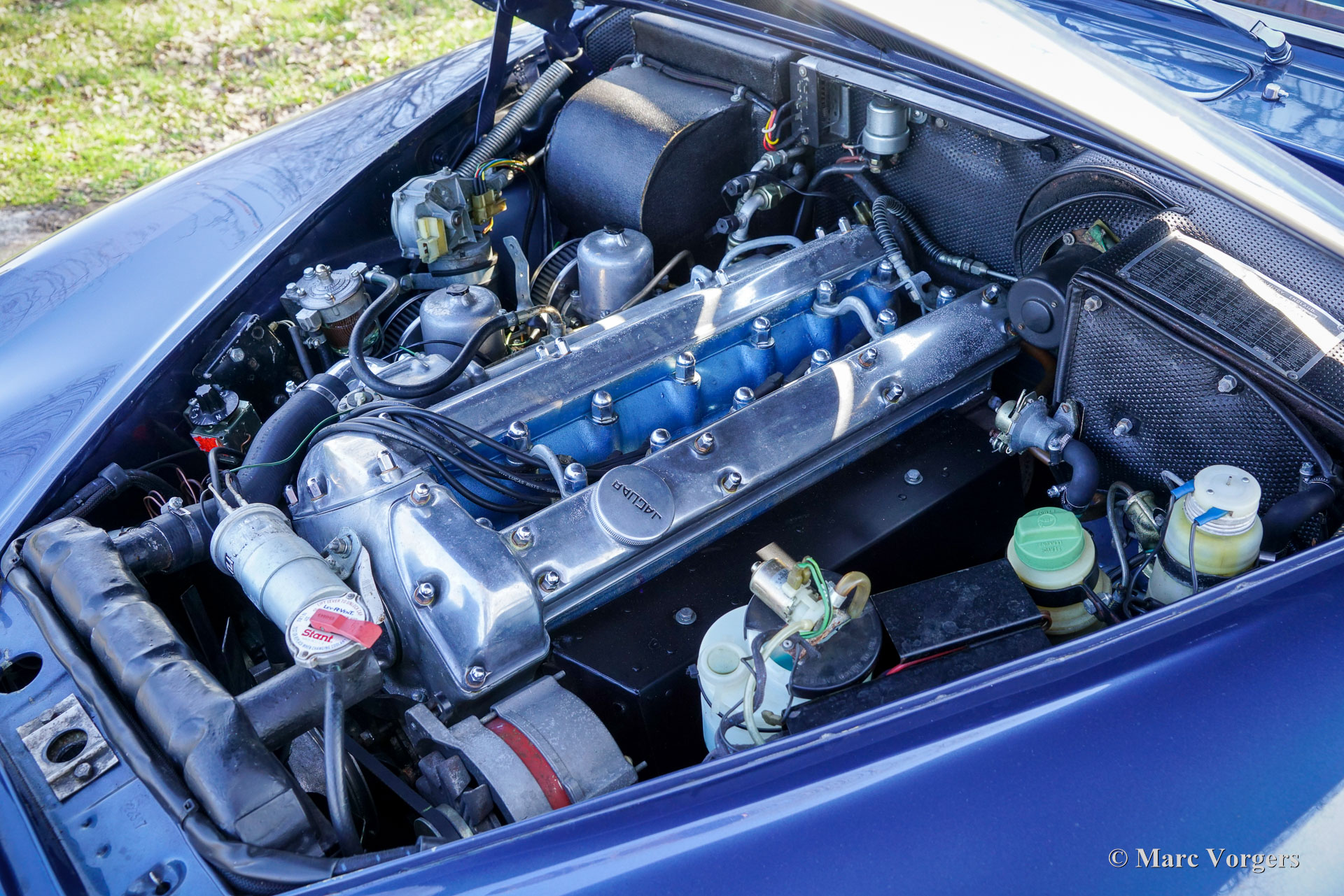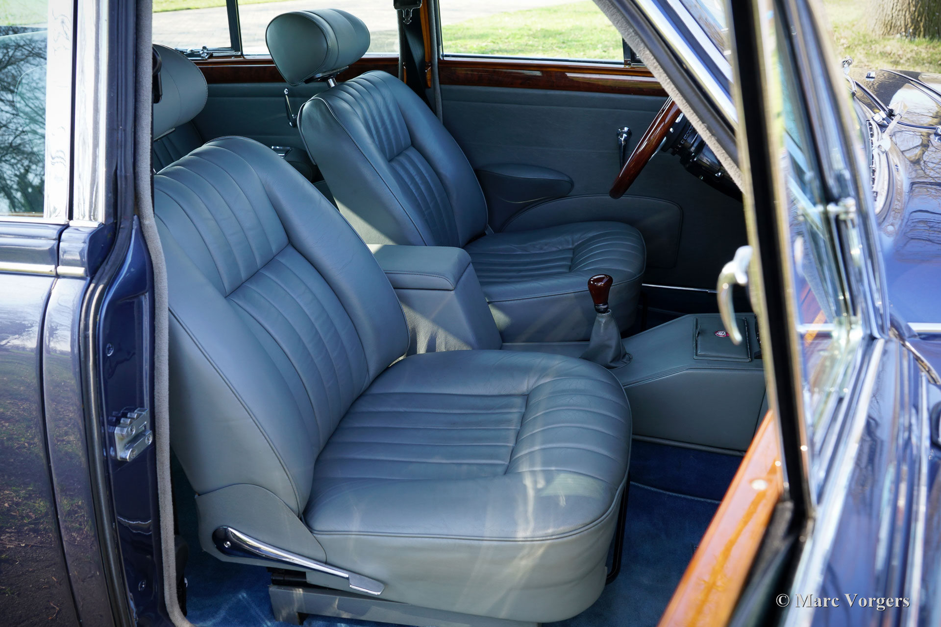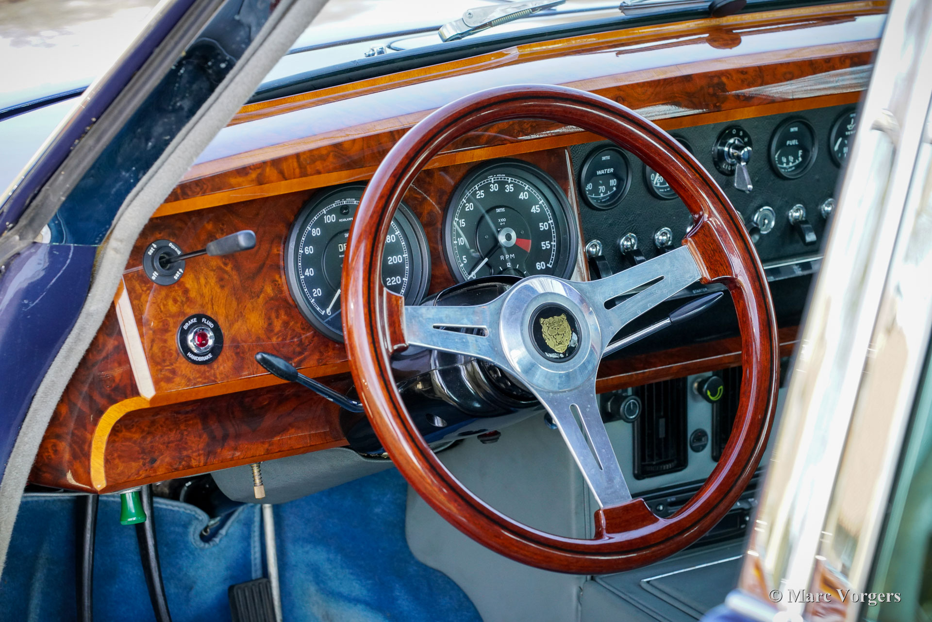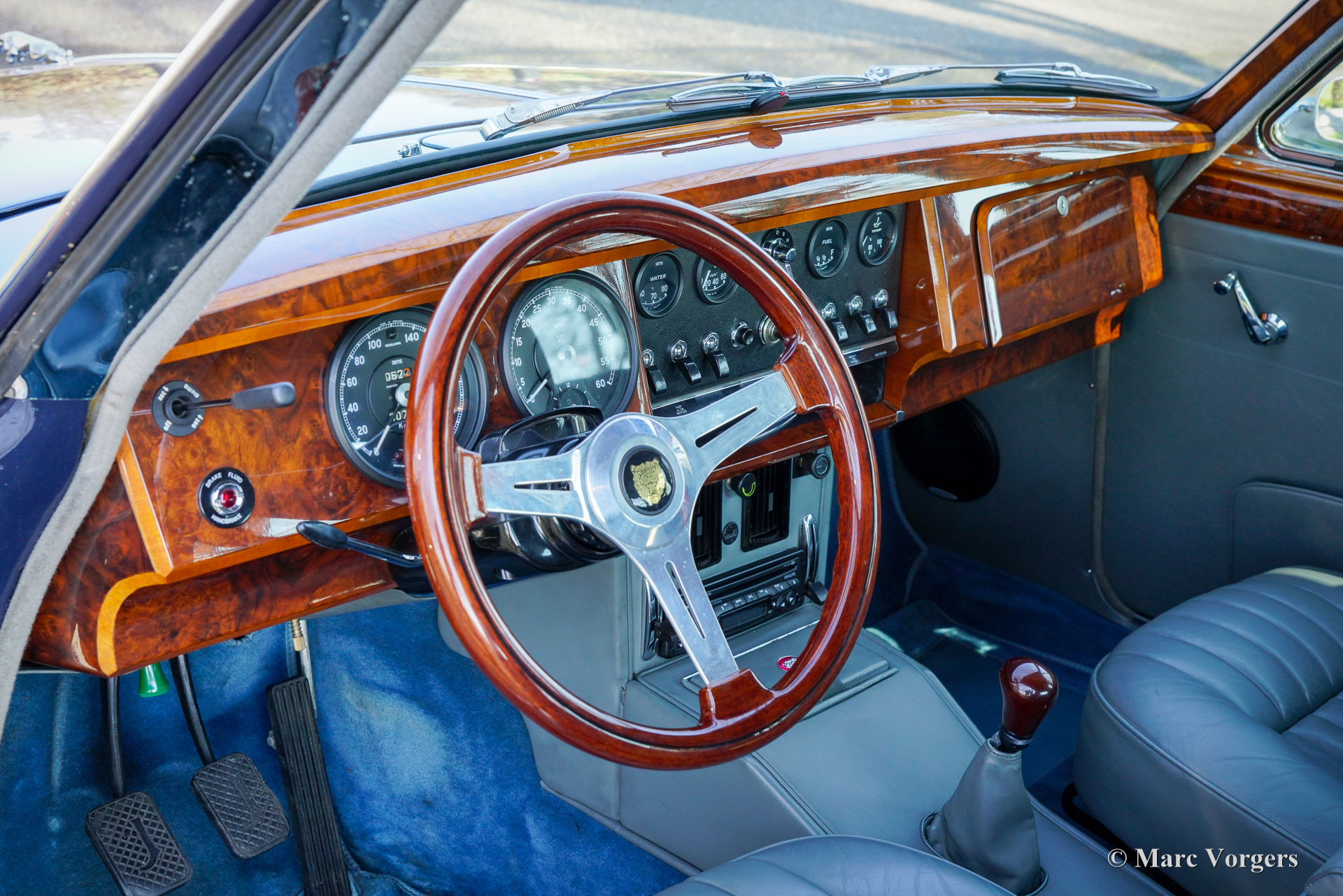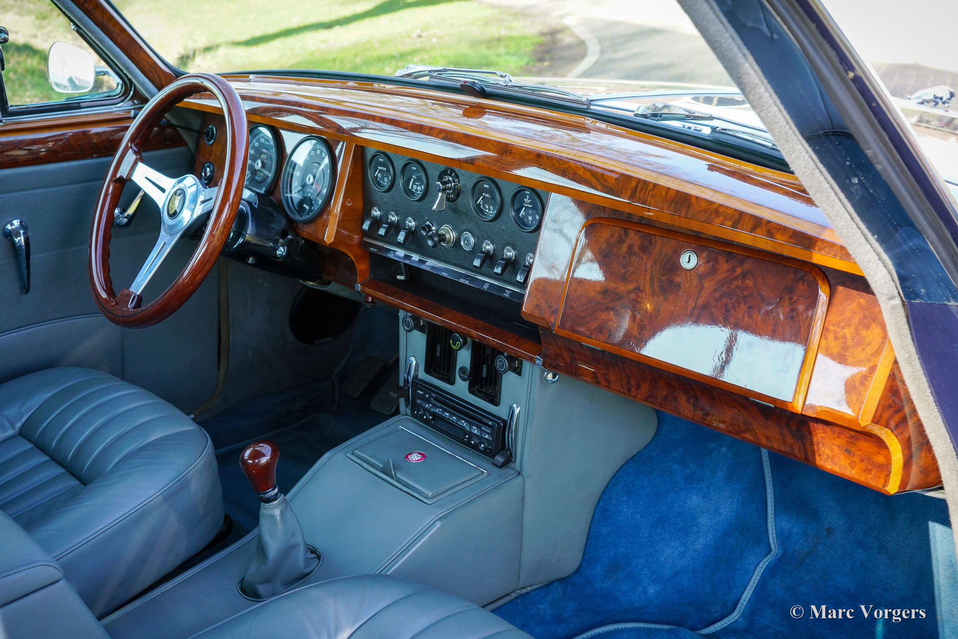 De carrosserie is tot op het metaal aangepakt en uitgebreid behandeld tegen roest. Tijdens de opbouw zijn diverse moderniseringen doorgevoerd waardoor de auto merkbaar beter rijdt dan een standaard Mk II. De 3,8‑liter zescilinder is volledig gereviseerd en licht getuned voor extra vermogen waarbij een oliekoeler, elektrische ventilator en grotere radiator aangebracht zijn voor betere koeling. De motor is gekoppeld aan een volledig gesynchroniseerde vijfbak, wat het comfort en de bruikbaarheid in het huidige verkeer vergroot. Het onderstel is opgebouwd met aangepaste veren, instelbare schokdempers, verbeterde stabilisatoren en een achteras met gewijzigde eindoverbrenging. De besturing is voorzien van stuurbekrachtiging afkomstig van een XJS. De remmen zijn rondom opgewaardeerd met XJ6 schijven en remklauwen en een krachtigere rembekrachtiger. Het interieur is volledig vernieuwd met behoud van de klassieke uitstraling. Leder, houtwerk en tapijt zijn vernieuwd en gerestaureerd, extra isolatie vermindert rijgeluiden en de gemonteerde XJS‑stoelen bieden meer comfort. Moderne voorzieningen zoals cruise control, centrale vergrendeling, getint glas en halogeenverlichting zijn discreet geïntegreerd. Een fraai Mota‑Lita stuur met houten rand geeft de ‘finishing touch’ aan het prachtige interieur. De auto is sinds de restauratie goed onderhouden en regelmatig bereden, waardoor hij direct inzetbaar is. Door de fraaie inpassing van de verbeteringen blijft de bijzondere sfeer van een Britse jaren‑zestig‑saloon behouden. De Jaguar Mk II met 3.8 liter motor en handgeschakelde versnellingsbak was het topmodel van de serie. Dit verbeterde exemplaar doet daar wat prestaties, comfort, veiligheid en finesse nog een stevige schep bovenop. Dit is een ideale Jaguar Mk II voor Jaguar liefhebbers die zich regelmatig met een klassieker in het moderne verkeer willen begeven en daar geen concessies aan willen doen.
