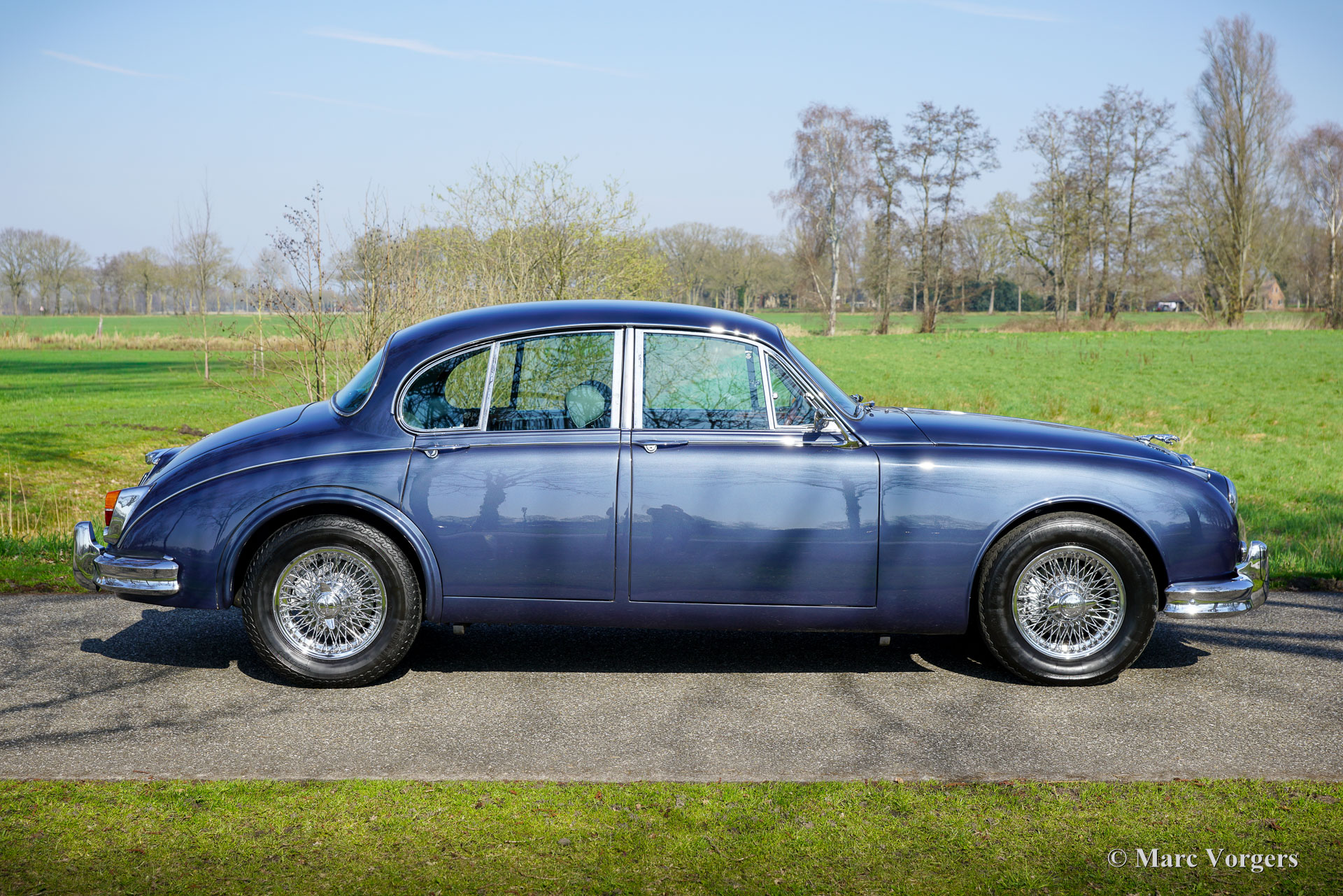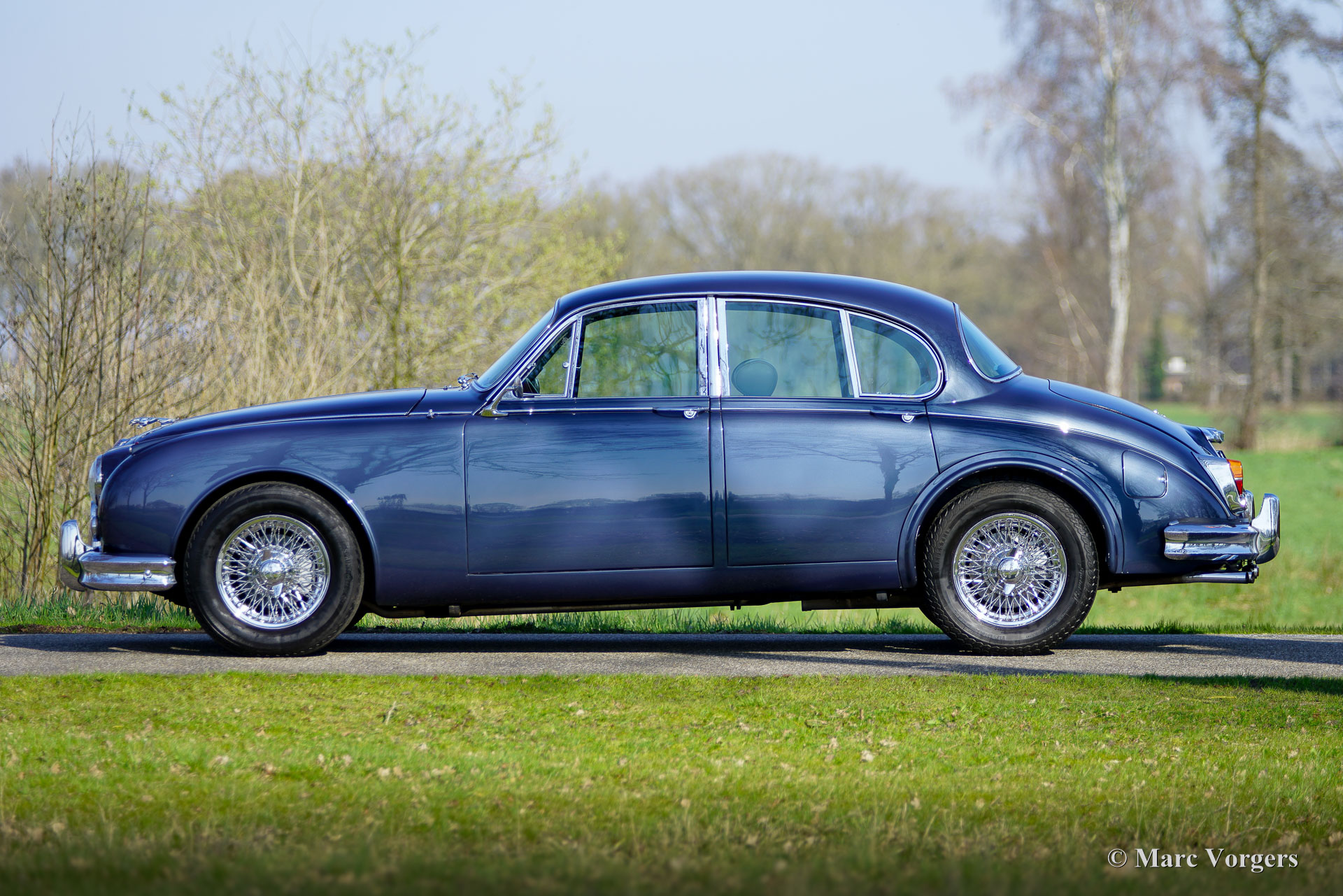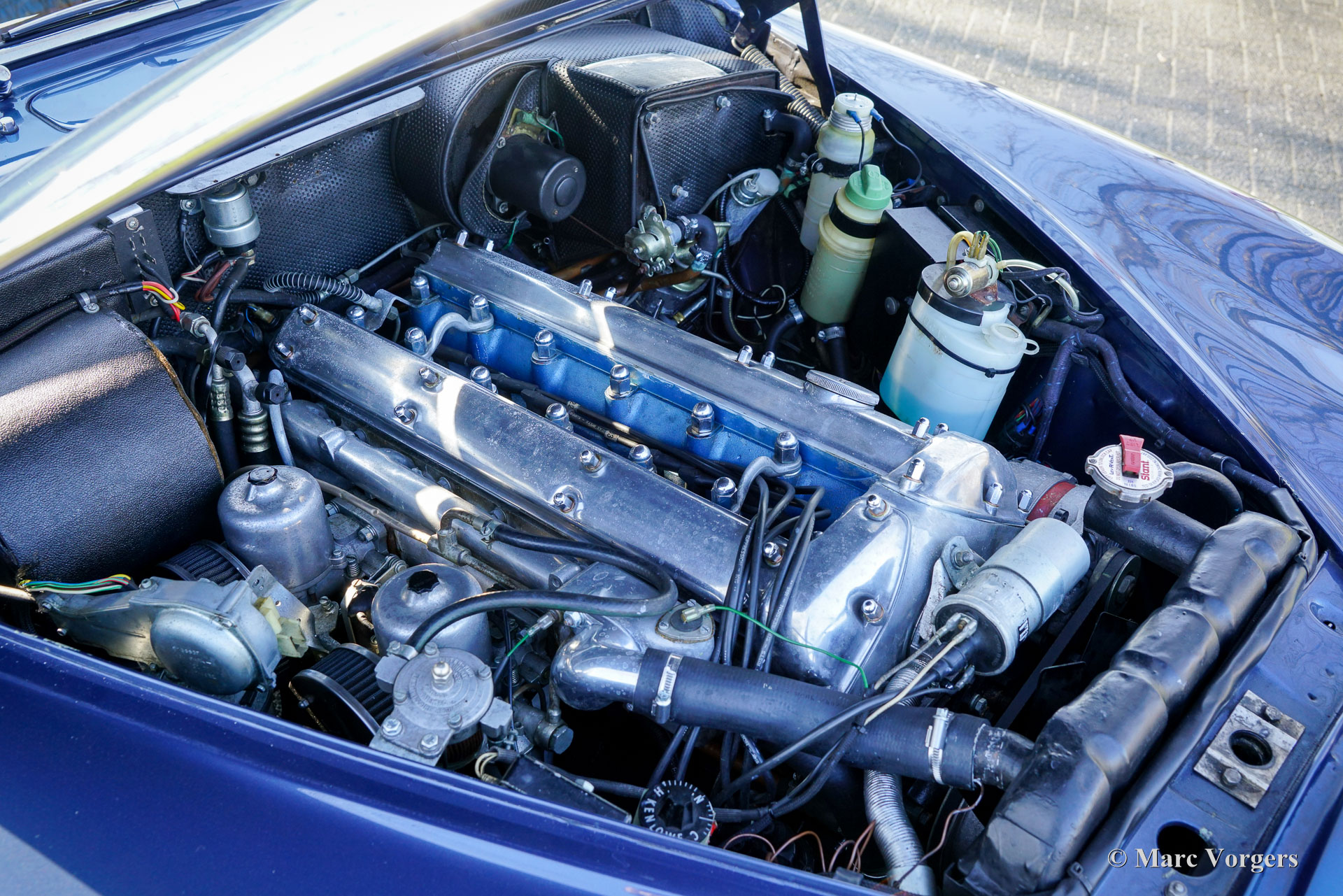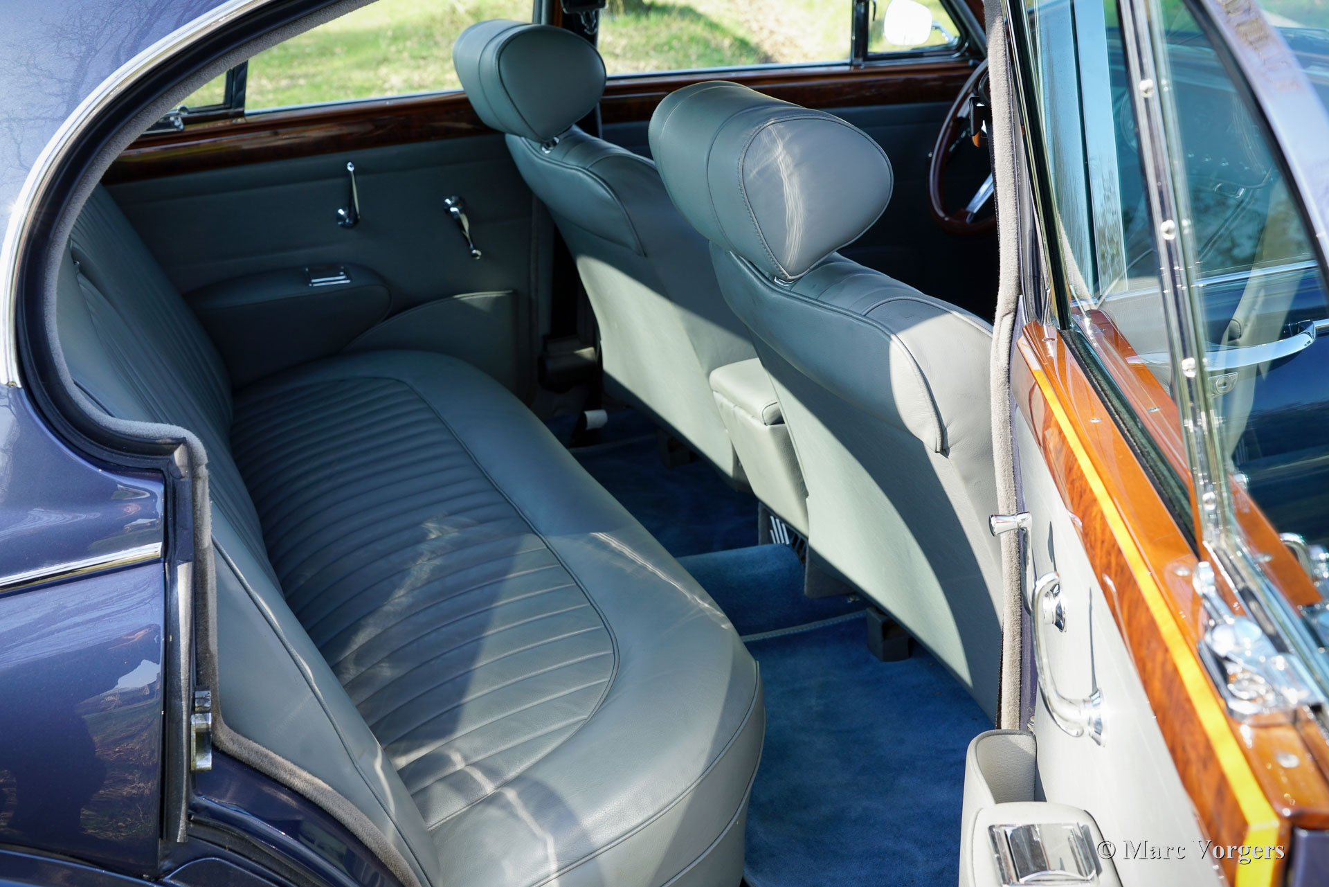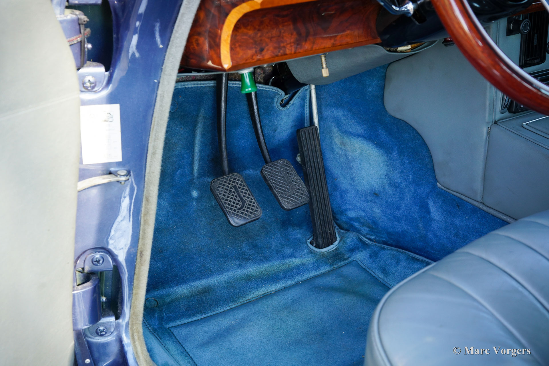 De carrosserie is tot op het metaal aangepakt en uitgebreid behandeld tegen roest. Tijdens de opbouw zijn diverse moderniseringen doorgevoerd waardoor de auto merkbaar beter rijdt dan een standaard Mk II. De 3,8‑liter zescilinder is volledig gereviseerd en licht getuned voor extra vermogen waarbij een oliekoeler, elektrische ventilator en grotere radiator aangebracht zijn voor betere koeling. De motor is gekoppeld aan een volledig gesynchroniseerde vijfbak, wat het comfort en de bruikbaarheid in het huidige verkeer vergroot. Het onderstel is opgebouwd met aangepaste veren, instelbare schokdempers, verbeterde stabilisatoren en een achteras met gewijzigde eindoverbrenging. De besturing is voorzien van stuurbekrachtiging afkomstig van een XJS. De remmen zijn rondom opgewaardeerd met XJ6 schijven en remklauwen en een krachtigere rembekrachtiger. Het interieur is volledig vernieuwd met behoud van de klassieke uitstraling. Leder, houtwerk en tapijt zijn vernieuwd en gerestaureerd, extra isolatie vermindert rijgeluiden en de gemonteerde XJS‑stoelen bieden meer comfort. Moderne voorzieningen zoals cruise control, centrale vergrendeling, getint glas en halogeenverlichting zijn discreet geïntegreerd. Een fraai Mota‑Lita stuur met houten rand geeft de ‘finishing touch’ aan het prachtige interieur. De auto is sinds de restauratie goed onderhouden en regelmatig bereden, waardoor hij direct inzetbaar is. Door de fraaie inpassing van de verbeteringen blijft de bijzondere sfeer van een Britse jaren‑zestig‑saloon behouden. De Jaguar Mk II met 3.8 liter motor en handgeschakelde versnellingsbak was het topmodel van de serie. Dit verbeterde exemplaar doet daar wat prestaties, comfort, veiligheid en finesse nog een stevige schep bovenop. Dit is een ideale Jaguar Mk II voor Jaguar liefhebbers die zich regelmatig met een klassieker in het moderne verkeer willen begeven en daar geen concessies aan willen doen.