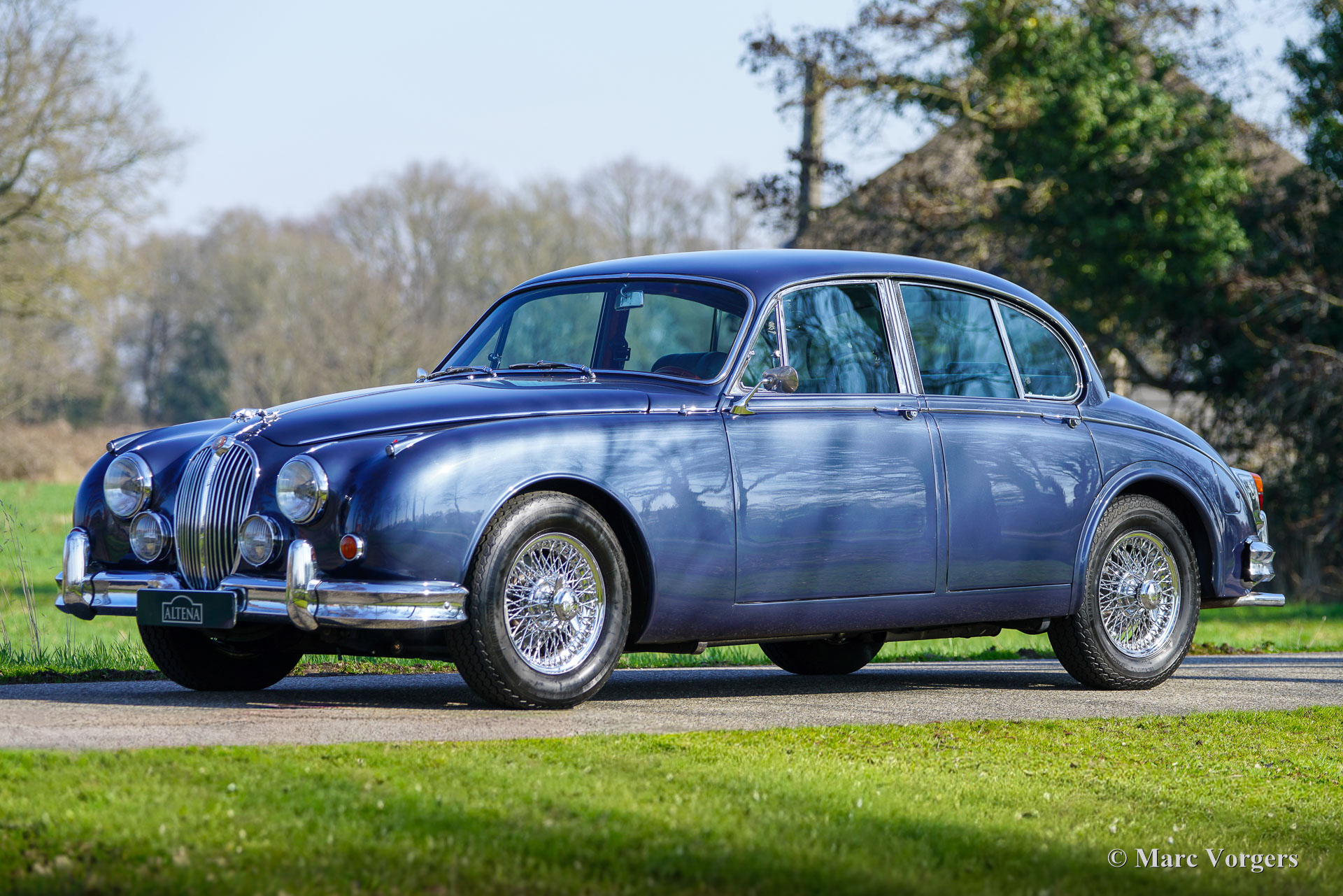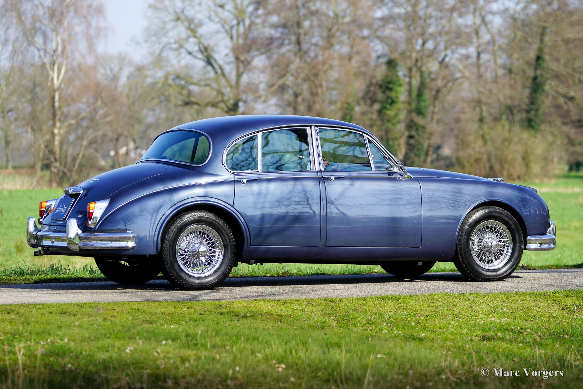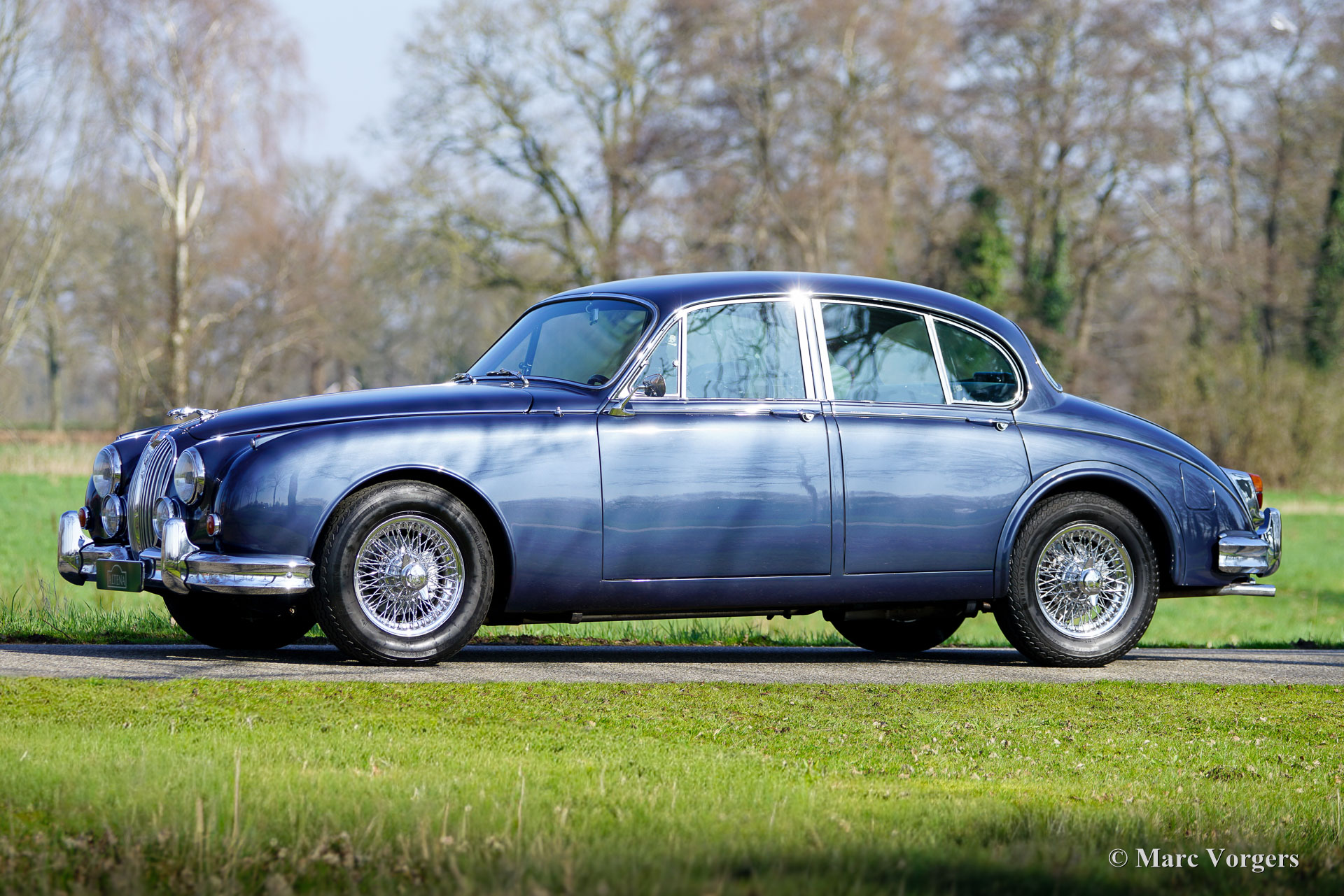 Jaguar Mk II (Mk 2) 3.8 Liter, jaar 1963. Chassisnummer P222387BW, motornummer LC5929-9. Het exterieur van deze prachtige Jaguar Mk II is uitgevoerd in de kleur Opalescent blue (blauw metallic) in combinatie met een grijs lederen interieur afgewerkt met blauw tapijt. Dit prachtige exemplaar is enige jaren geleden volledig gerestaureerd en technisch ingrijpend verbeterd. Deze Mk II is een klassieke auto met verbeterd comfort, verbeterde veiligheid en verbeterde gebruiksvriendelijkheid. Deze Jaguar verkeert in een excellente conditie en de rijbeleving is geweldig!