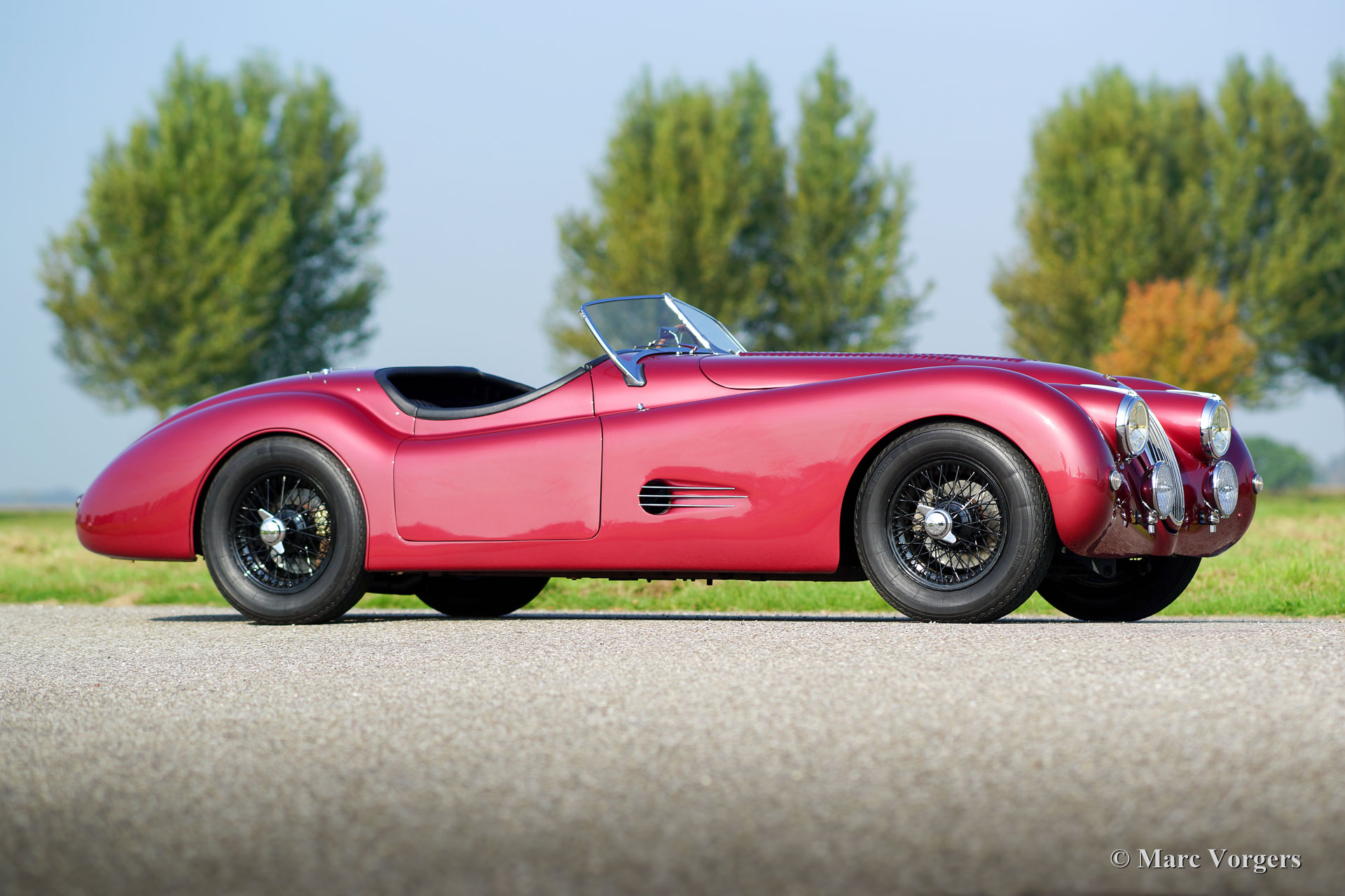 Jaguar XK 120 OTS ‘Sports Special’, jaar 1953. Kleur rood metallic met een zwart leren interieur en zwart tapijt. Deze fantastische en heel speciale Jaguar XK 120 is in het verleden gerestaureerd en daarbij kunstig verfraaid. De bumpers zijn weggelaten en de stalen carrosserie werd subtiel op details aangepast. U ziet louvres in de motorkap en koelopeningen in de voorspatborden voor extra koeling van de krachtige 3.8 liter motor. De achterkant is vloeiender gemaakt en voorzien van andere achterlichten. De belangrijkste aanpassing betreft de extra interieurruimte waardoor de XK 120 Roadster ook geschikt is voor lange bestuurders. Het zwartleren interieur is voorzien van fraaie klassieke kuipstoelen en is uitstekend afgewerkt. De speciale voorruit maakt het plaatje helemaal af! De 3.8 liter motor is voorzien van drie dubbele Weber carburateurs en levert een vermogen van meer dan 250 pk! De auto rijdt, stuurt en klinkt indrukwekkend goed en kan worden gezien als een kruising tussen de XK 120 en de Jaguar C-Type, de race-uitvoering van de XK 120. De auto verkeert in excellente tot sublieme staat! Dit is een unieke ‘racer’ waarvan er maar één bestaat; exclusiviteit gegarandeerd!