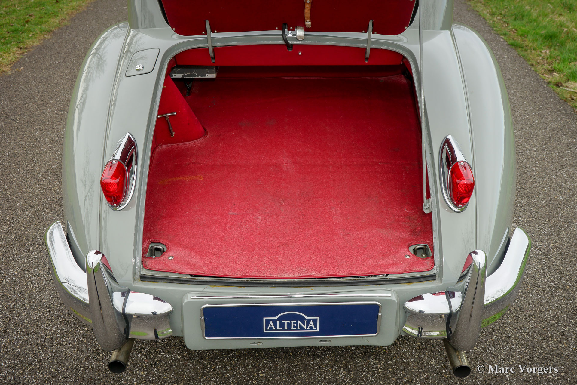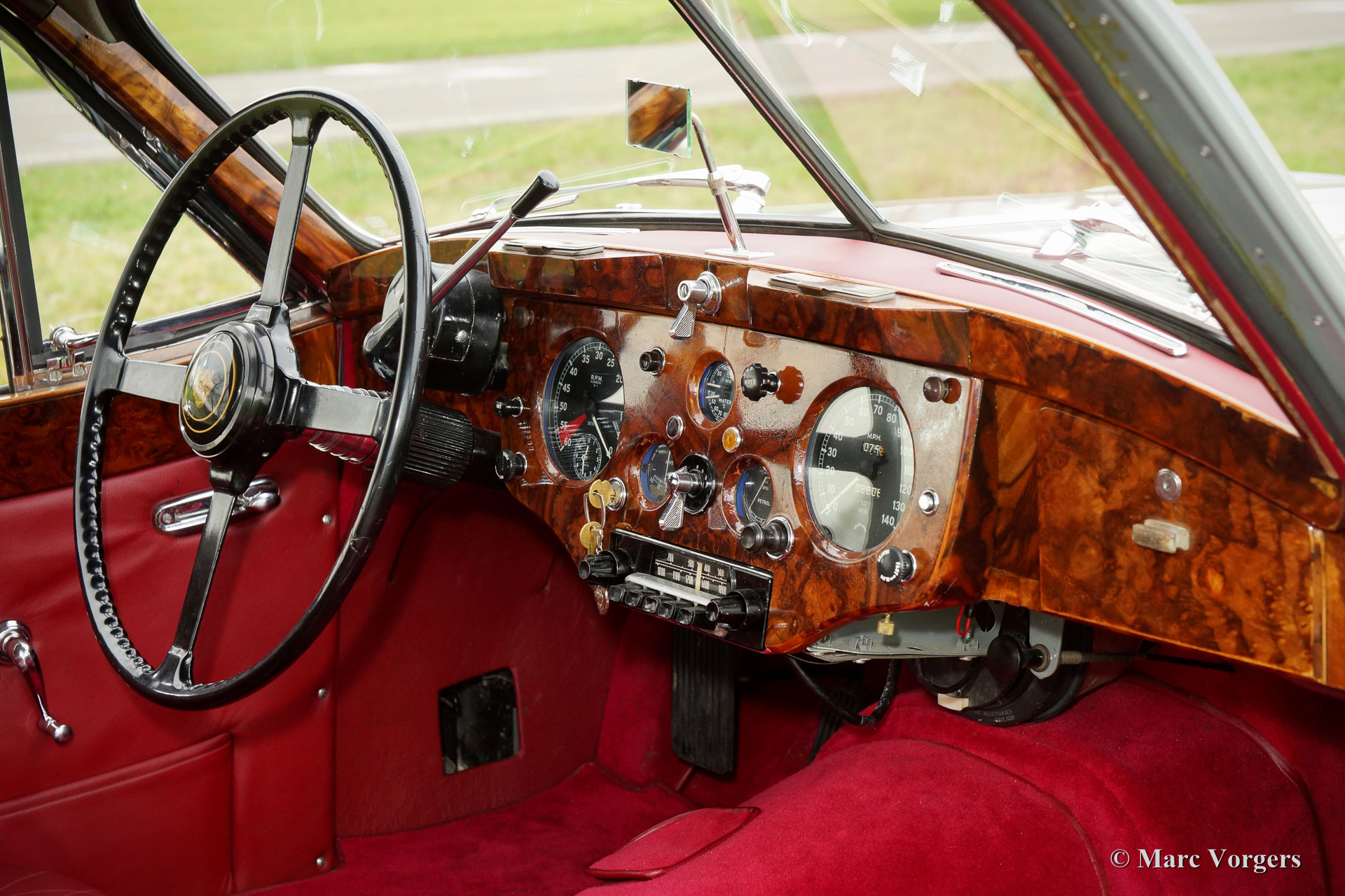 Jaguar XK 140 3.4 Liter SE FHC, Jaar 1956. Kleur Birch Grey met een roodleren interieur en rood tapijt. Deze prachtige Jaguar XK 140 werd nieuw verkocht in Oklahoma, USA. Originele levering met Special Equipment-pakket (SE) en een automatische versnellingsbak. ‘Matching Numbers’ en kleuren! Een Heritage certificaat om dit te bevestigen is aanwezig. De auto werd in 1992 in Nederland geïmporteerd. Het chassis, de carrosserie, het interieur en het onderstel werden in Nederland volledig en perfect 'body-off' gerestaureerd. De carrosserie is met epoxy gecoat en het strakmaken is gedaan met zo weinig mogelijke ‘filler’. Werkelijk elk onderdeel is onderhanden genomen. De zescilinder XK-motor werd naar Engeland gestuurd om te worden gereviseerd door de firma Forward Engineering (Paul Jaye en Ron Beaty). De Jaguar is nog altijd beeldschoon; deze XK 140 FHC verkeert in excellente tot sublieme staat! De auto rijdt voortreffelijk en de automatische Borg-Warner 3-versnellingsbak schakelt soepel en precies. De auto beschikt over een prachtige klassieke radio met chroom frontje, chroom spaakwielen met roestvrijstalen spaken en Lucas-vérstralers aan de voorkant. Dit is een zeer zeldzame (unieke?) Jaguar XK 140 FHC met SE-pakket en een automatische versnellingsbak. Een geweldig exemplaar!