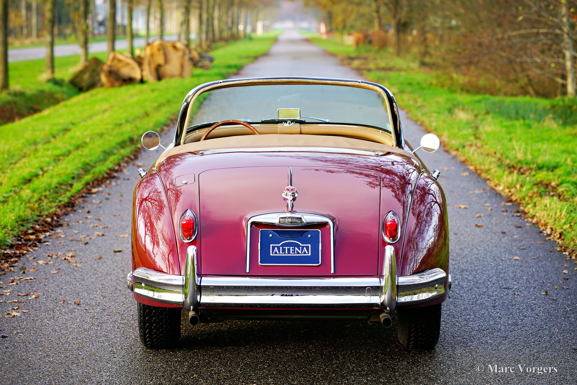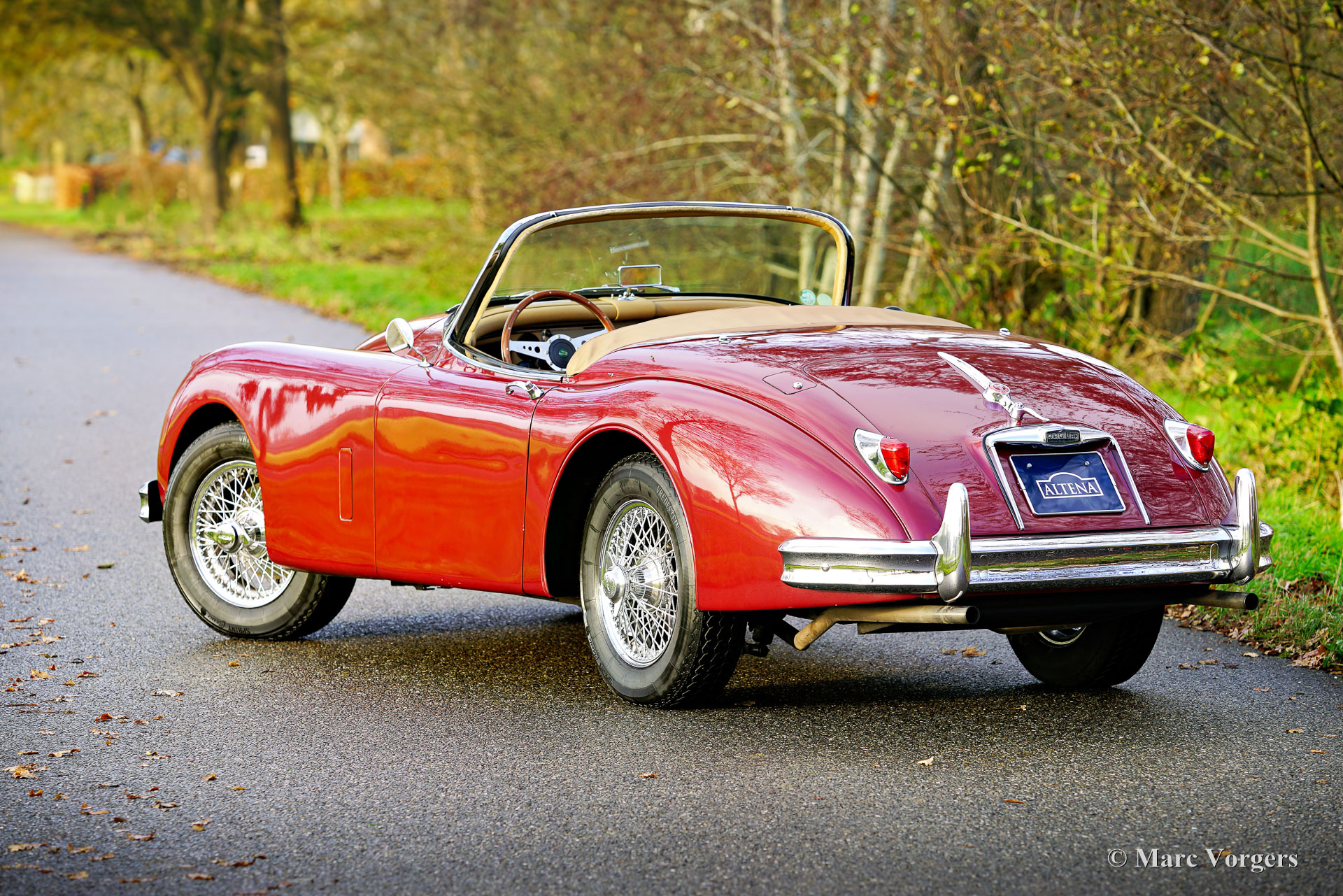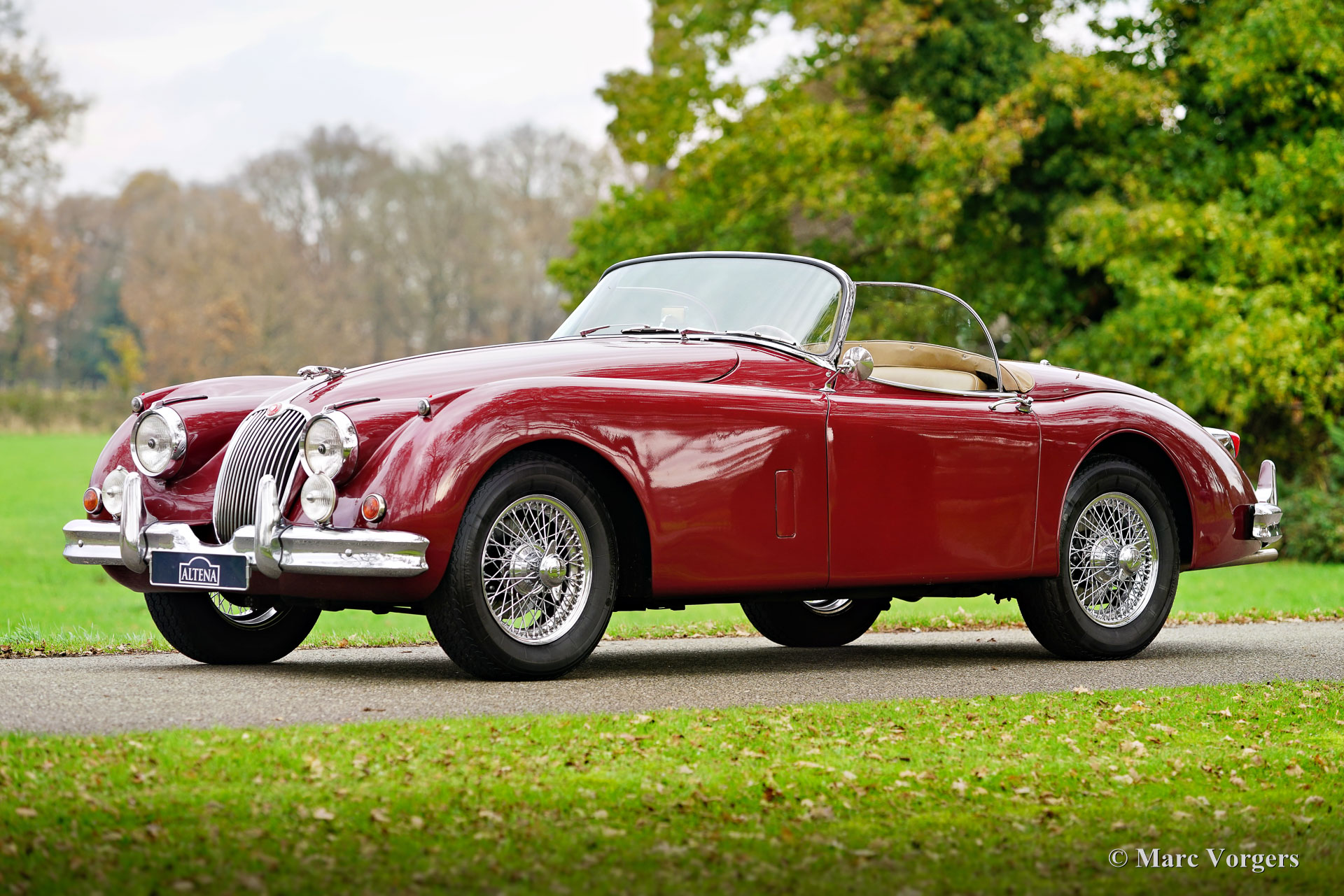 Jaguar XK 150 OTS (Roadster), jaar 1958. Kleur donkerrood (maroon) metallic gecombineerd met een beige lederen interieur en bijpassend wollen tapijt. De auto is voorzien van een zwarte mohair soft-top en een zwarte tonneau cover. Deze glorieuze Jaguar XK 150 OTS (Open Two Seater, in de VS ‘roadster’ genoemd) werd nieuw verkocht in de VS. De auto is in het jaar 2010 naar Nederland verscheept. In Nederland is de auto uitgebreid opgeknapt: de carrosserie is geperfectioneerd en opnieuw gespoten, en ook mechanisch is de auto up-to-date gebracht. De zescilinder XK-motor werd vervangen door een gereviseerd exemplaar, de originele motor is nog steeds aanwezig. Na voltooiing van de werkzaamheden hebben de eigenaren jarenlang volop van de auto genoten en de Alpen en een groot deel van Italië ontdekt. Deze prachtige Jaguar XK 150 roadster verkeert in een goede tot zeer goede staat en de auto rijdt voortreffelijk! De auto schakelt, stuurt en remt zoals het hoort en de motor loopt en klinkt perfect! De auto is voorzien van overdrive, een paar Lucas SFT576 bocht/mistlampen en 16 inch chromen spaakwielen met Vredestein Sprint Classic 185/16 banden. Dit is een prachtige en gewilde Jaguar XK 150 Roadster met een zeer interessante prijs/kwaliteitsverhouding. Een prachtige klassieker om volop van te genieten!
