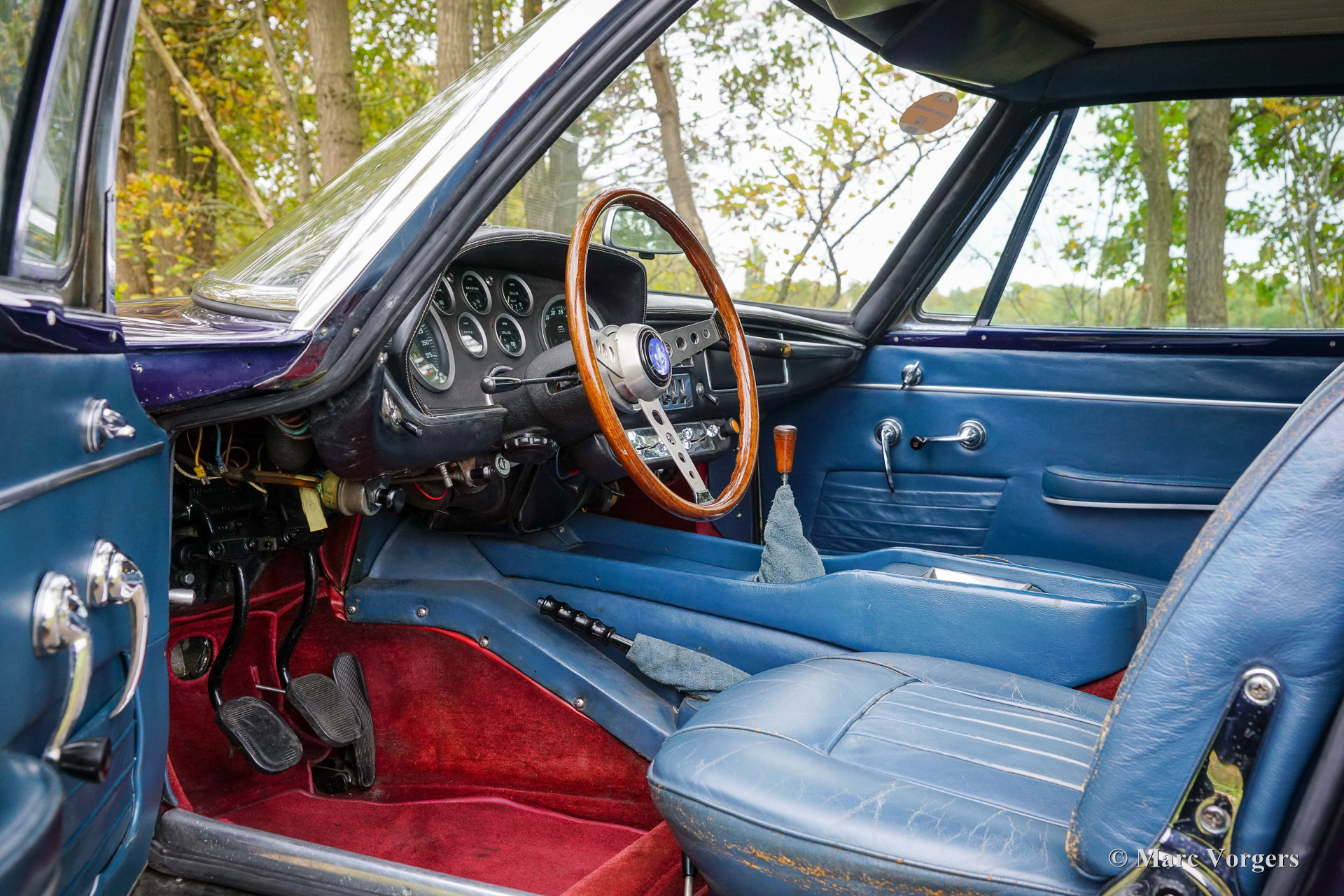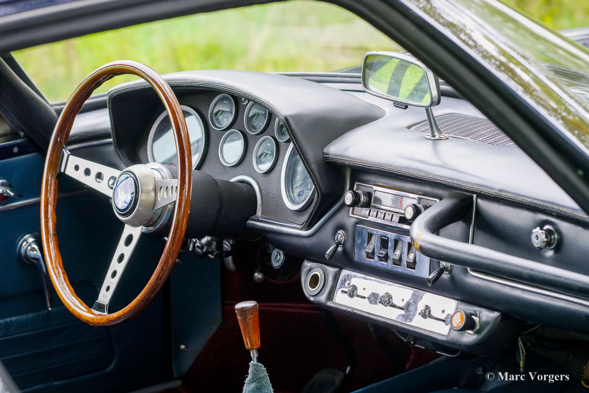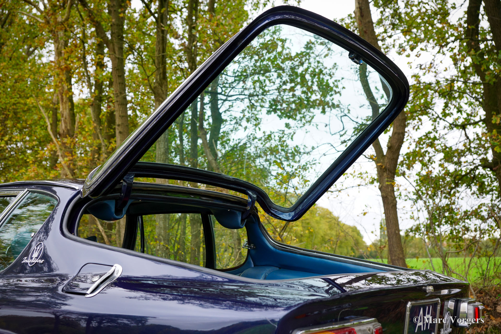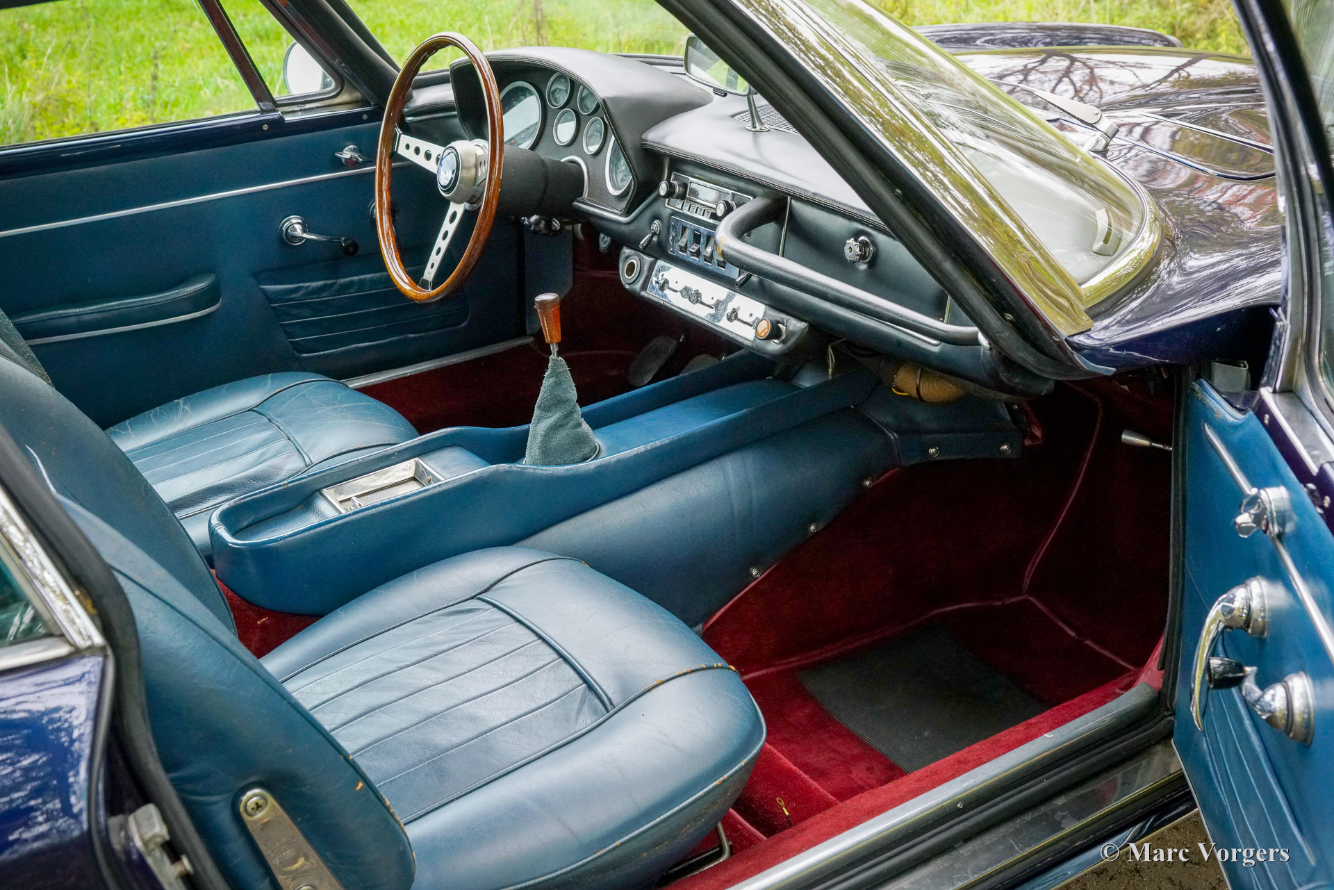 Maserati Mistral Coupé 4 liter injectie, bouwjaar 1966. Chassisnummer AM109/A1/724. Dit is een ‘matching numbers’ auto waarvan met de motor, versnellingsbak en achteras origineel bij het chassis en de carrosserie horen. Carrosseriekleur donkerblauw metallic (Blu Pervinca 106AR357) gecombineerd met een blauw lederen interieur afgewerkt met rood tapijt. Deze schitterende Maserati werd gebouwd op 9 mei 1966 en aansluitend geleverd aan de eerste eigenaar in Verona, Italië. Vanuit Italië vond de auto een nieuw thuis in Duitsland bij de heer Hans Haemer, die de auto vervolgens in 1982 verkocht aan de vader van de huidige eigenaar. De familie bezit en koestert deze bijzondere auto al 43 jaar! De Maserati Mistral Coupé werd geïntroduceerd in 1963 en er werden slechts 844 exemplaren gebouwd, uitgerust met een 3,5-, 3,7- en 4,0-liter zescilinder-lijnmotor met dubbele ontsteking (en twee bougies per cilinder) en Lucas mechanische brandstofinjectie. In 1966 werd de 265 pk sterke topmotor, de 4,0-liter, optioneel leverbaar. Het prachtige GT-ontwerp van Pietro Frua onderscheidde zich door een prachtige combinatie van vloeiende, gebogen en scherpe carrosserielijnen en een grote, glazen achterklep, die de auto een sportieve en tegelijk praktische uitstraling gaf. Deze topversie van de Mistral Coupé 4 liter verliet de fabriek in de kleur zilver metallic (Argento Auteuil) met het nog altijd originele en fraaie interieur. Bij aankoop in 1982 had de auto een lichtblauwe carrosseriekleur, die vervolgens werd gewijzigd in donkerblauw (Blu Pervinca). In de jaren 90 werd de auto uitgebreid gerestaureerd en gereviseerd. Daarbij werd de auto wederom gespoten in de huidige lak in Blu Pervinca, die aan de achterzijden en aan de achterkant wat haarscheuren begint te vertonen. In 2022 werd de cilinderkop opnieuw gereviseerd. Er werden nieuwe kleppen en veren gemonteerd en de brandstofinjectoren werden vernieuwd. Ook werden er nieuwe (verstelbare) schokdempers gemonteerd. Deze ‘top-of-the-line’ Maserati Mistral is een rijdersauto in een goede tot zeer goede conditie en de auto rijdt, stuurt en klinkt geweldig! De auto is voorzien van zilver gespoten Borrani spaakwielen en een Borrani reservewiel in de kofferbak. Met ‘matching numbers’ en een nog steeds prachtig, volledig origineel interieur is deze Maserati Mistral een fantastische tijdscapsule. Een belangrijk stuk Italiaans sportwagenerfgoed, afkomstig uit langdurig bezit van één familie, om gewaardeerd en genoten te worden door de juiste nieuwe eigenaar met benzine in zijn of haar aderen!