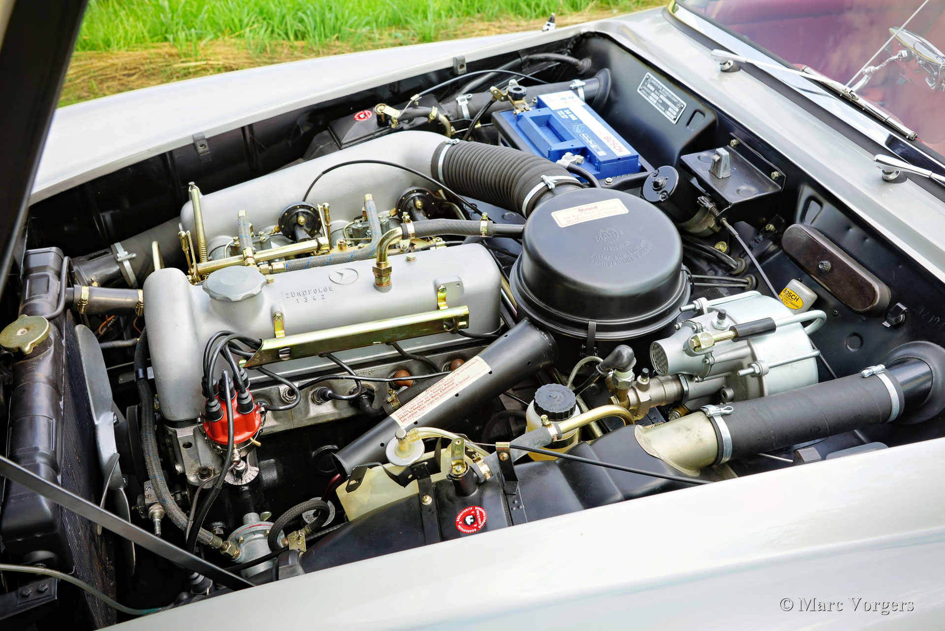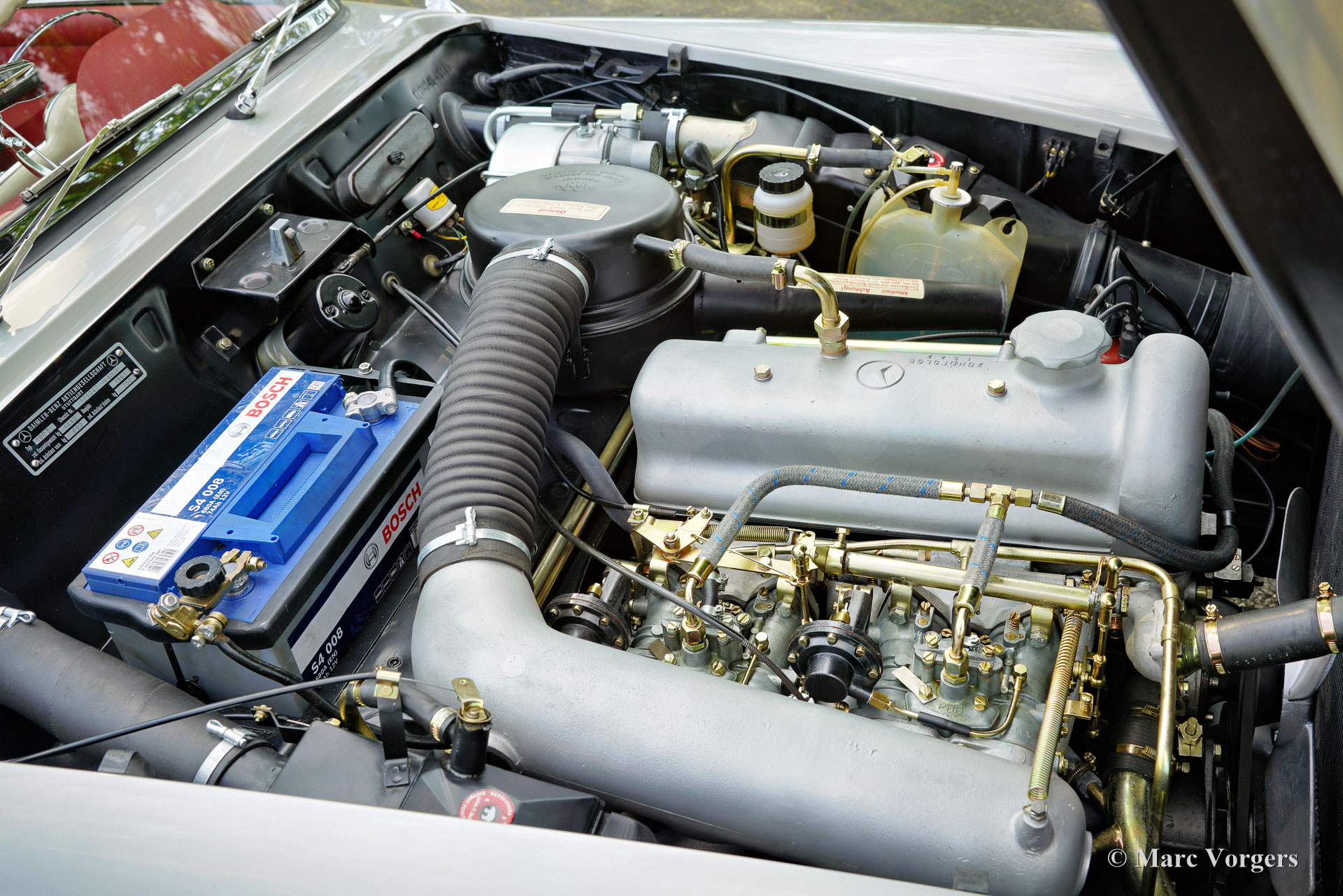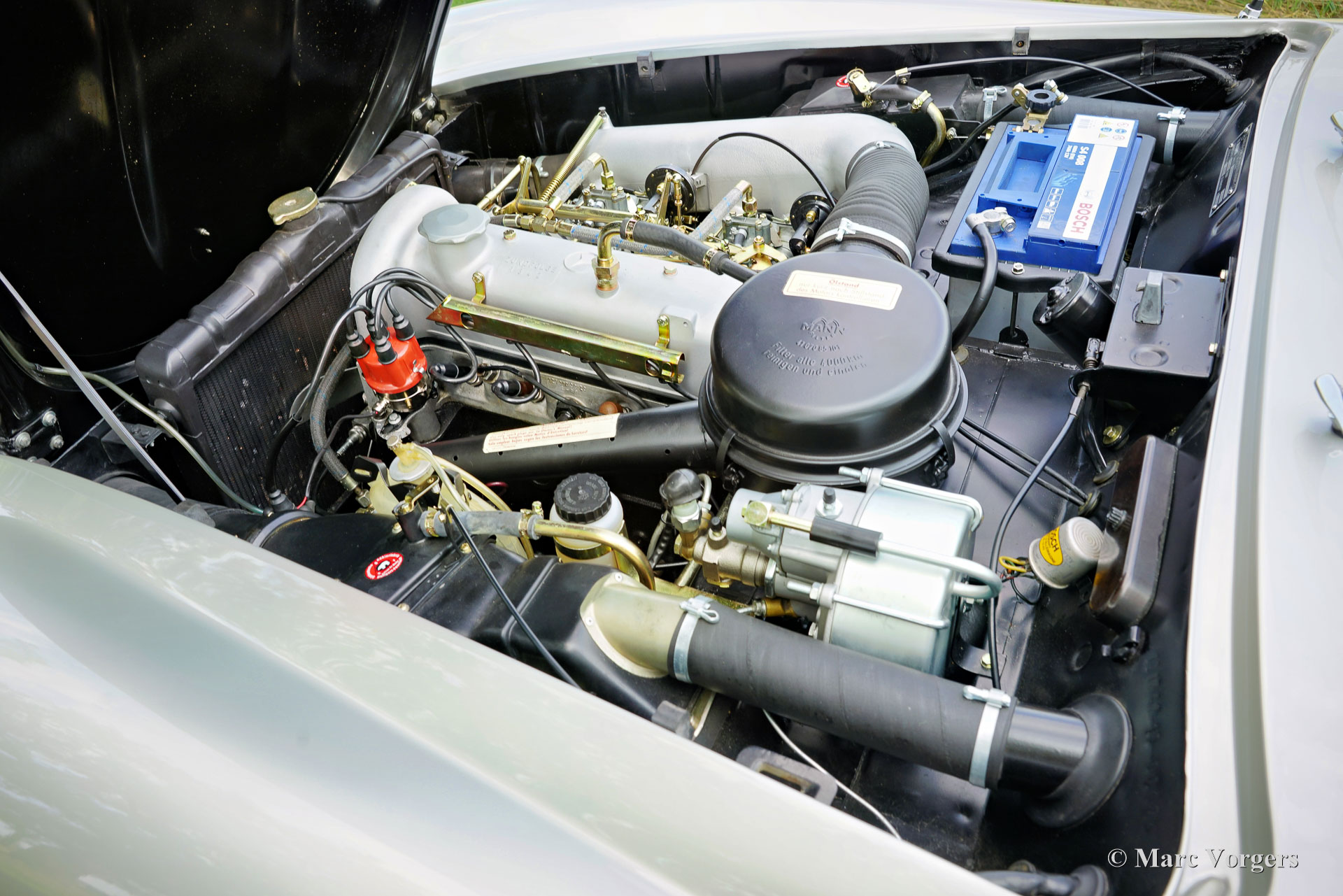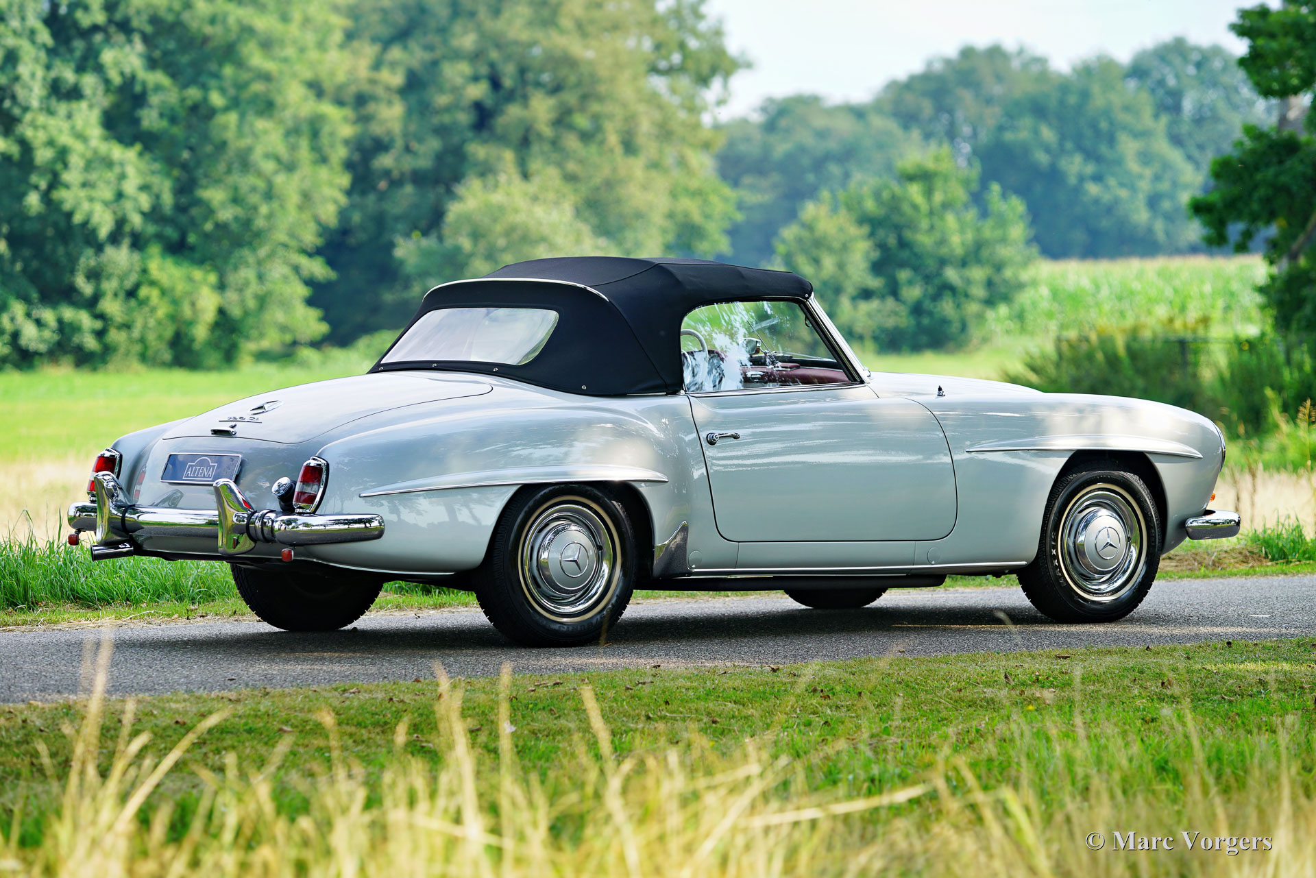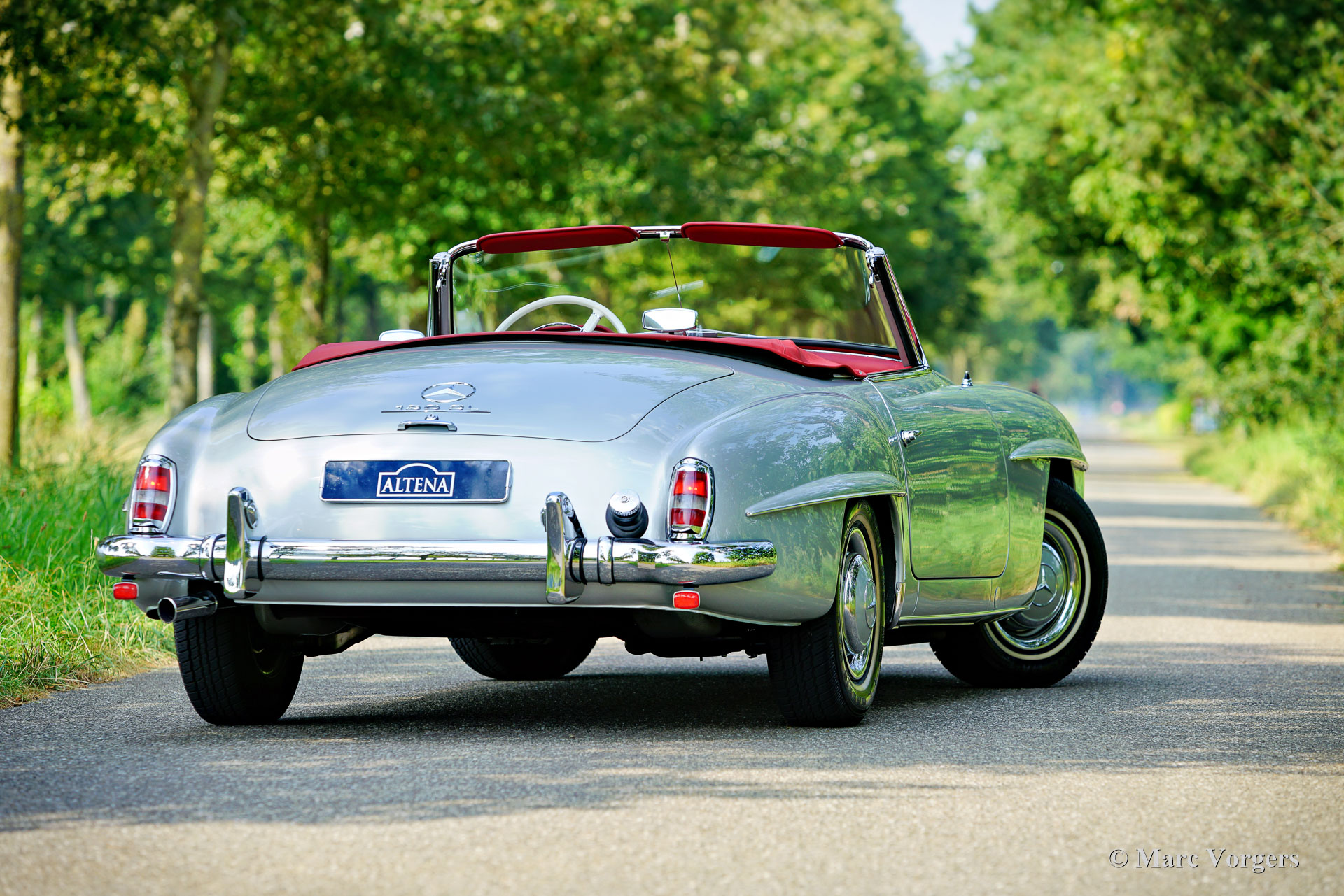 Mercedes-Benz 190 SL, jaar 1961. Kleur zilver metallic gecombineerd met een roodlederen interieur en een zwarte mohair kap. Deze prachtige Mercedes 190 SL is nieuw verkocht in Mechelen, België. De auto is in het verleden uitgebreid gerestaureerd en tot in de puntjes gereviseerd. Ook de originele Solex carburateurs zijn gereviseerd. Een fotoreportage van de restauratie is aanwezig. Het lakwerk is fris en strak als glas, de chroomdelen zijn perfect, het interieur toont alle originele details en is in onberispelijke staat. Onder de motorkap ziet alles eruit als nieuw! Deze Mercedes 190 SL verkeert in een uitstekende topstaat en de auto rijdt perfect. De auto wordt geleverd met de originele hard-top die nog in ongerestaureerde staat is. De hard-top is het originele model uit 1961 met de grote achterruit. De auto is voorzien van 185/80 13 inch banden met witte zijkanten en een Becker Europa radio. Deze Mercedes 190 SL is goed gedocumenteerd en de originele oude Belgische registratiepapieren zijn nog bij de auto.