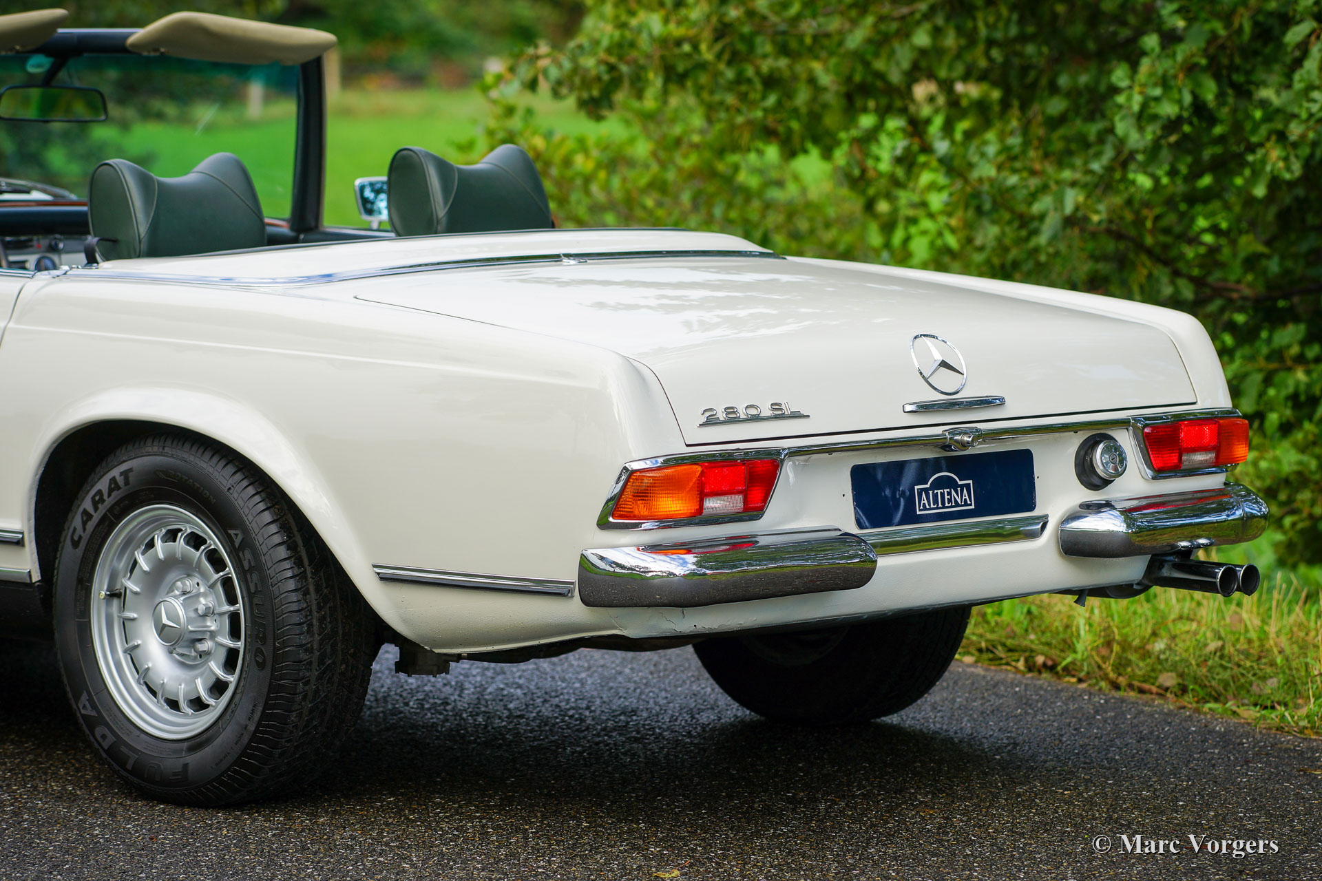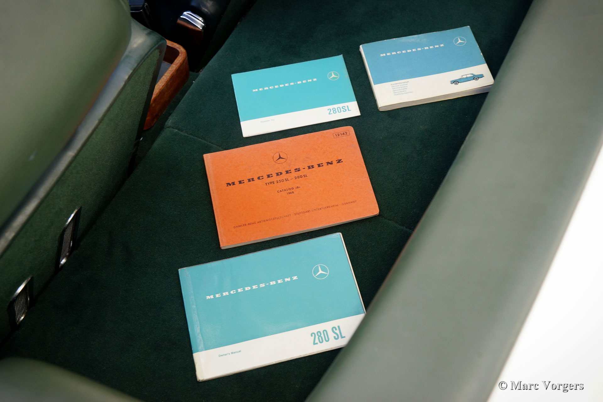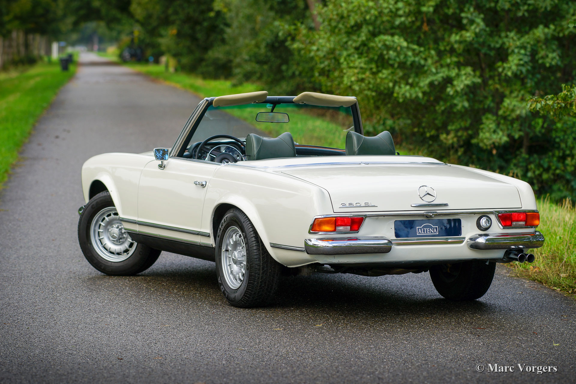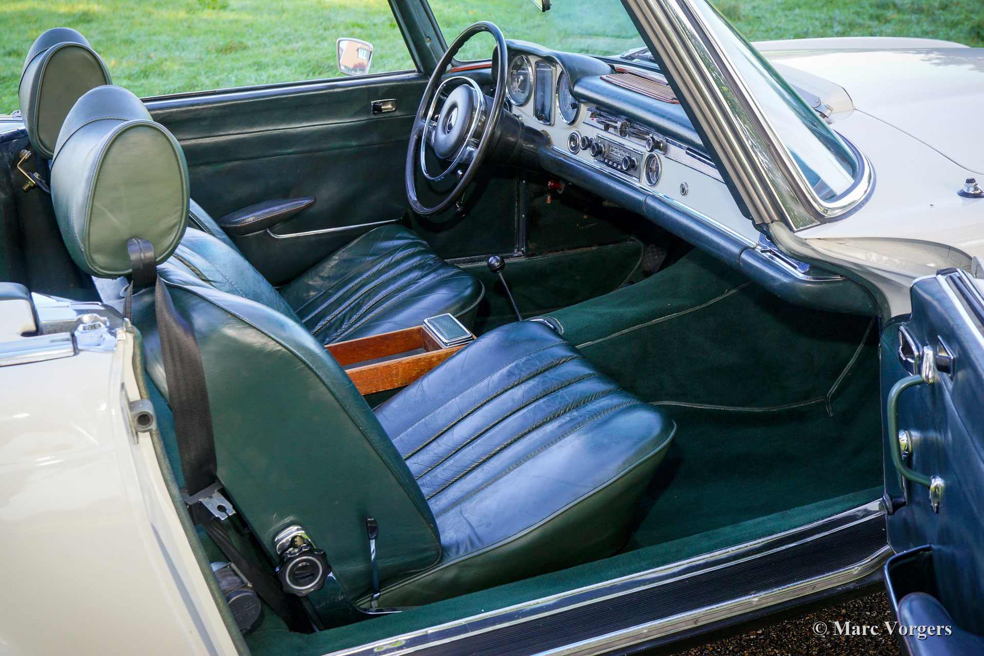 Mercedes-Benz 280 SL ‘Pagode’, jaar 1968. Kleur Ivoorwit gecombineerd met een donkergroen lederen interieur en bijpassend tapijt. Donkergroene mohair kap en hard-top in carrosseriekleur. Deze prachtige Mercedes-Benz 280 SL werd nieuw verkocht in Sussex in het Verenigd Koninkrijk. Dit met besturing aan de linkerkant en een kilometerteller met Km/ h-weergave. Mogelijk was de eerste eigenaar een frequente bezoeker van het Europese vasteland. Deze fraaie 280 SL verkeert in een zeer goede en zeer originele conditie, de auto werd in het verleden enkel voorzien van perfect nieuw lakwerk in de originele kleur. De originele puntlassen zijn nog goed zichtbaar. Het interieur is volledig origineel en intact met lichte sporen van gebruik en leeftijd. De soft-top verkeert is in nieuwstaat, de motorruimte is brandschoon en de chromen delen zijn schitterend! Deze Mercedes-Benz 280 SL is in de loop der jaren zeer goed onderhouden en verzorgd, de zescilindermotor loopt krachtig en soepel en de automatische versnellingsbak schakelt uitstekend. De auto is compleet met de originele boekjes inclusief het onderhoudsboekje. Deze 280 SL van de laatste generatie is voorzien van de prachtige MB ‘kroonkurk’ lichtmetalen velgen, de originele Blaupunkt Frankfurt autoradio en getint glas. Dit is een super originele ‘Europese’ Mercedes-Benz 280 SL in een zeer goede en prachtige conditie!