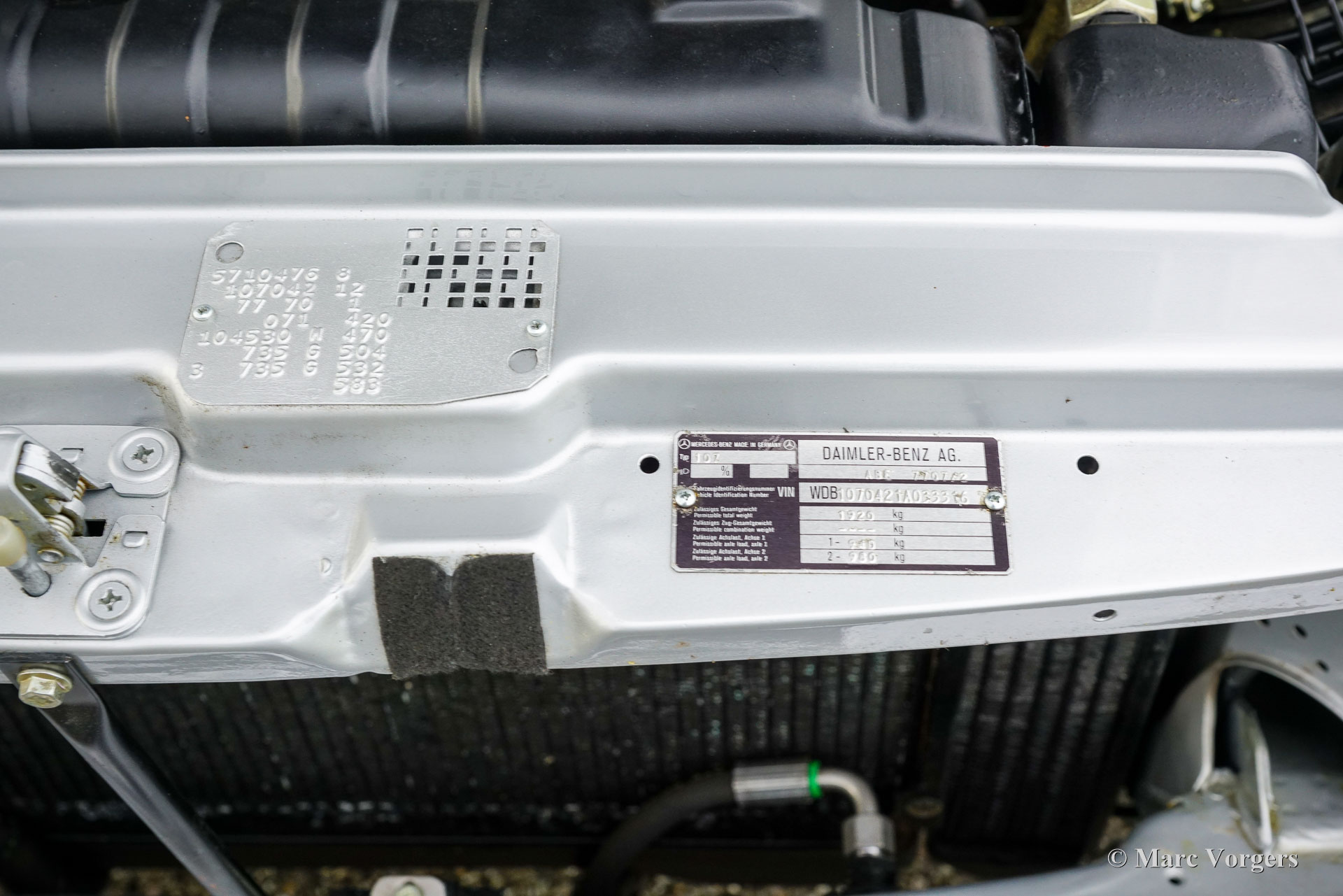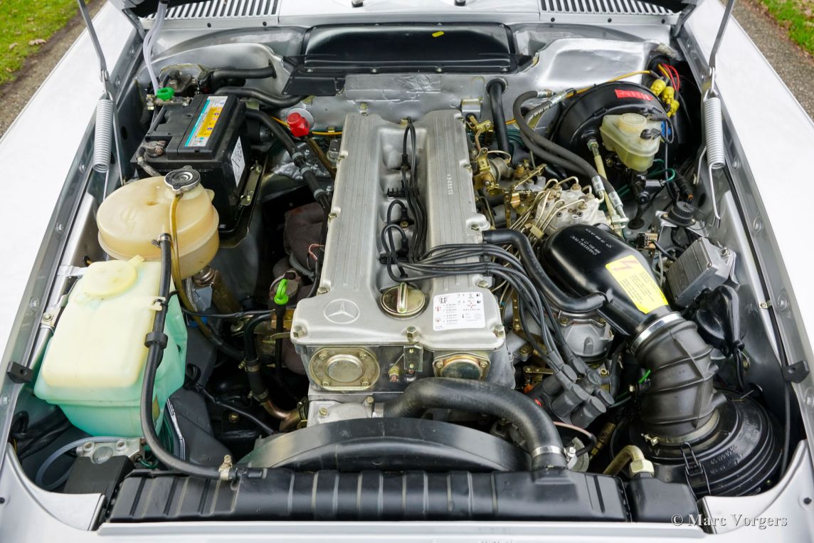 Mercedes-Benz 280SL (R107), bouwjaar 1985. Chassisnummer (VIN) WBD1070421A033316, motornummer 11099012009854. Uitgevoerd in zilvergrijs metallic met een zwart interieur en stoelen met zwart/bruin geruite bekleding, ziet deze 280 SL er precies zo uit als toen hij 40 jaar geleden de fabriek verliet! Deze prachtige Mercedes-Benz 280 SL werd in 1997 vanuit Duitsland naar Nederland geïmporteerd. In de jaren 2020-2023 werd de auto perfect gerestaureerd volgens de originele specificaties. De mechanische revisies en onderhoudswerkzaamheden zijn uitgevoerd door Stern Manufactur in Duitsland. Alles werd gecontroleerd en waar nodig gereviseerd/vernieuwd. De carrosserie en lak zijn door Eric Westerhof Carrosserie in Nederland in nieuwstaat gebracht. Deze schitterende Mercedes-Benz 280 SL uit de legendarische R107-modelserie verkeert in een sublieme topconditie, als nieuw! De motorruimte, de kofferbak en de onderkant zien er allemaal als nieuw uit! De soft-top is ook vernieuwd en verkeert in perfecte staat. De originele hard-top wordt ook meegeleverd. De hard-top (gespoten in carrosseriekleur) is niet gerestaureerd en verkeert in originele staat met lichte gebruikssporen. Dit is een gewilde originele Europese R107 SL, voorzien van een automatische vierversnellingsbak en de originele lichtmetalen velgen met 205/65 R15 Michelin Energy-banden (inclusief reservewiel). De Mercedes-Benz R107 werd 18 jaar lang geproduceerd, van 1971 tot 1989, waarmee het na de G-Klasse de langstlopende modelserie in de geschiedenis van Mercedes-Benz is. Toen de R107 SL nieuw was, had de auto geen serieuze concurrenten in zijn klasse en qua kwaliteit; het was de beste tweezits cabriolet die je voor geld kon kopen. Dit topexemplaar zal door meerdere opeenvolgende eigenaren/verzamelaars weer tientallen jaren gekoesterd worden. U kunt de volgende eigenaar zijn die volop van deze fantastische 280 SL geniet!