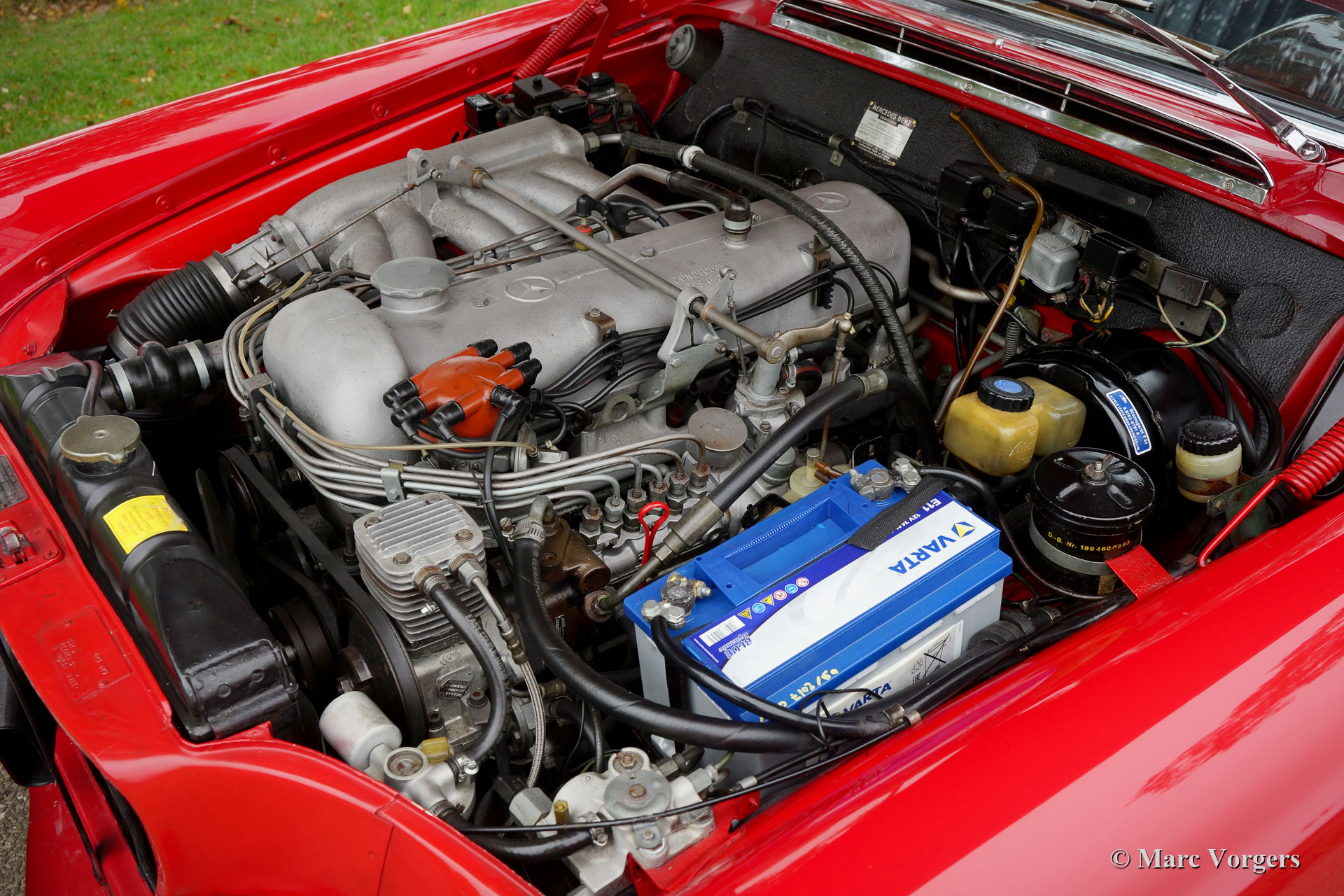 Mercedes-Benz W112 300 SE cabriolet, jaar 1966. Kleur Mercedes-Benz rood gecombineerd met een zwartlederen interieur en zwart tapijt. Zwarte mohair kap en kapafdekking. Deze prachtige Mercedes-Benz 300SE cabriolet werd nieuw verkocht aan een Amerikaanse soldaat die in Europa gestationeerd was. In 1967 liet de eigenaar de Mercedes naar de Verenigde Staten verschepen. In 2016 werd de auto verkocht naar Nederland, waar deze onderdeel werd van een oldtimercollectie. De W112 300 SE cabriolet is een van de klassieke topmodellen van Mercedes-Benz. Een zeer luxe en comfortabele auto met zelf nivellerende luchtvering op de achterwielen, een krachtige en stille zescilindermotor, elektrisch bedienbare zijruiten en natuurlijk is de auto prachtig gebouwd. Deze Mercedes 300 SE cabriolet verkeert in zeer goede tot uitstekende conditie en de auto rijdt perfect. De carrosserie vertoont een strakke pasvorm van de plaatdelen, prachtig lakwerk en perfect chroom. Het interieur en de kap bevinden zich in uitstekende staat. De motorruimte is prachtig gedetailleerd. De auto is uitgerust met banden met witte zijvlakken en een periode correcte Becker Europa AM / FM-radio. Dit is een zeer begeerlijk exemplaar in bijzonder mooie conditie!