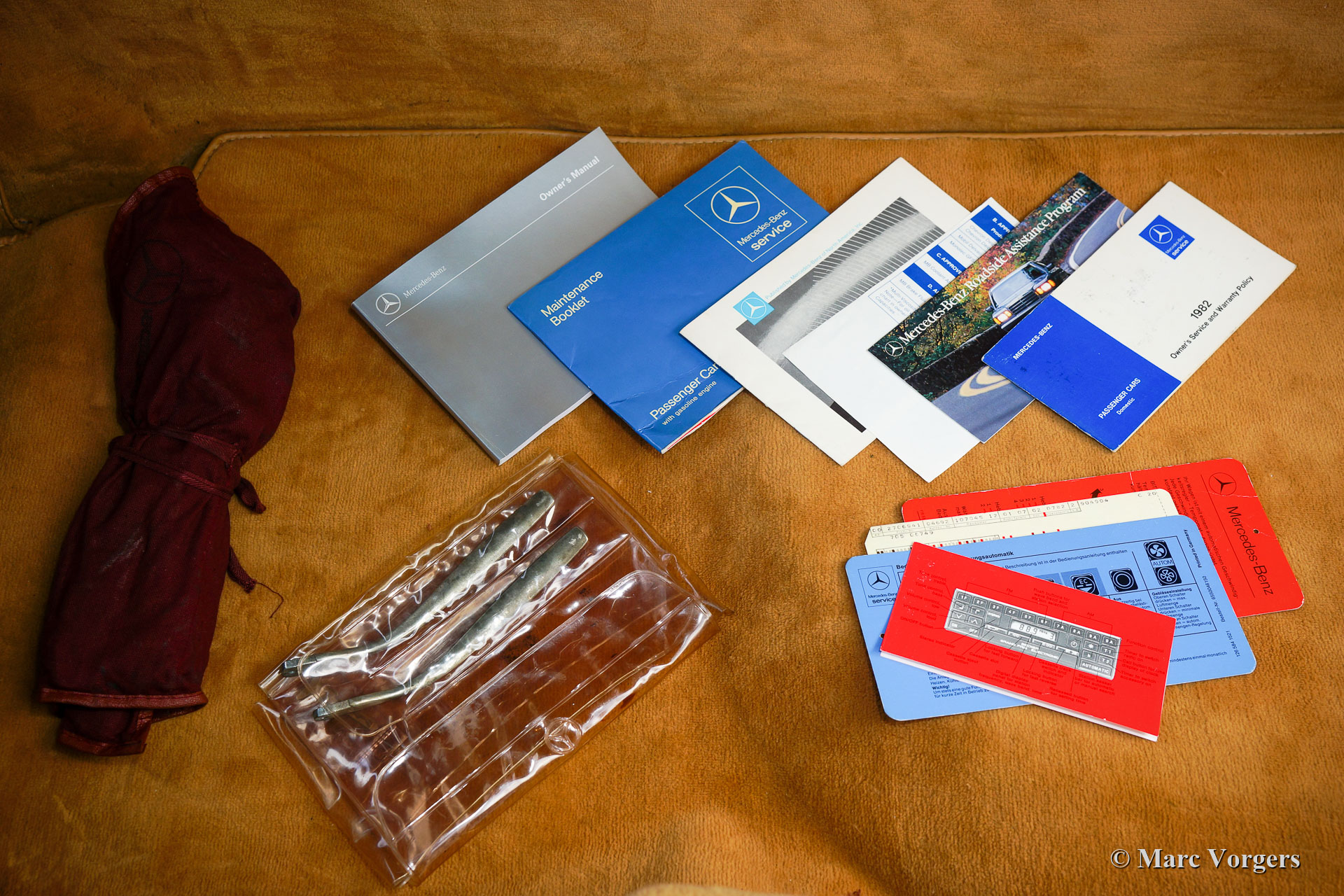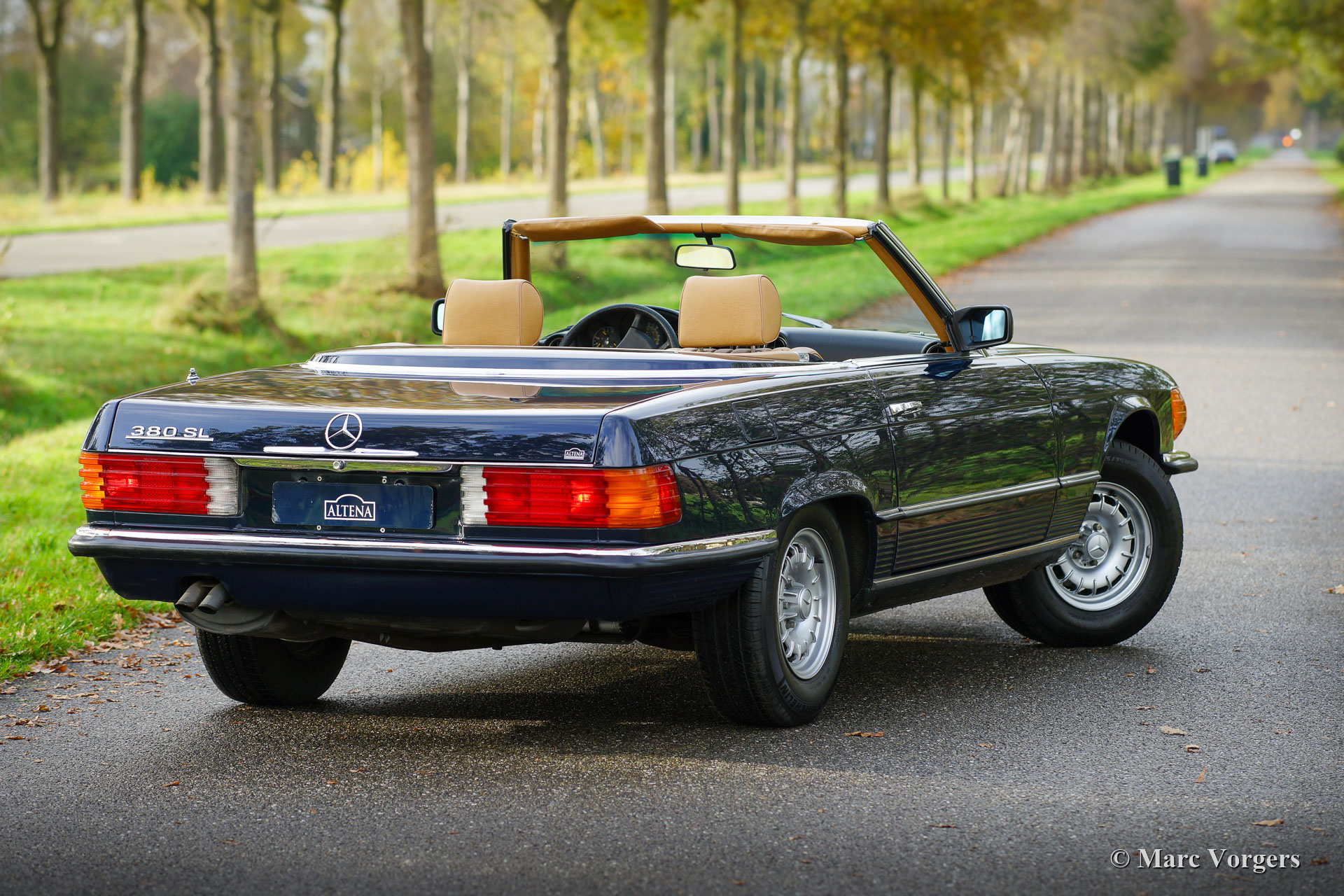 Mercedes-Benz 380 SL, type R107, jaar 1982. Kleur ‘Midnight Blue’ gecombineerd met een ‘Palamino’ lichtbruin ‘Tex’ interieur. Donkerblauwe kap en hardtop in carrosseriekleur. Fabriek originele nummers en kleuren (Matching numbers & colours). Deze prachtige Mercedes 380 SL werd nieuw verkocht in de USA, wij hebben de auto onlangs gekocht van de laatste eigenaar (in Arizona). Vanaf nieuw heeft deze fantastische SL van het type R107 89.000 mijl gereden. De geschiedenis is volledig bekend en gedocumenteerd! Alle servicefacturen zijn aanwezig, evenals de US CARFAX; alle onderhoudsintervallen werden genoteerd. Deze schitterende Mercedes 380 SL verkeert in sublieme topstaat en de V8 motor klinkt geweldig! Het lakwerk is uitstekend, het interieur is nagenoeg als nieuw, onder de motorkap ziet alles er perfect uit en de originele soft-top toont als nieuw uit! Het reservewiel is nooit gebruikt. Alle originele fabrieksstickers zijn nog aanwezig. De auto wordt geleverd met de originele boekjes, krik en gereedschap. Deze prachtige 380 SL is voorzien van een originele Becker Grand Prix Electronic radio en originele lichtmetalen MB ‘kroonkurk’-wielen. De auto is nu voorzien van de prachtige slanke Europese bumpers. Dit is een top-exemplaar!