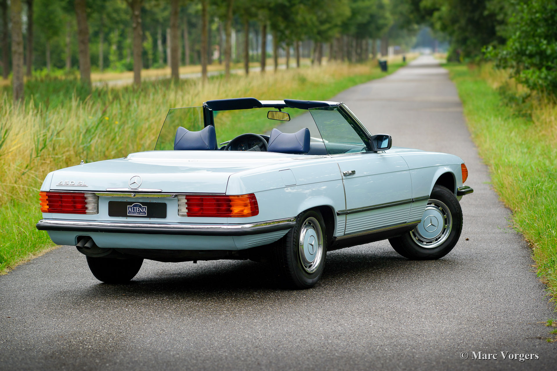 Mercedes-Benz 450 SL (R107-serie), jaar 1979. ‘Matching numbers’ en originele kleurstelling, de auto is precies zoals deze de fabriek verliet. Kleur pastel blauw gecombineerd met een donkerblauw interieur. Donkerblauwe soft-top en hard-top! Deze fantastische Mercedes 450 SL werd nieuw verkocht in Californië. De auto is onlangs gekocht van de dochter van de eerste eigenaar en vervolgens naar Nederland verscheept. Vanaf nieuw heeft deze prachtige 450 SL slechts 77.000 mijl gereden. De Mercedes werd door de jaren heen perfect onderhouden en deze schoonheid verkeert nog altijd in sublieme originele topstaat (concours)!