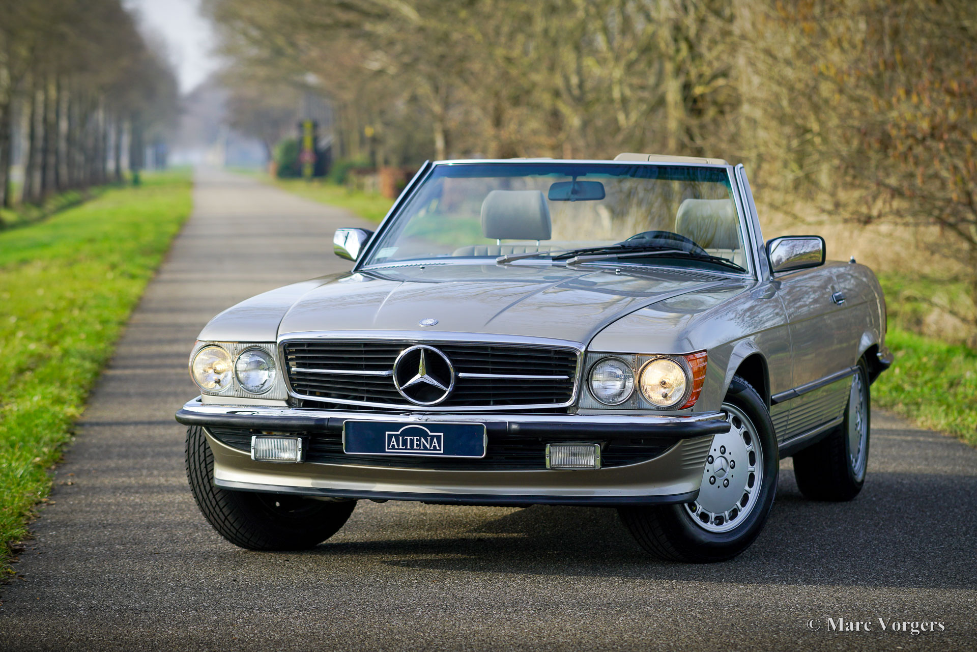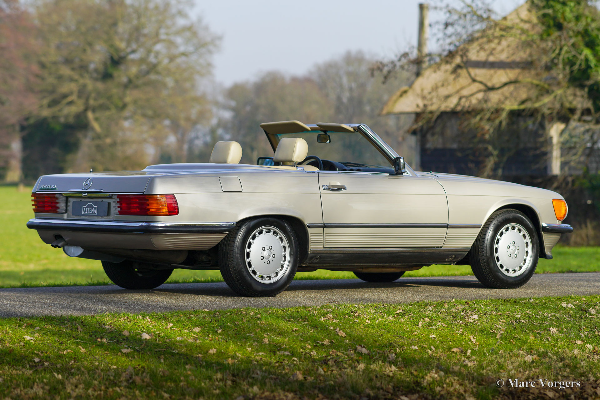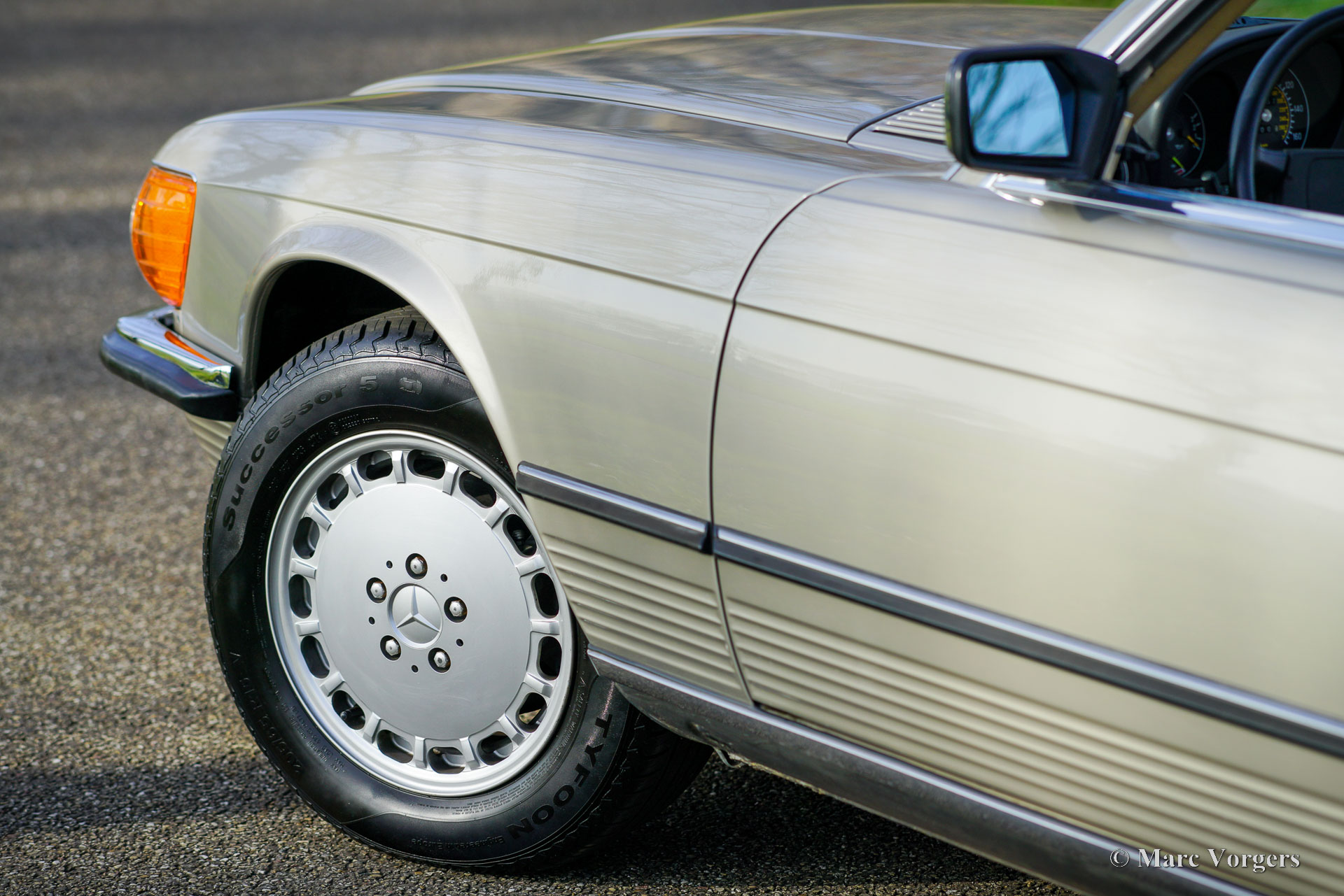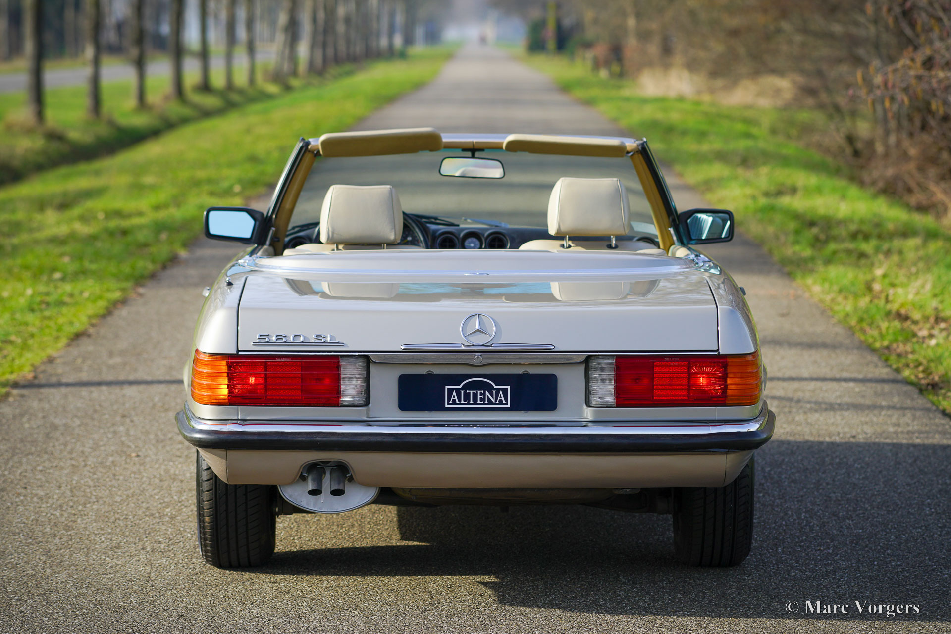 Mercedes-Benz 560 SL, jaar 1987. Kleur Rookzilver (Rauchsilber) metallic gecombineerd met een lichtbeige leren interieur en bijpassend tapijt. Donkerbruine soft top en een originele hard top in carrosseriekleur. Deze fantastische Mercedes 560 SL uit de R107 modelserie werd nieuw verkocht in North Carolina, USA. De auto heeft slechts twee Amerikaanse eigenaren gekend. Onlangs is de auto in Nederland geïmporteerd met slechts 89.000 mijl op de teller. Na aankomst in Nederland werden de US-bumpers ingeruild voor slanke chromen Europese bumpers. Op verzoek en tegen meerprijs kunnen de Amerikaanse koplampen worden omgewisseld voor Europese versies. Deze fantastische V8 aangedreven Mercedes-Benz verkeert zowel van binnen als van buiten in een uitstekende originele staat, de originele fabrieksstickers zijn nog aanwezig. De auto vertoont slechts de minste sporen van eerder gebruik. De auto is enkele jaren geleden perfect opnieuw gespoten in de originele kleur, dit alleen omdat de 35 jaar oude lak lichte sporen van gebruik vertoonde. Het originele interieur is in onberispelijke staat en de motorruimte is fris en schoon. De donkerbruin kleurige soft top is recentelijk vernieuwd en verkeert in nieuwstaat. De auto is voorzien van begeerlijke opties zoals airconditioning, cruise control, originele lichtmetalen velgen en een Becker stereo radio. De auto staat op goede 205/65 15 inch banden en de originele gereedschap set is aanwezig. Dit is geweldig rijdende en comfortabele Mercedes-Benz 560 SL in fantastische kleuren en in excellente conditie!