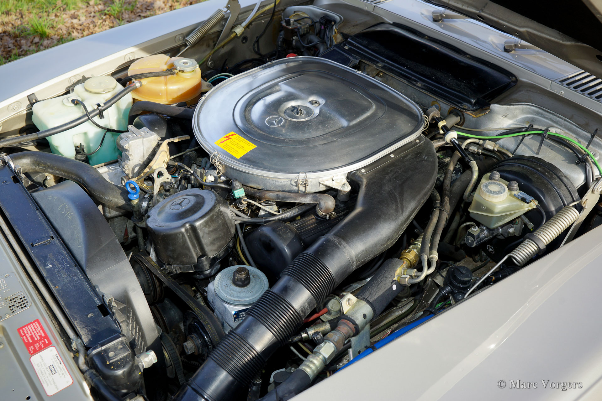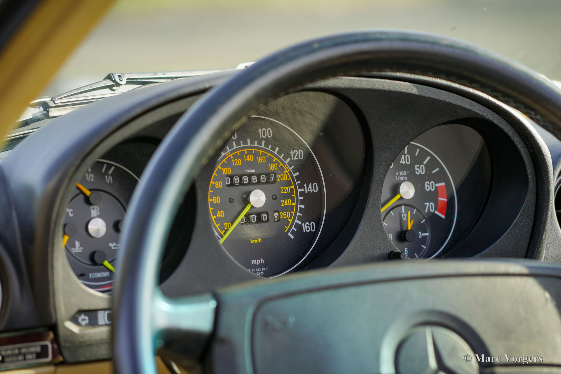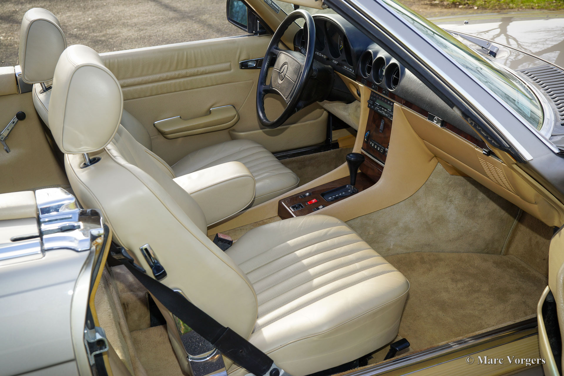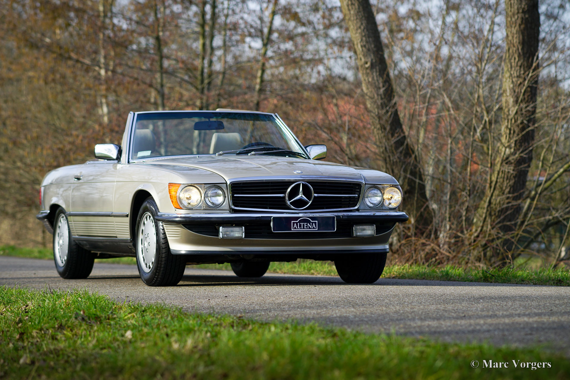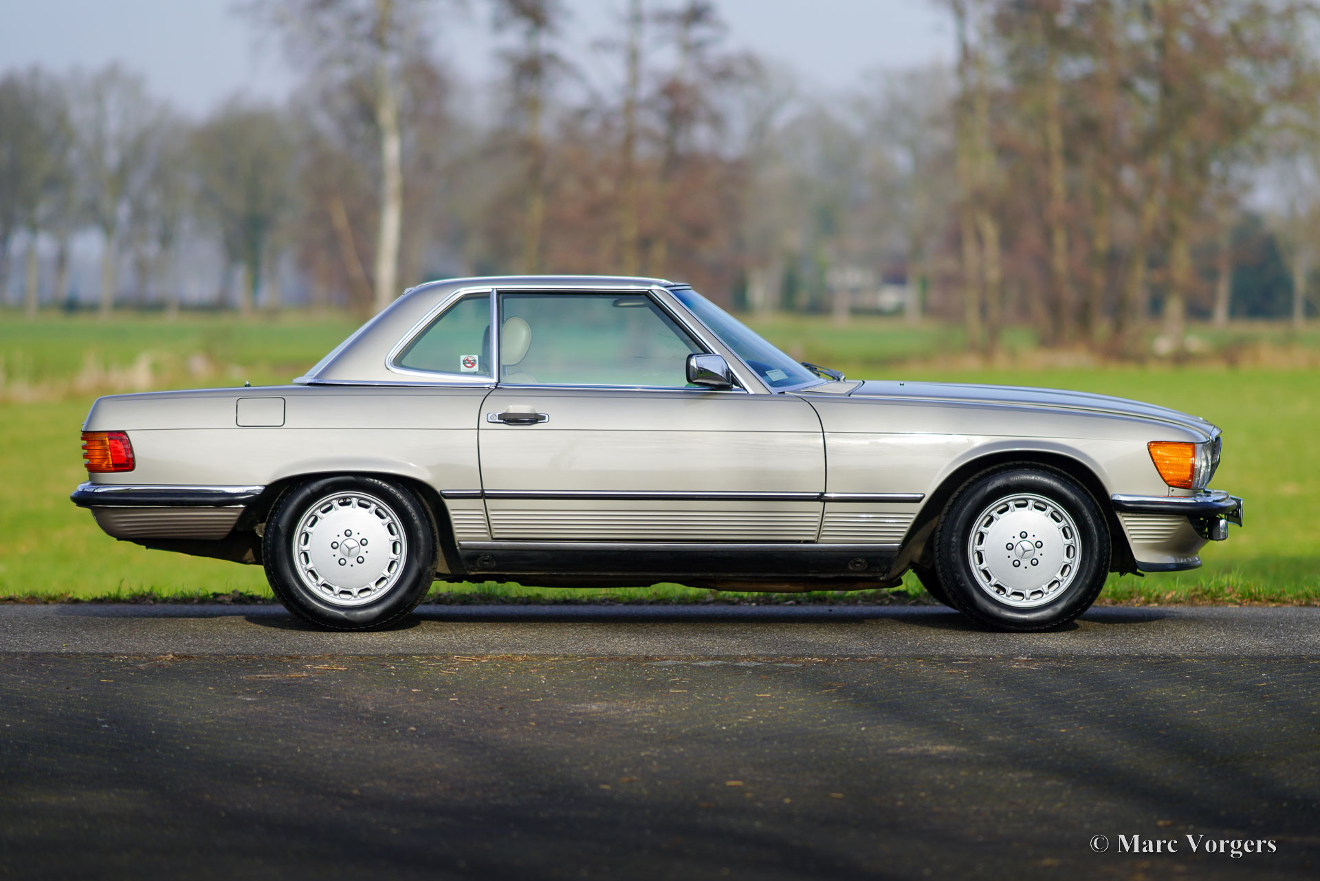 Mercedes-Benz 560 SL, jaar 1987. Kleur Rookzilver (Rauchsilber) metallic gecombineerd met een lichtbeige leren interieur en bijpassend tapijt. Donkerbruine soft top en een originele hard top in carrosseriekleur. Deze fantastische Mercedes 560 SL uit de R107 modelserie werd nieuw verkocht in North Carolina, USA. De auto heeft slechts twee Amerikaanse eigenaren gekend. Onlangs is de auto in Nederland geïmporteerd met slechts 89.000 mijl op de teller. Na aankomst in Nederland werden de US-bumpers ingeruild voor slanke chromen Europese bumpers. Op verzoek en tegen meerprijs kunnen de Amerikaanse koplampen worden omgewisseld voor Europese versies. Deze fantastische V8 aangedreven Mercedes-Benz verkeert zowel van binnen als van buiten in een uitstekende originele staat, de originele fabrieksstickers zijn nog aanwezig. De auto vertoont slechts de minste sporen van eerder gebruik. De auto is enkele jaren geleden perfect opnieuw gespoten in de originele kleur, dit alleen omdat de 35 jaar oude lak lichte sporen van gebruik vertoonde. Het originele interieur is in onberispelijke staat en de motorruimte is fris en schoon. De donkerbruin kleurige soft top is recentelijk vernieuwd en verkeert in nieuwstaat. De auto is voorzien van begeerlijke opties zoals airconditioning, cruise control, originele lichtmetalen velgen en een Becker stereo radio. De auto staat op goede 205/65 15 inch banden en de originele gereedschap set is aanwezig. Dit is geweldig rijdende en comfortabele Mercedes-Benz 560 SL in fantastische kleuren en in excellente conditie!