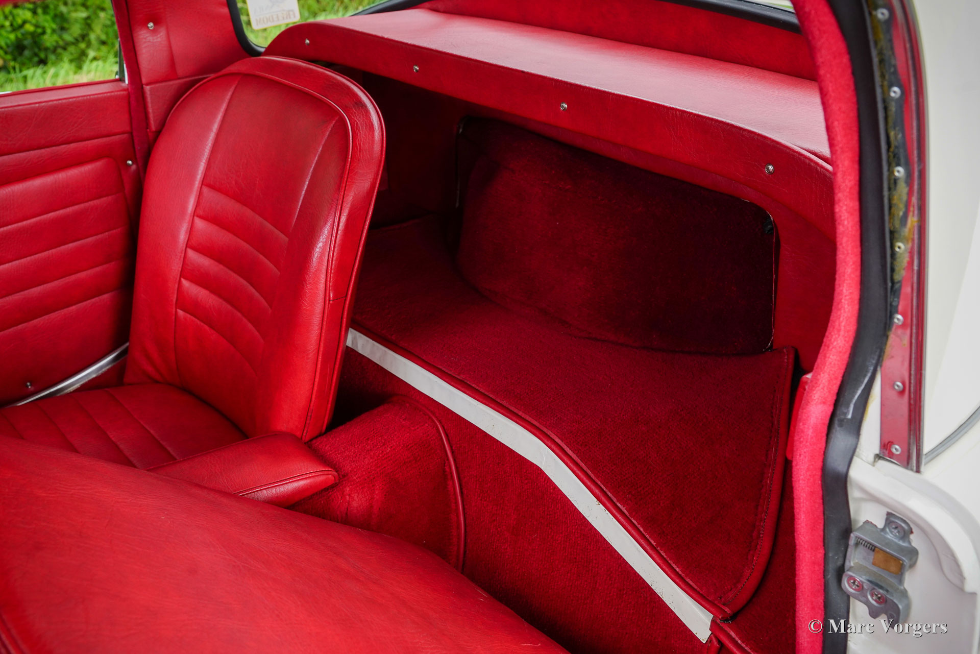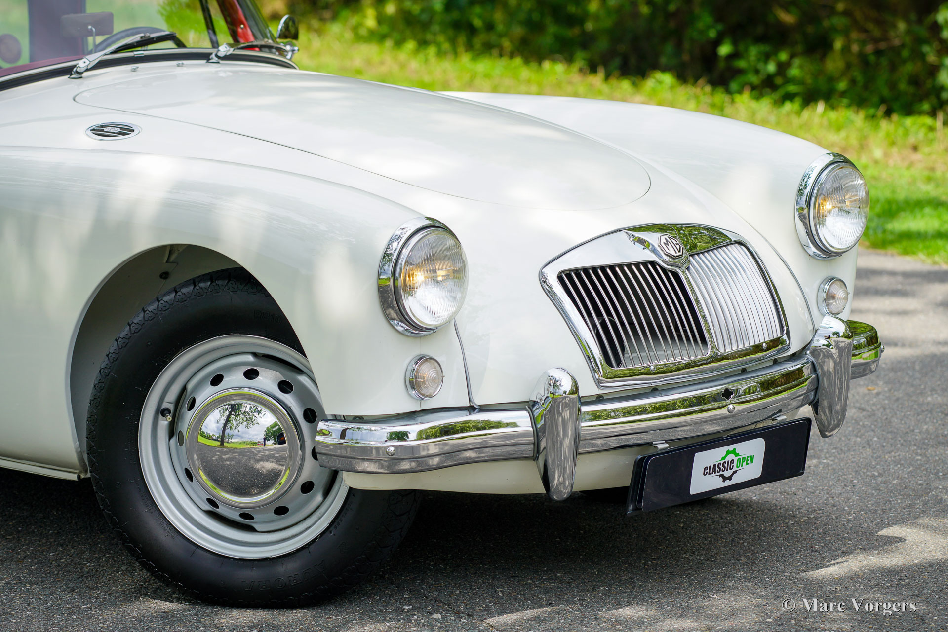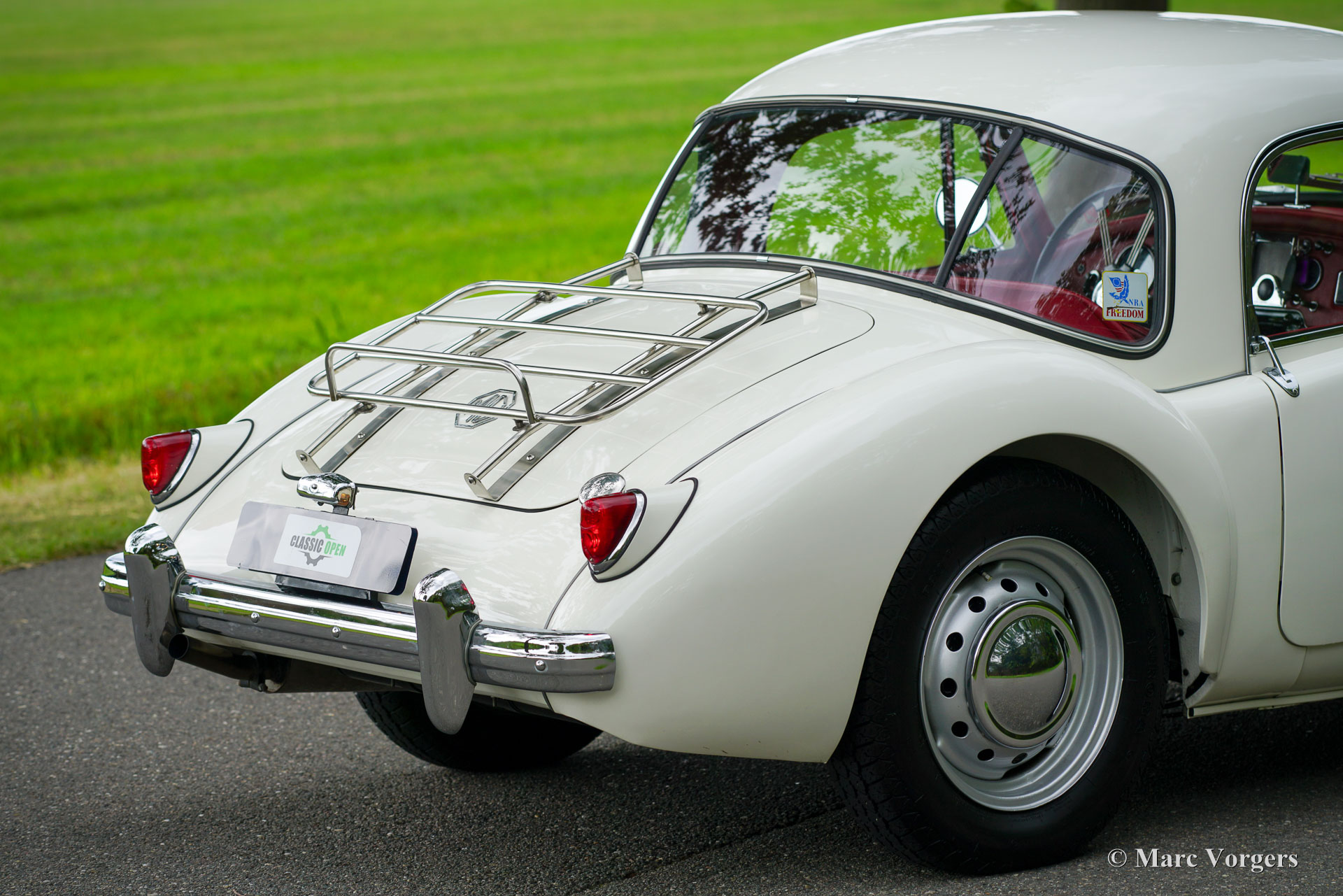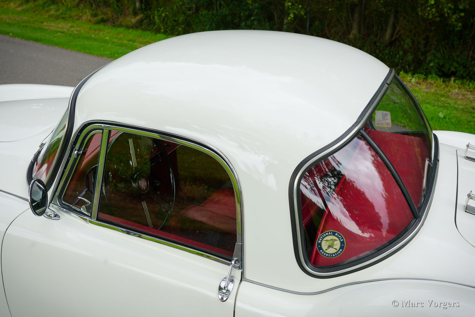 MG MGA 1500 Coupé, jaar 1957. Kleur wit gecombineerd met een rood kunstleren interieur afgewerkt met rode vloerbedekking en rode hemelbekleding. Deze magnifieke MGA 1500 coupé werd uitvoerig en prachtig gerestaureerd en de auto verkeert in een excellente staat! Het gelikte ontwerp van de MGA was iets heel anders dan het archaïsche uiterlijk van de eerdere MG TD- en MG TF-modellen. Het ontwerp van de MG MGA is sterk geïnspireerd op de gestroomlijnde MG TD Le Mans-auto die Sid Evener in 1951 ontwierp. Oorspronkelijk was de MGA ontworpen als roadster, voor de coupé werd een prachtig stalen dak toegevoegd met een driedelige achterruit en speciale handgrepen op de portieren die niet aanwezig waren op de roadster. Deze prachtige MGA 1500 Coupé toont alle originele details waaronder de stalen wielen met chromen wieldoppen, en het originele stuur! Het rode interieur is een geweldige cockpit met veel meters met chromen randen. De 1500 cc viercilinder motor levert een gezonde 72 pk wat de MGA een pittig en sportief karakter geeft. Er werden ongeveer 6500 MGA coupés gebouwd, een zeldzaam MGA-model! Deze zeer fraaie machine staat klaar om zijn toekomstige eigenaar veel plezier te brengen. Dit is een uitstekend exemplaar!