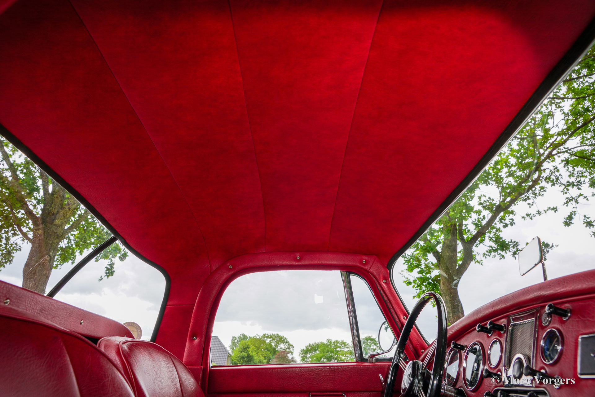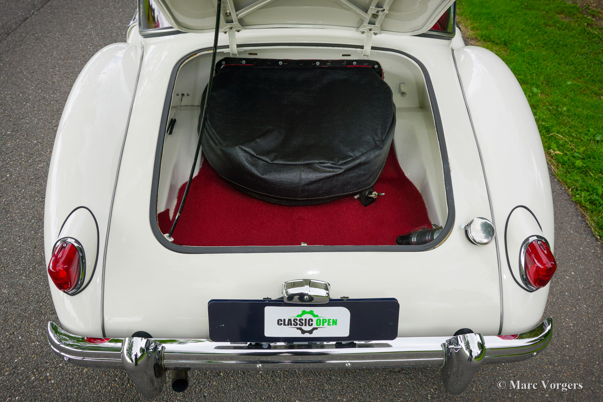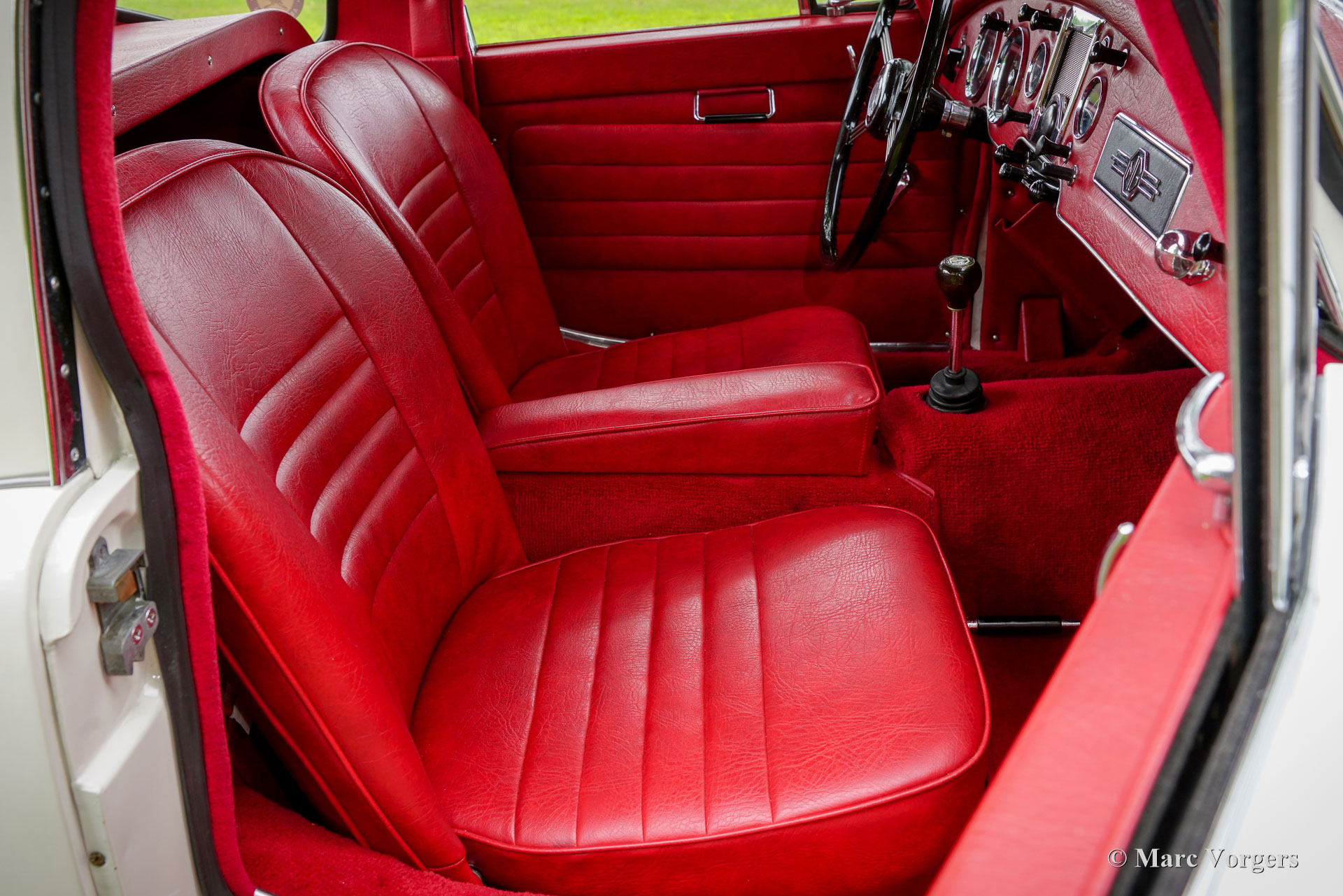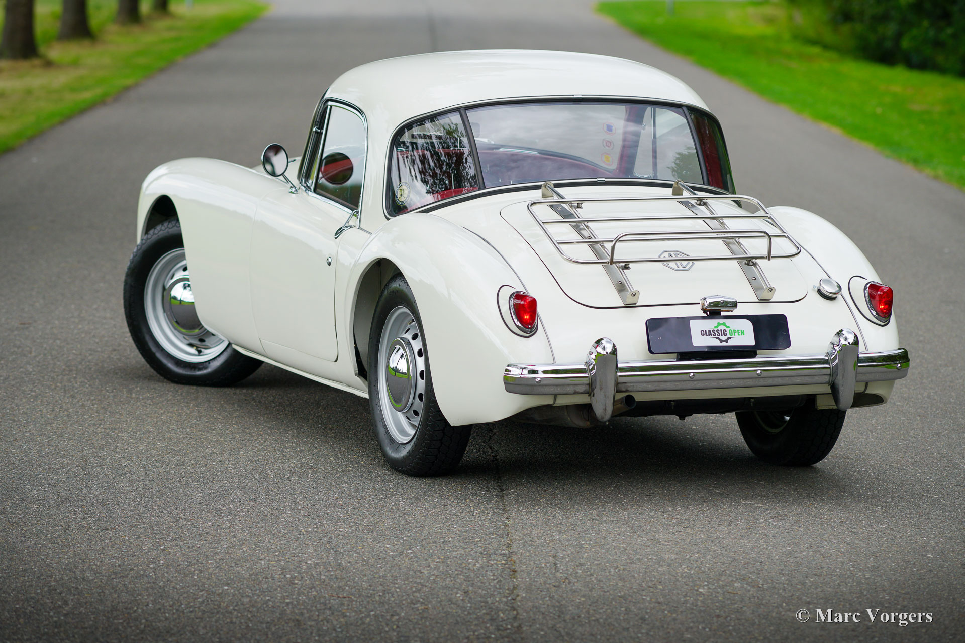 MG MGA 1500 Coupé, jaar 1957. Kleur wit gecombineerd met een rood kunstleren interieur afgewerkt met rode vloerbedekking en rode hemelbekleding. Deze magnifieke MGA 1500 coupé werd uitvoerig en prachtig gerestaureerd en de auto verkeert in een excellente staat! Het gelikte ontwerp van de MGA was iets heel anders dan het archaïsche uiterlijk van de eerdere MG TD- en MG TF-modellen. Het ontwerp van de MG MGA is sterk geïnspireerd op de gestroomlijnde MG TD Le Mans-auto die Sid Evener in 1951 ontwierp. Oorspronkelijk was de MGA ontworpen als roadster, voor de coupé werd een prachtig stalen dak toegevoegd met een driedelige achterruit en speciale handgrepen op de portieren die niet aanwezig waren op de roadster. Deze prachtige MGA 1500 Coupé toont alle originele details waaronder de stalen wielen met chromen wieldoppen, en het originele stuur! Het rode interieur is een geweldige cockpit met veel meters met chromen randen. De 1500 cc viercilinder motor levert een gezonde 72 pk wat de MGA een pittig en sportief karakter geeft. Er werden ongeveer 6500 MGA coupés gebouwd, een zeldzaam MGA-model! Deze zeer fraaie machine staat klaar om zijn toekomstige eigenaar veel plezier te brengen. Dit is een uitstekend exemplaar!