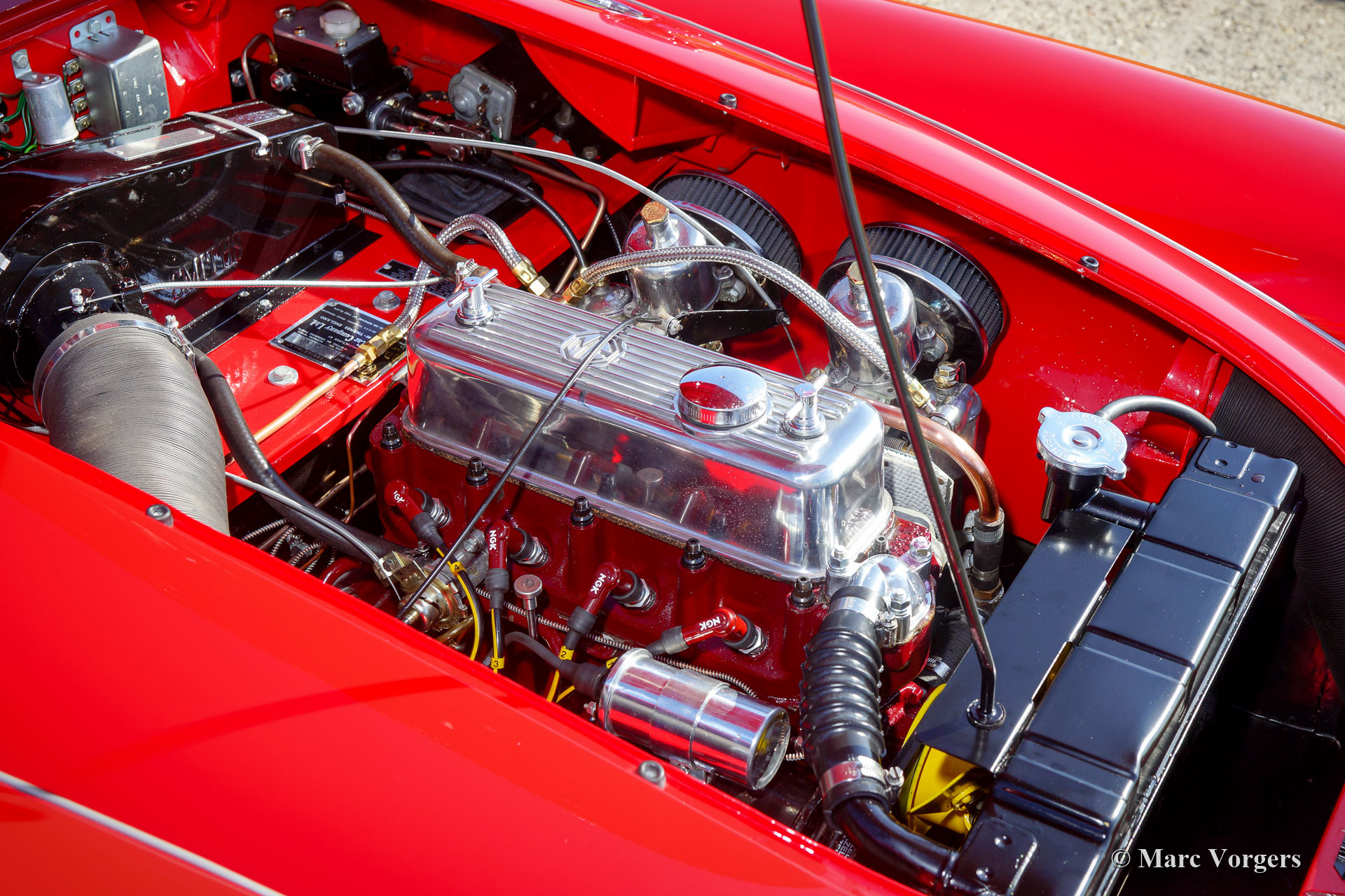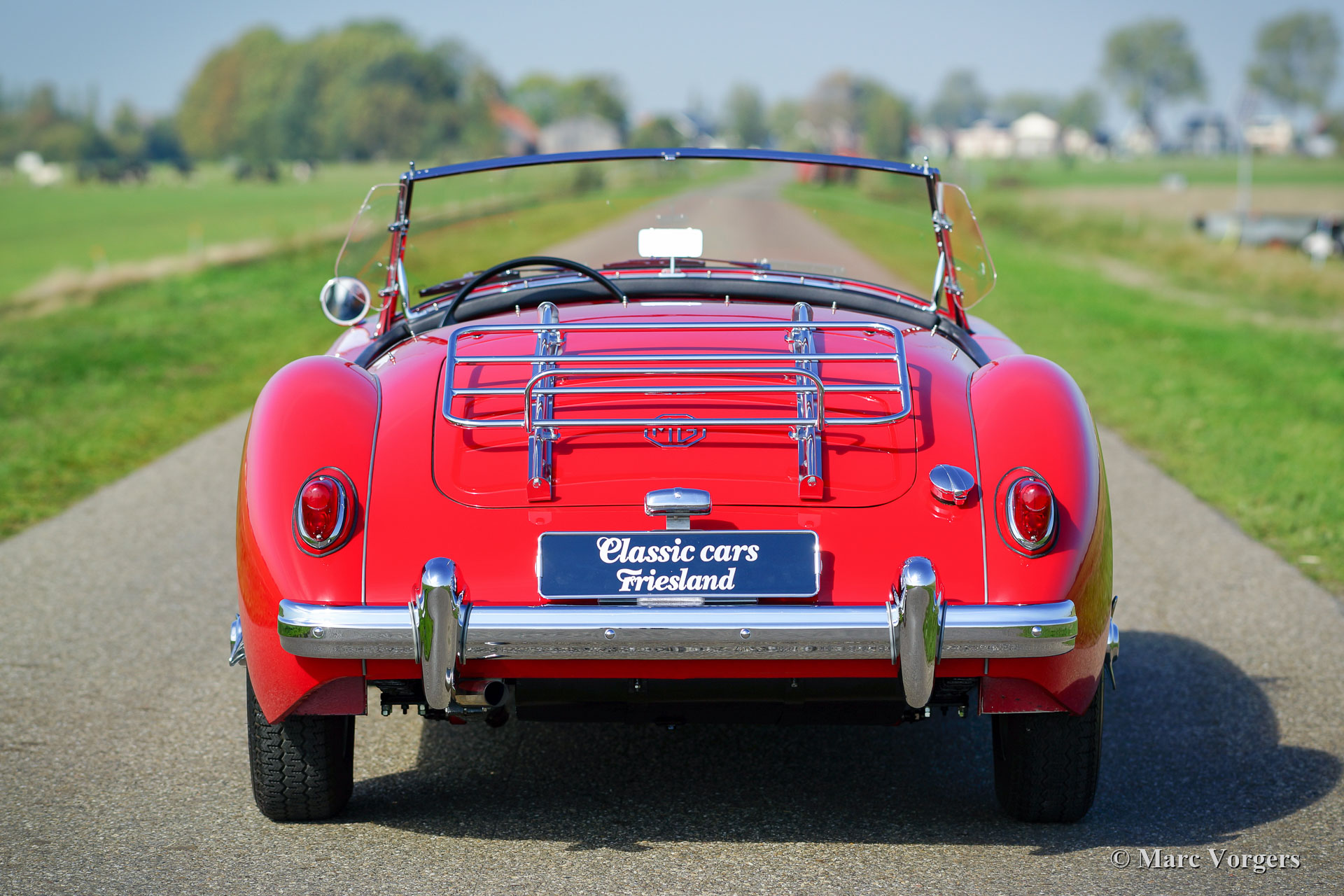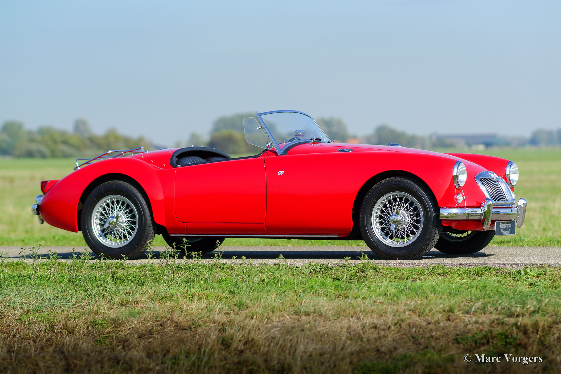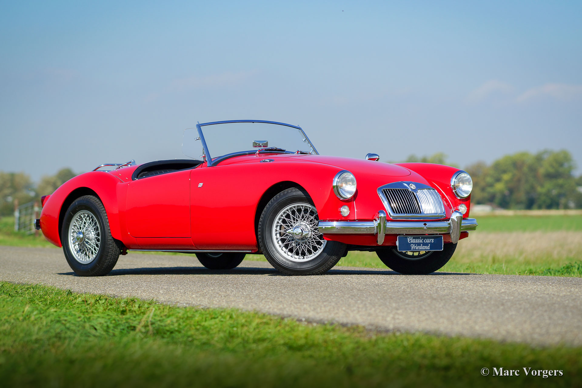 MG MGA 1500 Roadster, jaar 1956. Kleur rood gecombineerd met een zwartleren interieur en zwart wollen tapijt. Zwarte mohair soft-top en tonneau-cover, zijruiten met zwarte frames. Deze prachtige MGA roadster is in Nederland uitgebreid en 'body-off' gerestaureerd. Deze prachtige MGA-roadster verkeert in topconditie; concours! Het chassis werd gezandstraald tot op het blanke metaal en aansluitend zwart gemoffeld. De carrosserie is perfect gerestaureerd en afgewerkt met een hoogwaardig laksysteem. Mechanisch werd alles gereviseerd, de motor, versnellingsbak, wielophanging, remmen en de dashboardmeters. De draadboom is vernieuwd. Een fotoreportage van de restauratie is aanwezig. De MG toont fraaie originele details en de auto is uitgerust met zilver gelakte spaakwielen, een chroom bagagerek, een aluminium kleppendeksel, transparante windschermen op het voorruit-frame en vloermatten met MGA-logo. Deze prachtige MGA rijdt voortreffelijk; een top-exemplaar!