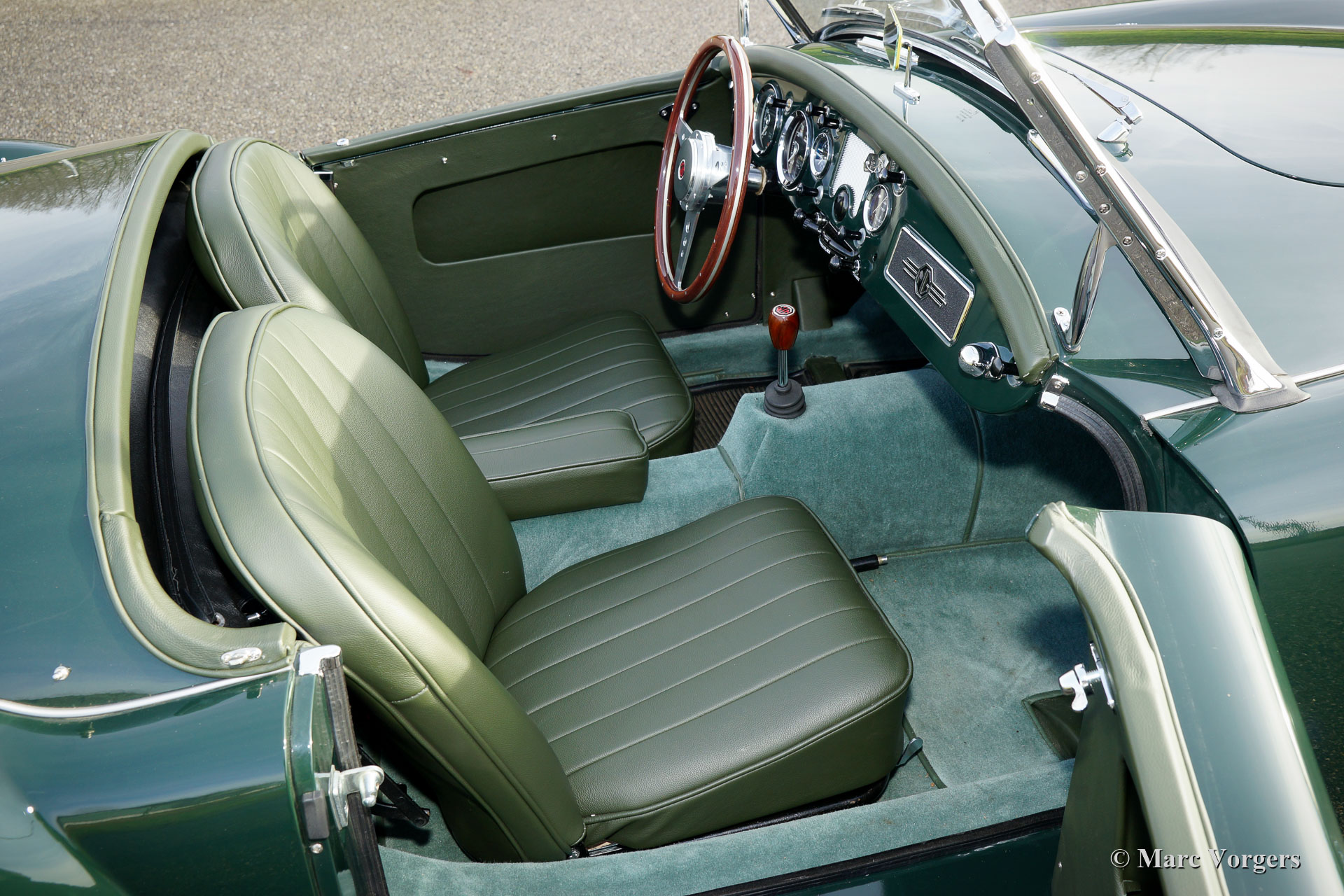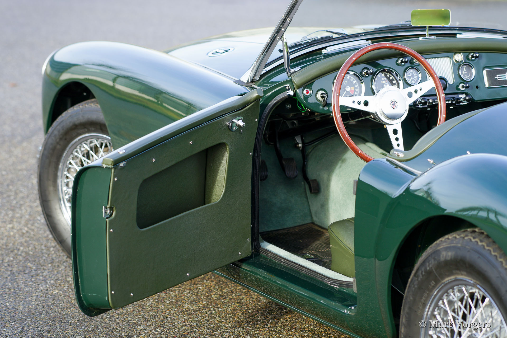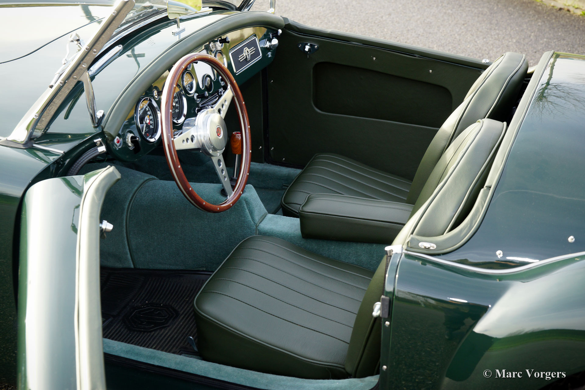 MG MGA 1500 roadster, jaar 1956. Kleur British Racing Green gecombineerd met een groenleren interieur en groen tapijt. Zwarte soft-top en zijruitframes. Deze prachtige MGA 1500 roadster is in recente jaren naar perfectie gerestaureerd; deze MGA verkeert in sublieme topstaat! Sinds de voltooiing van de restauratie heeft de auto slechts 1000 kilometer gereden. De auto is uitgerust met een sportstuur met houten rand, verchroomde spaakwielen en een roestvrijstalen uitlaatsysteem. De MGA roadster is een van de mooiste open sportauto's uit de jaren 1950 en de open voor rijervaring is fantastisch! Deze MGA 1500 roadster is een zeer begeerlijk exemplaar; Top gerestaureerd in een prachtig kleurenschema!