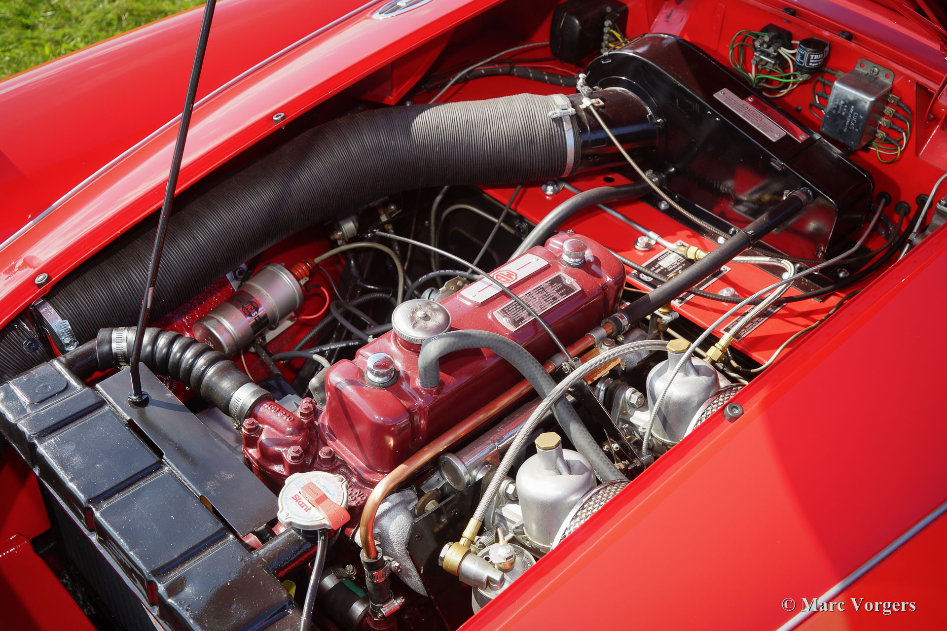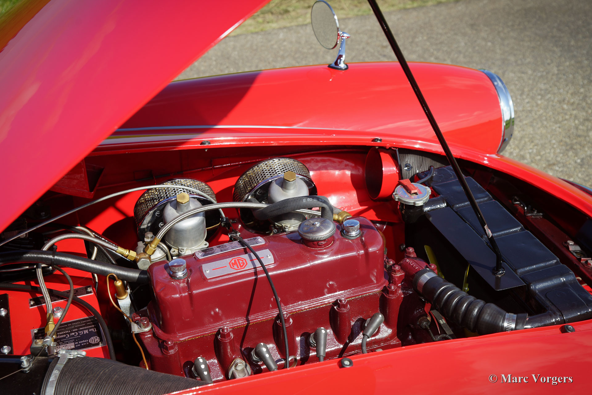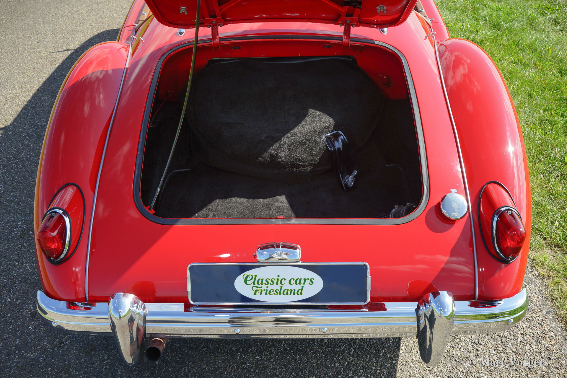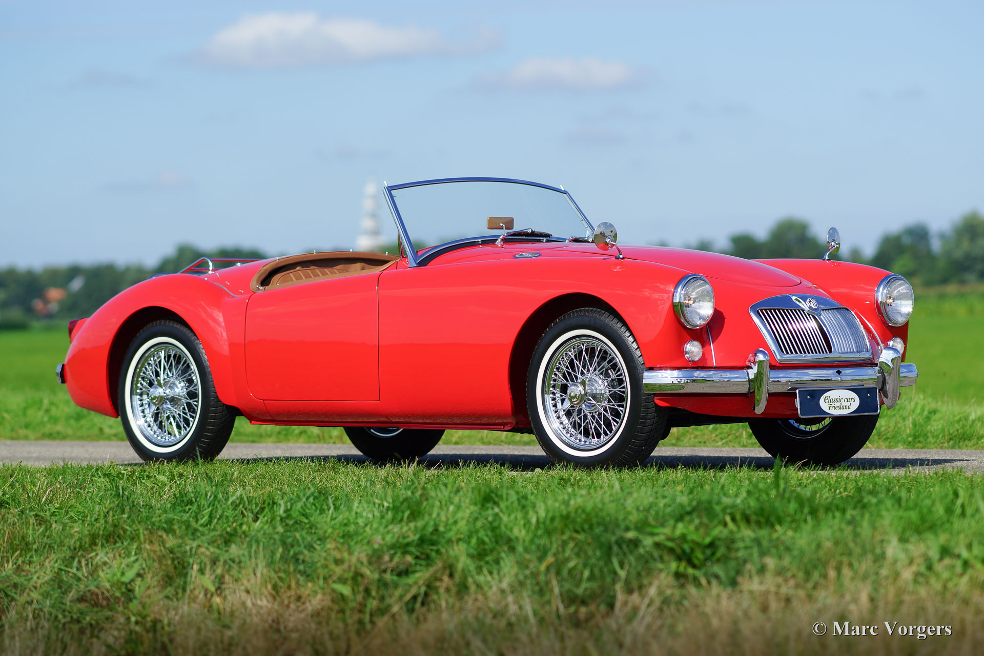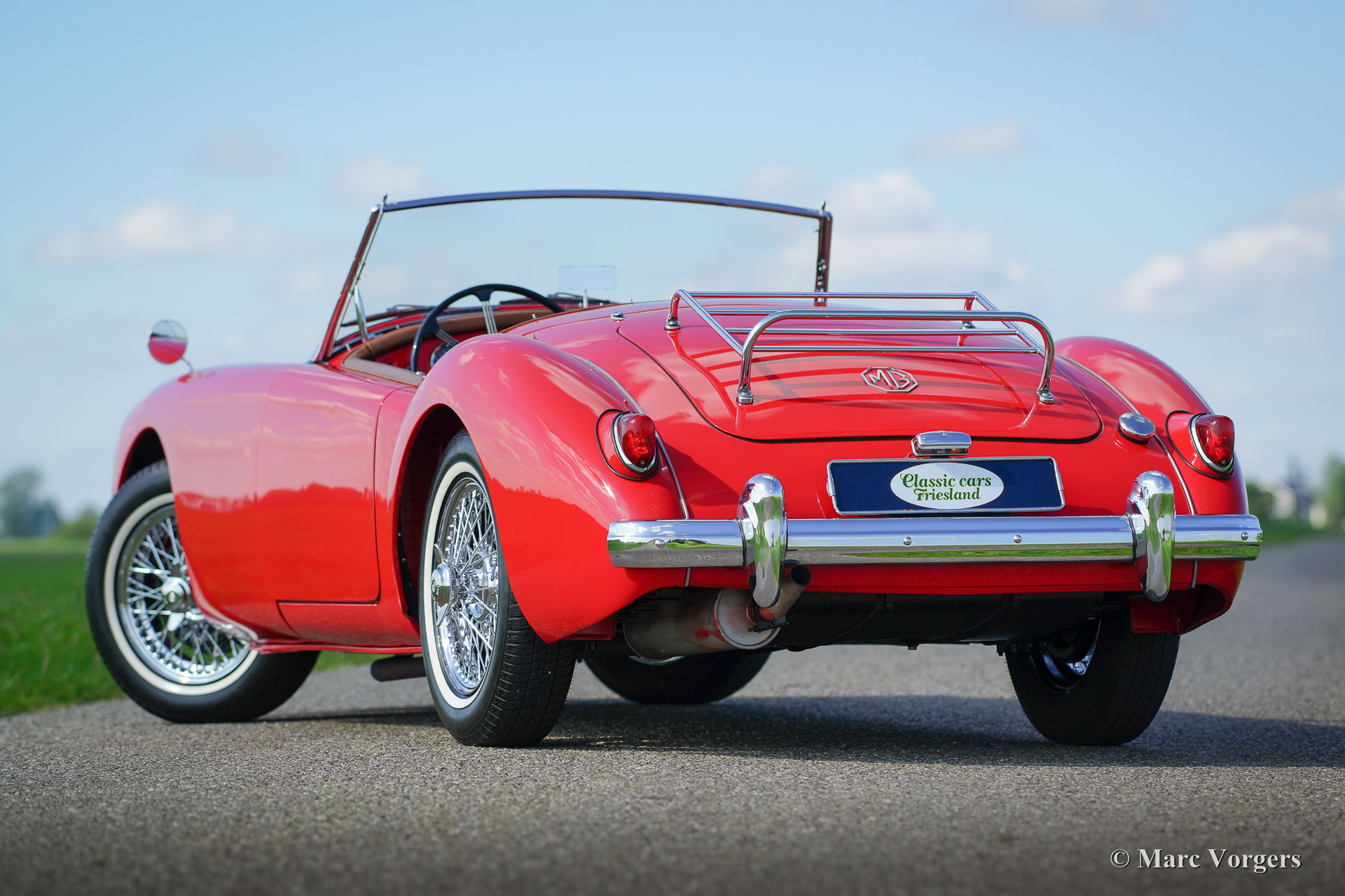 MG MGA 1500 roadster, jaar 1959. Kleur rood met een bruinleren interieur en zwart tapijt. De auto is uitgerust met een zwarte ‘soft-top’ en tonneaucover. Deze fraai gelijnde MGA 1500 roadster werd uitvoerig gerestaureerd naar topconditie. De motor en de versnellingsbak zijn gereviseerd en er werd een handgeschakelde vijfversnellingsbak gemonteerd. Een fotoreportage van de restauratie is aanwezig. De carrosserie toont fraaie passingen, subliem chroomwerk en lakwerk; de auto verkeert in sublieme staat! Deze MGA is voorzien van chroom spaakwielen, banden met witte sier-ringen (white wall tyres) en een chroom kofferrek. Een bijzonder fraaie en perfect rijdende MGA roadster.