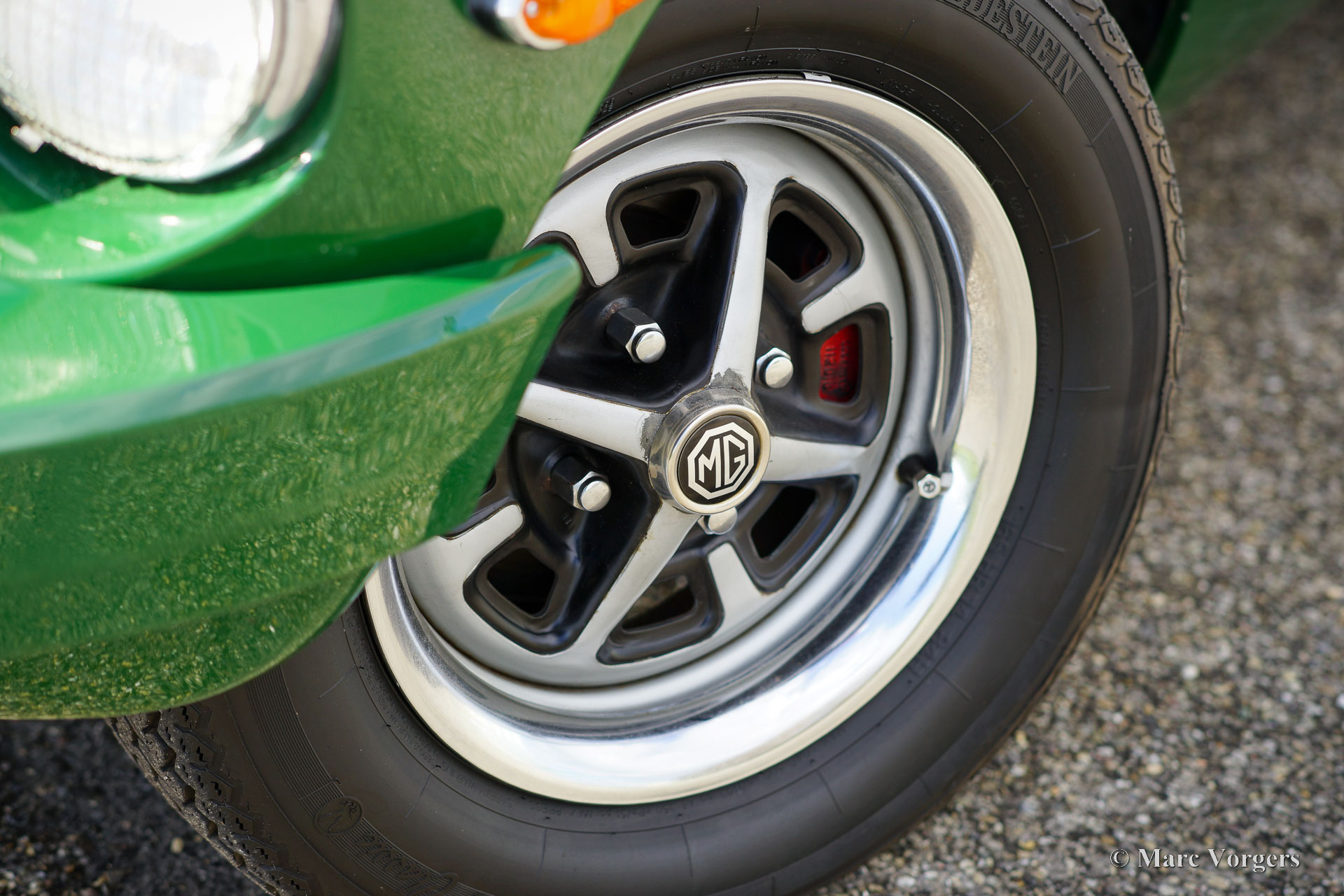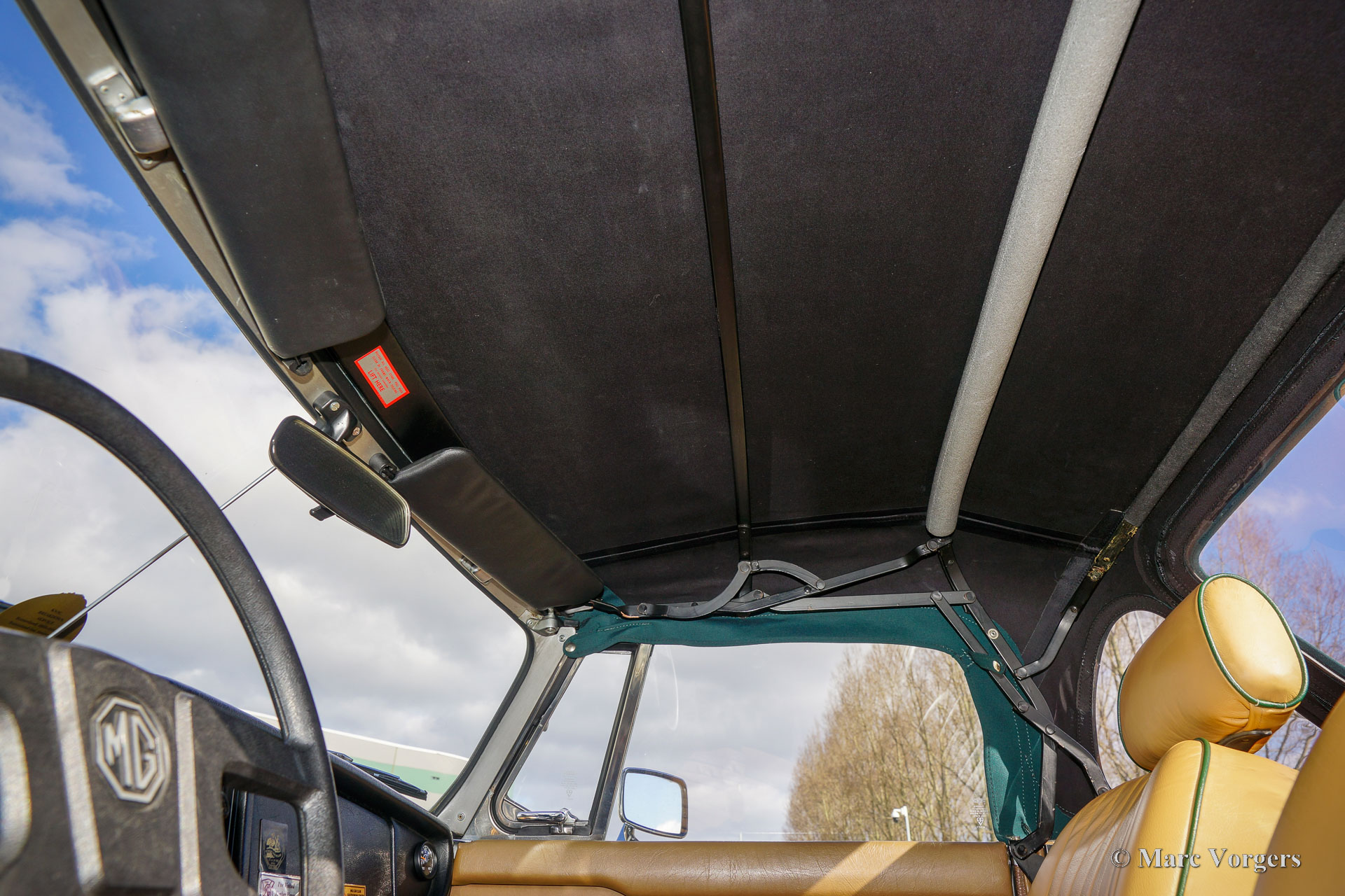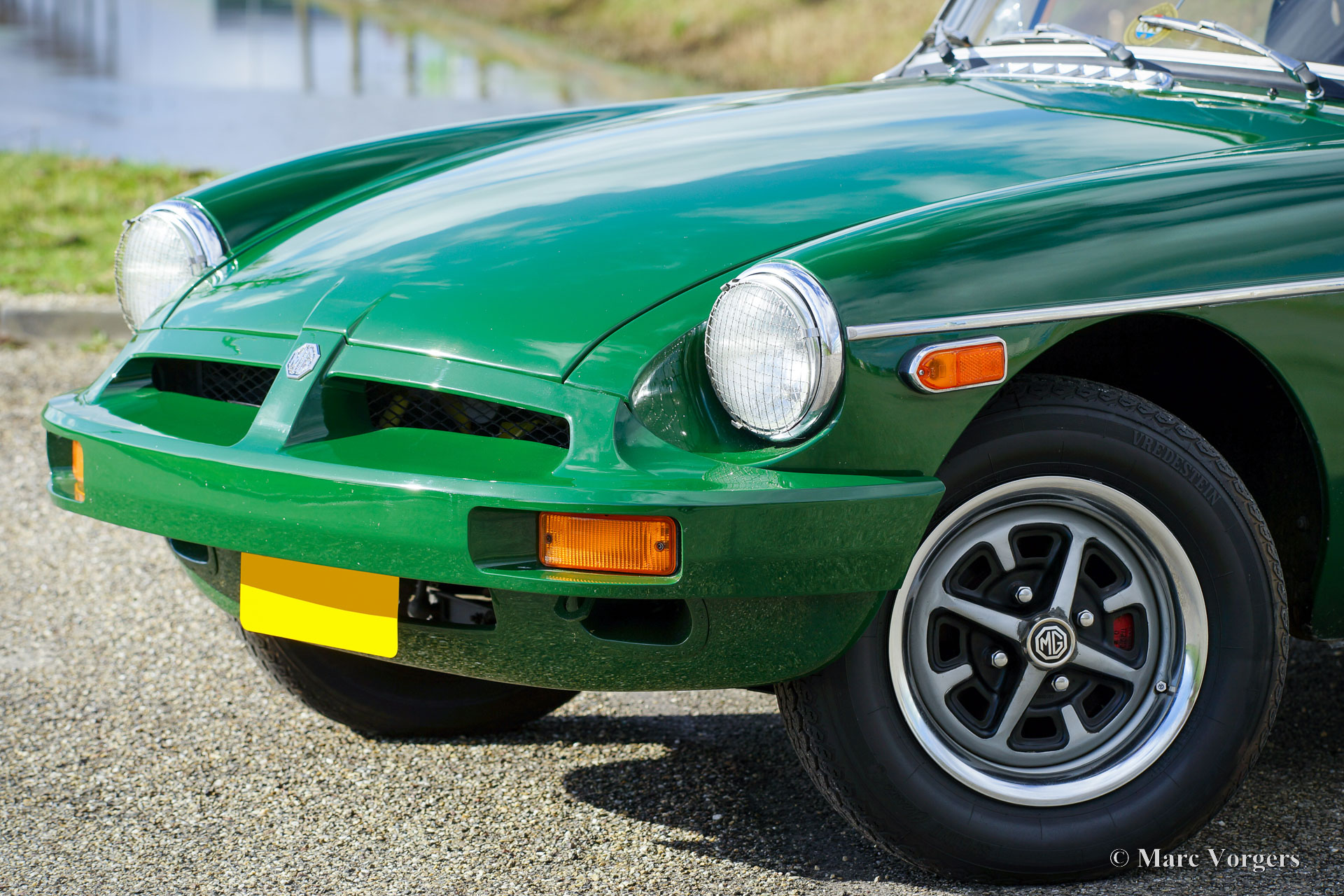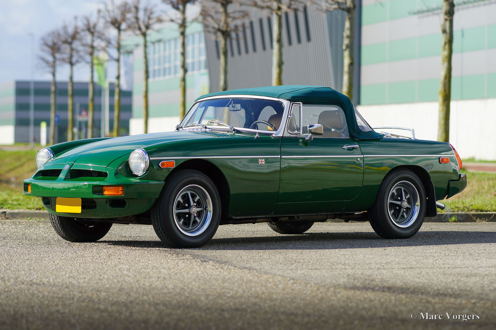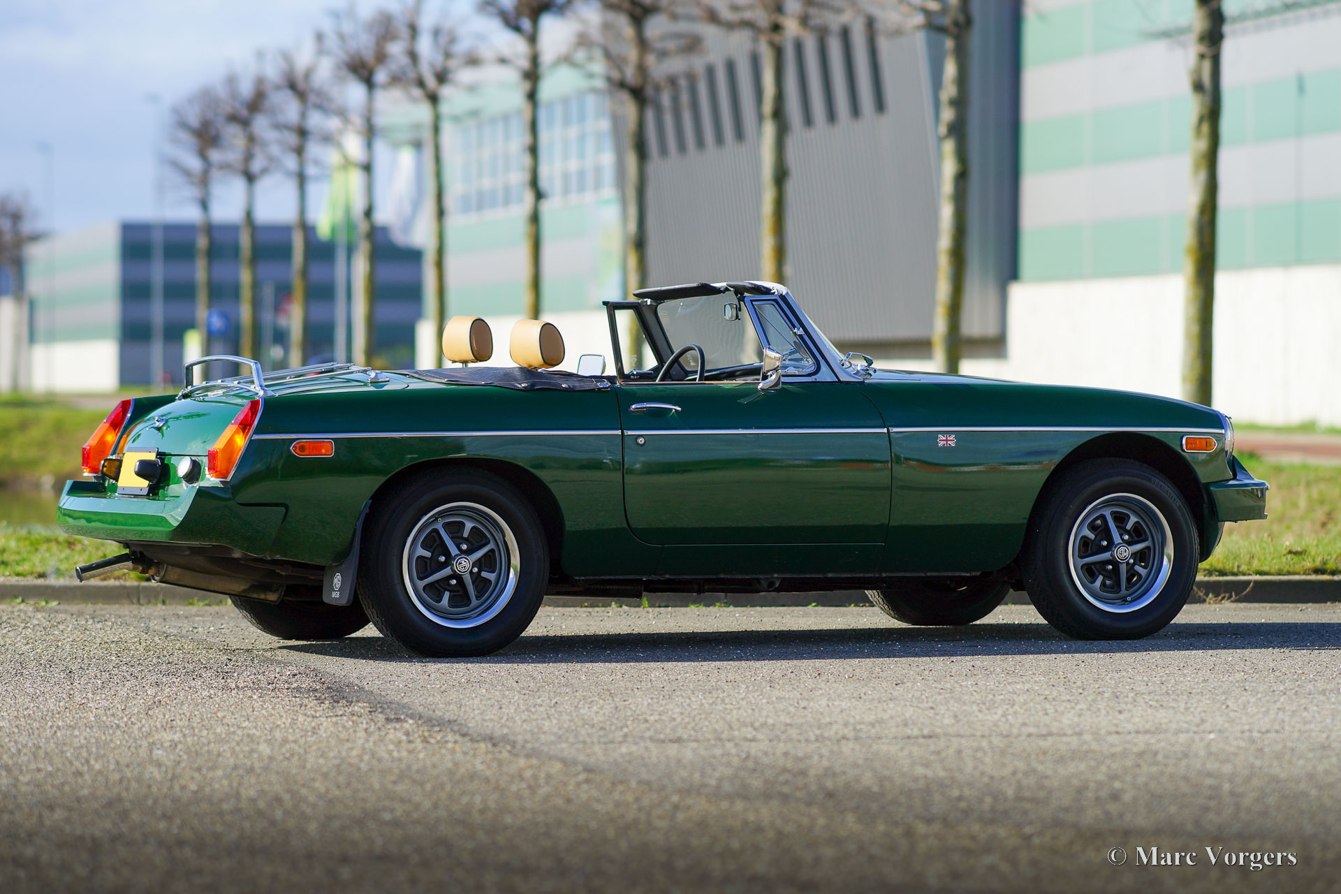 MG MGB roadster, jaar 1979. Kleur groen gecombineerd met een beige lederen interieur afgewerkt met groene biezen en zwart tapijt. Groene soft-top en hood-cover. Deze MGB roadster komt uit de laatste en meest doorontwikkelde serie. Deze laatste serie onderscheidde zich van de eerdere modellen door de rubberen veiligheidsbumpers en meer comfort. Bij deze MGB zijn de bumpers in carrosseriekleur gespoten waardoor ze mooi opgaan in de vorm van de auto. De MGB beschikt over een sportieve 1800 cc viercilindermotor met dubbele S.U.-carburateurs, een handgeschakelde 4-versnellingsbak, overdrive en rembekrachtiging. De auto verkeert in een zeer goede staat en deze MGB rijdt en stuurt voortreffelijk! De MGB roadster is een praktische klassieke sportwagen, hij biedt voldoende ruimte voor de inzittenden, kofferruimte voor sporttassen en een bagagerek voor een echte koffer.