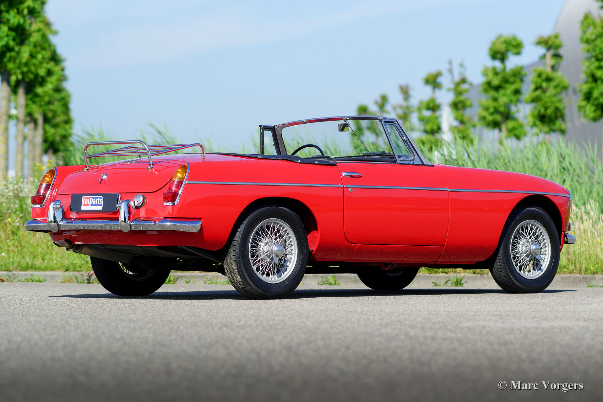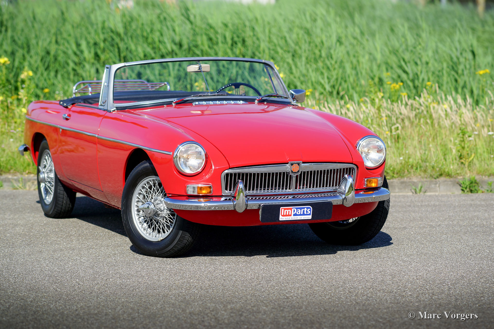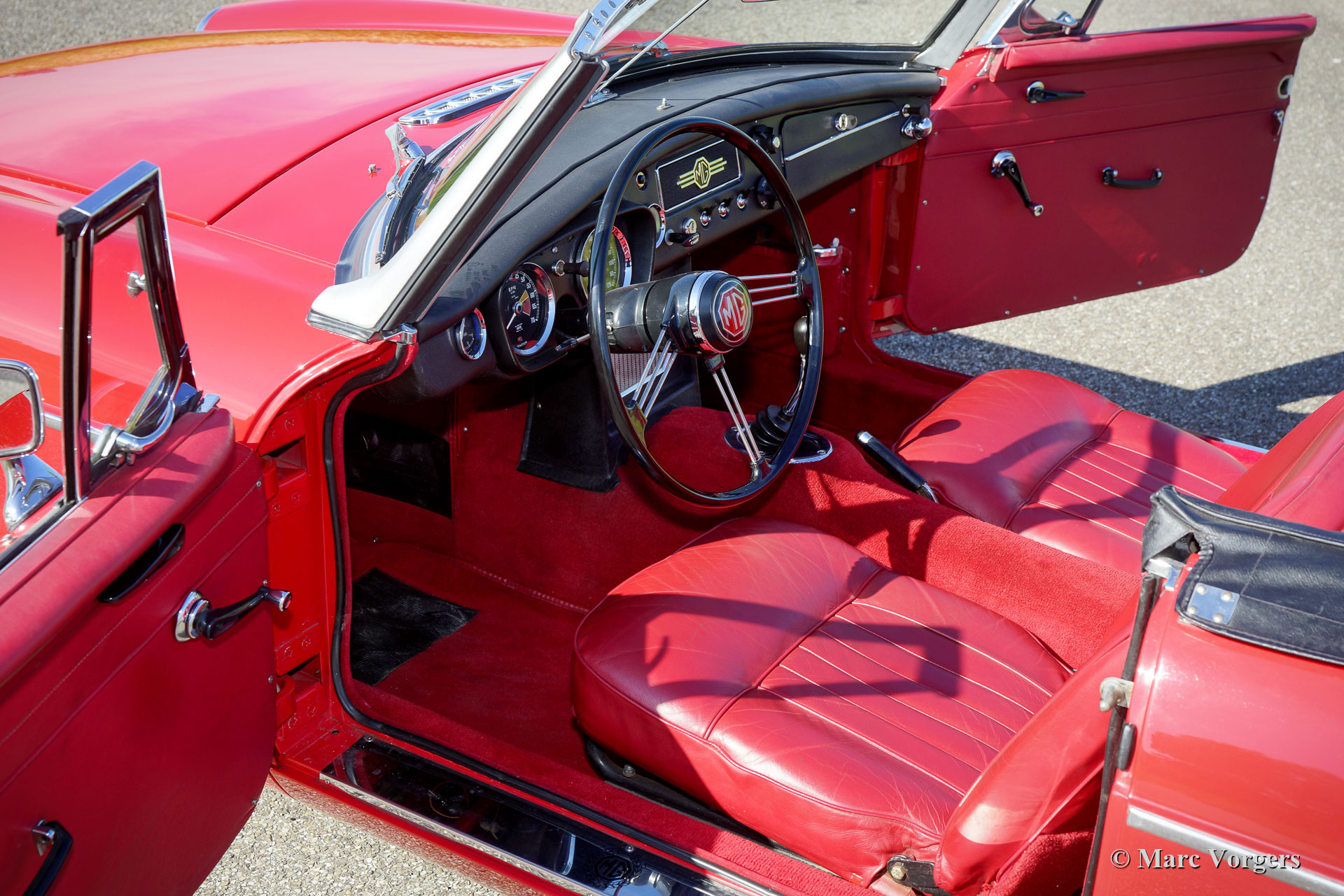 MG MGB roadster Mk I ‘lepeldeur’, jaar 1965. Kleur rood gecombineerd met een roodleren interieur. Zwarte vinyl soft-top en hood-cover. Deze prachtige MGB roadster verkeert in excellente staat en de auto rijdt voortreffelijk! Dit is het vroegste MGB-model met de speciale trek-handgrepen. Ook aanwezig zijn het prachtige metalen dashboard, afgewerkt met zwarte ‘krimp-lak’, en het fantastische originele stuurwiel! Verder is de auto voorzien van zilver gelakte spaakwielen, rembekrachtiging, een oliekoeler, een roestvrijstalen uitlaat en een verchroomd kofferrek. Recent zijn er nieuwe veren gemonteerd, schroefveren voor en parabolische bladveren aan de achterzijde. Dit is een begeerlijke vroege MGB roadster!