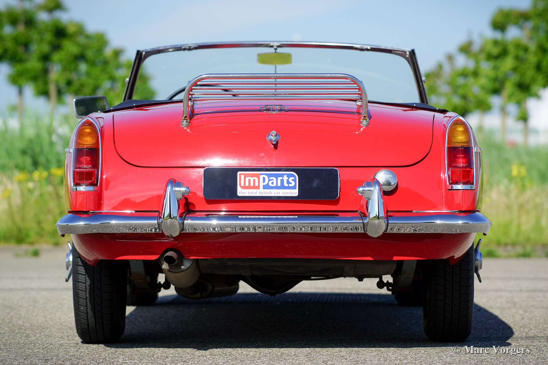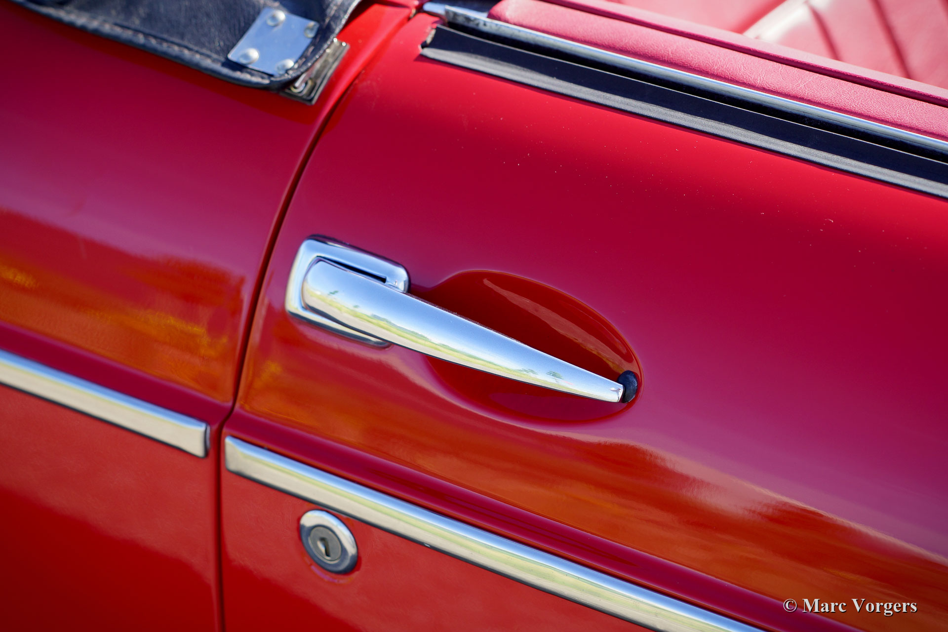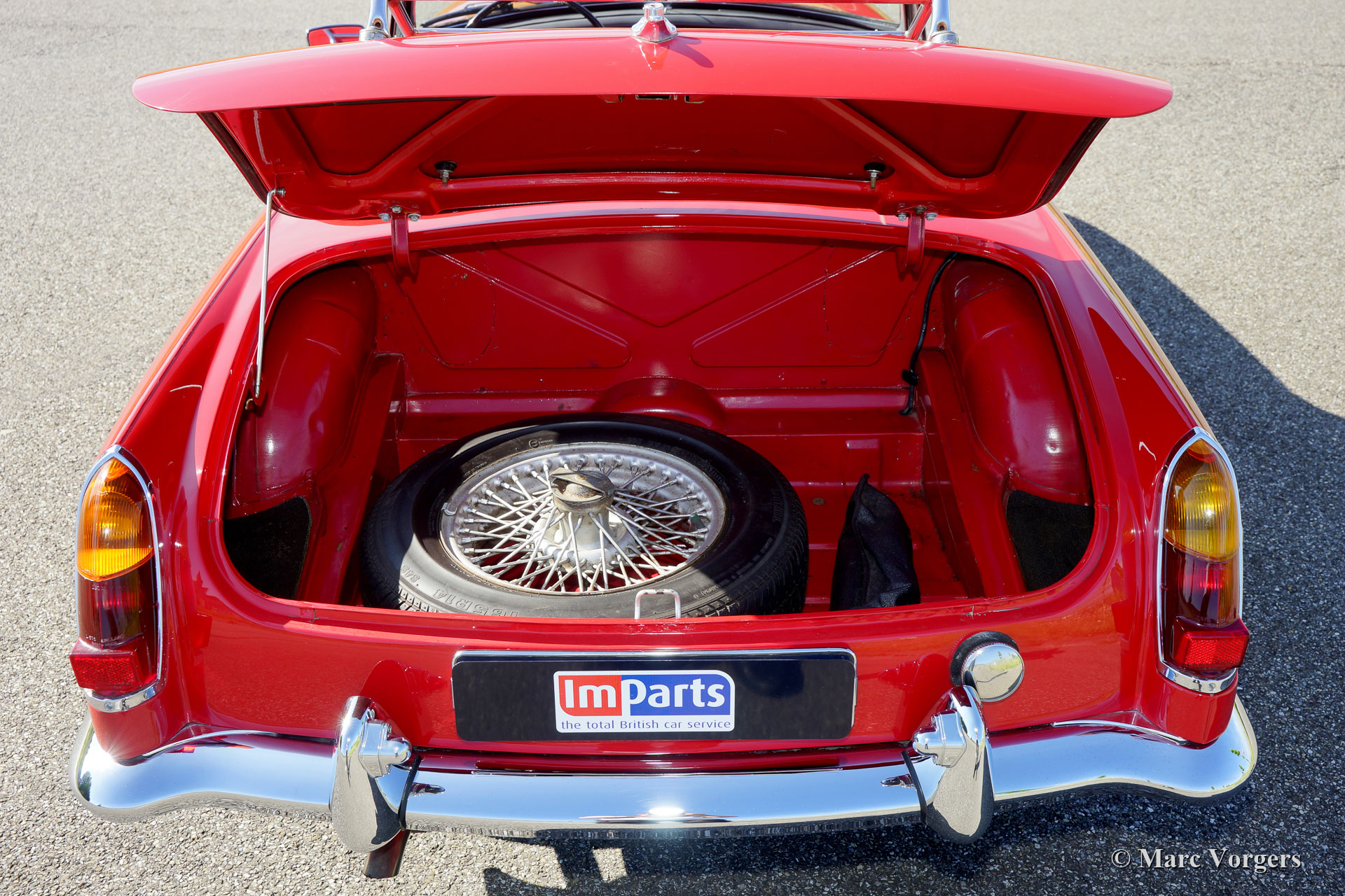 MG MGB roadster Mk I ‘lepeldeur’, jaar 1965. Kleur rood gecombineerd met een roodleren interieur. Zwarte vinyl soft-top en hood-cover. Deze prachtige MGB roadster verkeert in excellente staat en de auto rijdt voortreffelijk! Dit is het vroegste MGB-model met de speciale trek-handgrepen. Ook aanwezig zijn het prachtige metalen dashboard, afgewerkt met zwarte ‘krimp-lak’, en het fantastische originele stuurwiel! Verder is de auto voorzien van zilver gelakte spaakwielen, rembekrachtiging, een oliekoeler, een roestvrijstalen uitlaat en een verchroomd kofferrek. Recent zijn er nieuwe veren gemonteerd, schroefveren voor en parabolische bladveren aan de achterzijde. Dit is een begeerlijke vroege MGB roadster!