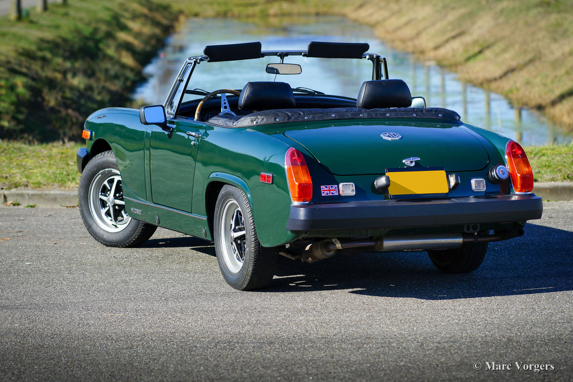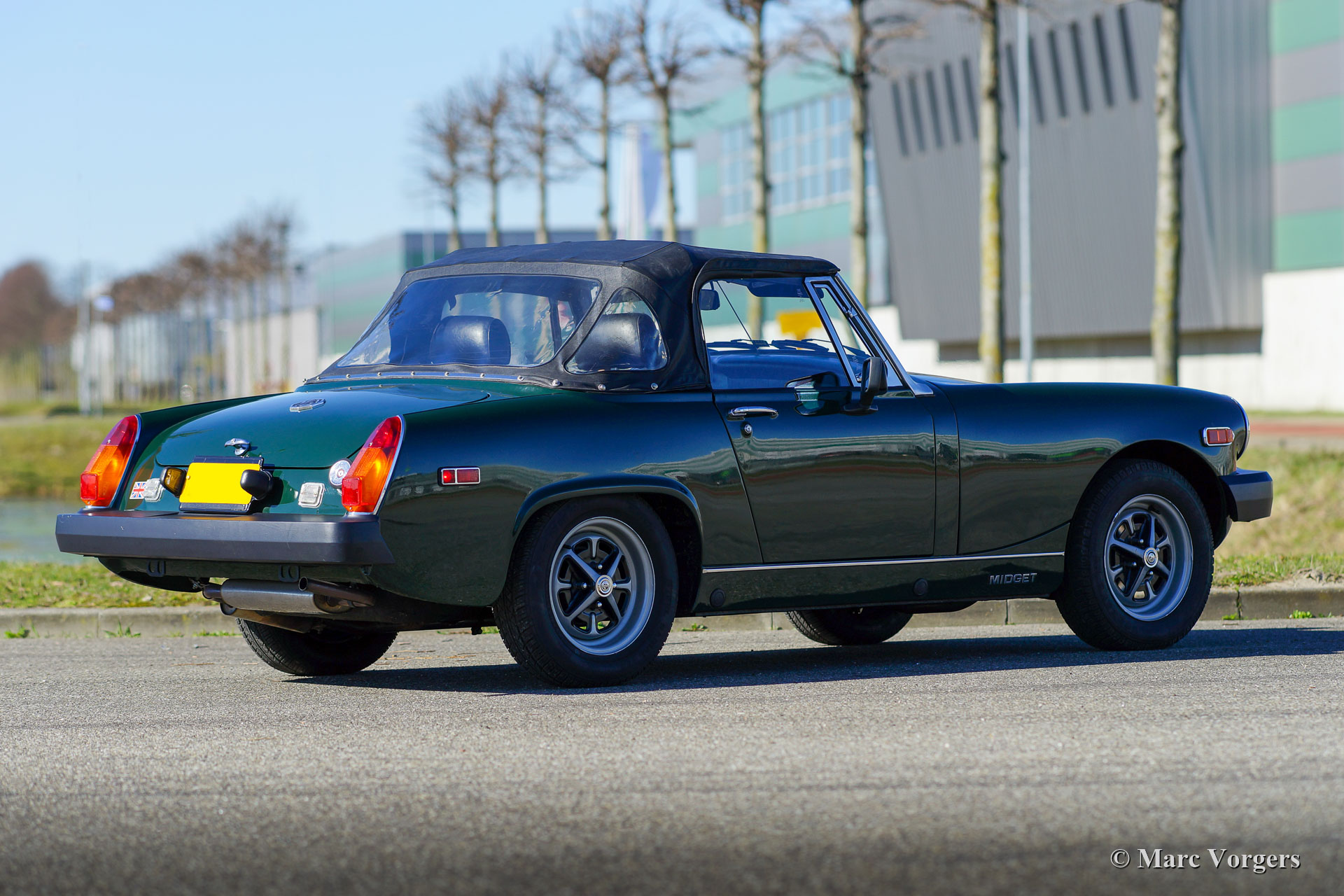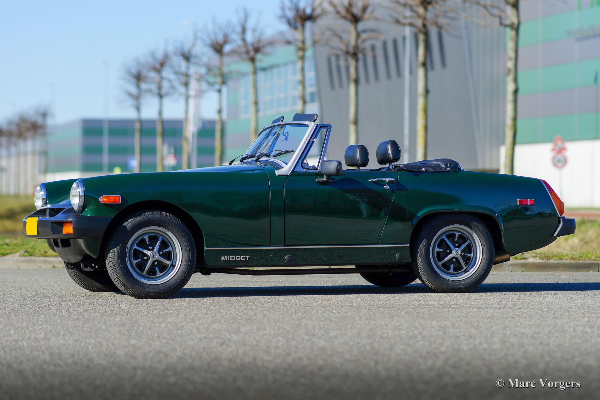 MG Midget 1500, jaar 1977. Kleur donker British Racing Green gecombineerd met een zwart kunstlederen interieur en zwart tapijt. Zwarte vinyl soft-top en kapafdekking. Deze MG Midget is nieuw verkocht in de USA, de auto is geïmporteerd uit Californië. Deze compacte open MG verkeert in excellente conditie en de auto rijdt perfect. Vorige eigenaar (s) hebben veel zorg geïnvesteerd in service en onderhoud van deze mooie auto. De carrosserie is vrij van corrosie en vertoont uitstekend lakwerk, het interieur is in uitstekende conditie met slechts zeer lichte gebruikssporen en de motorruimte is mooi schoon. De open rijervaring is heel bijzonder deze compacte MG Midget! De auto is voorzien van de krachtige en betrouwbare 1500 cc viercilindermotor, comfortabele stoelen met hoofdsteunen, een sportstuur met houten rand en de originele ‘Rostyle’ wielen.