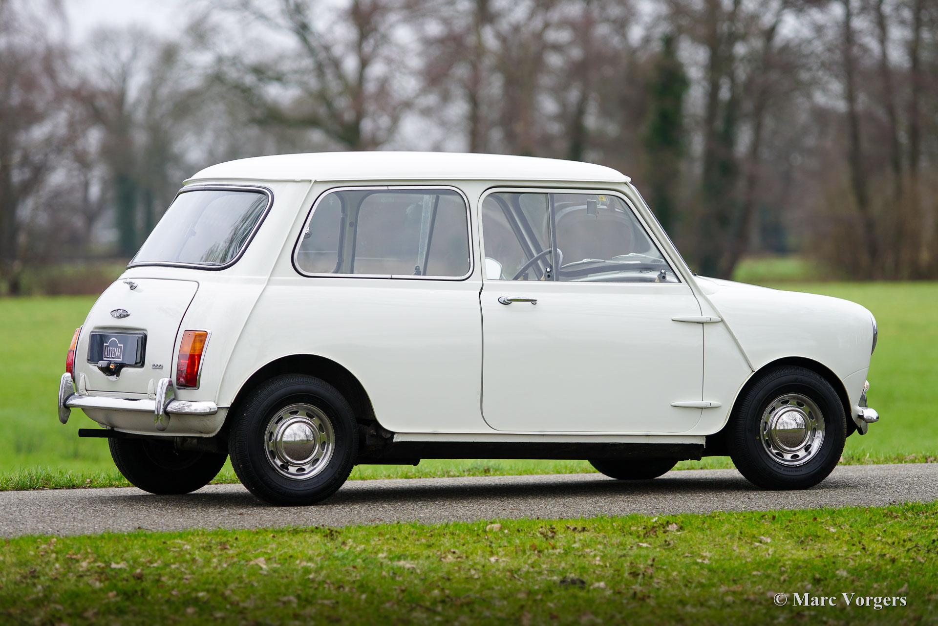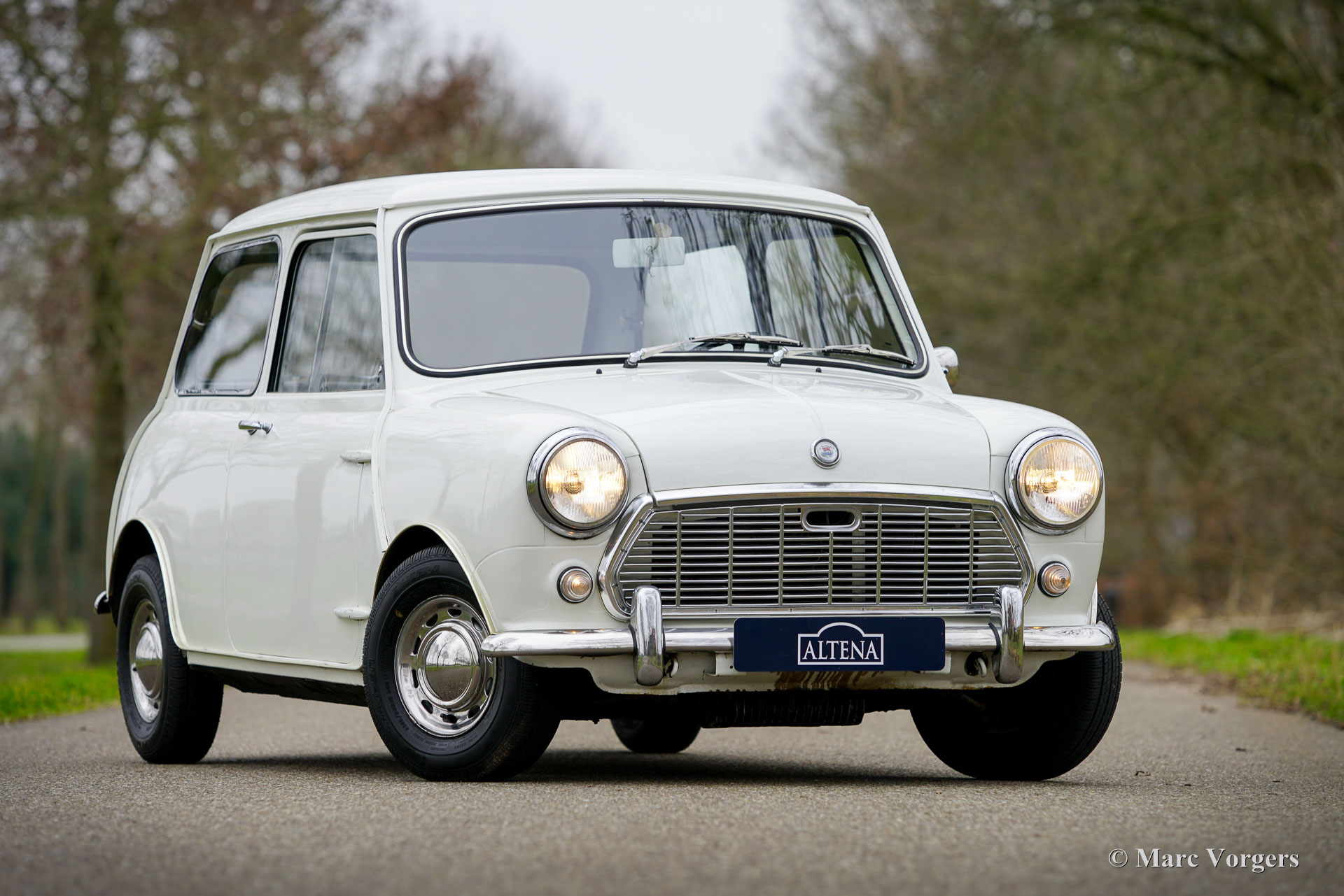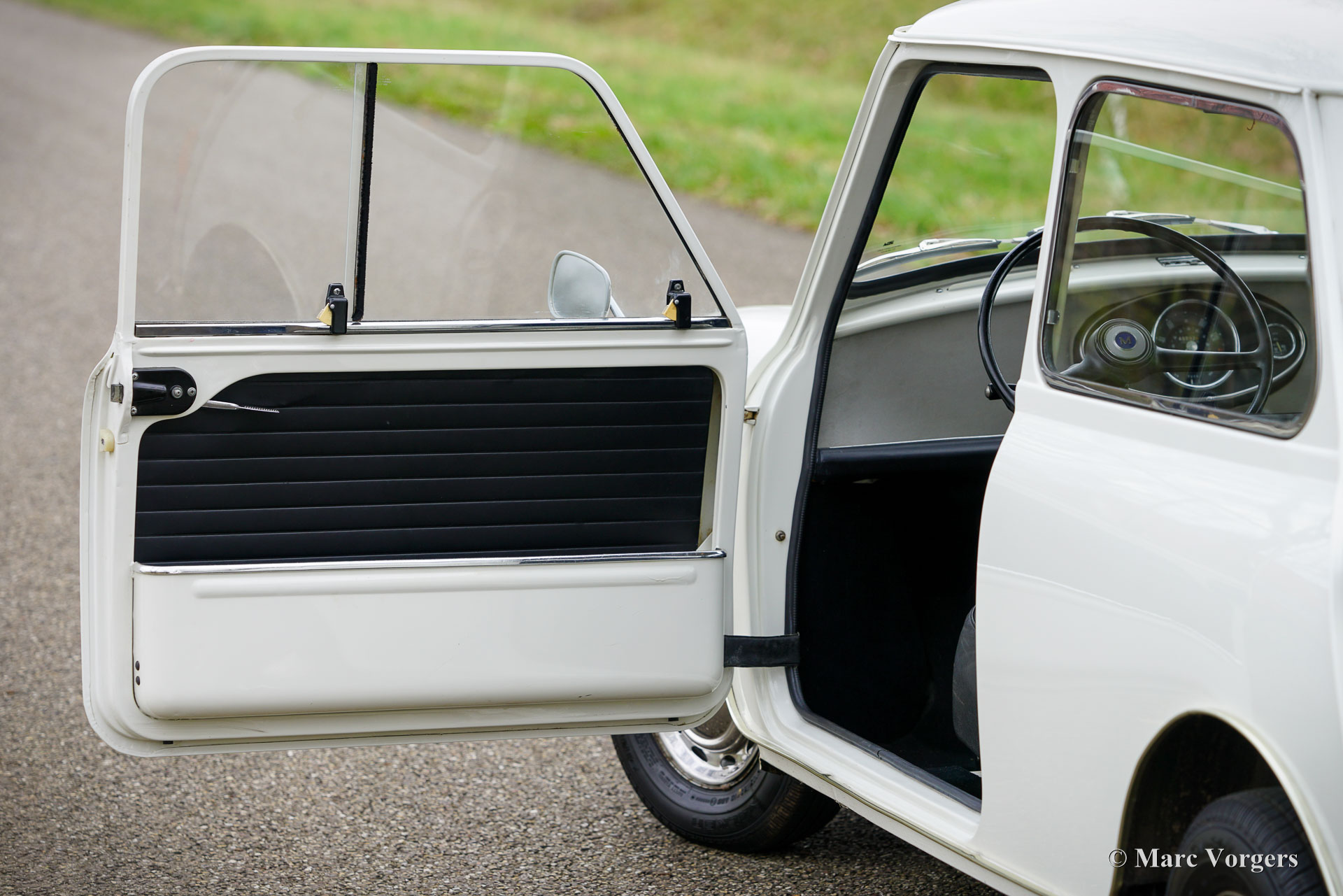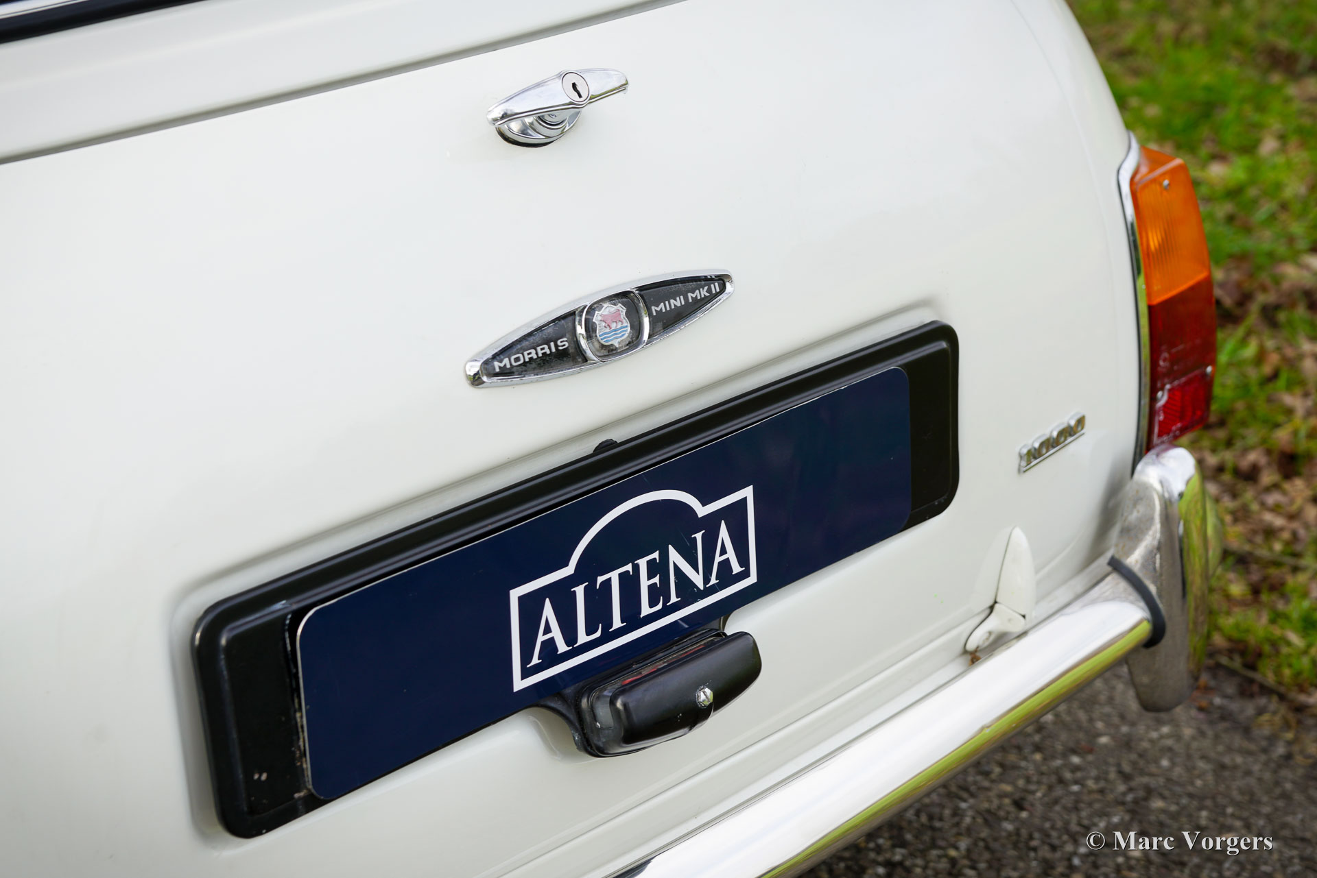 Morris Mini 1000 Mk II, jaar 1969. Kleur gebroken wit (Old English White) gecombineerd met een zwart vinyl interieur afgezet met zwart tapijt. Deze prachtige Morris Mini wordt geleverd met een volledig bekende en gedocumenteerde historie vanaf nieuw! De auto werd nieuw verkocht in Frankrijk, de volgende eigenaar was de Frans-Hongaarse kunstenaar Victor Vasarely. Vanaf nieuw heeft de auto slechts 48.800 kilometer gereden. Deze begeerlijke Morris Mini werd in het jaar 2000 in Nederland geïmporteerd en heeft slechts één zorgzame eigenaar gehad. Altena Classic Service heeft de Mini rechtstreeks van de eigenaar gekocht. Begin jaren 2000 werd de Mini gedemonteerd, opgeknapt, en nieuw gespoten. Van de werkzaamheden zijn foto’s aanwezig. Ook aanwezig is de oude Franse registratiekaart, een dossier met servicefacturen en documenten, en Franse en Nederlandse gebruikershandleidingen. Bovendien wordt de auto geleverd met een selectie reserveonderdelen. Deze begeerlijke Morris Mini 1000 Mk II is een fantastische tijdcapsule en een prachtig verzamelobject waar de nieuwe eigenaar veel plezier aan zal beleven. Deze Morris Mini rijdt voortreffelijk!