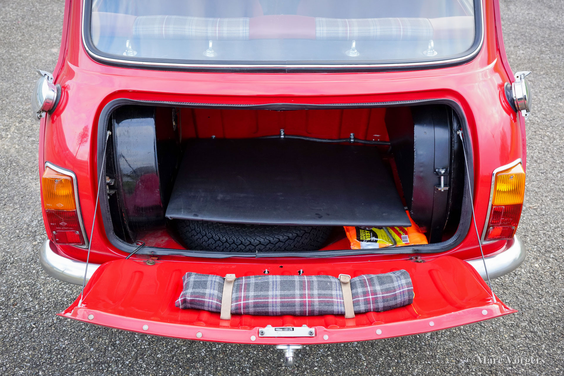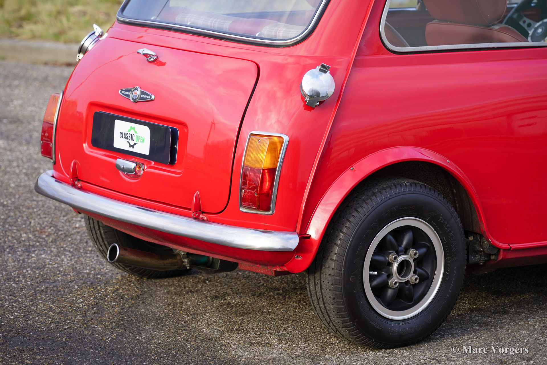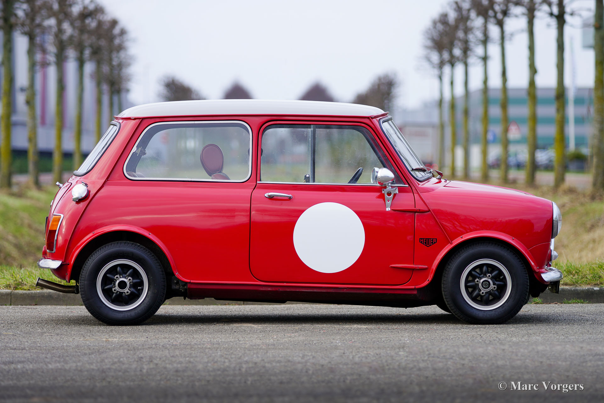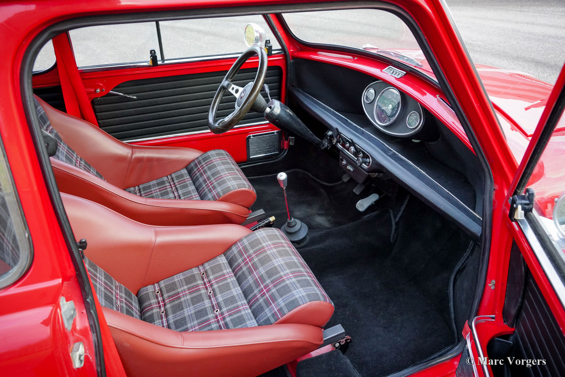 Morris Mini Cooper MK2, jaar 1970. Exterieurkleur tartan rood gecombineerd met een ‘Sky mist’-kleurig dak. Speciaal gemaakt donkerrood/grijs leder/stoffen interieur afgewerkt met zwart tapijt. Deze geweldige Mini Cooper werd geassembleerd in de British Leyland Sebutal-fabriek in Portugal en nieuw verkocht in Portugal. In 2020 is de auto in Nederland geïmporteerd. Deze Morris Mini Cooper is in het verleden gerestaureerd en gereviseerd. De auto is voorzien van een krachtige Cooper S 1275 cc-motor met twee S.U.-carburateurs, elektronische ontsteking en andere upgrades om de Cooper S-specificaties te benaderen. Een rembekrachtiger zorgt dat de remmen het extra vermogen aankunnen. De sportuitlaat produceert een prachtig geluid dat lijkt op de krachtige brul van de succesvolle Mini Coopers die in de jaren 60 zoveel rally's hebben gewonnen. De auto is uitgerust met twee benzinetanks (vandaar de twee snelvuldoppen op de achterste hoeken!), wielkast verbreders, Swift Tune-racespiegels, een carterbeschermer en zeer fraaie “Rose Petal”-lichtmetalen velgen! Deze kleine ‘pocket rocket’ verkeert in een uitstekende staat en de rijervaring is fantastisch! Dit prachtige exemplaar beschikt over een speciaal interieur met prachtige kuipstoelen bekleed met donkerrood leer en grijs geblokte stoffen middenstukken. Historische documentatie is bij de auto aanwezig. De Morris Mini was een revolutie toen deze in 1959 werd geïntroduceerd en de Cooper en Cooper S-modellen bleken sensationele auto's op het circuit en in rallywedstrijden. De Mini werd een icoon van de populaire cultuur van de jaren 60 en wordt beschouwd als een van de meest invloedrijke auto's van de 20e eeuw. Dit is uw kans om een prachtig exemplaar te kopen dat een blijvende glimlach op uw gezicht zal toveren!