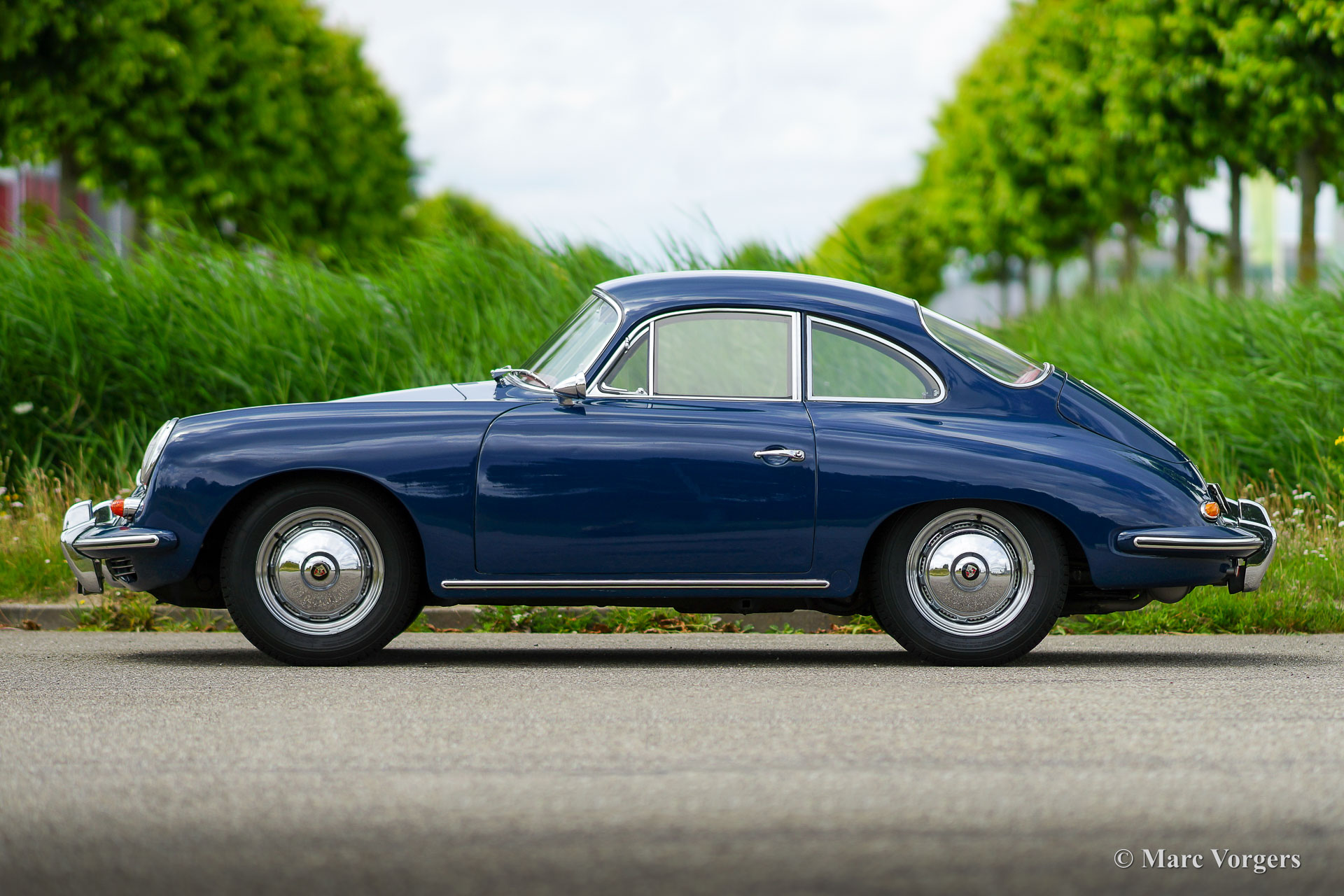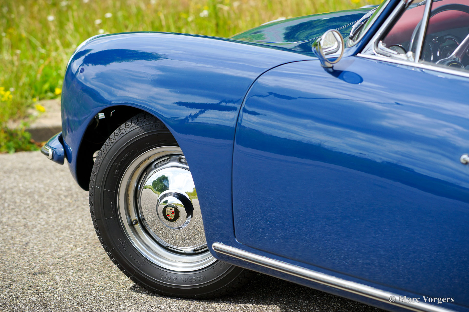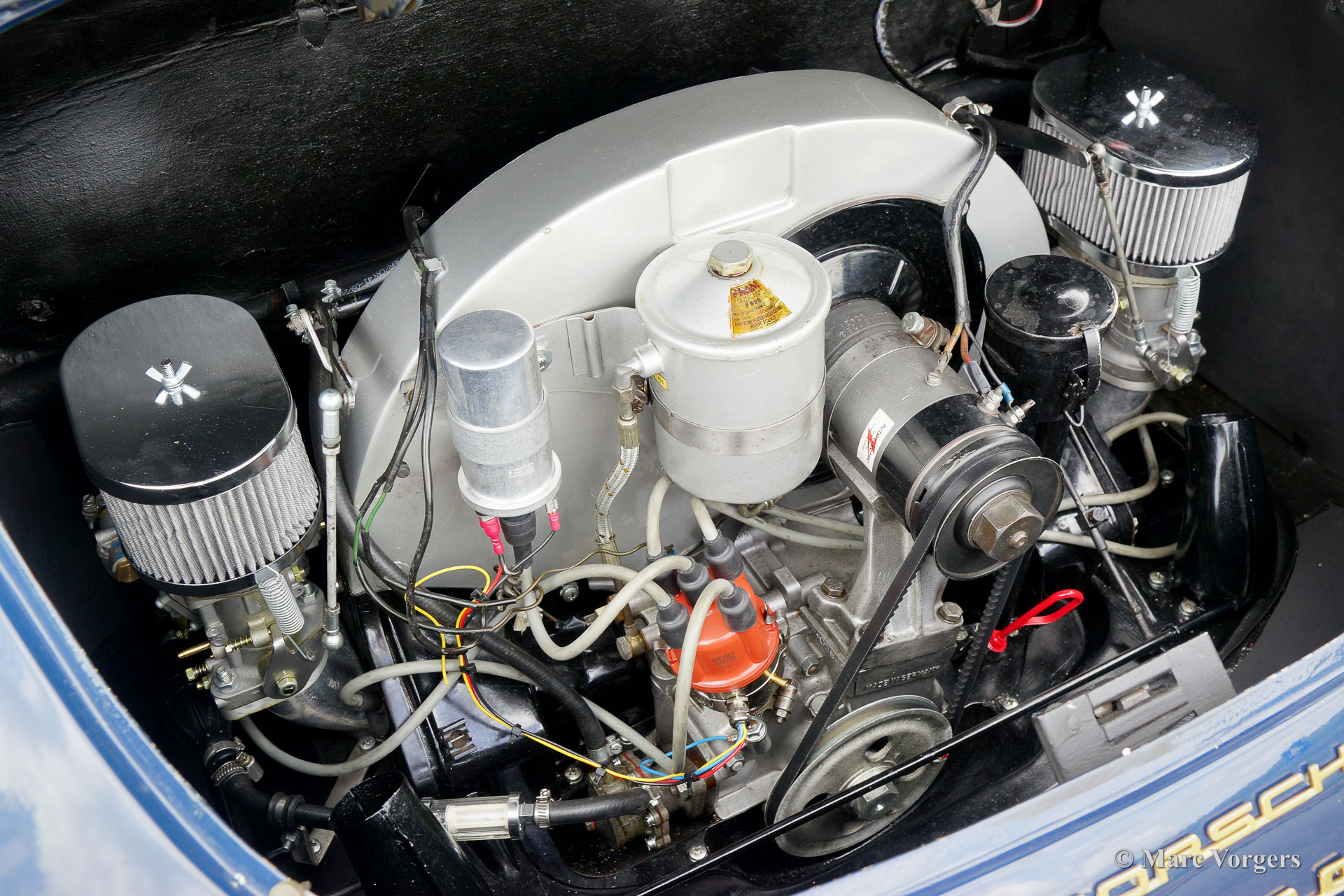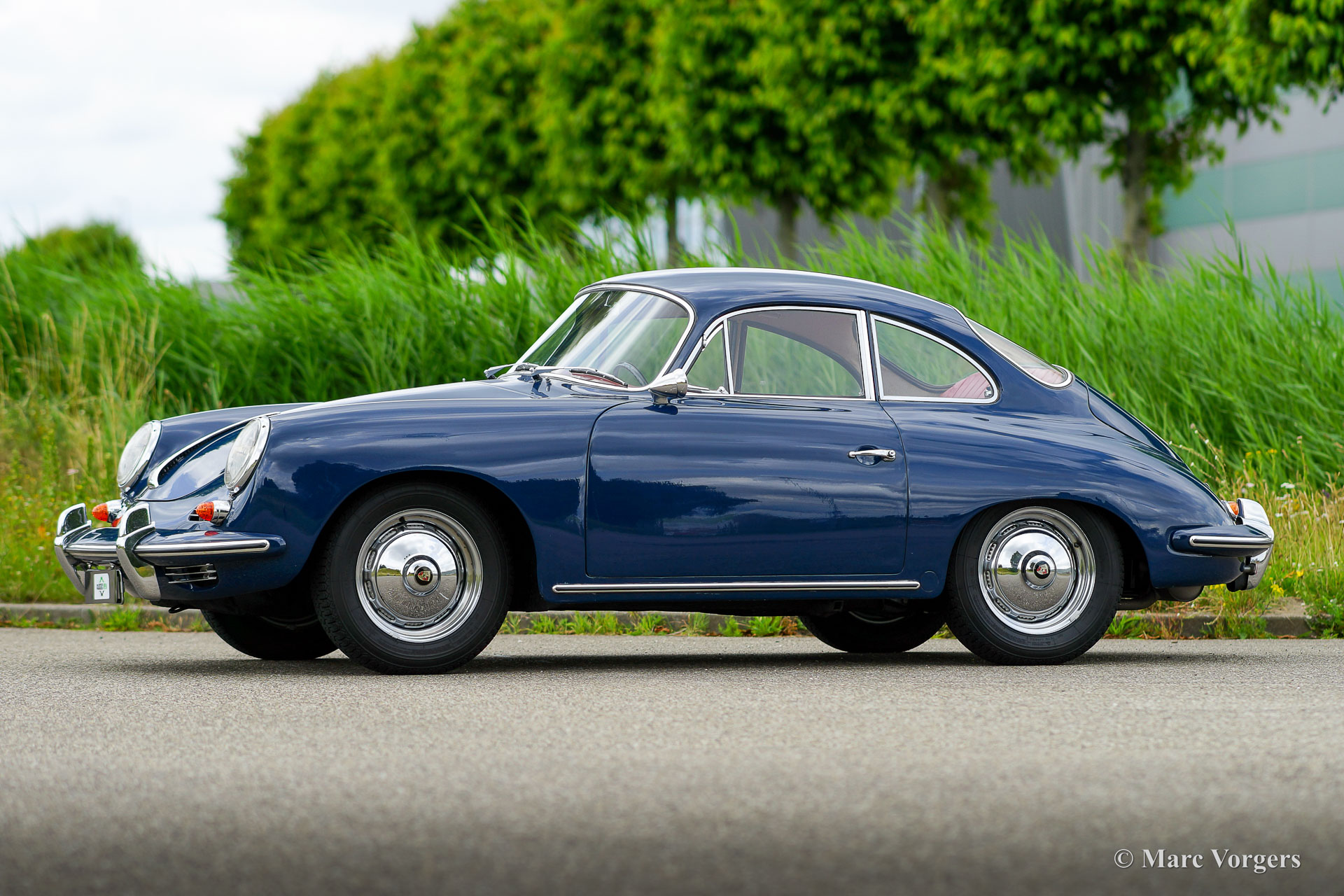 Porsche 356 1600 Super (B T6) coupé, jaar 1963. Kleur blauw gecombineerd met een roodlederen interieur en antracietkleurig tapijt. Deze schitterende Porsche 356 coupé presenteert zich met een prachtige kleurstelling en de auto toont alle originele details. Zittend op de bestuurdersstoel wordt u getrakteerd op de schoonheid van het originele stuur, het prachtige dashboard en de Blaupunkt Bremen autoradio. Onder de voorklep vindt u het reservewiel, de originele krik en een onderhoudsvriendelijke Optima accu. In de netjes gedetailleerde motorruimte is de luchtgekoelde viercilinder boxermotor in vol ornaat te bewonderen. Deze prachtige Porsche 356 1600 Super coupé verkeert in een zeer goede tot excellente conditie en de automobiel rijdt voortreffelijk. Bij 57.000 kilometer op de teller is de motor gereviseerd, nu staat er 59.000 km op de teller. Recent uitgevoerde service en updates: nieuwe versnellingsbaklagers gemonteerd, nieuwe benzinetank en E10 bestendige slangen gemonteerd, verbeterde geluidsisolatie gemonteerd, werking kachelbediening verbeterd, nieuwe Weber carburateurs gemonteerd, elektronische ontsteking gemonteerd, remmen gereviseerd (hoofdcilinder en hulpcilinders aan de wielen), wiellagers vernieuwd, nieuwe uitlaat gemonteerd en Koni schokbrekers gemonteerd. De carburateurs en de ontsteking zijn afgesteld op een rollenbank. Deze prachtige Porsche 356 is volledig up-to-date en klaar om met volle teugen van te genieten door een trotse nieuwe eigenaar!
