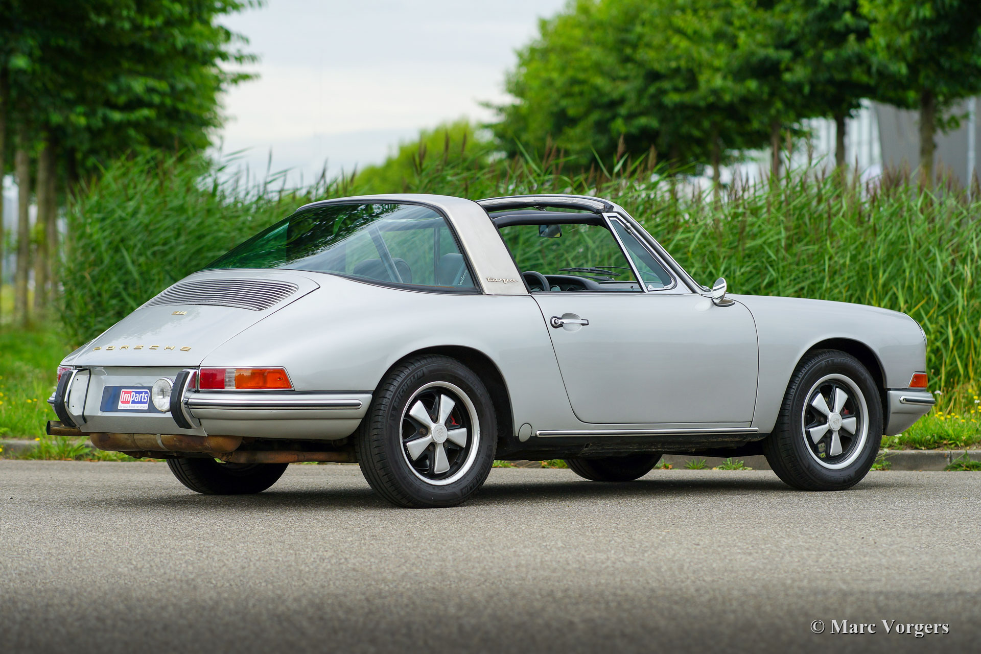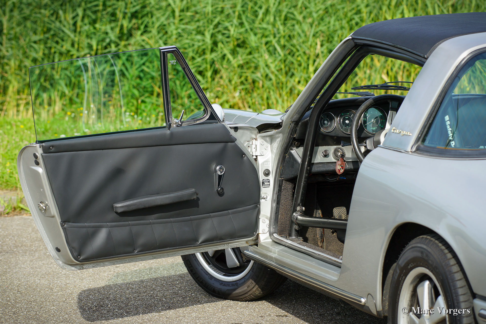 Porsche 911 2.0 Targa, jaar 1967. Kleur zilver metallic gecombineerd met een zwartleren interieur en donkergrijs tapijt. Deze Short Wheelbase (SWB) Porsche 911 is een ‘matching numbers’ auto (motor en versnellingsbak zijn fabriek origineel geleverd met chassis/ carrosserie), een Porsche Kardex is aanwezig om dit te bevestigen. Deze vroege Porsche 911 Targa komt uit de eerste serie Porsche 911 Targa auto's ooit gebouwd. De automobiel werd nieuw verkocht als ‘soft window Targa’ in de kleur Irish green. Deze vroege Targa-modellen zijn buitengewoon zeldzaam. De auto is 22 jaar geleden vanuit de USA naar Nederland geïmporteerd. In de loop van de tijd is de auto opnieuw gespoten en is er een nieuwe kabelboom gemonteerd. Deze Porsche 911 Targa verkeert in zeer goede conditie met lichte gebruikssporen. De auto is zeer goed onderhouden en de 2 liter zescilinder boxermotor loopt en klinkt perfect! De versnellingsbak is een ‘dog-leg’ -type met de eerste versnelling linksonder. Onlangs is er een nieuwe koppeling gemonteerd. De auto is voorzien van originele Fuchs-wielen, extra verstralers op de motorkap, lederen kuipstoelen, een Blaupunkt AM-radio en een rolkooi. Dit is een zeldzame vroege Porsche 911 Targa in zeer fraaie en goede conditie!