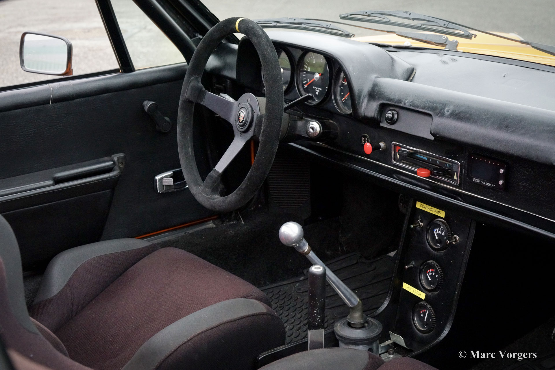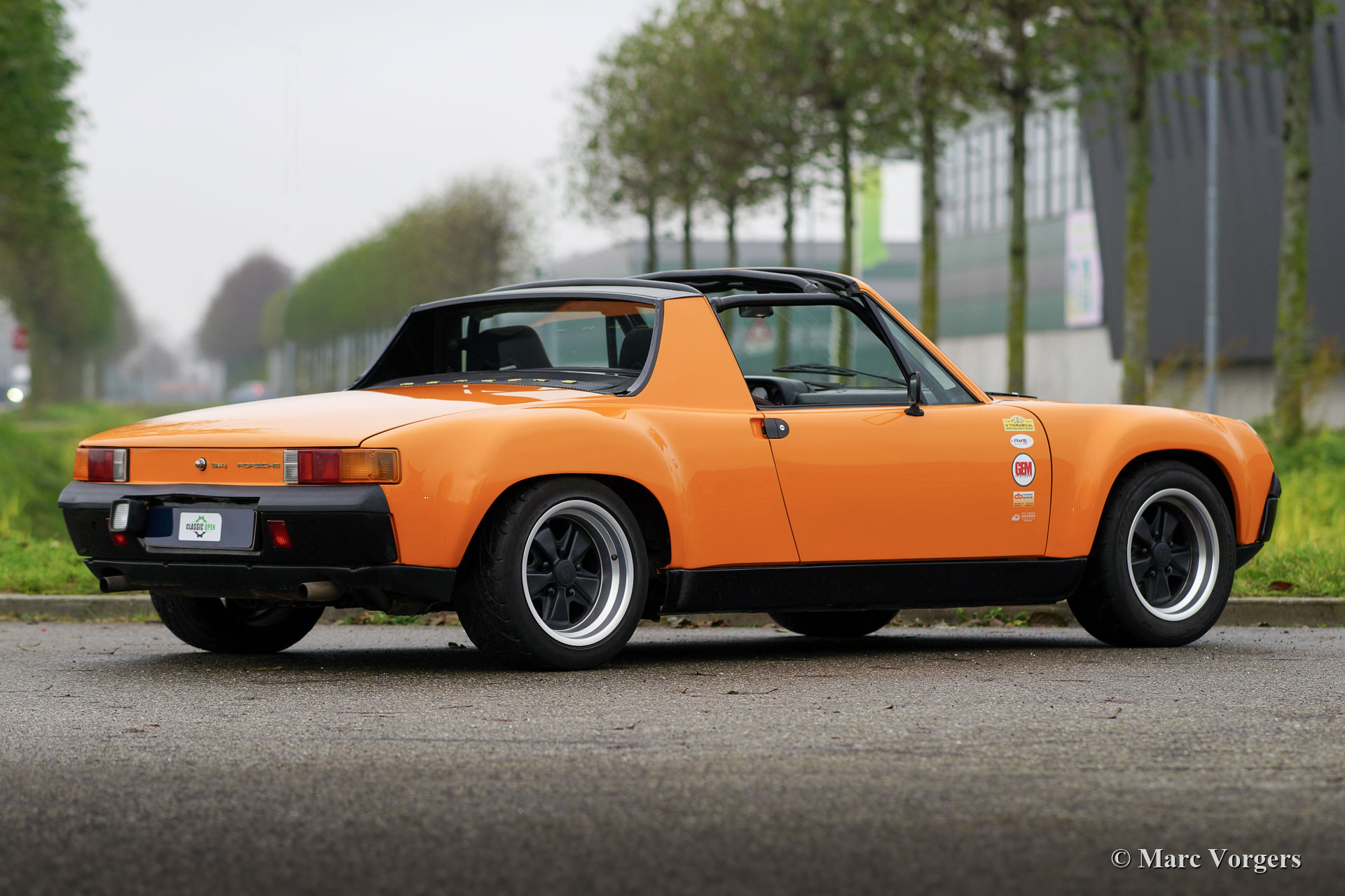 Porsche 914 2.0 ‘Wide Body‘, jaar 1972. Kleur Signal Orange gecombineerd met een zwart stoffen interieur. De carrosserie van deze fantastische Porsche 914 2.0 is in het verleden aangepast naar ‘Wide Body’ specificaties. De verbrede spatborden zijn vervaardigd van van metaalplaat. Deze Porsche 914 ziet er extreem sportief en doelgericht uit met zijn lage ‘stance’ en prachtige brede Fuchs-stijl wielen, geschoeid met 225/50-15 banden voor en 245/40-15 banden achter. De looks zijn niet alleen show, de 2 liter 135 pk sterke viercilinder boxermotor werd getuned en voorzien van een elektrisch benzine-injectiesysteem. Om het extra vermogen aan te kunnen, werd de auto uitgerust met een 'dog-leg' 5-versnellingsbak, een sperdifferentieel, Willwood geventileerde schijfremmen en een hydraulische handrem. Het interieur werd opgewaardeerd met een rolkooi, Cobra sportkuipstoelen, 4-punts veiligheidsgordels, een Sparco sportstuur, een startknop en extra dashboardmeters. De auto heeft een ‘Targa’-dak waarvan het dakpaneel kan worden verwijderd en in de achterbak kan worden opgeborgen. Dit is een zeer sportieve en begeerlijke Porsche 914 'Wide Body' in goede conditie. Een fantastische rijdersauto en een ideale sportwagen om mee te doen aan historische rally-evenementen! De auto is momenteel geregistreerd in België.