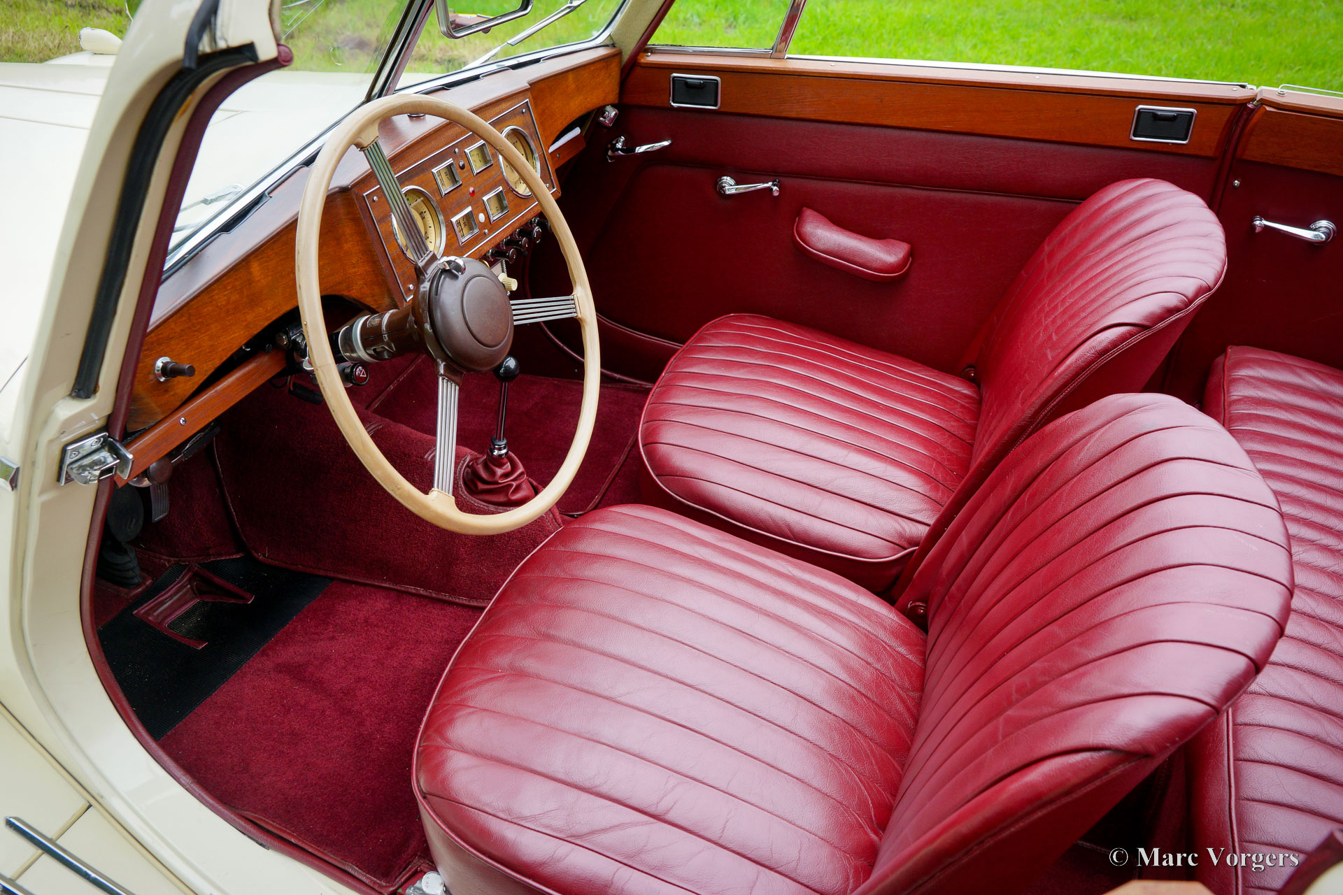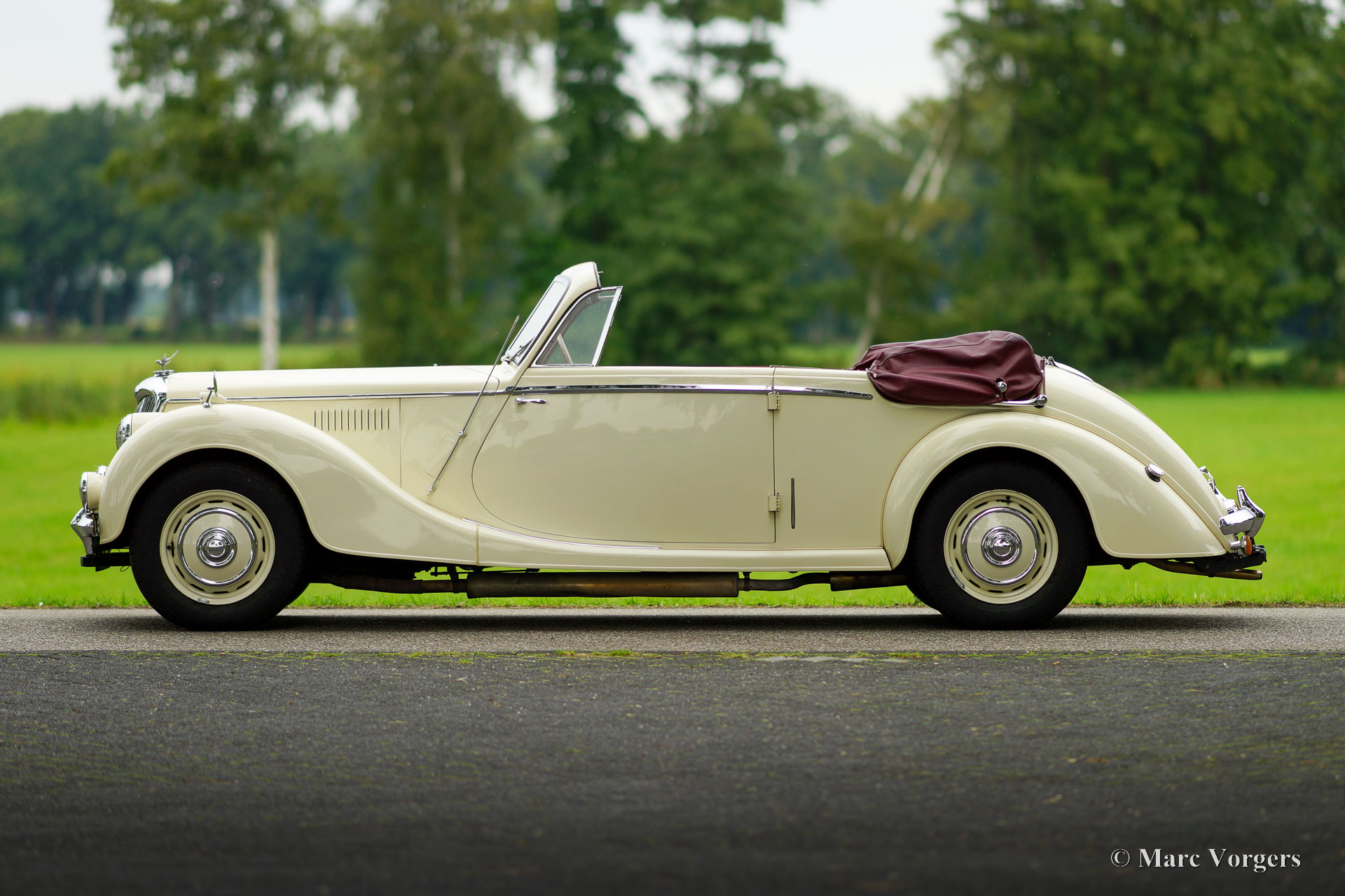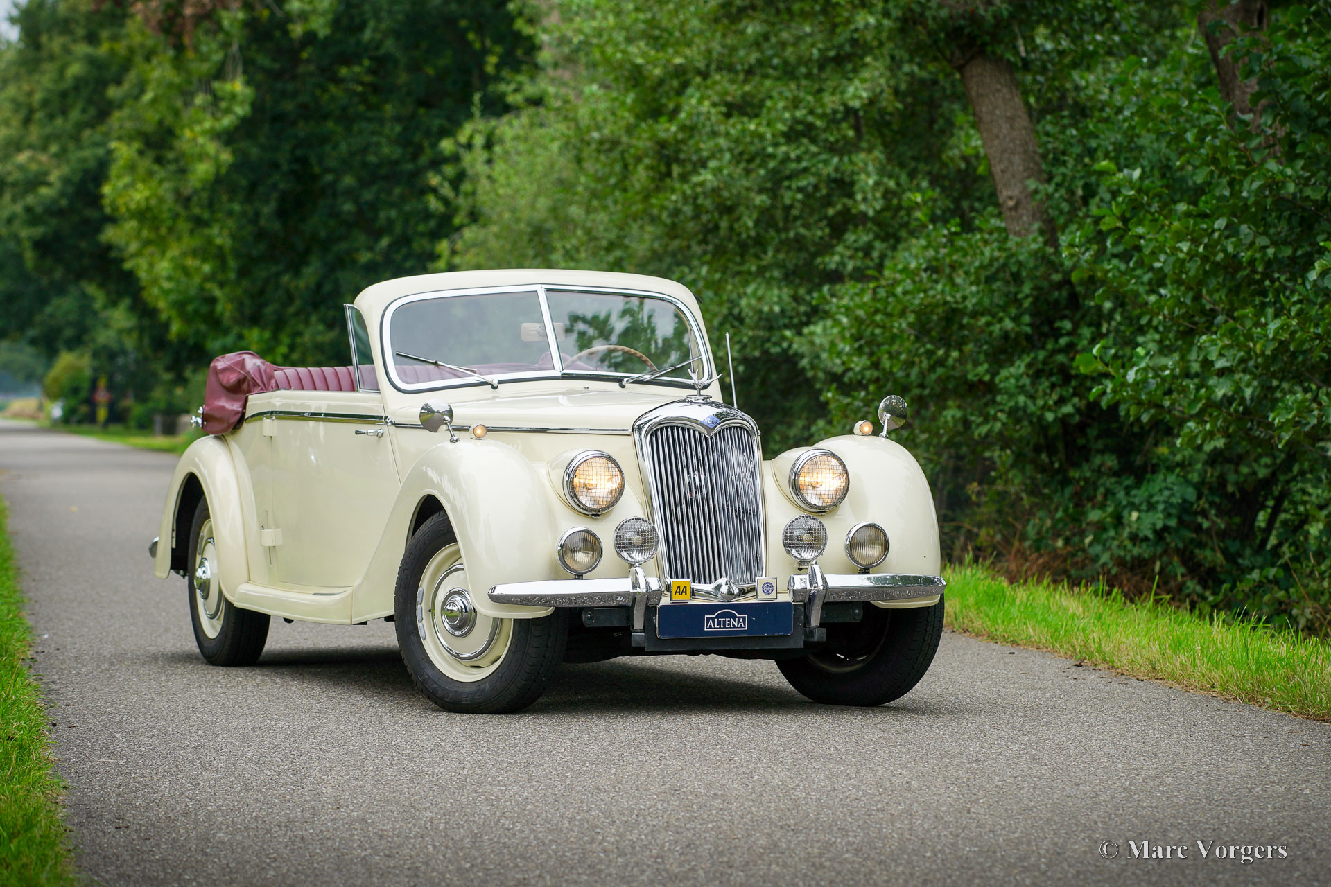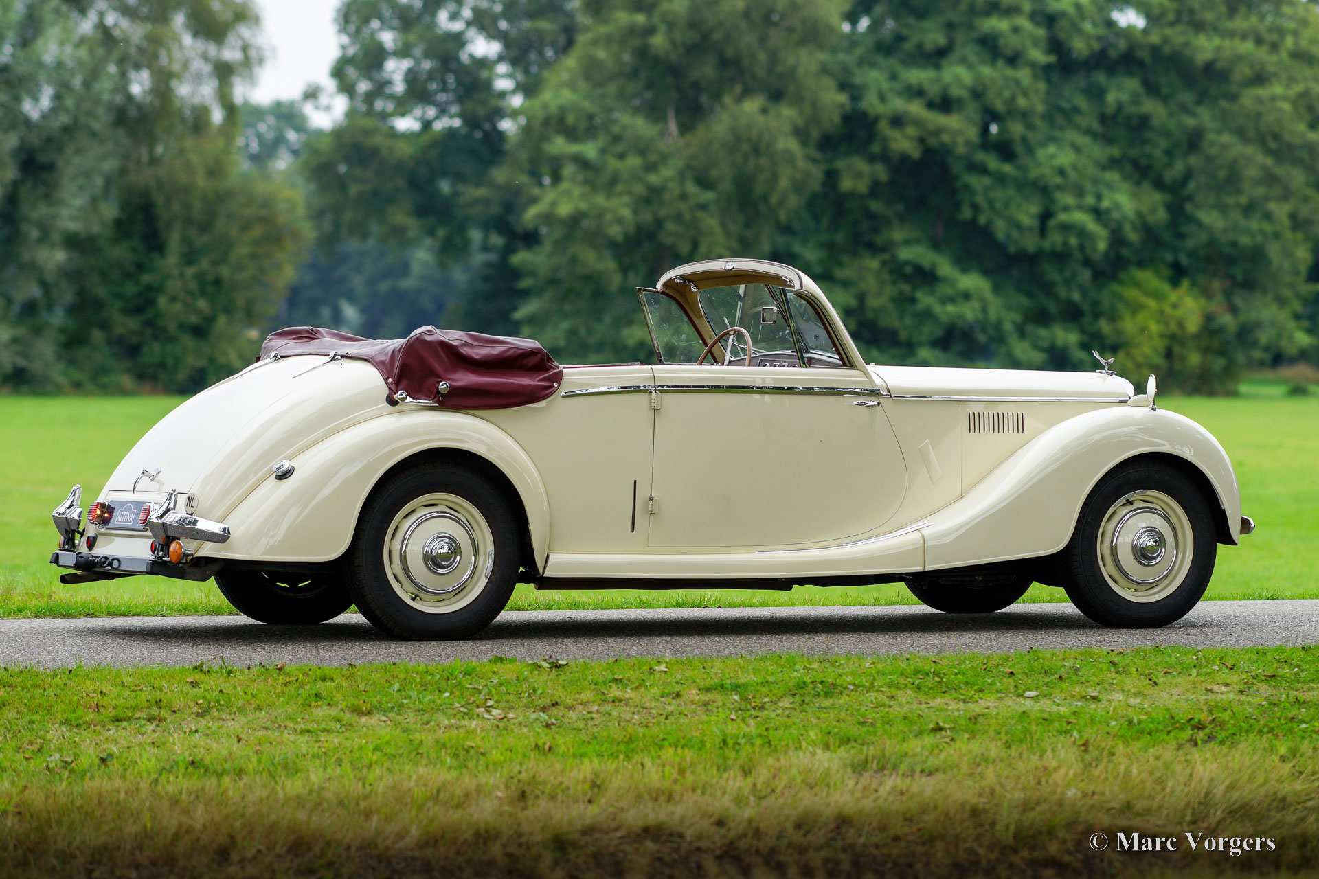 Riley RMD Cabriolet, jaar 1950. Kleur crème wit gecombineerd met een donkerrood lederen interieur en rood tapijt. Donkerrode vinyl kap met lichtbruine hemelbekleding en een donkerrode vinyl kapafdekking. Deze fantastische linksgestuurde Riley RMD cabriolet werd in 1994 in Nederland geïmporteerd. Sinds 2016 maakt de auto deel uit van een oldtimercollectie. Aan de auto is door de jaren heen veel aandacht en zorg gegeven, de auto verkeert in een zeer goede tot excellente conditie! De eigenaar heeft regelmatig met de auto gereden, deze Riley RMD cabriolet rijdt, klinkt en voelt perfect aan. De auto toont alle originele details en is voorzien van een originele autoradio uit de jaren 50. Dit is een zeer begeerlijke Britse cabriolet die voldoende ruimte biedt voor vier personen. Een fantastisch exemplaar voor de liefhebber en verzamelaar.