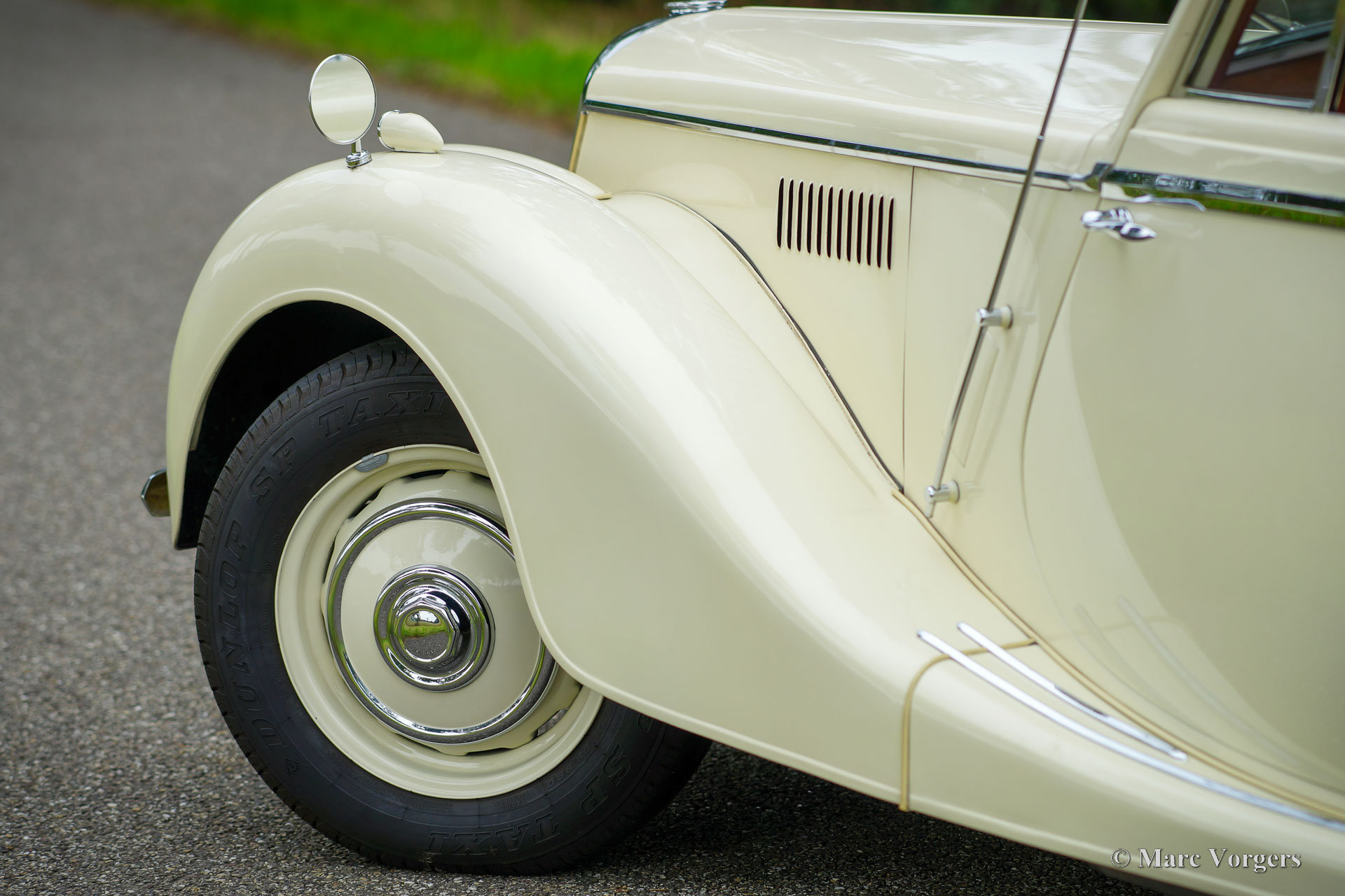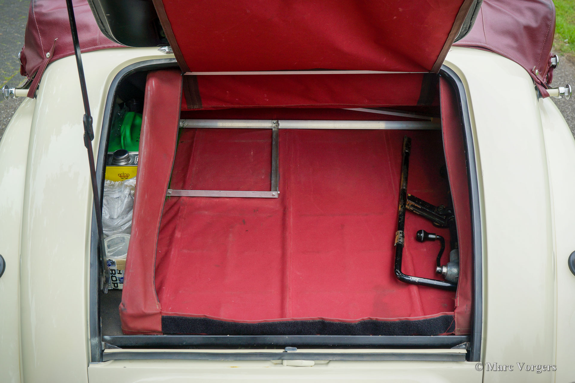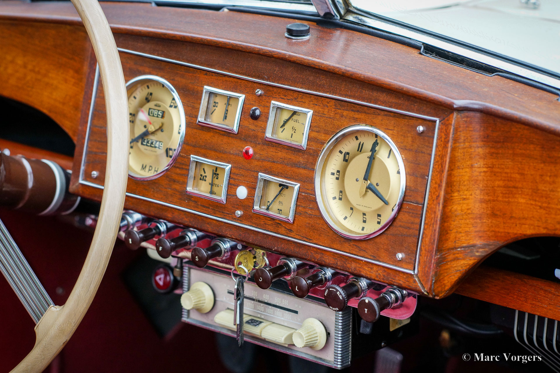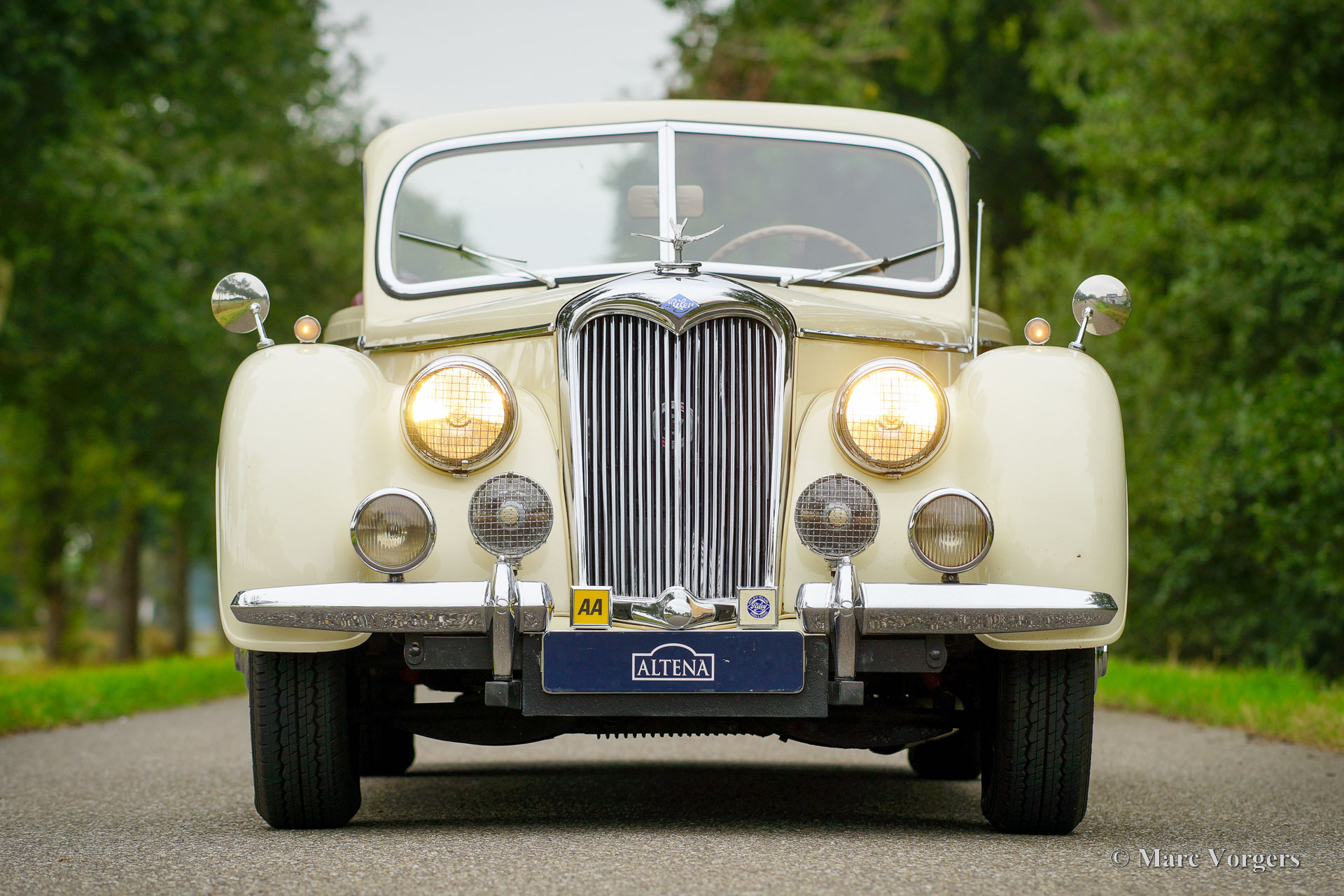 Riley RMD Cabriolet, jaar 1950. Kleur crème wit gecombineerd met een donkerrood lederen interieur en rood tapijt. Donkerrode vinyl kap met lichtbruine hemelbekleding en een donkerrode vinyl kapafdekking. Deze fantastische linksgestuurde Riley RMD cabriolet werd in 1994 in Nederland geïmporteerd. Sinds 2016 maakt de auto deel uit van een oldtimercollectie. Aan de auto is door de jaren heen veel aandacht en zorg gegeven, de auto verkeert in een zeer goede tot excellente conditie! De eigenaar heeft regelmatig met de auto gereden, deze Riley RMD cabriolet rijdt, klinkt en voelt perfect aan. De auto toont alle originele details en is voorzien van een originele autoradio uit de jaren 50. Dit is een zeer begeerlijke Britse cabriolet die voldoende ruimte biedt voor vier personen. Een fantastisch exemplaar voor de liefhebber en verzamelaar.