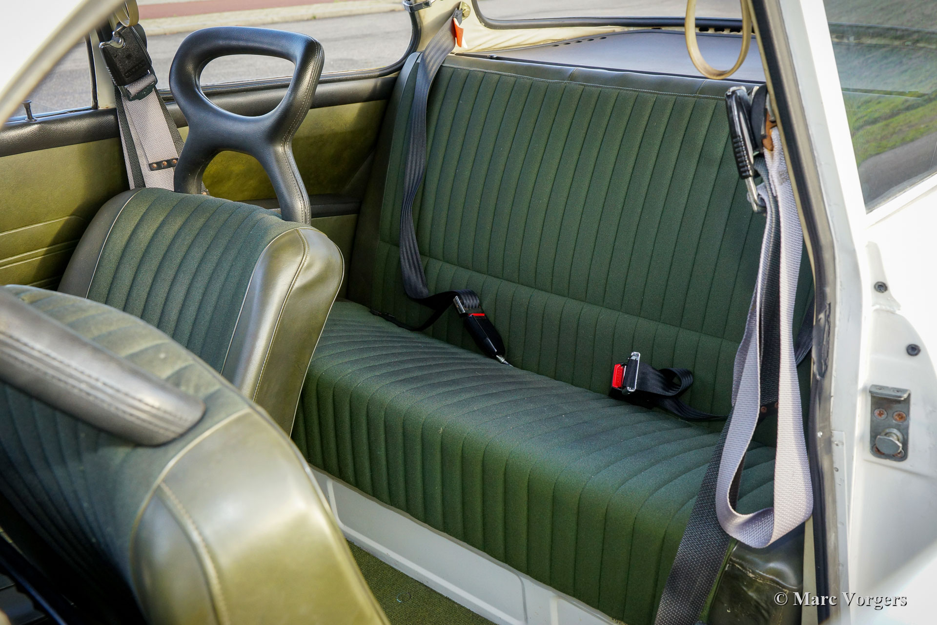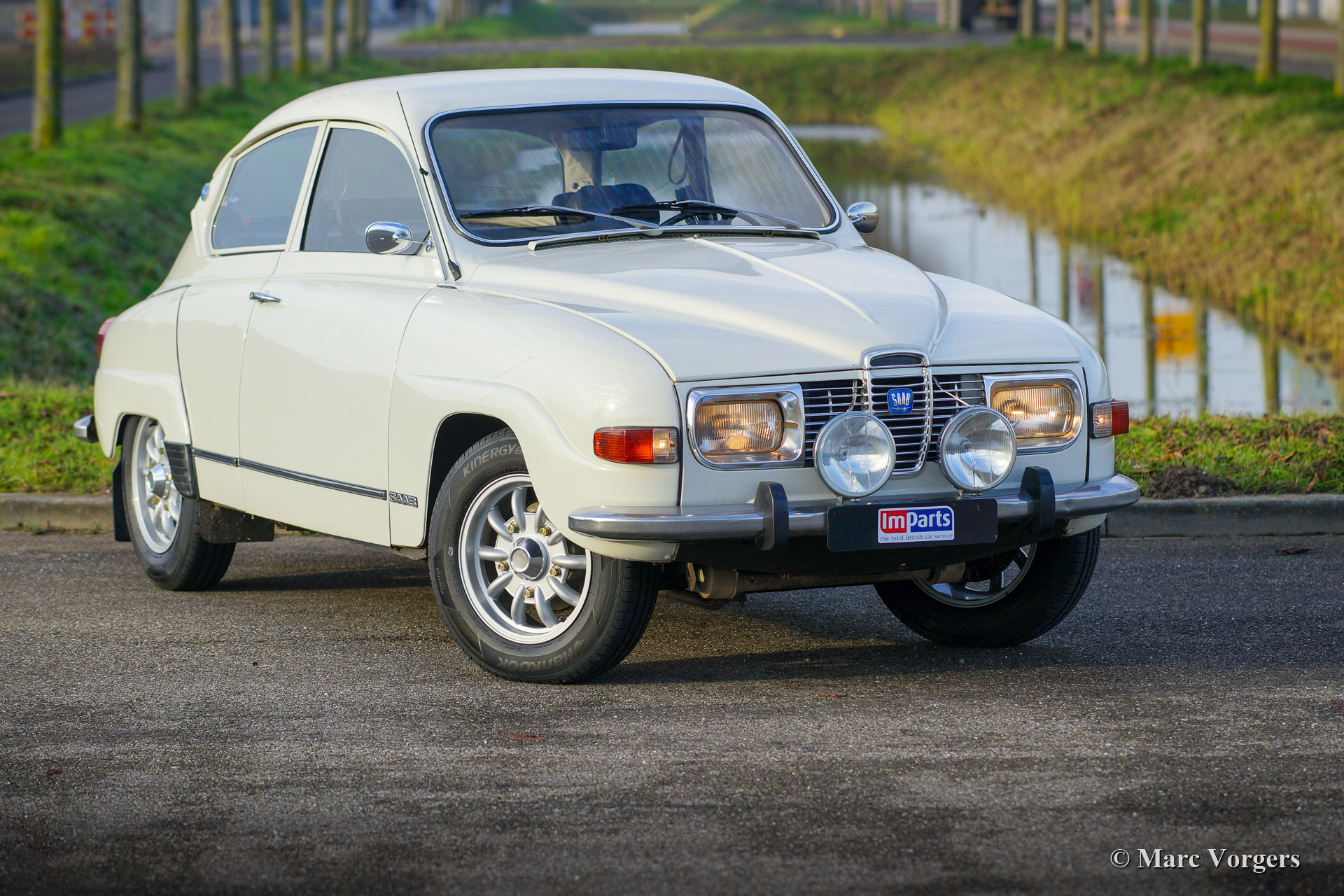 Saab 96 V4, jaar 1972. Kleur wit gecombineerd met een groen kunstlederen/ stoffen interieur en groen tapijt. Deze prachtige Saab 96 werd nieuw verkocht in Nederland. De auto verkeert in zeer goede en zeer originele conditie en de auto rijdt perfect. De 1500 cc V4-motor levert een gezonde 65 pk en de versnellingsbak met 4 versnellingen met kolomschakeling werkt uitstekend. De auto heeft de afgelopen jaren fraai nieuw lakwerk gekregen, het interieur is origineel en in mooie staat met slechts een gaatje in de bekleding van de bestuurdersstoel. De auto is voorzien van een set fantastische en zeldzame Bosch verstralers, een toerenteller en prachtige nieuwe Compomotive lichtmetalen velgen! De auto wordt geleverd met een nieuwe APK. Dit is een begeerlijke en zeer originele Saab V4 voor de Saab-liefhebber!