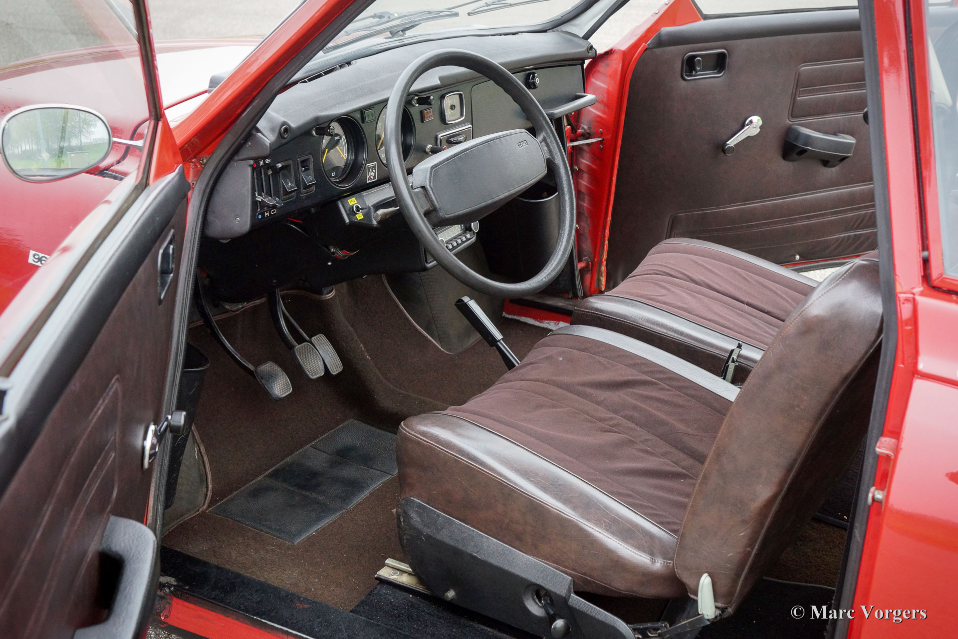Saab 96L V4, jaar 1976. Kleur rood met een bruin stof/vinyl interieur en bruin tapijt. Deze eigenzinnige en fraaie Saab 96 V4 verkeert in zeer goede en super originele conditie met lichte gebruikssporen! De carrosserie is keihard en strak en het originele interieur is helemaal gaaf. De chroom bumpers zijn van een ouder type. De Saab 96 V4 wordt aangedreven door de robuuste 1500 cc. Ford V4 motor die via een vierversnellingsbak de voorwielen aandrijft. Het schakelen gaat via een pook aan de stuurkolom. Deze Saab V4 rijdt uitstekend en verrassend comfortabel. De auto is uitgerust met rembekrachtiging. Deze bijzondere Saab 96 wordt afgeleverd met een servicebeurt en een nieuwe APK.