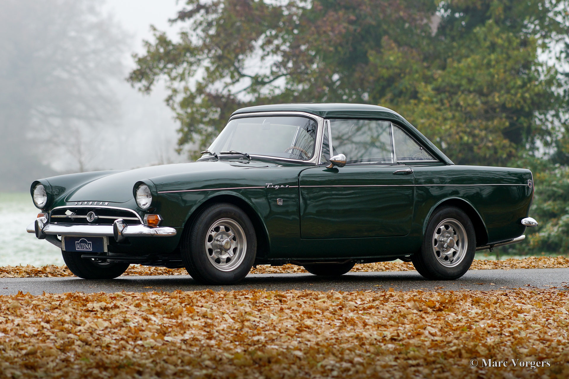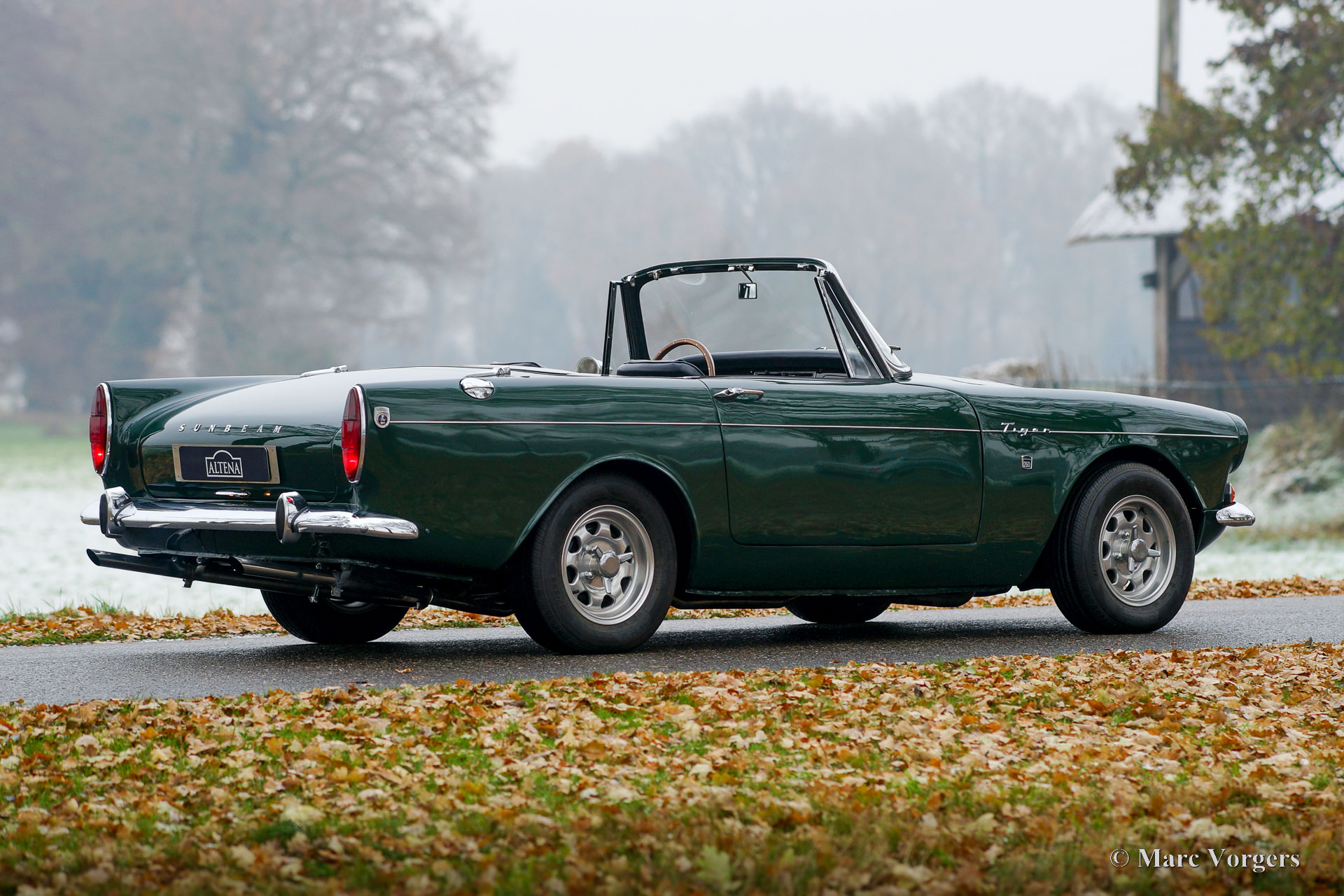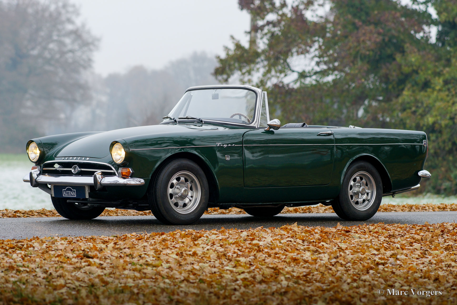 Sunbeam Tiger MK I, jaar 1965. Kleur donkergroen (British Racing Green) gecombineerd met een zwart kunstleren interieur en zwart tapijt. Deze zeldzame en begeerlijke Sunbeam Tiger is nieuw verkocht in Missouri, USA. De Sunbeam Tiger is gebaseerd op de viercilinder Sunbeam Alpine roadster. In 1962 suggereerde F1-coureur Jack Brabham dat een V8-motor moest worden uitgeprobeerd. De ontwikkeling is mede gedaan door Carroll Shelby die een gelijkaardige ombouw uitvoerde op de AC ACE resulterend in de legendarische AC Cobra. De Sunbeam Tiger is een minder “hardcore” sportwagen en een veel praktischere klassieker met een fraaie ‘soft-top’ die mooi weggewerkt is en een ruime kofferbak. Er zijn slechts 7083 exemplaren van de Sunbeam Tiger gebouwd.
