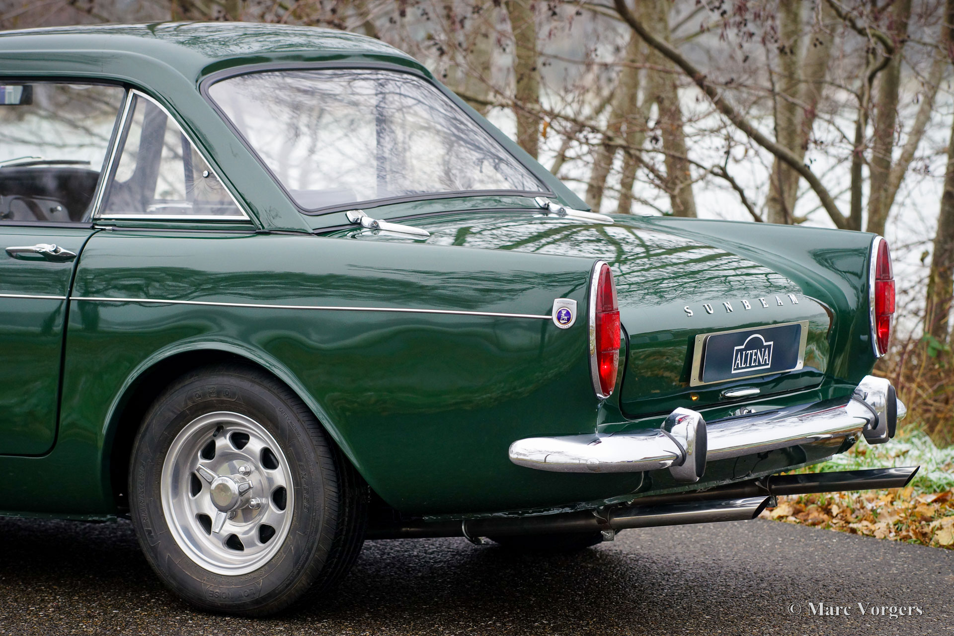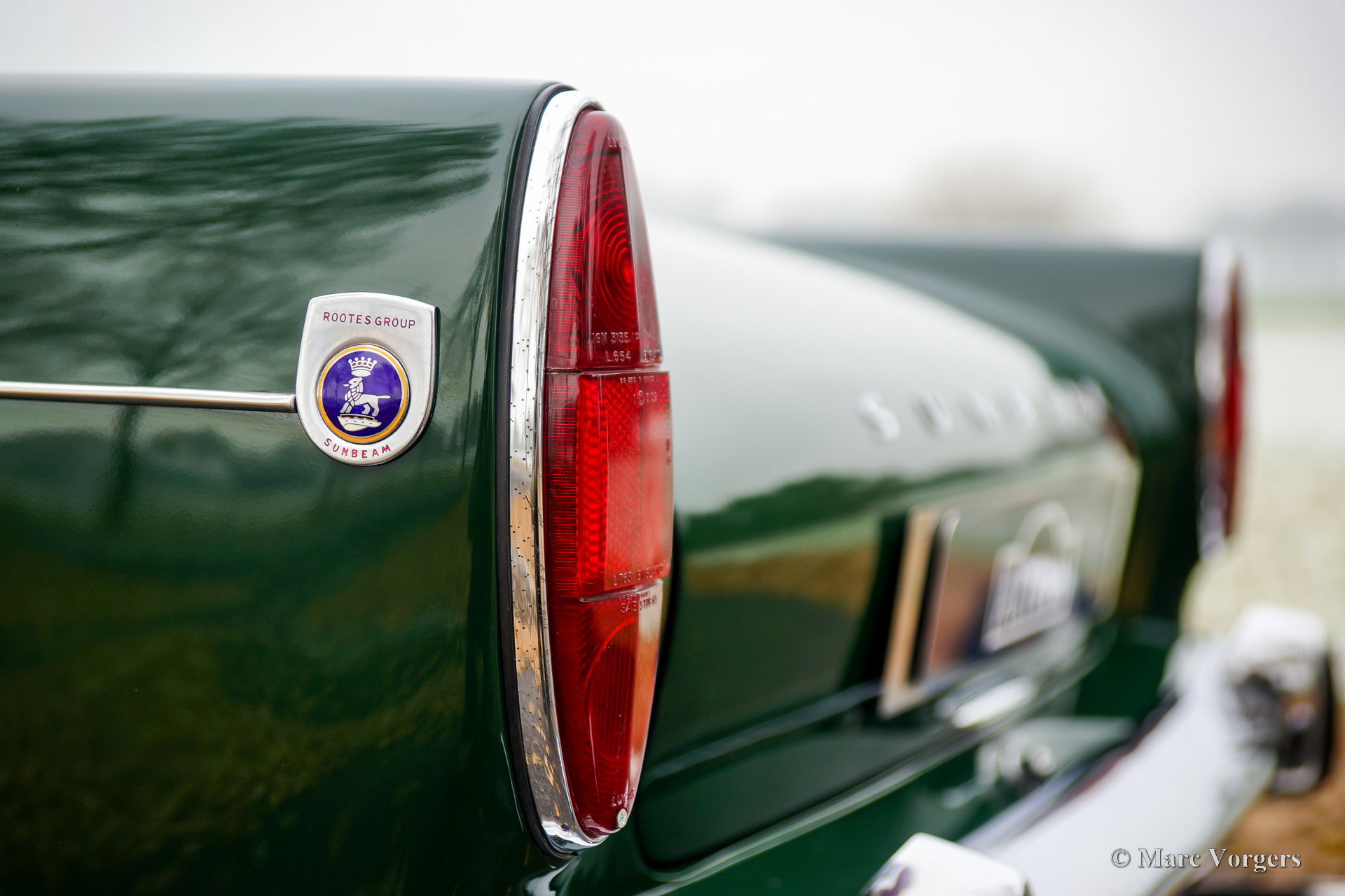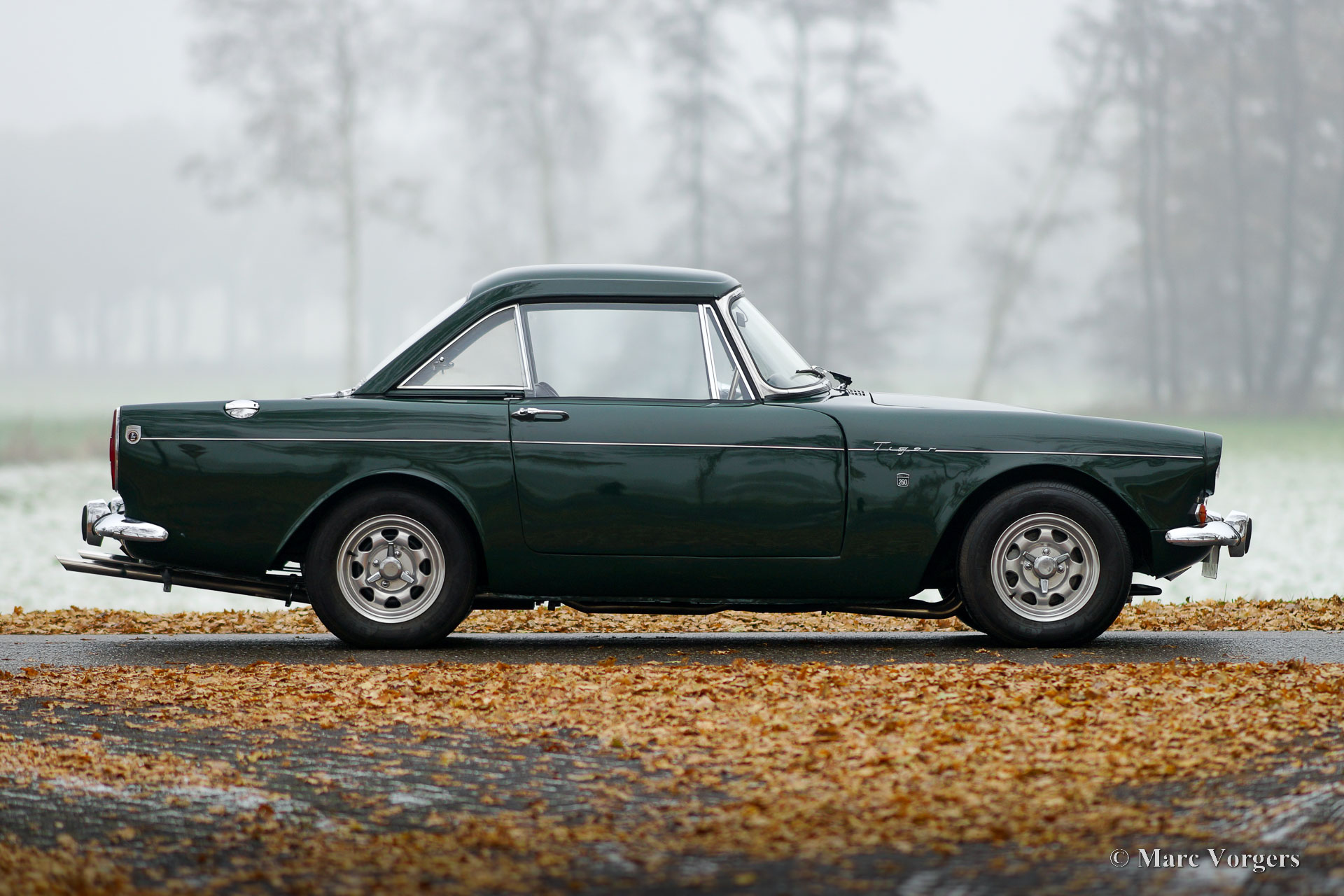 Sunbeam Tiger MK I, jaar 1965. Kleur donkergroen (British Racing Green) gecombineerd met een zwart kunstleren interieur en zwart tapijt. Deze zeldzame en begeerlijke Sunbeam Tiger is nieuw verkocht in Missouri, USA. De Sunbeam Tiger is gebaseerd op de viercilinder Sunbeam Alpine roadster. In 1962 suggereerde F1-coureur Jack Brabham dat een V8-motor moest worden uitgeprobeerd. De ontwikkeling is mede gedaan door Carroll Shelby die een gelijkaardige ombouw uitvoerde op de AC ACE resulterend in de legendarische AC Cobra. De Sunbeam Tiger is een minder “hardcore” sportwagen en een veel praktischere klassieker met een fraaie ‘soft-top’ die mooi weggewerkt is en een ruime kofferbak. Er zijn slechts 7083 exemplaren van de Sunbeam Tiger gebouwd.