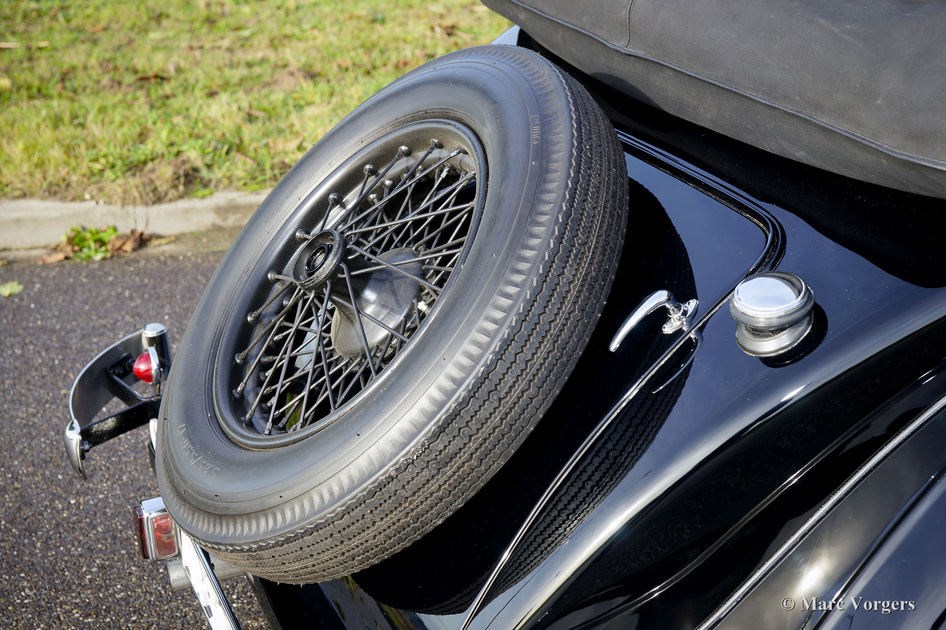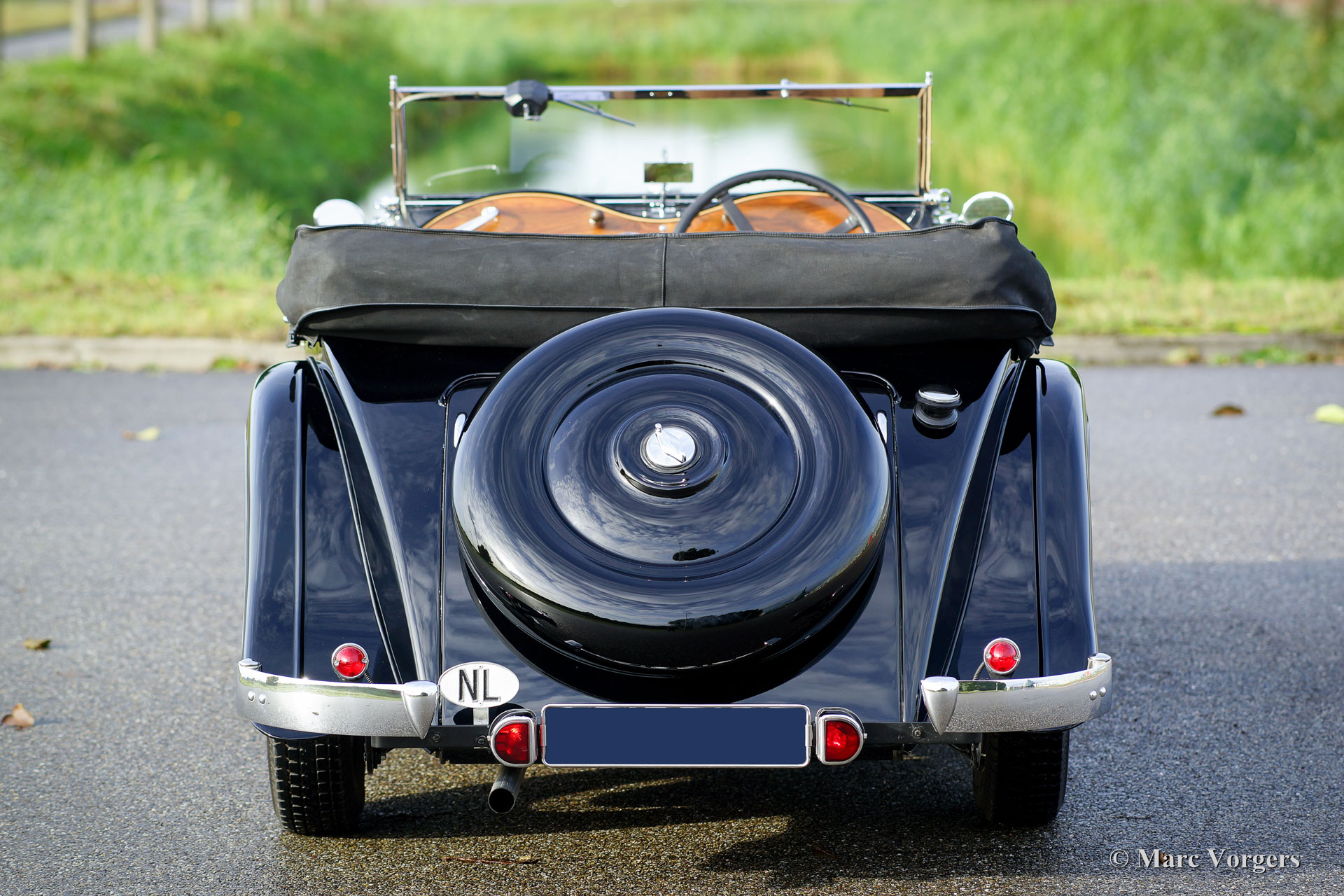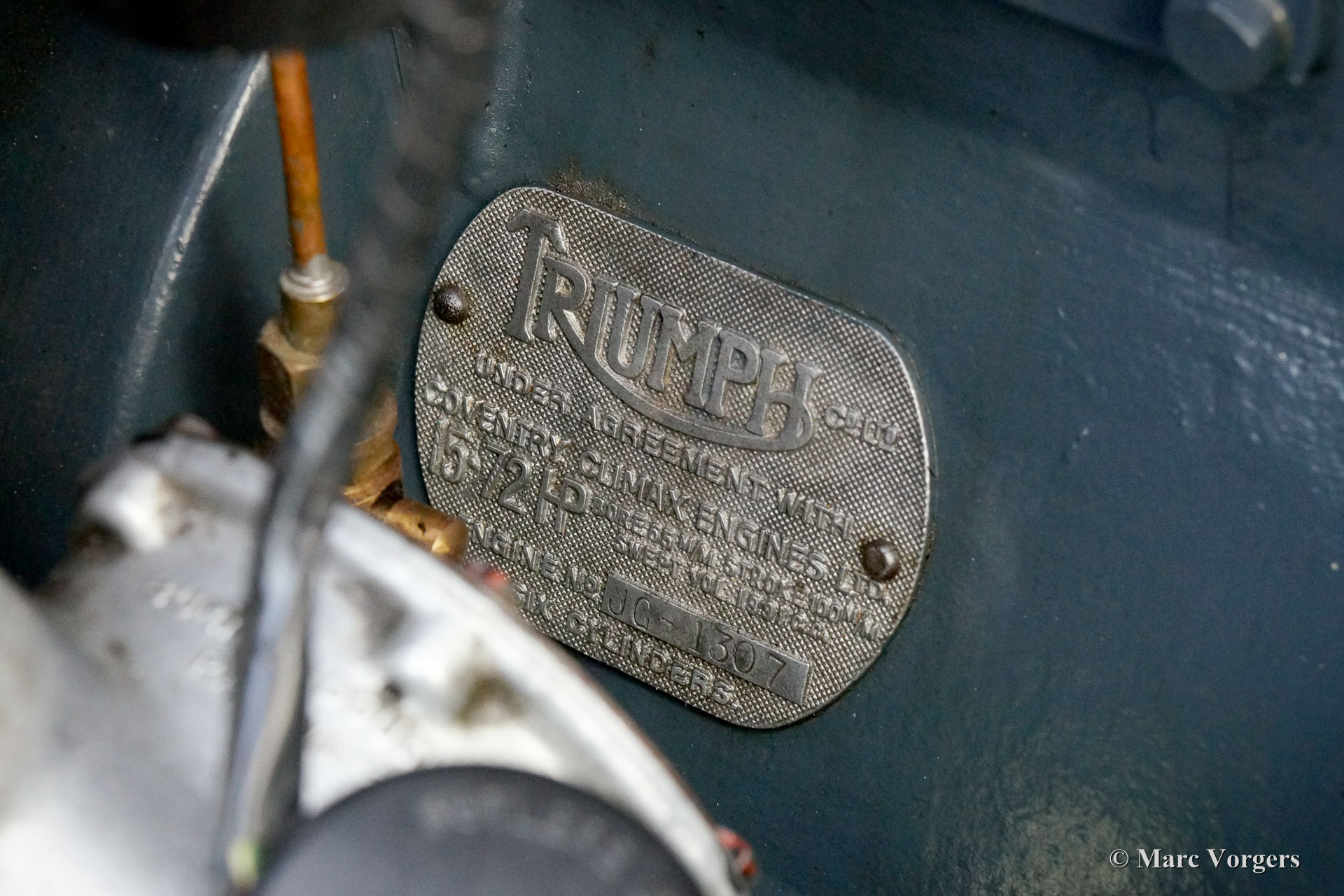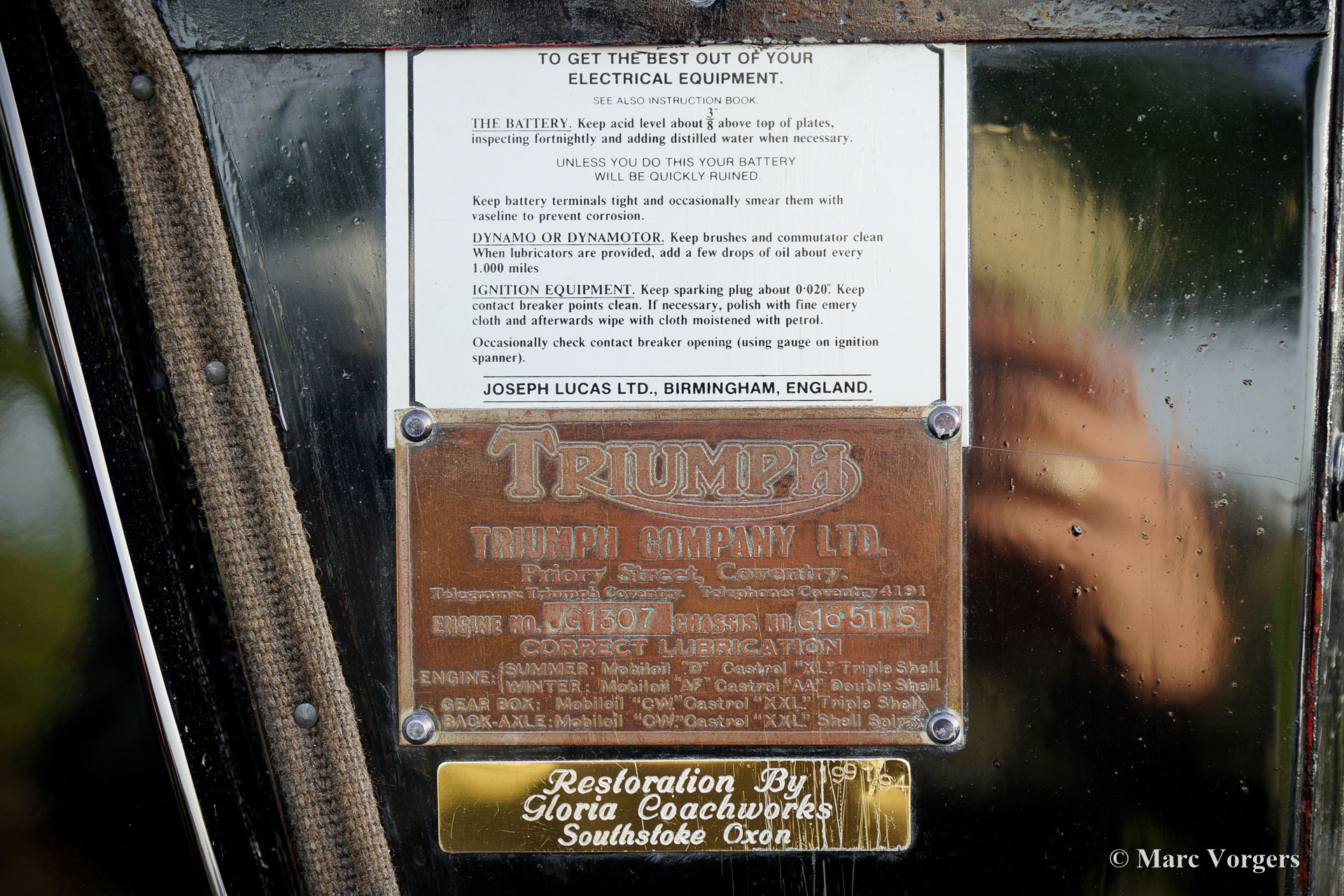 Triumph Gloria SIX Vitesse tourer, jaar 1935. Kleur zwart met een beige lederen interieur en beige tapijt. Zwarte canvas kap en ‘side screens’. Deze zeldzame en zeer fraaie Triumph Gloria SIX Vitesse tourer uit 1935 werd in de periode 1990 - 1994 uitvoerig en zeer fraai gerestaureerd door specialist Gloria coachworks in Engeland. Sinds het jaar 2013 is de Triumph in Nederland. Recent zijn de motor en de versnellingsbak gereviseerd en werd de carrosserie geheel nieuw gespoten. Deze prachtige Triumph Gloria SIX verkeert in sublieme staat! De historie is bekend vanaf 1948, er is echter ook een Engels belastingschijfje aanwezig uit het jaar 1935. Op dit moment zijn er bij de Pre-1940 Triumph Motor Club England nog vijf auto’s van dit type bekend (Gloria SIX tourer met de 2 liter Coventry Climax zescilinder motor). Deze Triumph is een indrukwekkende verschijning met vele fraaie details. De zescilinder motor klinkt geweldig!