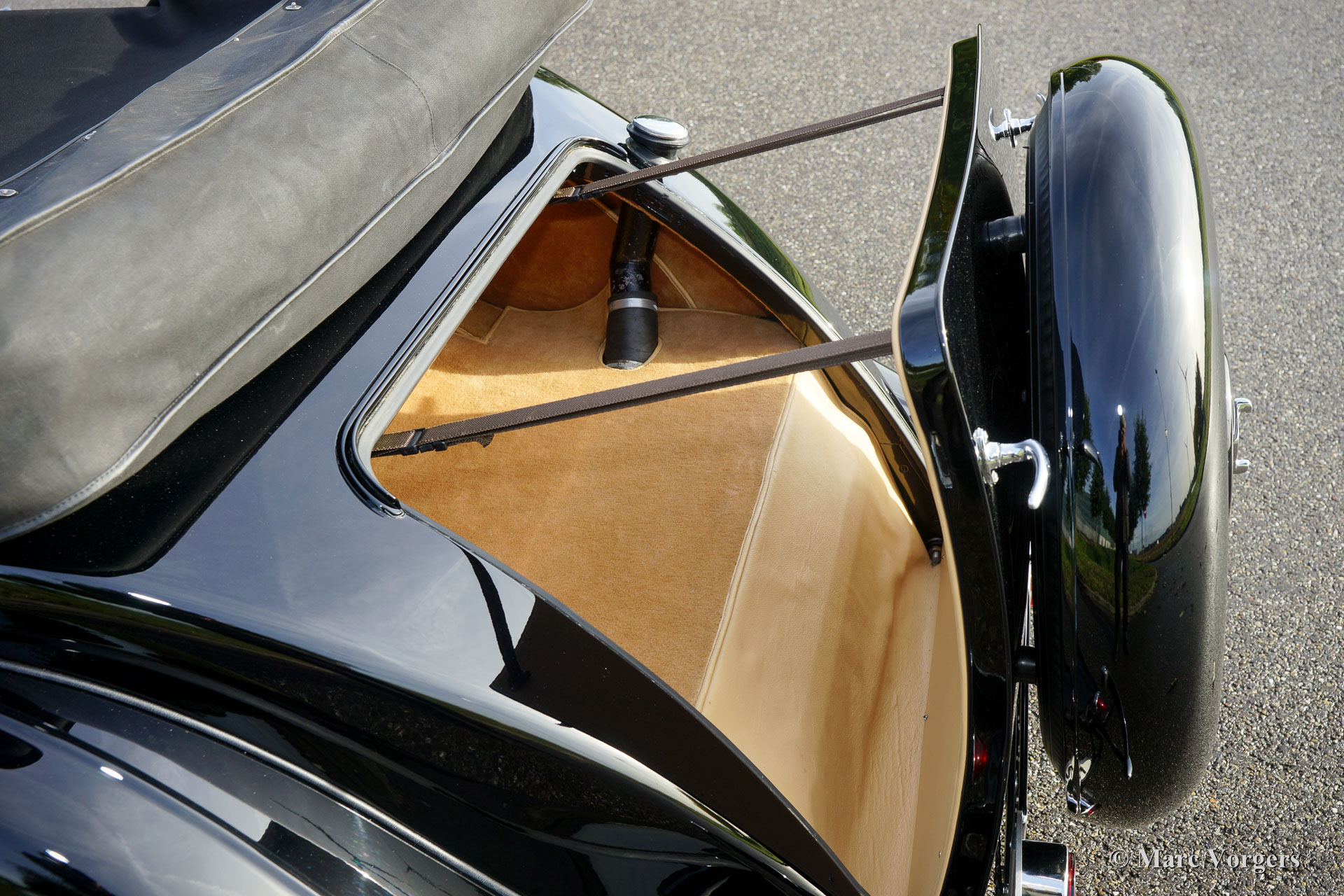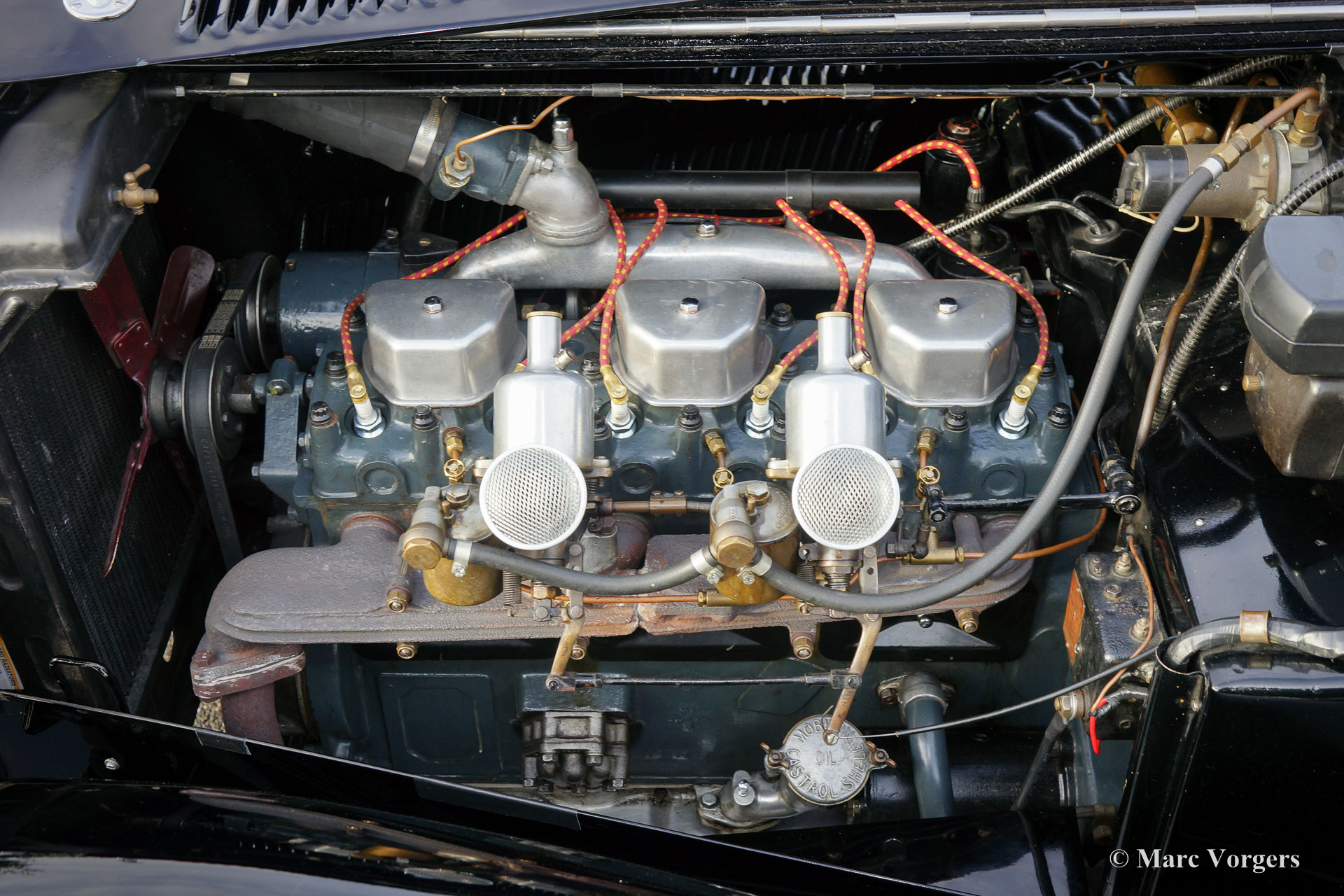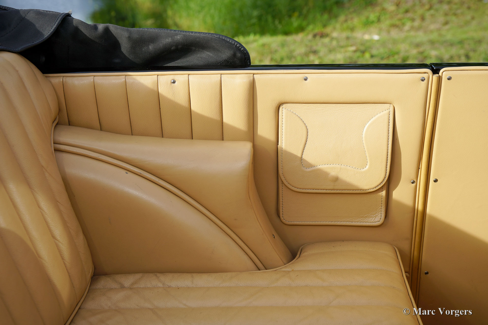 Triumph Gloria SIX Vitesse tourer, jaar 1935. Kleur zwart met een beige lederen interieur en beige tapijt. Zwarte canvas kap en ‘side screens’. Deze zeldzame en zeer fraaie Triumph Gloria SIX Vitesse tourer uit 1935 werd in de periode 1990 - 1994 uitvoerig en zeer fraai gerestaureerd door specialist Gloria coachworks in Engeland. Sinds het jaar 2013 is de Triumph in Nederland. Recent zijn de motor en de versnellingsbak gereviseerd en werd de carrosserie geheel nieuw gespoten. Deze prachtige Triumph Gloria SIX verkeert in sublieme staat! De historie is bekend vanaf 1948, er is echter ook een Engels belastingschijfje aanwezig uit het jaar 1935. Op dit moment zijn er bij de Pre-1940 Triumph Motor Club England nog vijf auto’s van dit type bekend (Gloria SIX tourer met de 2 liter Coventry Climax zescilinder motor). Deze Triumph is een indrukwekkende verschijning met vele fraaie details. De zescilinder motor klinkt geweldig!