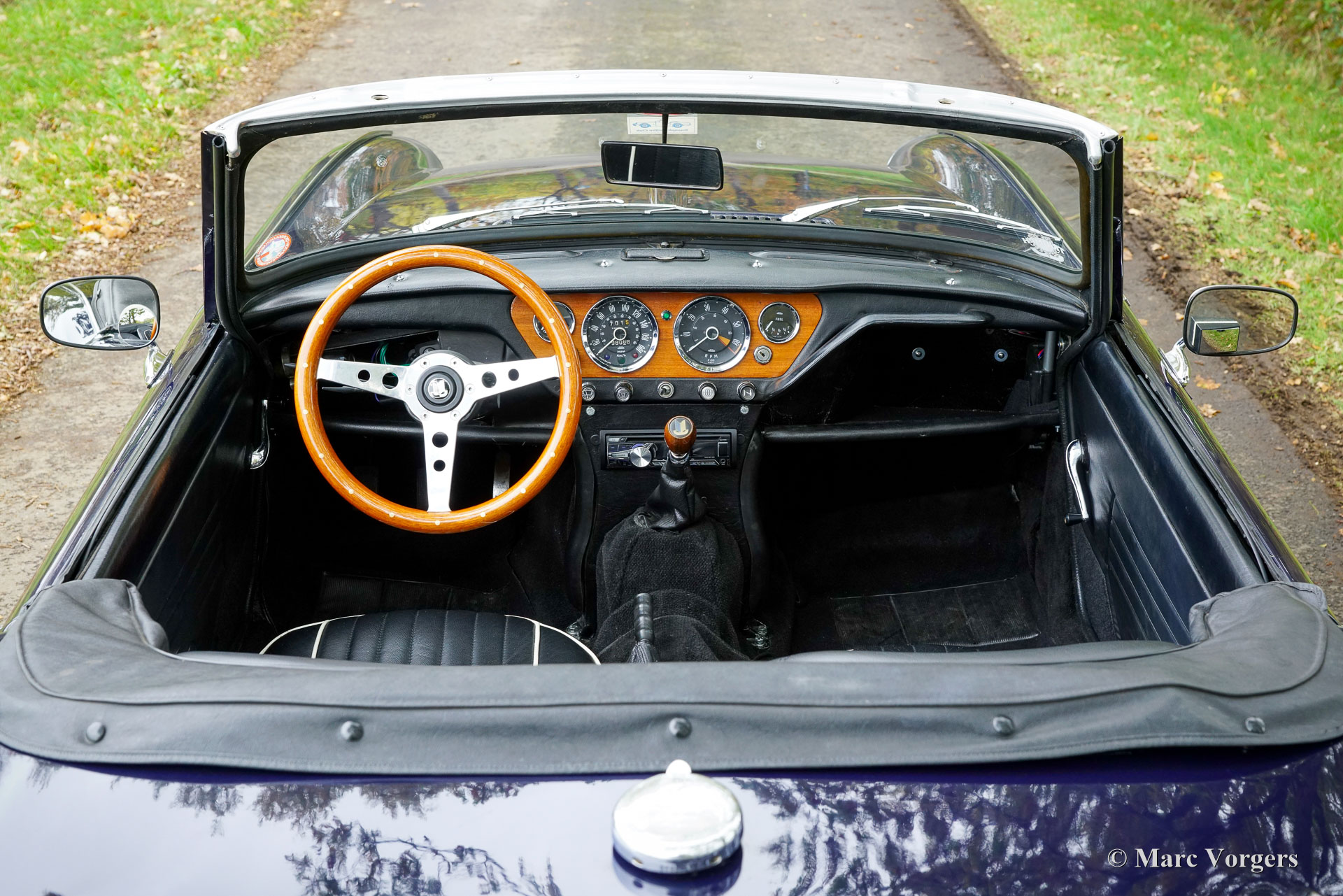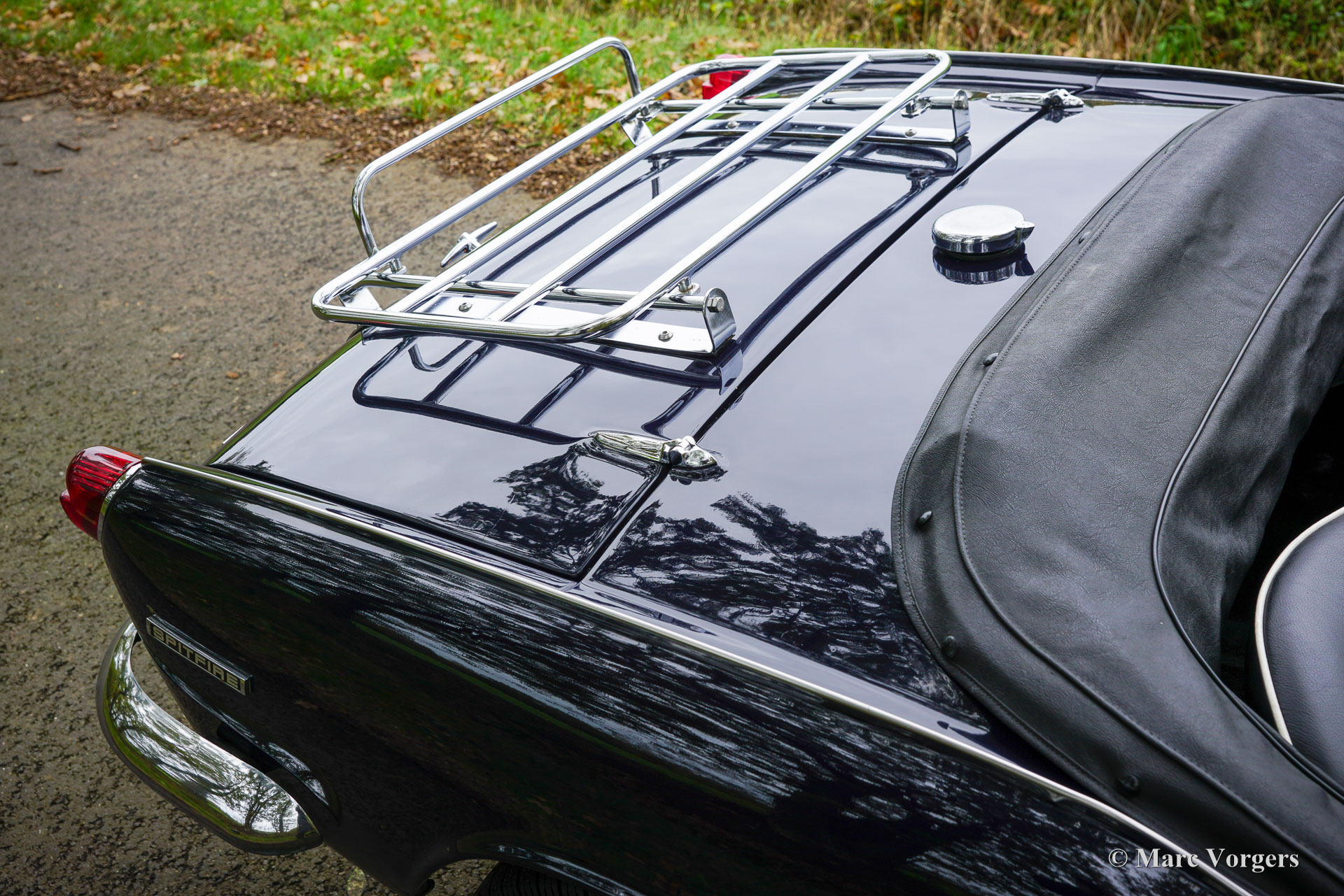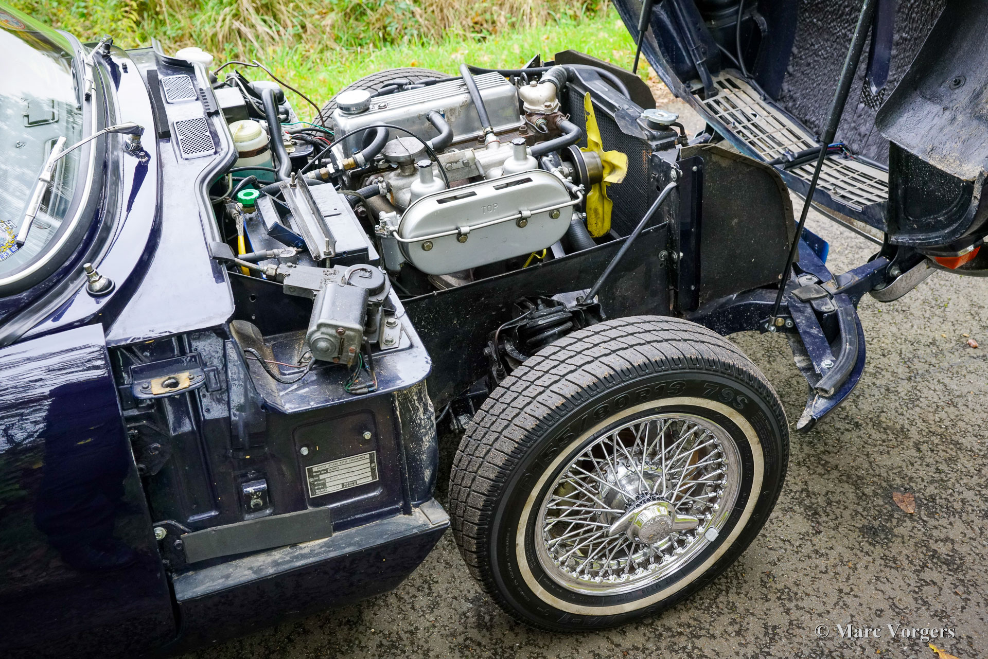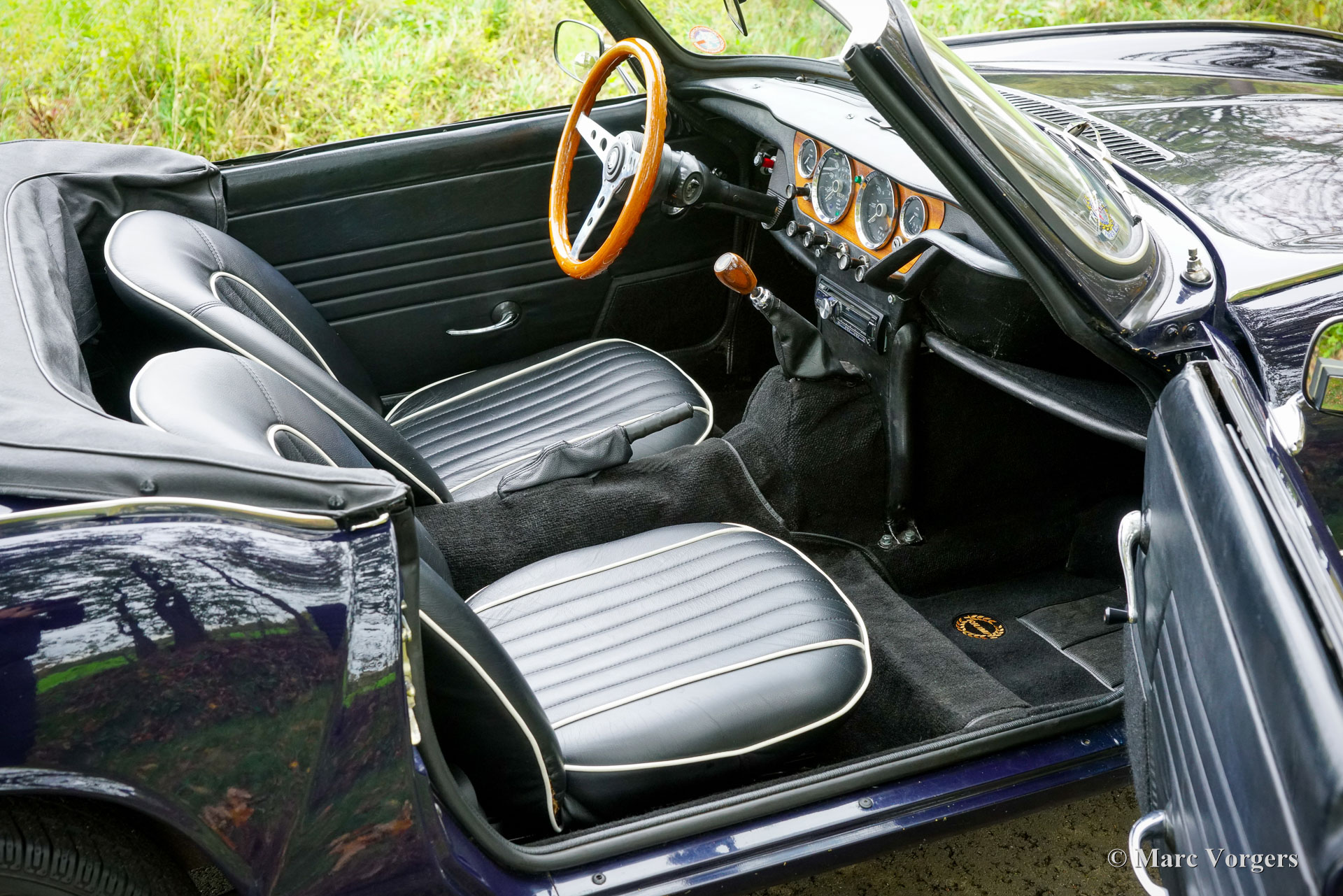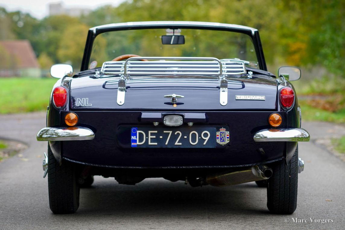 Triumph Spitfire MK 3, jaar 1971. Chassisnummer: 1FD83020L. Carrosseriekleur donkerblauw (Royal Blue) gecombineerd met een zwart kunstlederen interieur afgewerkt met zwart tapijt. Zwarte vinyl soft-top, kapafdekking en tonneaucover. Deze prachtige Triumph Spitfire werd nieuw verkocht in het Verenigd Koninkrijk en geregistreerd op 30 juni 1971. In 1984 werd de auto geïmporteerd naar Nederland. De huidige eigenaar heeft sinds 2023 genoten van deze schoonheid tijdens vele ritten in Nederland, Luxemburg en in de Square Mountain Rally. De Triumph Spitfire is een glorieus ontwerp van de Italiaanse meesterstylist Michelotti die verantwoordelijk was voor de levendige vormen van vele Triumph-klassiekers. Gebaseerd op een licht aangepast Triumph Herald-chassis en aandrijflijn is de Spitfire eenvoudig en goedkoop te onderhouden. Bij het openen van de grote motorkap worden de motor en de voorwielophanging volledig blootgelegd voor maximale bereikbaarheid. De 1296 cc viercilinder-in-lijn motor levert 68 pk en is gekoppeld aan een handgeschakelde vierversnellingsbak die de paardenkrachten naar de achterwielen stuurt. Met een gewicht van slechts 715 kilogram biedt de compacte Spitfire MK3 levendig sportieve prestaties en een geweldige open rijervaring. Dit prachtige exemplaar in Royal Blue verkeert in een goede tot zeer goede staat en de auto is onlangs uitgebreid onderhouden in onze werkplaats. De auto is uitgerust met overdrive, chromen spaakwielen, chromen ‘knock-on’ wielmoeren, een chromen bagagerek, een sportstuur met houten rand, rembekrachtiging, een opbergkluisje voor waardevolle spullen achterin, een krik, een houten wielmoersleutel en een 'moderne' JVC KD-452 stereo radio-cd-speler met Aux-ingang en een antenne op het rechter voorspatbord. De auto wordt geleverd met extra reserveonderdelen, extra wielen en banden. Facturen van recent onderhoud zijn beschikbaar. Deze Triumph Spitfire is een klassieker met een uitstekende prijs-kwaliteitverhouding. Deze Spitfire MK 3 zal de nieuwe eigenaar veel rijplezier, en indien gewenst, veel nieuwe vrienden bezorgen bij de zeer actieve Triumph Spitfire club!
