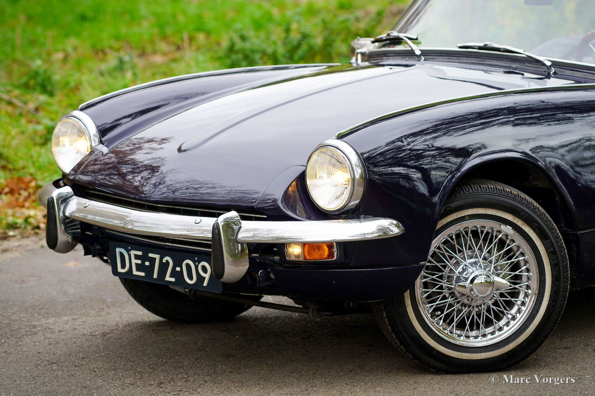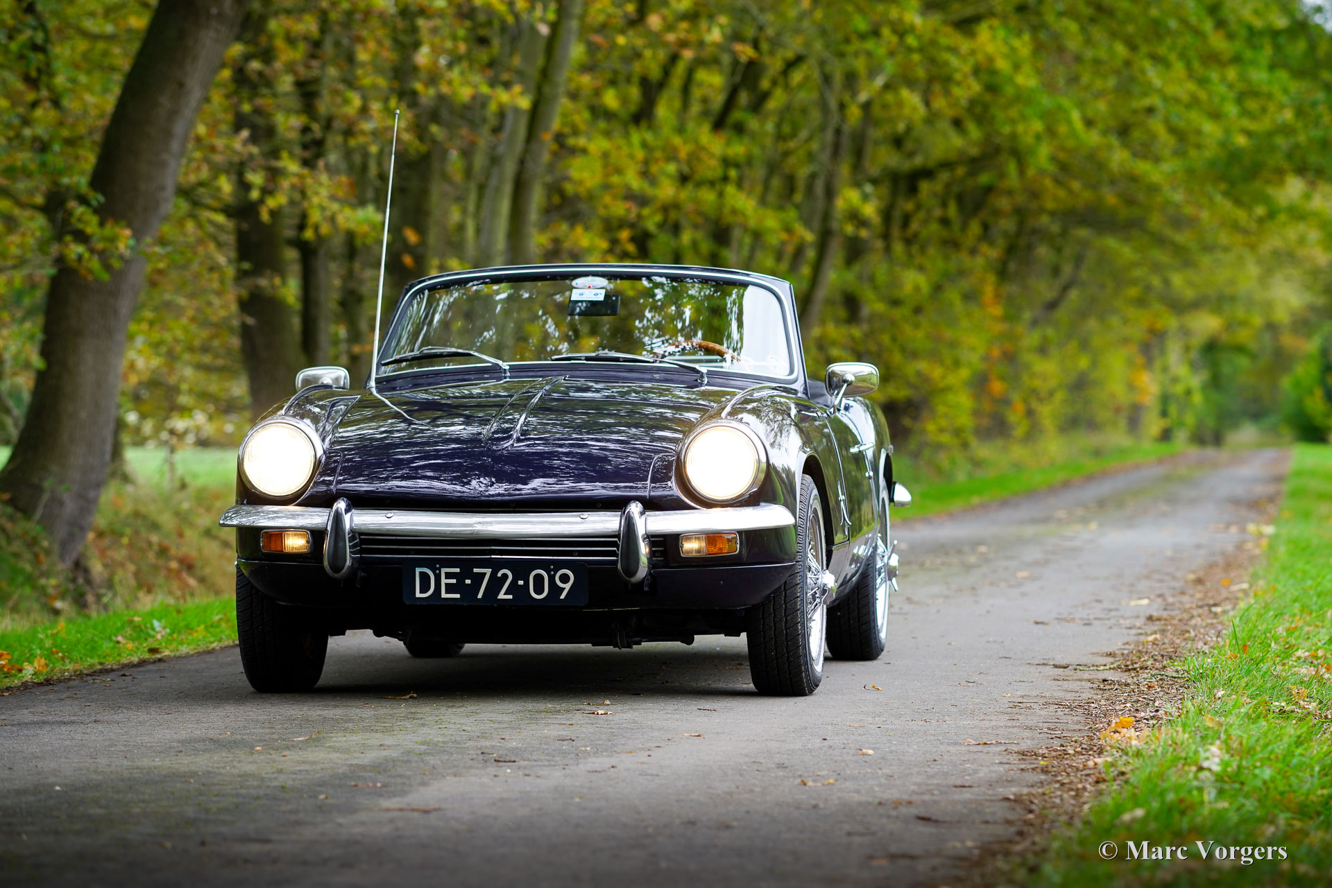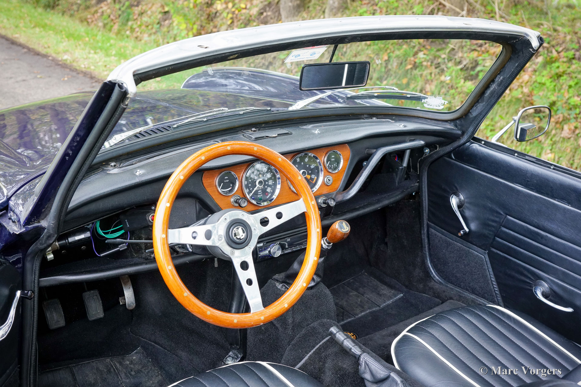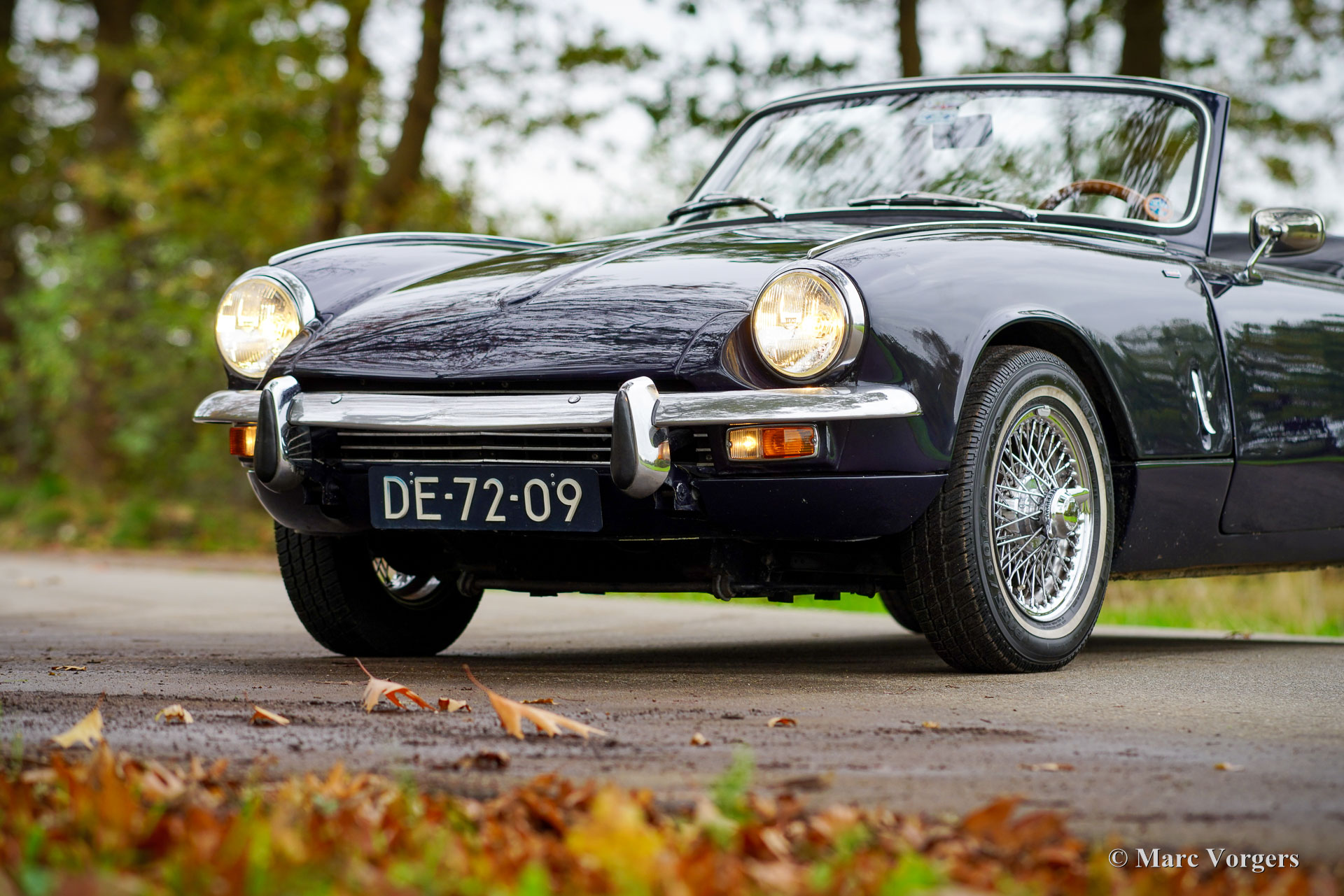 Triumph Spitfire MK 3, jaar 1971. Chassisnummer: 1FD83020L. Carrosseriekleur donkerblauw (Royal Blue) gecombineerd met een zwart kunstlederen interieur afgewerkt met zwart tapijt. Zwarte vinyl soft-top, kapafdekking en tonneaucover. Deze prachtige Triumph Spitfire werd nieuw verkocht in het Verenigd Koninkrijk en geregistreerd op 30 juni 1971. In 1984 werd de auto geïmporteerd naar Nederland. De huidige eigenaar heeft sinds 2023 genoten van deze schoonheid tijdens vele ritten in Nederland, Luxemburg en in de Square Mountain Rally. De Triumph Spitfire is een glorieus ontwerp van de Italiaanse meesterstylist Michelotti die verantwoordelijk was voor de levendige vormen van vele Triumph-klassiekers. Gebaseerd op een licht aangepast Triumph Herald-chassis en aandrijflijn is de Spitfire eenvoudig en goedkoop te onderhouden. Bij het openen van de grote motorkap worden de motor en de voorwielophanging volledig blootgelegd voor maximale bereikbaarheid. De 1296 cc viercilinder-in-lijn motor levert 68 pk en is gekoppeld aan een handgeschakelde vierversnellingsbak die de paardenkrachten naar de achterwielen stuurt. Met een gewicht van slechts 715 kilogram biedt de compacte Spitfire MK3 levendig sportieve prestaties en een geweldige open rijervaring. Dit prachtige exemplaar in Royal Blue verkeert in een goede tot zeer goede staat en de auto is onlangs uitgebreid onderhouden in onze werkplaats. De auto is uitgerust met overdrive, chromen spaakwielen, chromen ‘knock-on’ wielmoeren, een chromen bagagerek, een sportstuur met houten rand, rembekrachtiging, een opbergkluisje voor waardevolle spullen achterin, een krik, een houten wielmoersleutel en een 'moderne' JVC KD-452 stereo radio-cd-speler met Aux-ingang en een antenne op het rechter voorspatbord. De auto wordt geleverd met extra reserveonderdelen, extra wielen en banden. Facturen van recent onderhoud zijn beschikbaar. Deze Triumph Spitfire is een klassieker met een uitstekende prijs-kwaliteitverhouding. Deze Spitfire MK 3 zal de nieuwe eigenaar veel rijplezier, en indien gewenst, veel nieuwe vrienden bezorgen bij de zeer actieve Triumph Spitfire club!