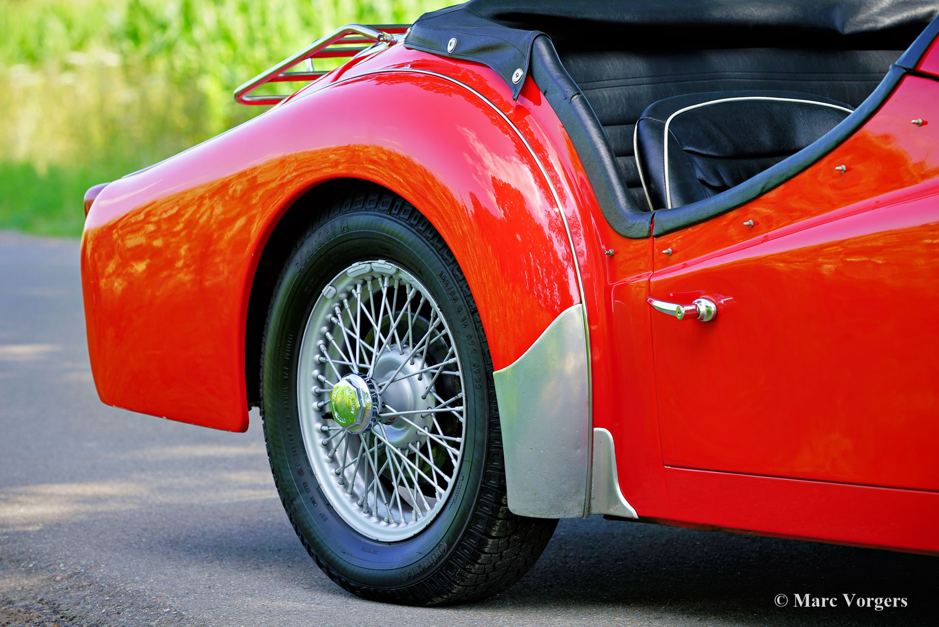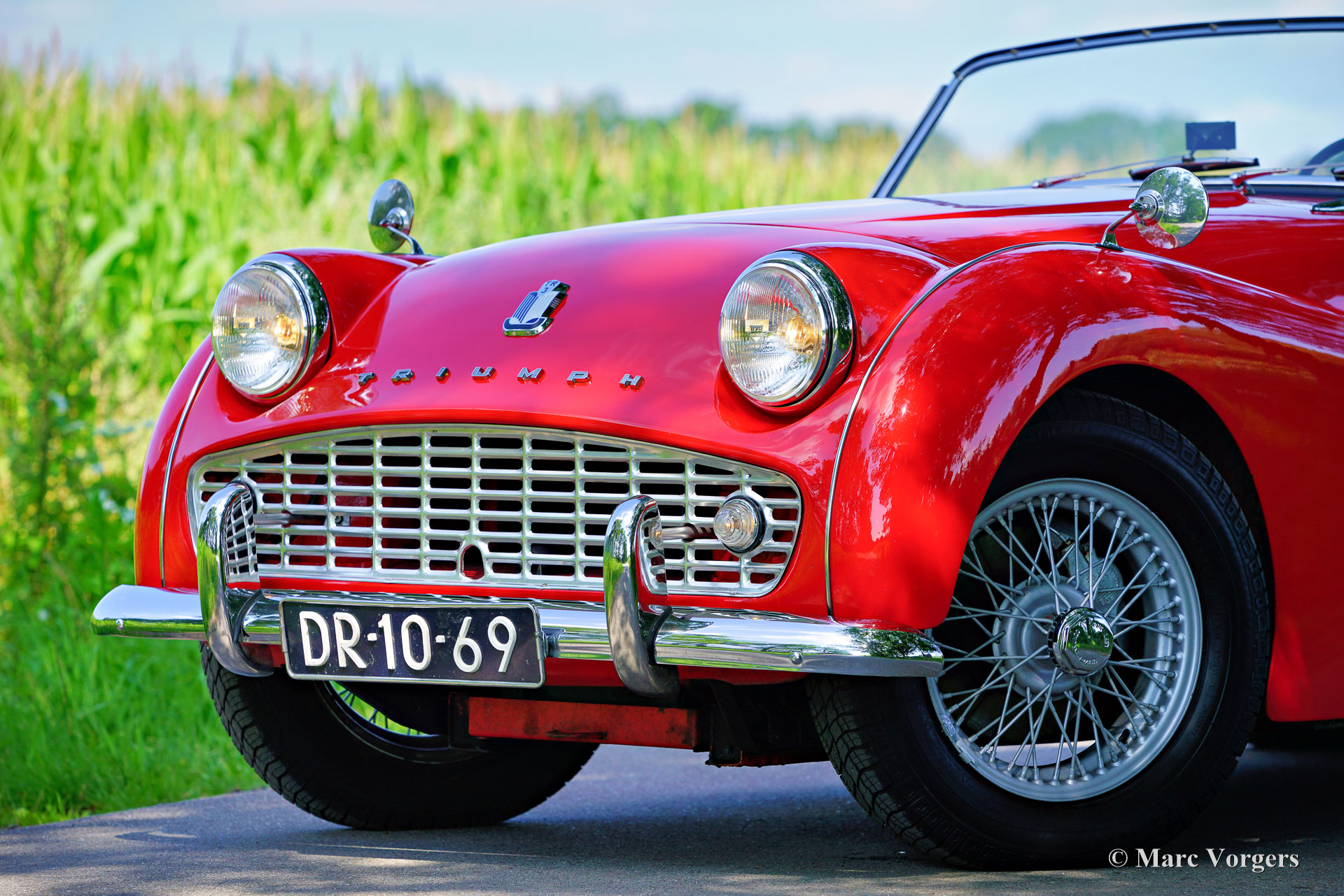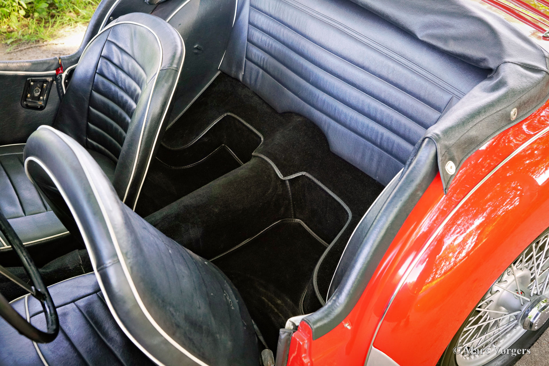 Triumph TR 3A, jaar 1959. Kleur rood gecombineerd met zwart kunstlederen interieur afgewerkt met witte biezen en zwart tapijt. De auto is voorzien van een zwart vinyl soft top, een zwart vinyl hood cover, een zwart vinyl tonneau cover, en zwarte zijruitframes. Deze Triumph TR 3A is nieuw verkocht in de VS. Nadat de super originele TR 3A in een Amerikaanse schuur was gevonden, is deze naar Nederland verscheept om uitgebreid te worden gerestaureerd en gereviseerd. De carrosserie en het chassis zijn perfect en “body off” gerestaureerd. De originele groene kleur is vervangen door rood. Alles is gereviseerd en/of vernieuwd en de auto is in juni 1997 op in Nederland op kenteken gezet. Een complete fotoreportage van de restauratie is aanwezig. Sinds de restauratie is de auto goed onderhouden en netjes gestald. De auto is sinds juni 2021 bij de laatste eigenaar. Deze fijne Triumph TR 3A verkeert in een zeer goede en prachtige staat! De robuuste 1991 cc viercilindermotor produceert een gezonde 100 pk en (de toenmalige nieuwigheid!) schijfremmen op de voorwielen zorgen voor voldoende remkracht. Deze prachtige Triumph TR 3A toont alle prachtige originele details en is uitgerust met zilverkleurige spaakwielen en twee op de voorspatborden gemonteerde achteruitkijkspiegels. De auto is uitgerust met een vierversnellingsbak, indien gewenst kan er tegen meerprijs overdrive worden gemonteerd. Deze Triumph TR 3A biedt een fantastische klassieke open rijervaring en maakt uw passie voor Engelse klassiekers compleet!