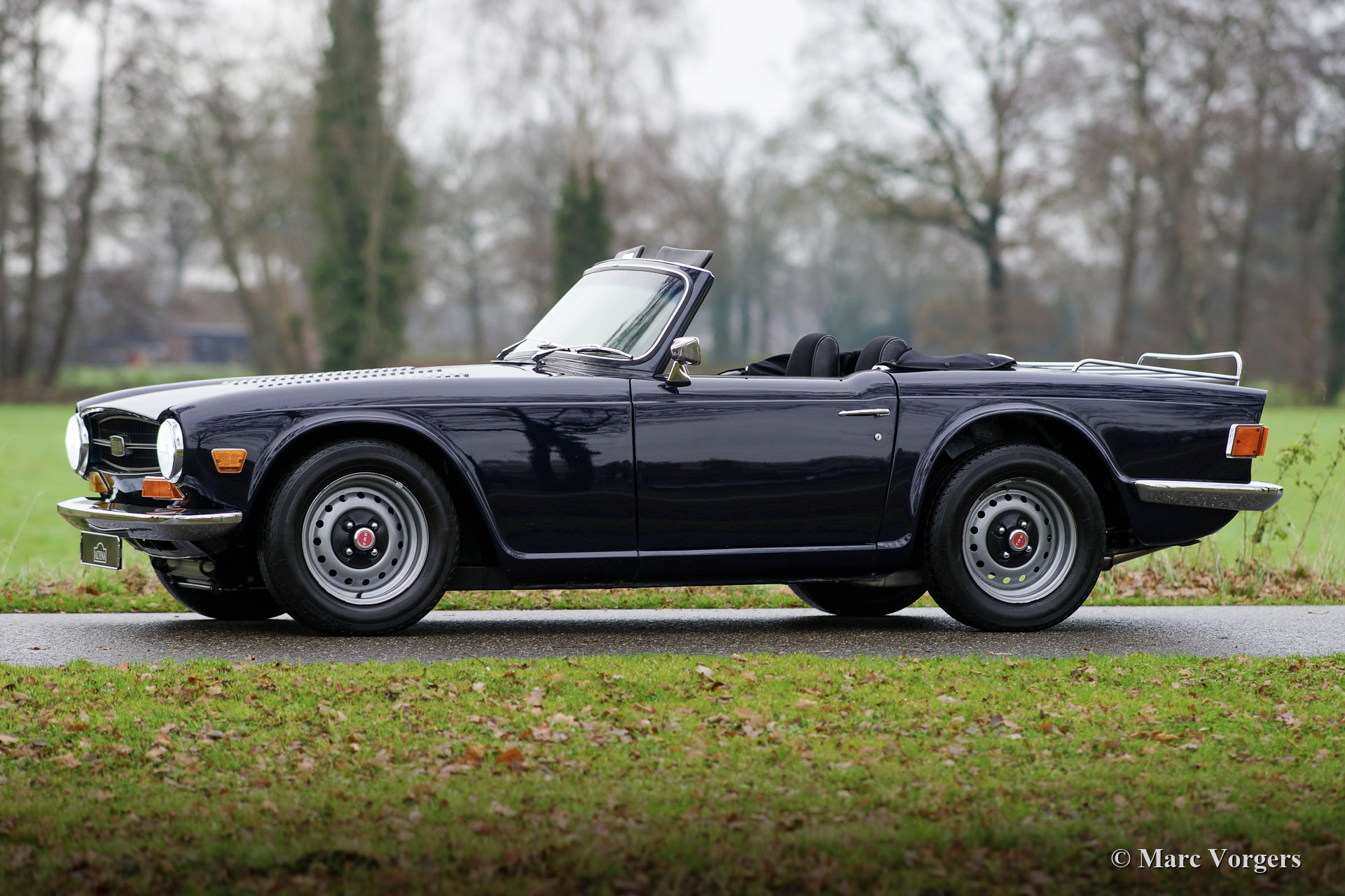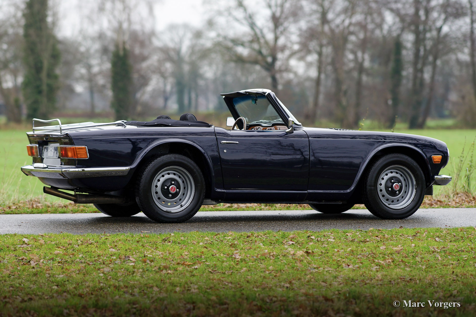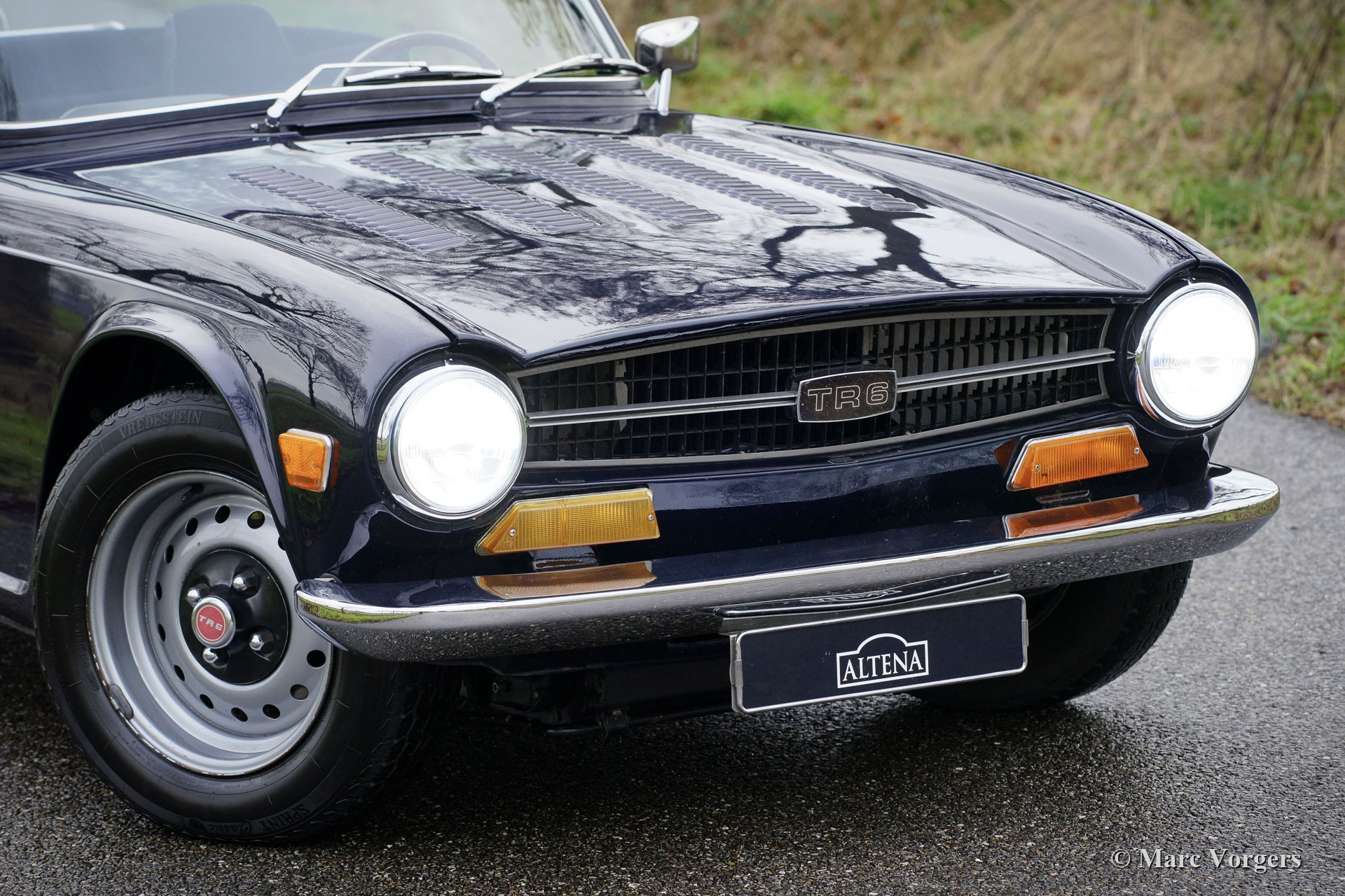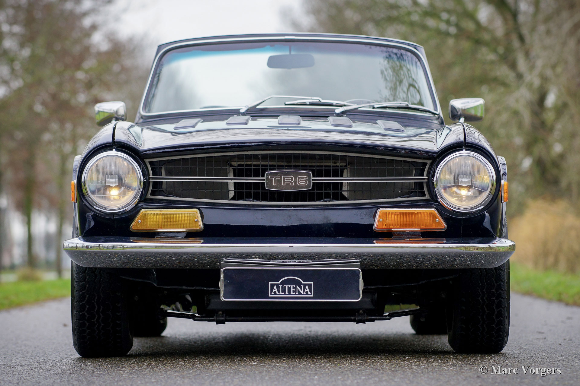 Triumph TR 6, jaar 1971. Kleur donkerblauw gecombineerd met een zwart vinyl/stoffen interieur en zwart tapijt. Zwarte soft-top, hoodcover en tonneaucover. Deze stoere en sportieve Triumph TR 6 werd nieuw verkocht in de Verenigde Staten (VS). In 1991 is de auto naar Nederland geïmporteerd. Vanaf 1991 werd de auto (gedurende 31 jaar!) gekoesterd door één eigenaar! In 2010 is de auto uitvoerig gerestaureerd en gereviseerd. Een fotoreportage van de restauratie is aanwezig. Eveneens aanwezig zijn twee grote dossiermappen met historische documenten, en service- en restauratiedocumenten/facturen. De TR 6 werd gerestaureerd met de nadruk op kwaliteit en uitstekende rijeigenschappen. De carrosserie vertoont uitstekende passingen van de plaatdelen, prachtig lak- en chroomwerk en de onderkant ziet er beter uit dan nieuw! De motorkap is voorzien van vijf rijen louvres om de koeling van de grote zescilindermotor te verbeteren. Deze fantastische Triumph TR 6 is voorzien van een 4-versnellingsbak met overdrive. Op een Triumph TR is de overdrive een echte 5e versnelling wat de rijervaring aanzienlijk verbetert. Verder is de auto voorzien van de originele stalen velgen, originele Stromberg carburateurs, origineel luchtfilterhuis, Vredestein 185/70 banden, een prachtig MotoLita stuur met houten rand, een RVS bagagerek, een RVS uitlaatsysteem, en een Philips autoradio met een front in houtoptiek. Deze sportieve Triumph TR 6 wordt compleet geleverd met een witte hardtop. Dit is een fantastische Triumph TR 6 in sublieme conditie uit langjarig eigendom!