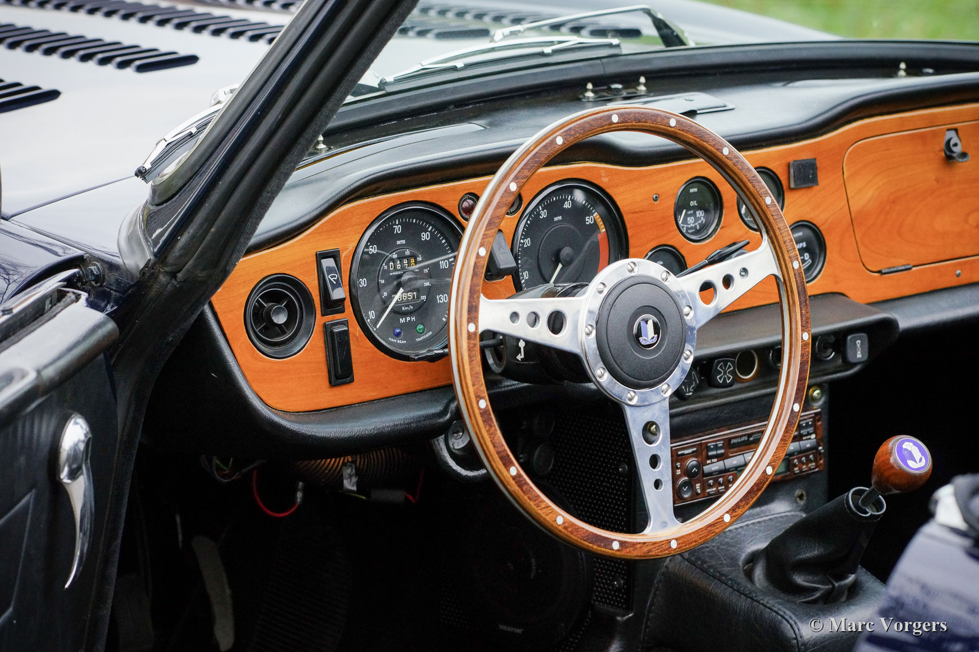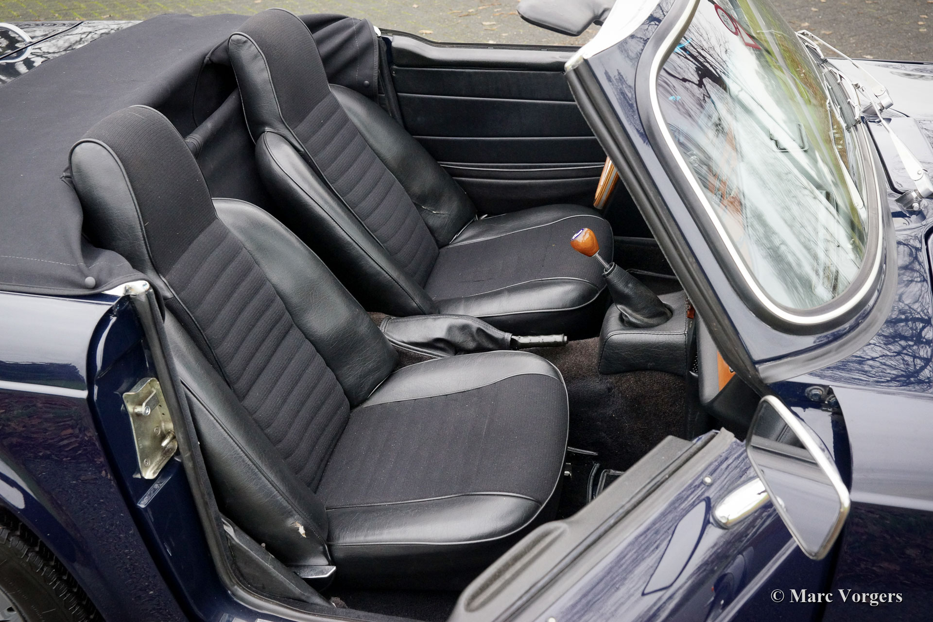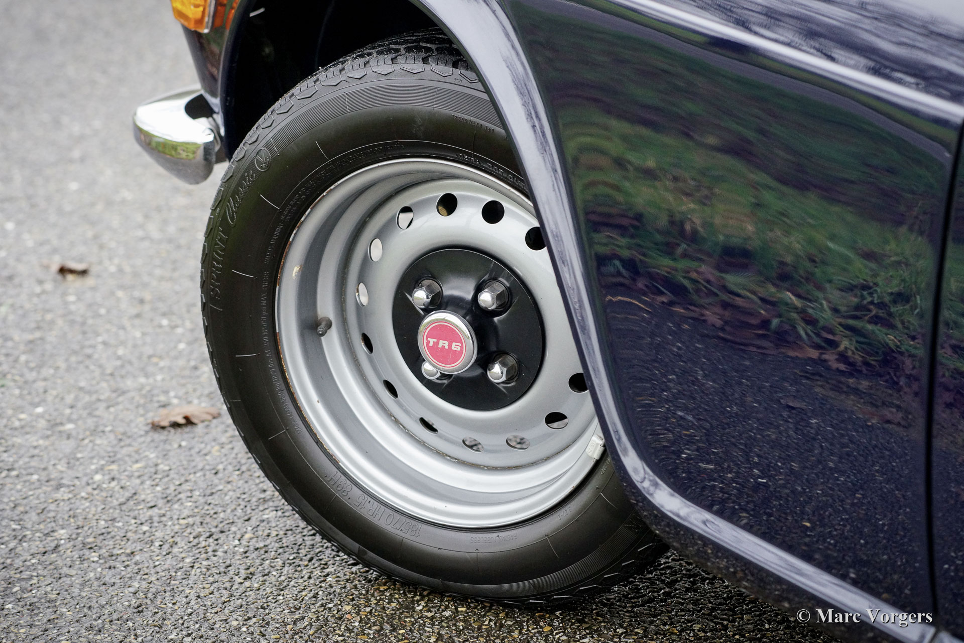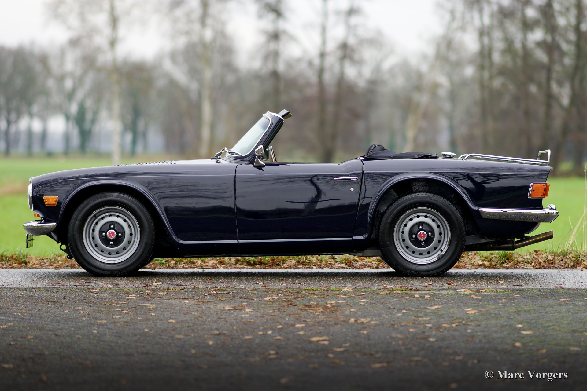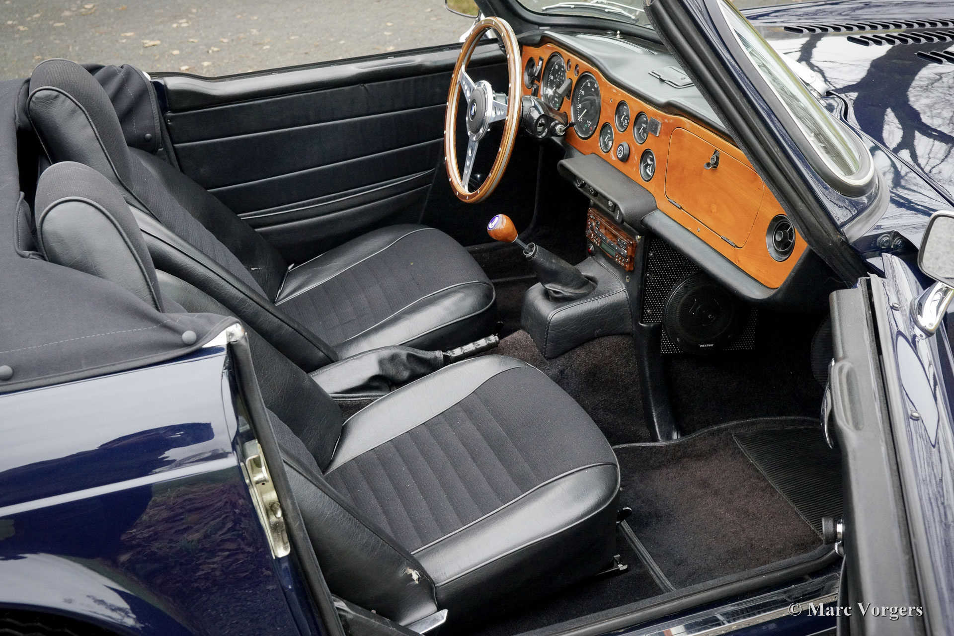 Triumph TR 6, jaar 1971. Kleur donkerblauw gecombineerd met een zwart vinyl/stoffen interieur en zwart tapijt. Zwarte soft-top, hoodcover en tonneaucover. Deze stoere en sportieve Triumph TR 6 werd nieuw verkocht in de Verenigde Staten (VS). In 1991 is de auto naar Nederland geïmporteerd. Vanaf 1991 werd de auto (gedurende 31 jaar!) gekoesterd door één eigenaar! In 2010 is de auto uitvoerig gerestaureerd en gereviseerd. Een fotoreportage van de restauratie is aanwezig. Eveneens aanwezig zijn twee grote dossiermappen met historische documenten, en service- en restauratiedocumenten/facturen. De TR 6 werd gerestaureerd met de nadruk op kwaliteit en uitstekende rijeigenschappen. De carrosserie vertoont uitstekende passingen van de plaatdelen, prachtig lak- en chroomwerk en de onderkant ziet er beter uit dan nieuw! De motorkap is voorzien van vijf rijen louvres om de koeling van de grote zescilindermotor te verbeteren. Deze fantastische Triumph TR 6 is voorzien van een 4-versnellingsbak met overdrive. Op een Triumph TR is de overdrive een echte 5e versnelling wat de rijervaring aanzienlijk verbetert. Verder is de auto voorzien van de originele stalen velgen, originele Stromberg carburateurs, origineel luchtfilterhuis, Vredestein 185/70 banden, een prachtig MotoLita stuur met houten rand, een RVS bagagerek, een RVS uitlaatsysteem, en een Philips autoradio met een front in houtoptiek. Deze sportieve Triumph TR 6 wordt compleet geleverd met een witte hardtop. Dit is een fantastische Triumph TR 6 in sublieme conditie uit langjarig eigendom!